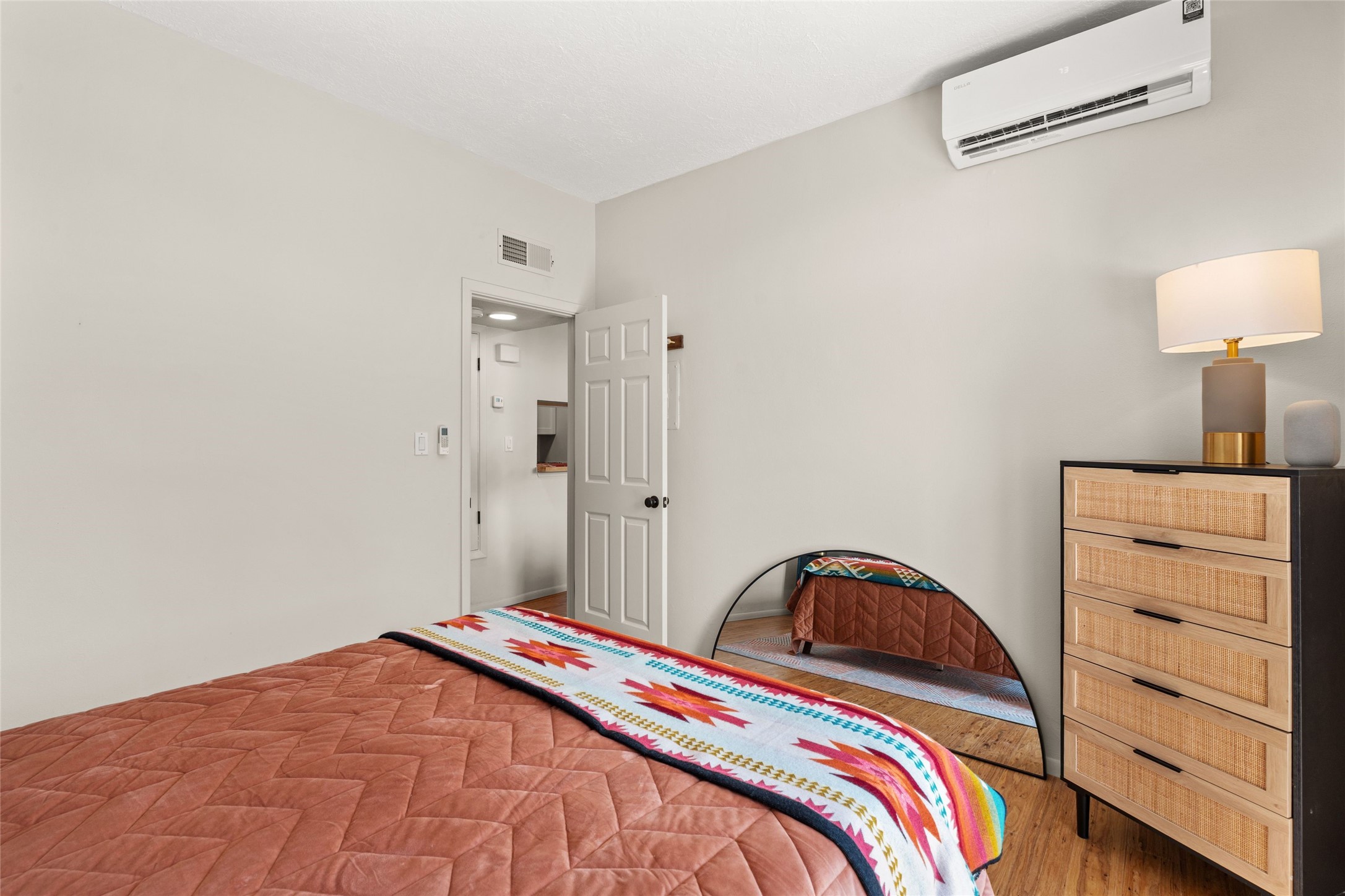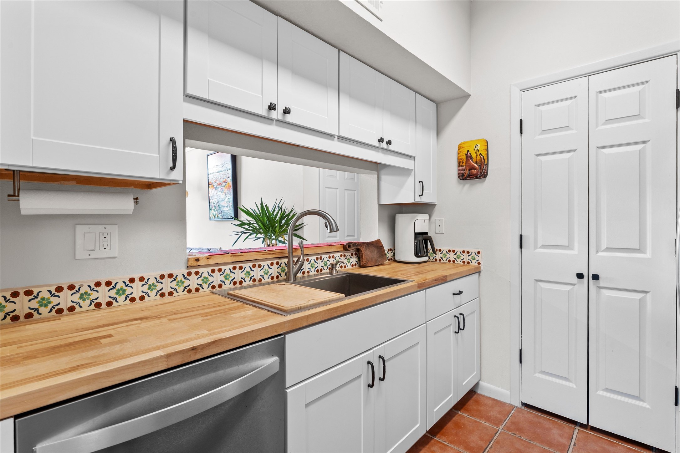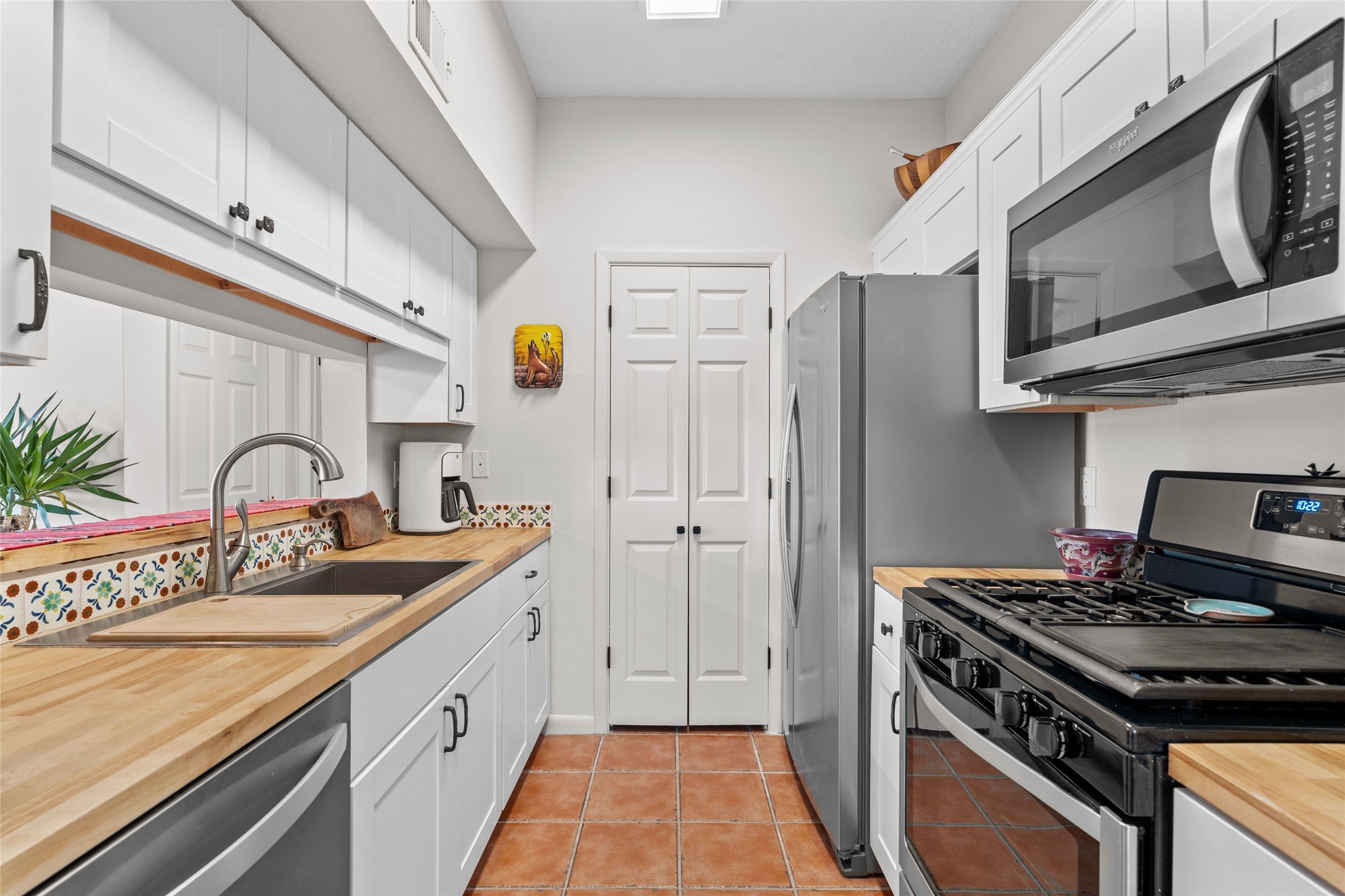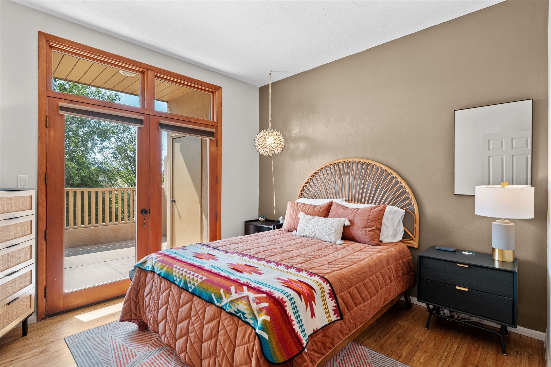 Charming 1-bedroom, 1-bath condo located in the convenient Viento del Norte Condominiums. This end unit offers a unique advantage with no neighbors on the north side, allowing for an abundance of natural light to fill your living space through extra windows. Bright and inviting interior flows seamlessly into a spacious balcony, nearly doubling your entertaining area. Imagine hosting friends and family as you enjoy the beautiful Santa Fe weather! The condo features elegant wood and tile floors, complemented by square-cut beamed ceilings that add a touch of rustic charm. The wood-framed glass doors enhance the open feel and bring the outdoors in. Create a relaxing atmosphere in the evenings by the stylish fireplace with glowing flames by touch of a button. The galley kitchen showcases white cabinets paired with butcher block countertops. A stacked washer/dryer is in the large pantry/storage area. This condo includes both assigned parking and a one-car garage downstairs, offering added value and ease. Just minutes from the Devargas Center and downtown Santa Fe. An ideal condo for a seasonal foothold in Santa Fe, a profitable rental property, or a carefree home in a prime part of Santa Fe.