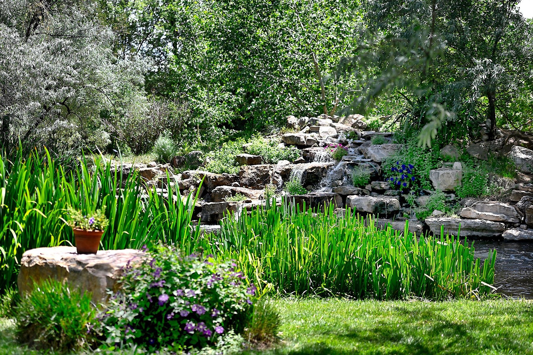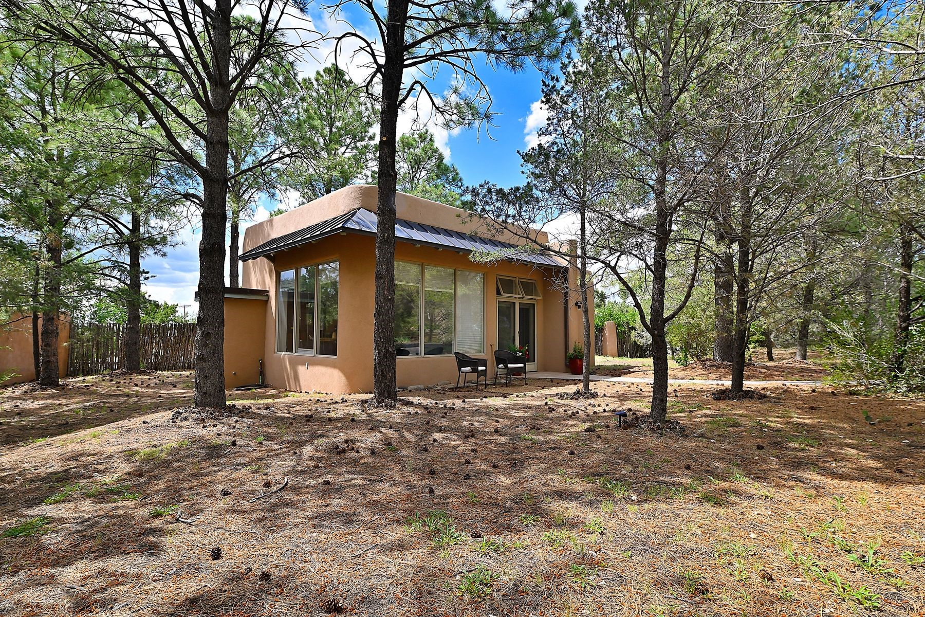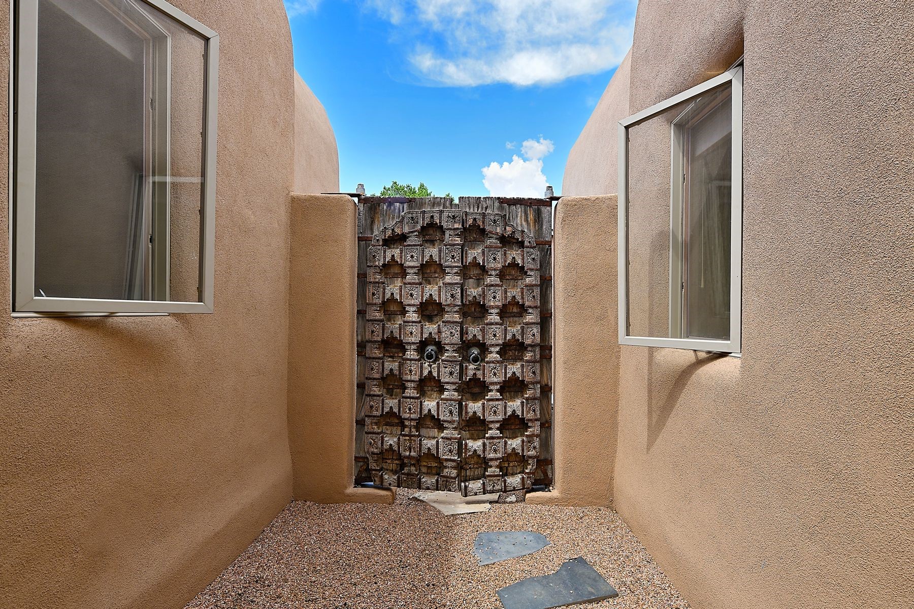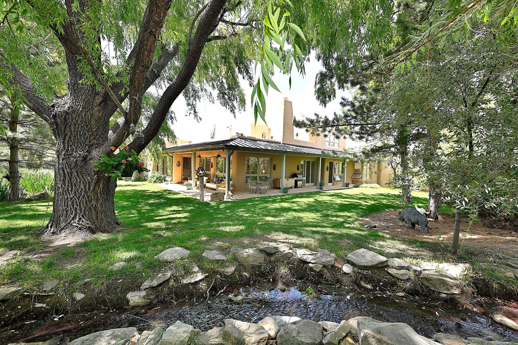 In recent years, much has been made about the treasure of Forrest Fenn, but perhaps the most meaningful treasure the renowned art dealer and author ever possessed was this idyllic oasis off the historic Old Santa Fe Trail in the capital city of New Mexico. Occupying 2.65 remarkably verdant acres, the gated estate is a hidden green gem, lush with trees, aspens, cottonwoods, pines, pinons, and a towering weeping willow that thrive alongside apricot, pear, apple, cherry, and peach trees as well as grape vines, flourishing lawn and wild grasses, and flowering plants and vines, all maintained by an irrigation system fed by a private well. The heart of the property is a warm, welcoming 4,596 square-foot residence custom-designed featuring handsome Beijing slate floors, soaring ceilings recalling an Old World chapel, diamond-finish plaster walls, vintage Spanish Colonial doors, a plethora of oversized windows and French doors, clever built-ins designed for the display of collectibles, a striking spiral staircase crowned by a skylight, and a wraparound portal. A portion of this breezy, relaxing outdoor space overlooks another rarity, a pond and waterfall fed by a recirculating stream. An ecosystem for fish, frogs, turtles, and all manner of wild birds, including ducks. Near the property gates is a 645 square-foot guest casita or studio with soaring ceilings, floods of light, a kitchenette, a bath, and storage space. A paved drive leads through the grounds to the finished three-car garage, which includes additional storage and benefits from a heated threshold. While the property is lush, private, secure, and quiet, extending away from the road across an arroyo, the attractions and amenities of Museum Hill, Canyon Road, and the historic Plaza are mere moments away.