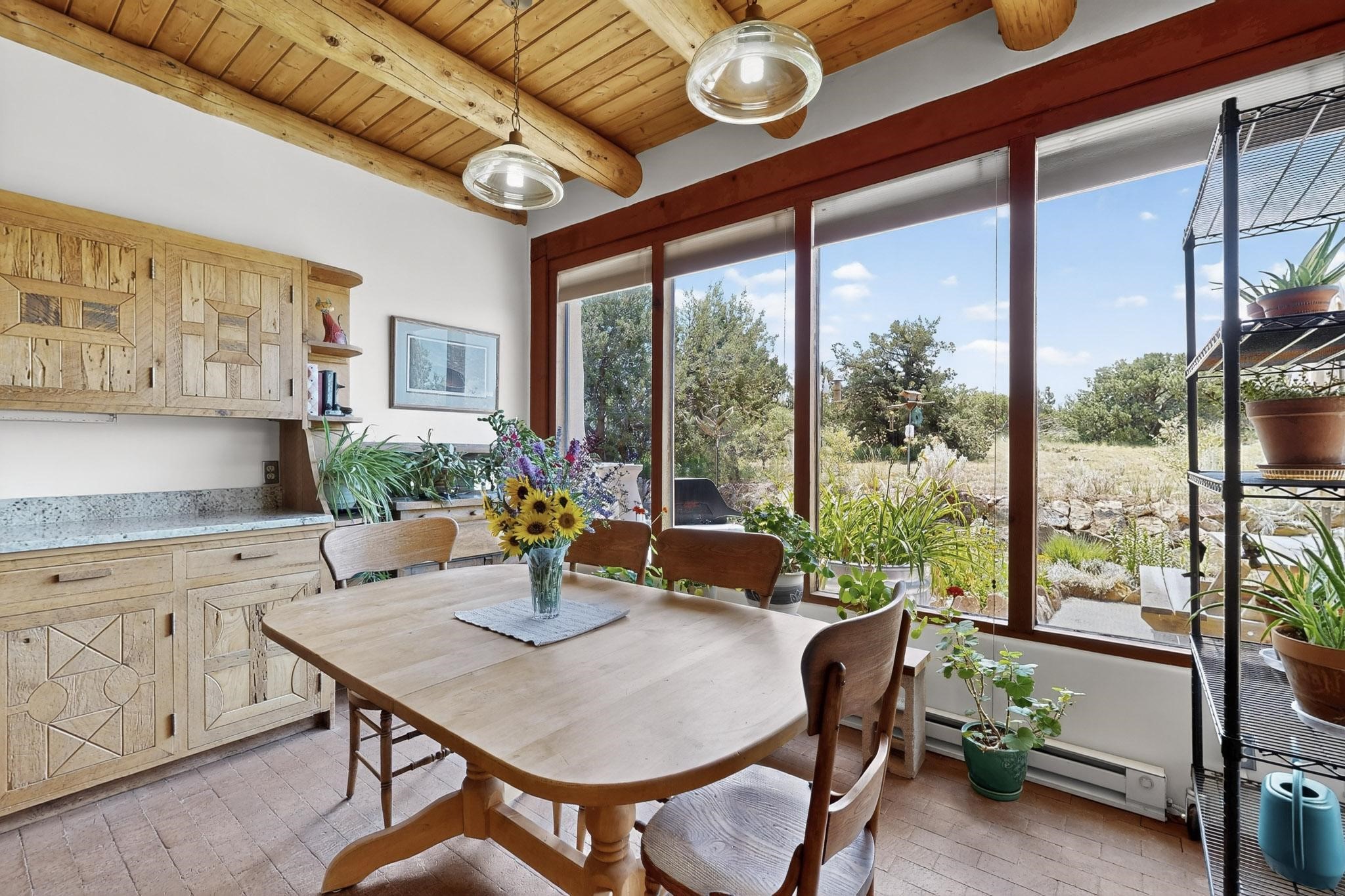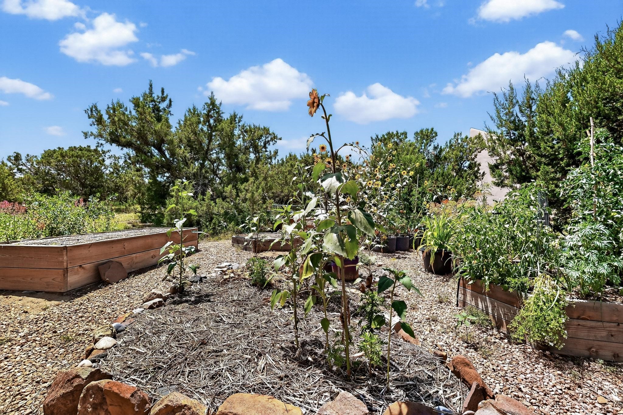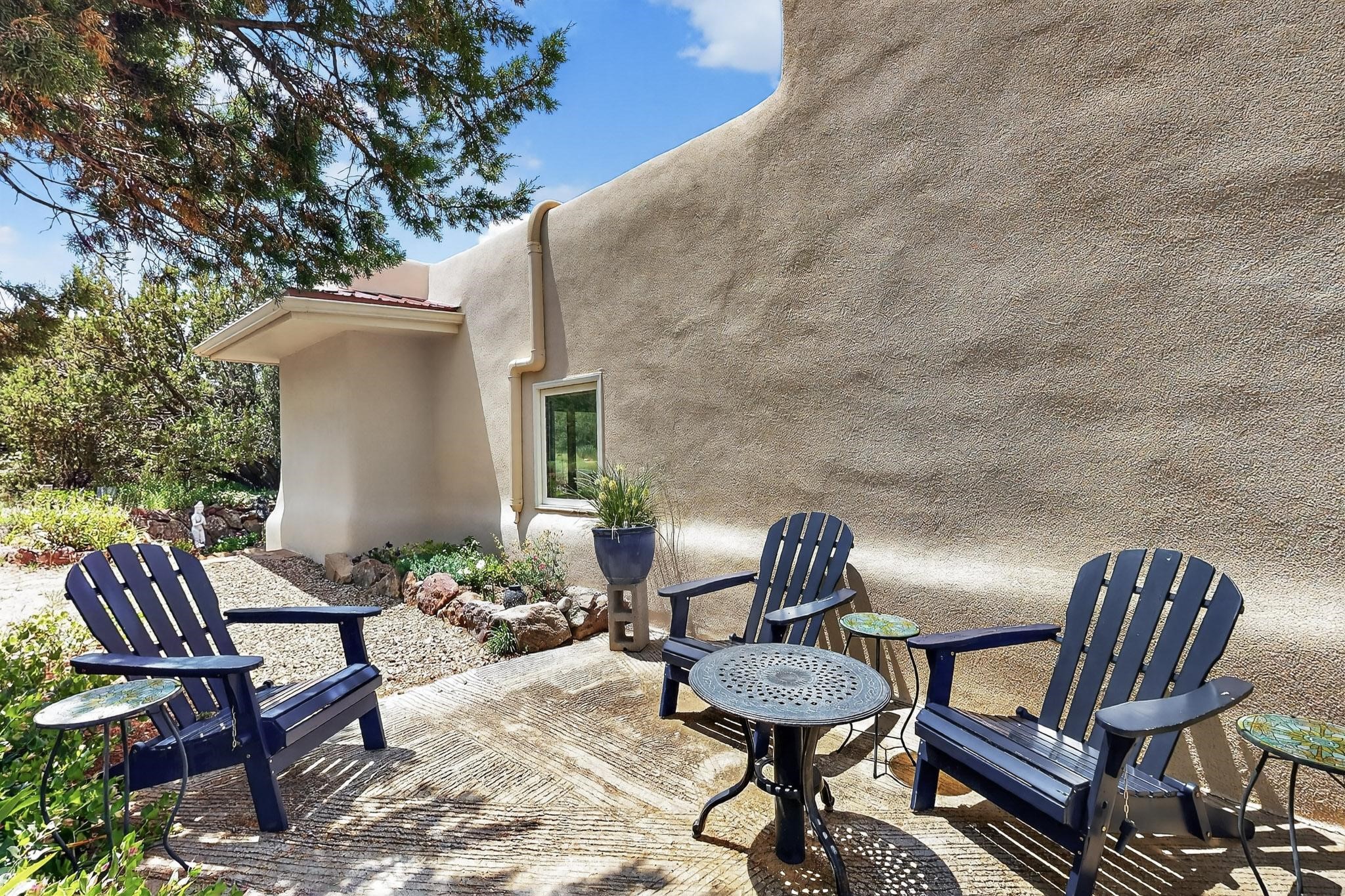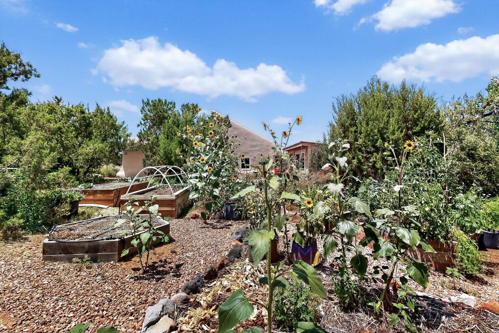 Surrounded by lush perennial gardens, sitting back from the road this lovely traditional pueblo home built by R.J. McMillan in 1984 provides a private oasis. Many upgrades have enhanced it including a new roof in 2015 maintained annually, electric baseboard heating with Daikin mini splits in 2022, reroofed the pitched area with propanel in 2021, reroofed the overhangs with new rain gutters, mostly new windows, upgraded kitchen and appliances in 2023 and new stucco in 2024. Delightful Santa Fe style details creating an ambient charm throughout, even vigas in the garage. The garage currently has a glass door not a garage door on one side, as it was used as a studio. A garden shed, plus productive raised beds, and on the greenbelt, this lovingly maintained home and gardens is special. Close to Eldorado amenities, local shopping, schools, library and senior center, it is only minutes into Santa Fe.