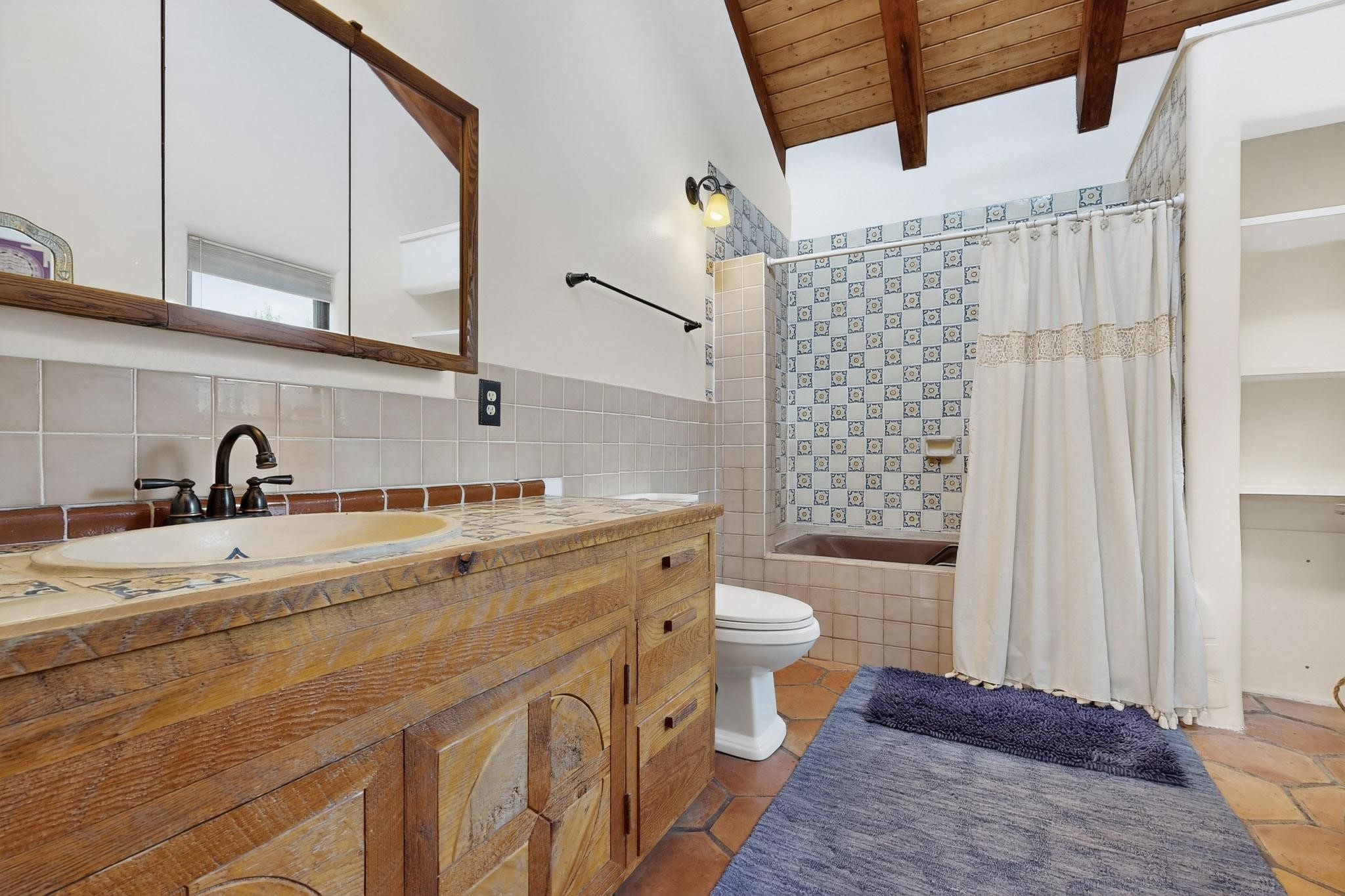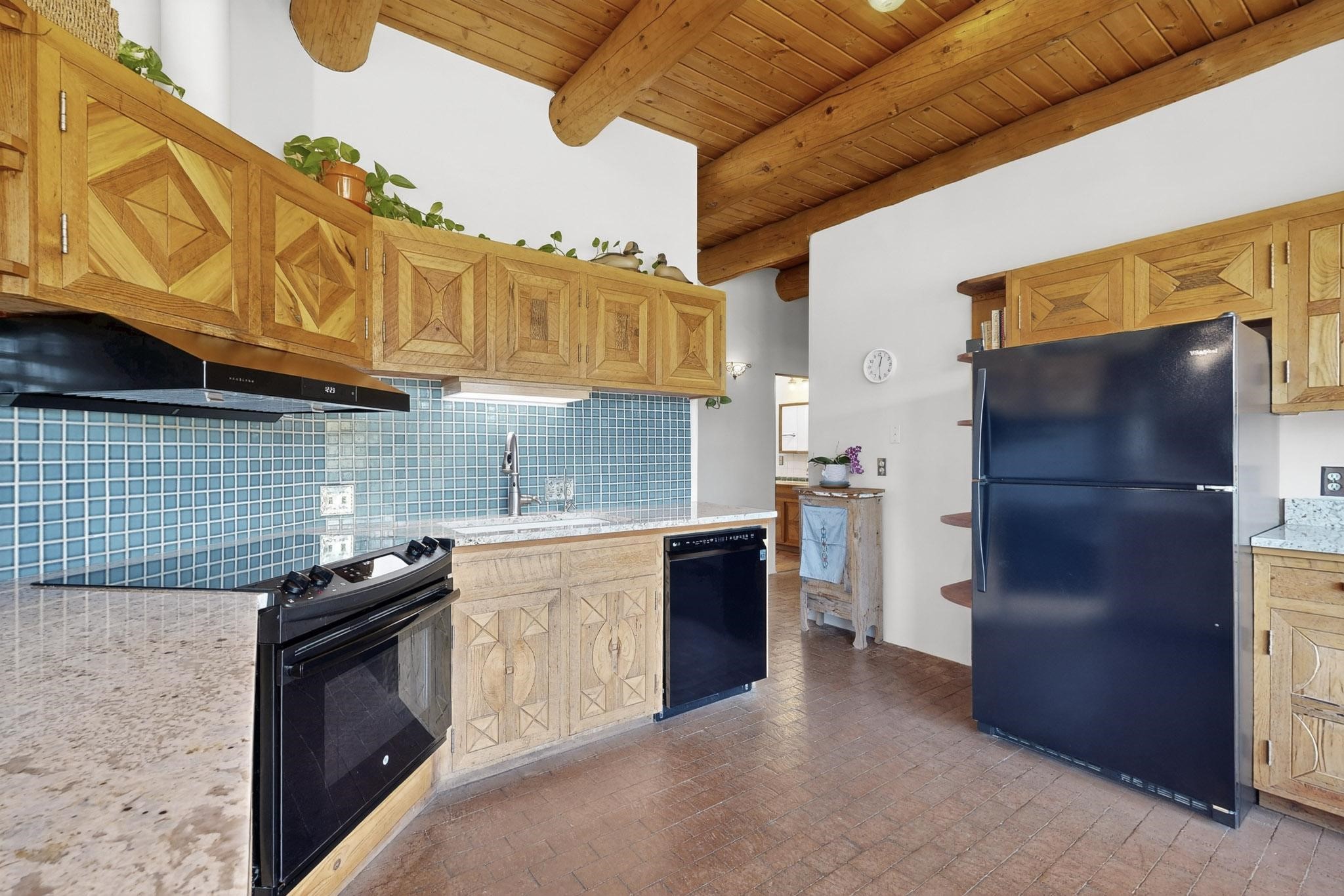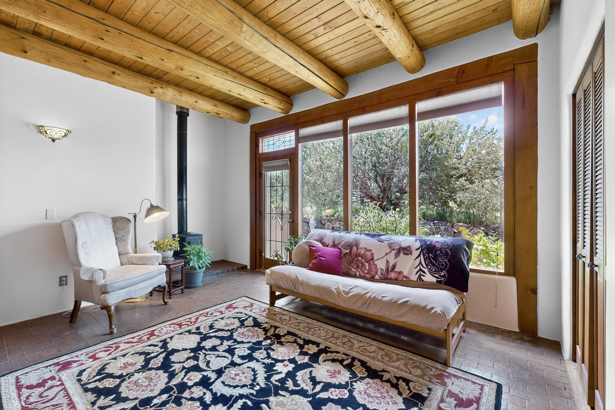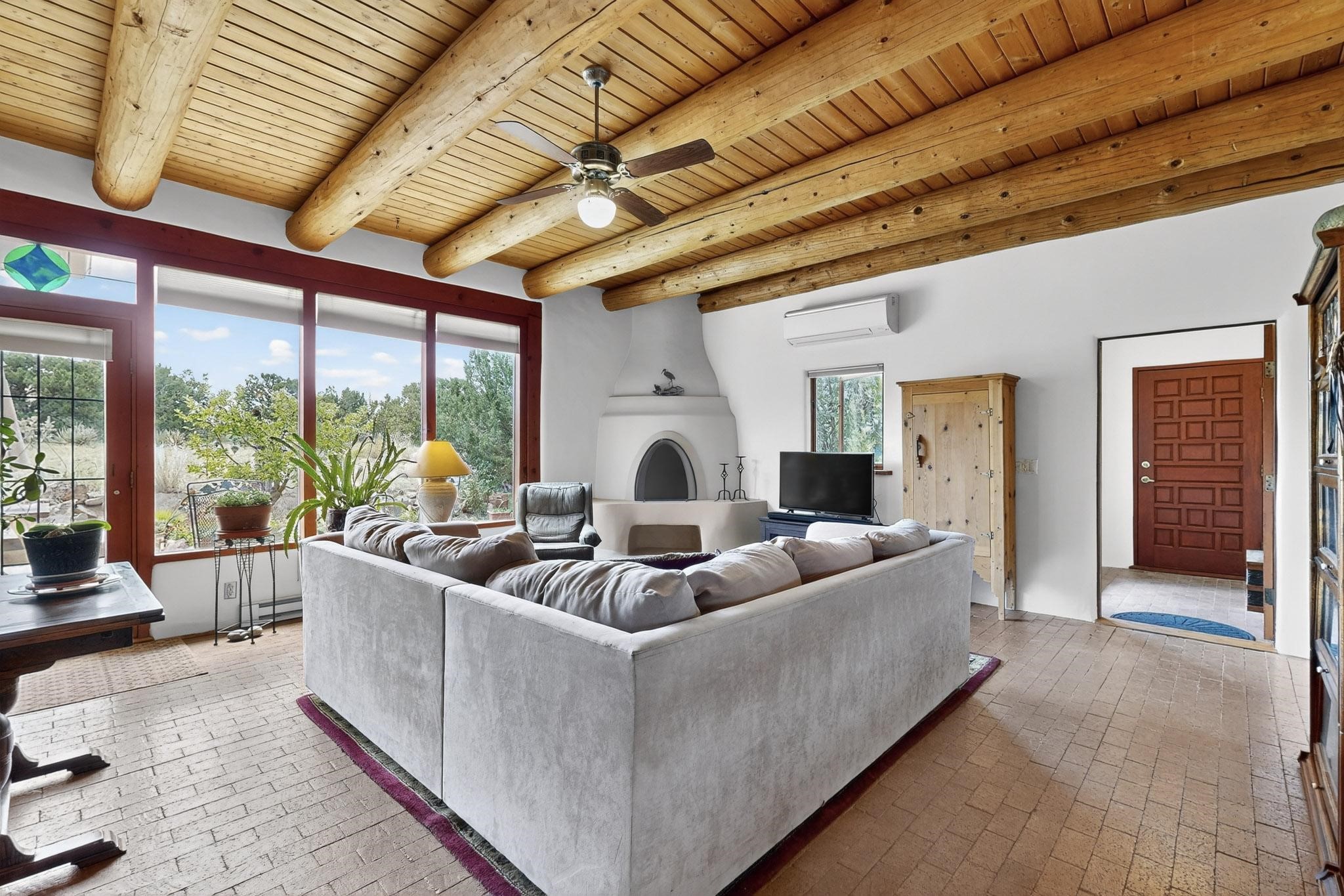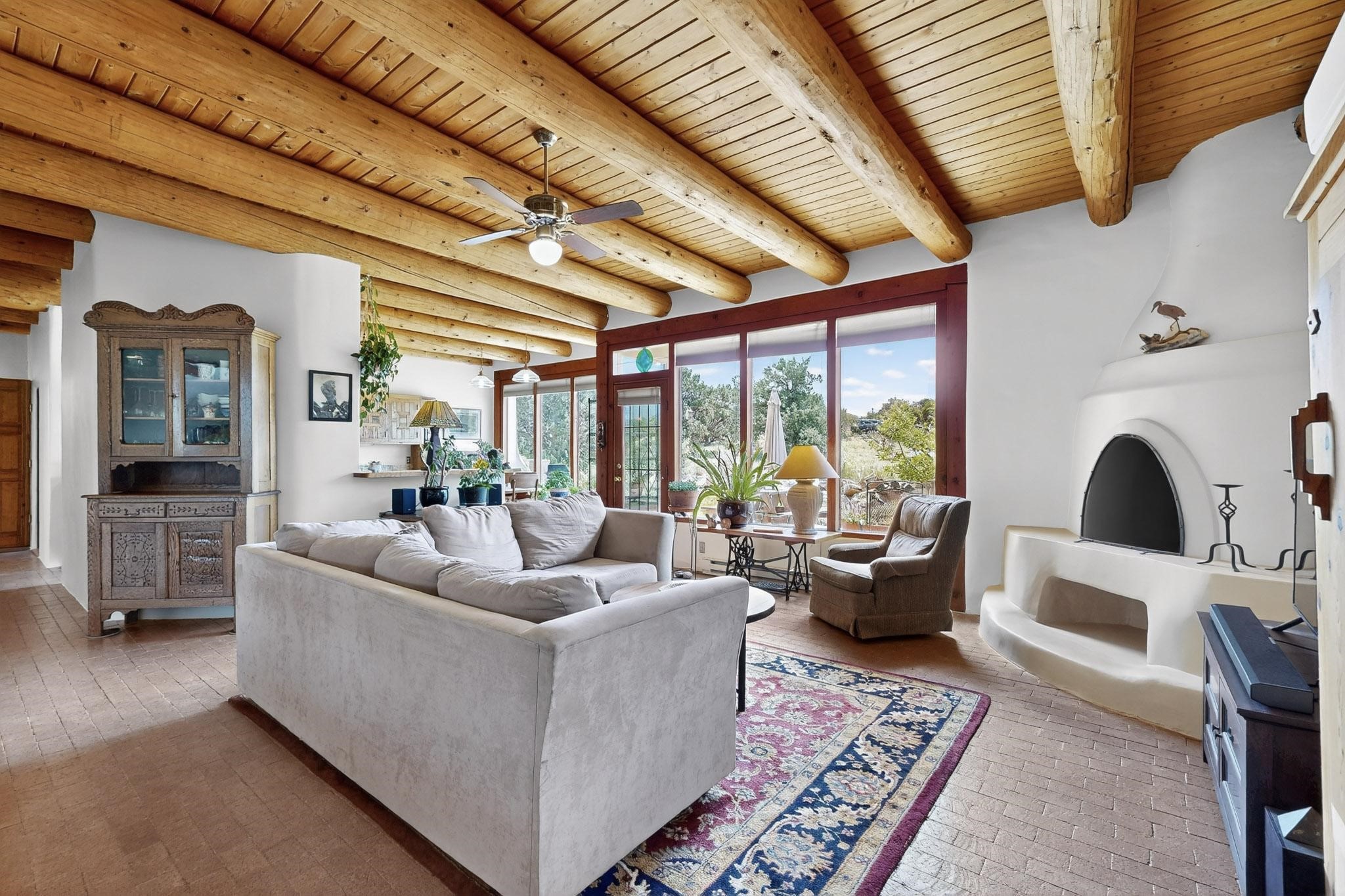 Surrounded by lush perennial gardens, sitting back from the road this lovely traditional pueblo home built by R.J. McMillan in 1984 provides a private oasis. Many upgrades have enhanced it including a new roof in 2015 maintained annually, electric baseboard heating with Daikin mini splits in 2022, reroofed the pitched area with propanel in 2021, reroofed the overhangs with new rain gutters, mostly new windows, upgraded kitchen and appliances in 2023 and new stucco in 2024. Delightful Santa Fe style details creating an ambient charm throughout, even vigas in the garage. The garage currently has a glass door not a garage door on one side, as it was used as a studio. A garden shed, plus productive raised beds, and on the greenbelt, this lovingly maintained home and gardens is special. Close to Eldorado amenities, local shopping, schools, library and senior center, it is only minutes into Santa Fe.