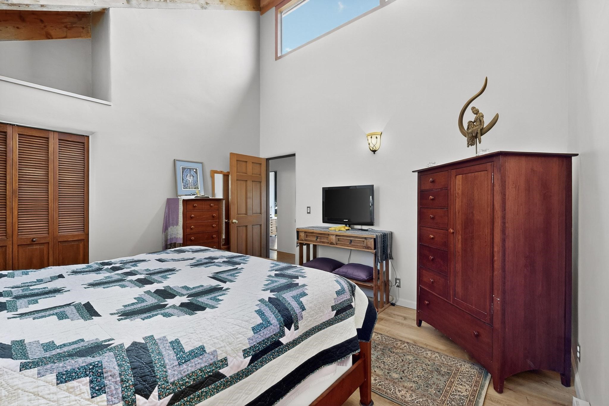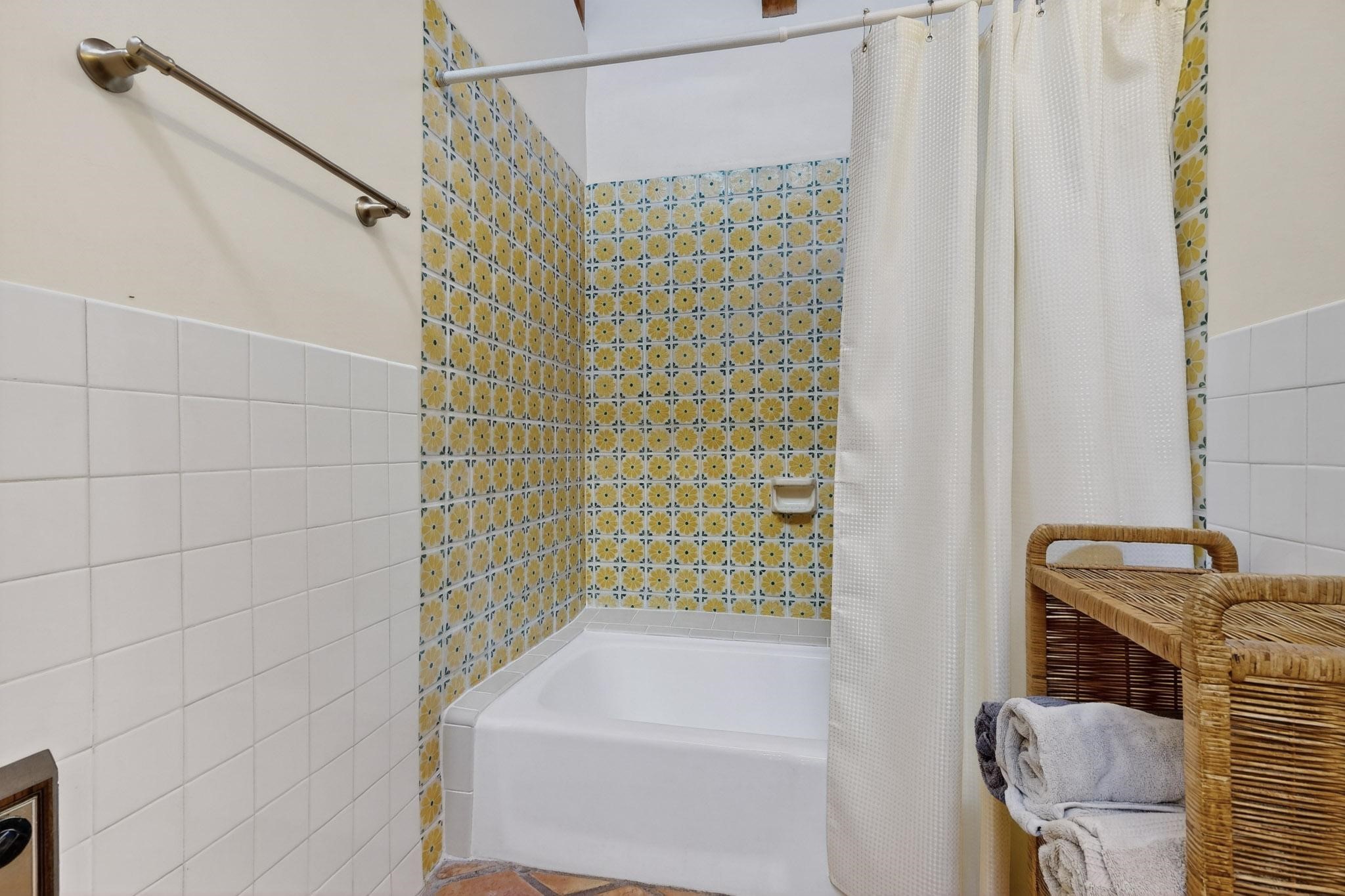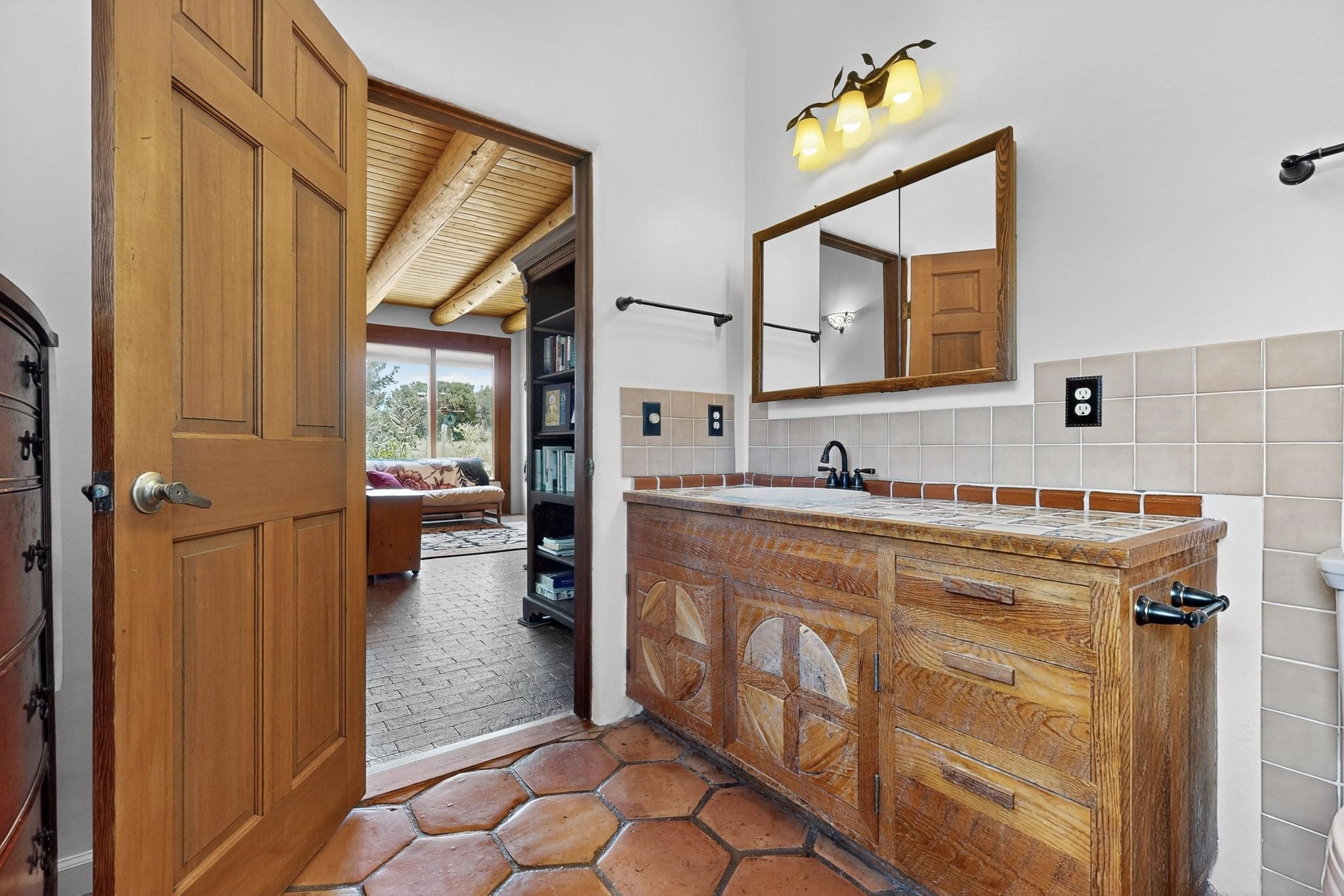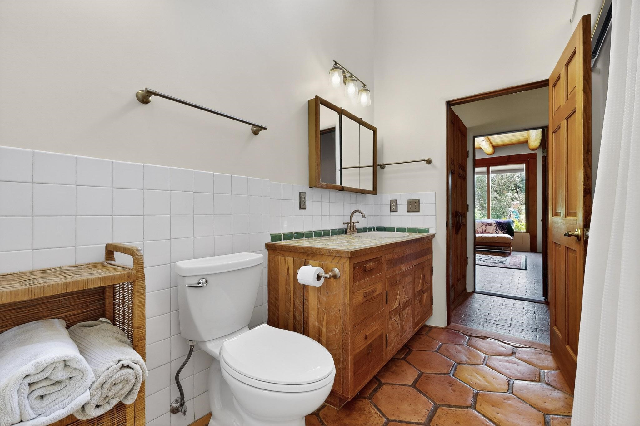 Surrounded by lush perennial gardens, sitting back from the road this lovely traditional pueblo home built by R.J. McMillan in 1984 provides a private oasis. Many upgrades have enhanced it including a new roof in 2015 maintained annually, electric baseboard heating with Daikin mini splits in 2022, reroofed the pitched area with propanel in 2021, reroofed the overhangs with new rain gutters, mostly new windows, upgraded kitchen and appliances in 2023 and new stucco in 2024. Delightful Santa Fe style details creating an ambient charm throughout, even vigas in the garage. The garage currently has a glass door not a garage door on one side, as it was used as a studio. A garden shed, plus productive raised beds, and on the greenbelt, this lovingly maintained home and gardens is special. Close to Eldorado amenities, local shopping, schools, library and senior center, it is only minutes into Santa Fe.