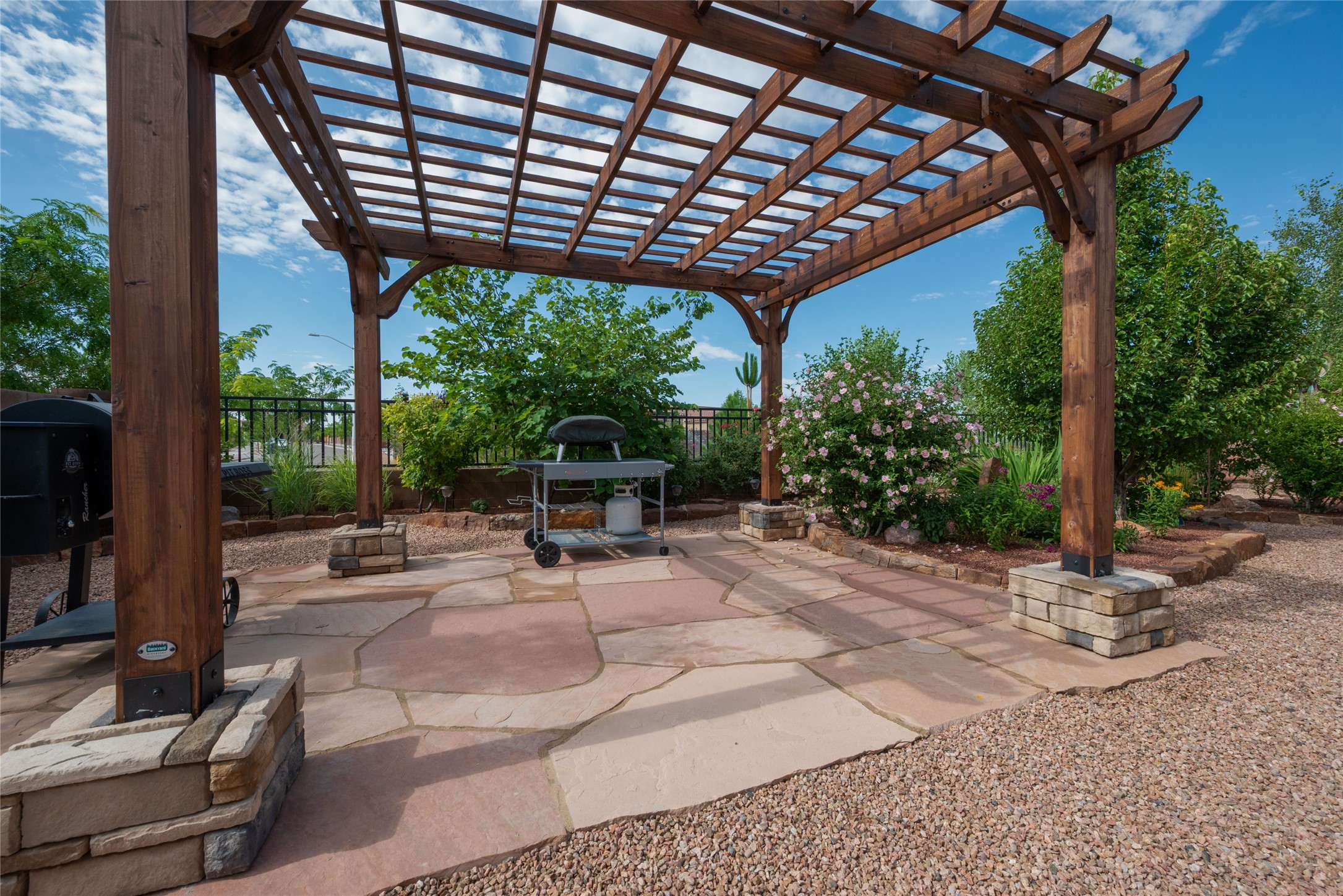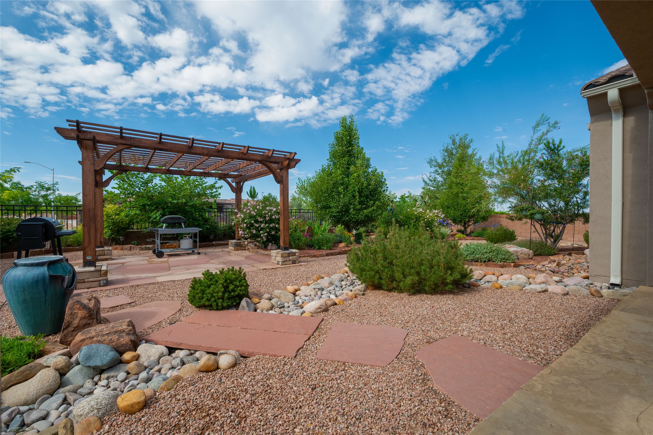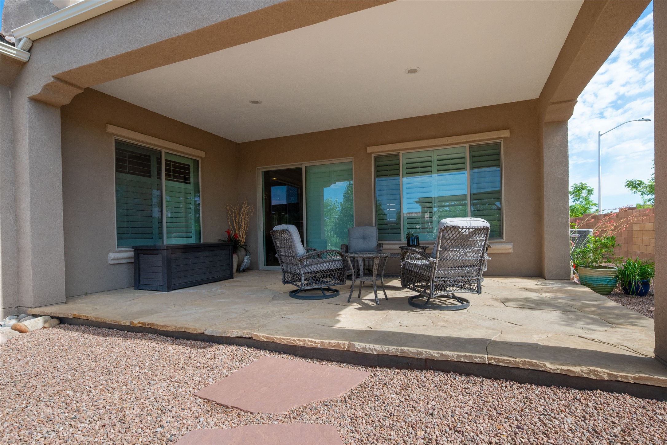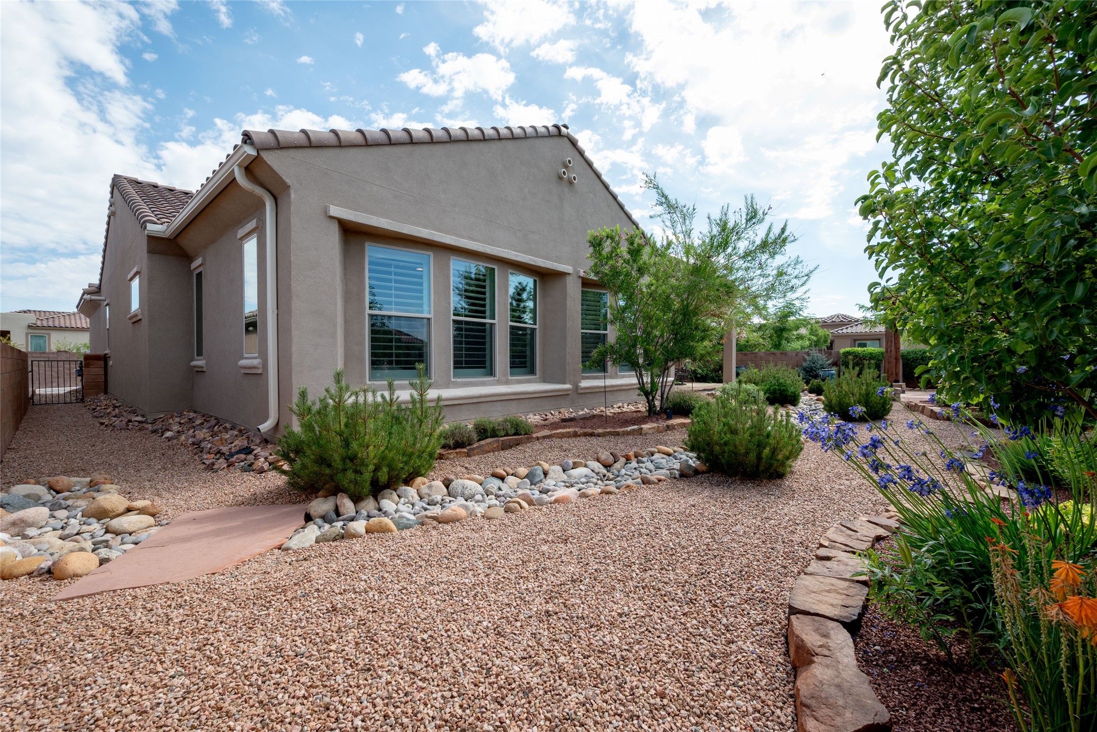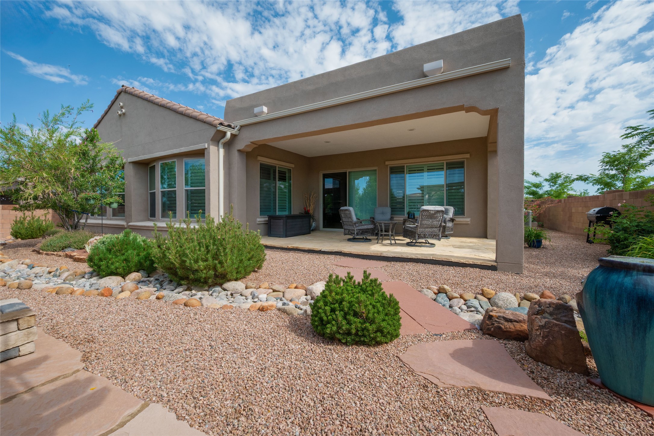 Discover the perfect blend of comfort, style, and convenience in this beautifully designed 2019 home, featuring two private en-suite bedrooms ideal for hosting guests with ease. High-level finishes throughout create a refined yet inviting atmosphere, while the thoughtfully landscaped yard offers year-round beauty with minimal upkeep. The open floor plan accommodates easy living with a kitchen any chef will love. The spacious en-suite bedrooms enjoy separation ensuring privacy for all. A flex room with courtyard window is ideal for home office, library or media room. The large, covered flagstone portal patio off the living room overlooks the water features, gazebo and garden. The oversized garage includes extra storage, making it easy to keep everything organized without sacrificing space for your vehicles. Did we mention this home is on a greenbelt? Designed for the busy professional or those ready to downsize without compromising quality, this home offers low-maintenance living in a serene setting-just move in and enjoy. Shopping, dining and medical options are all nearby. The Las Soleras community offers walking paths and greenspaces for residents to enjoy.