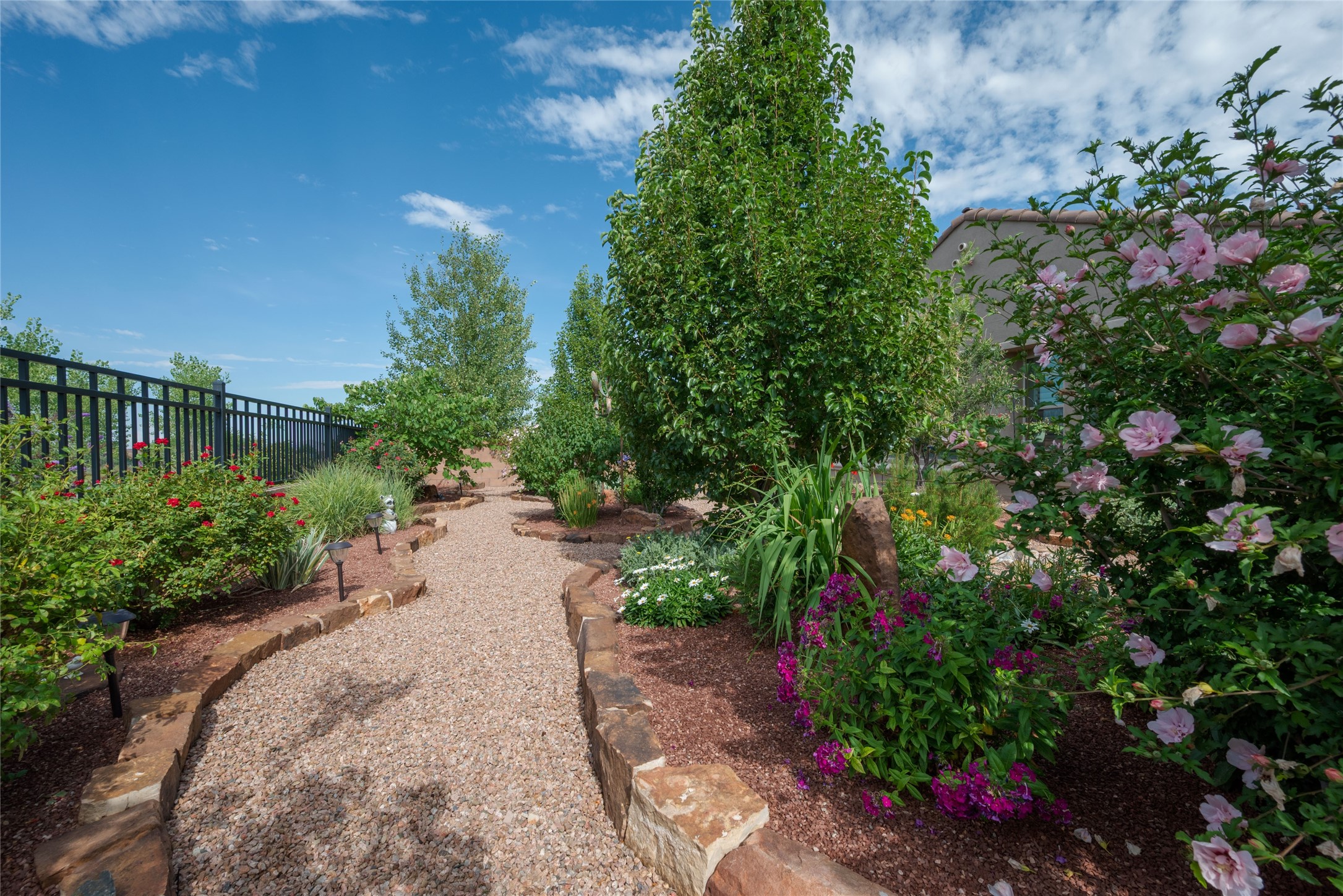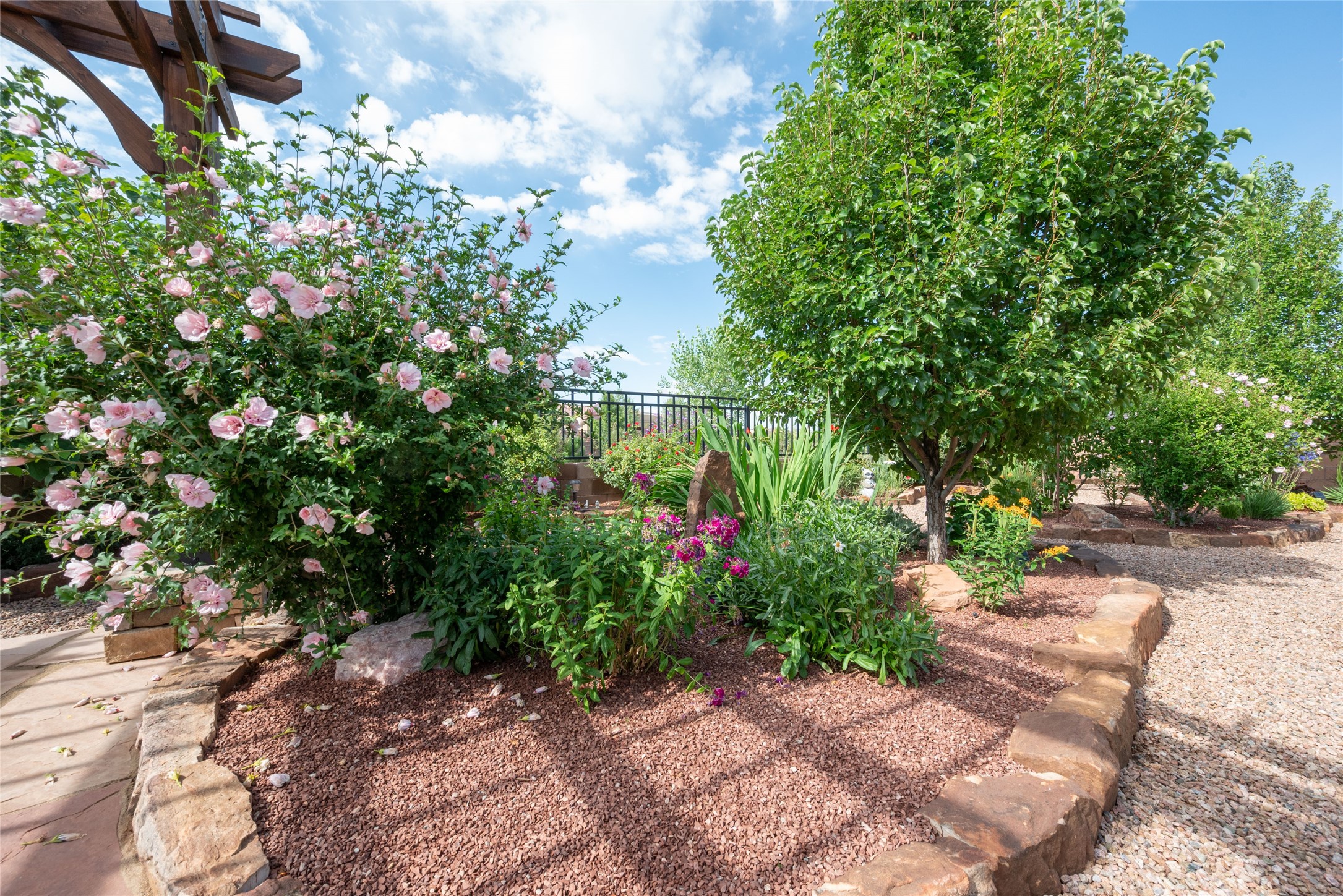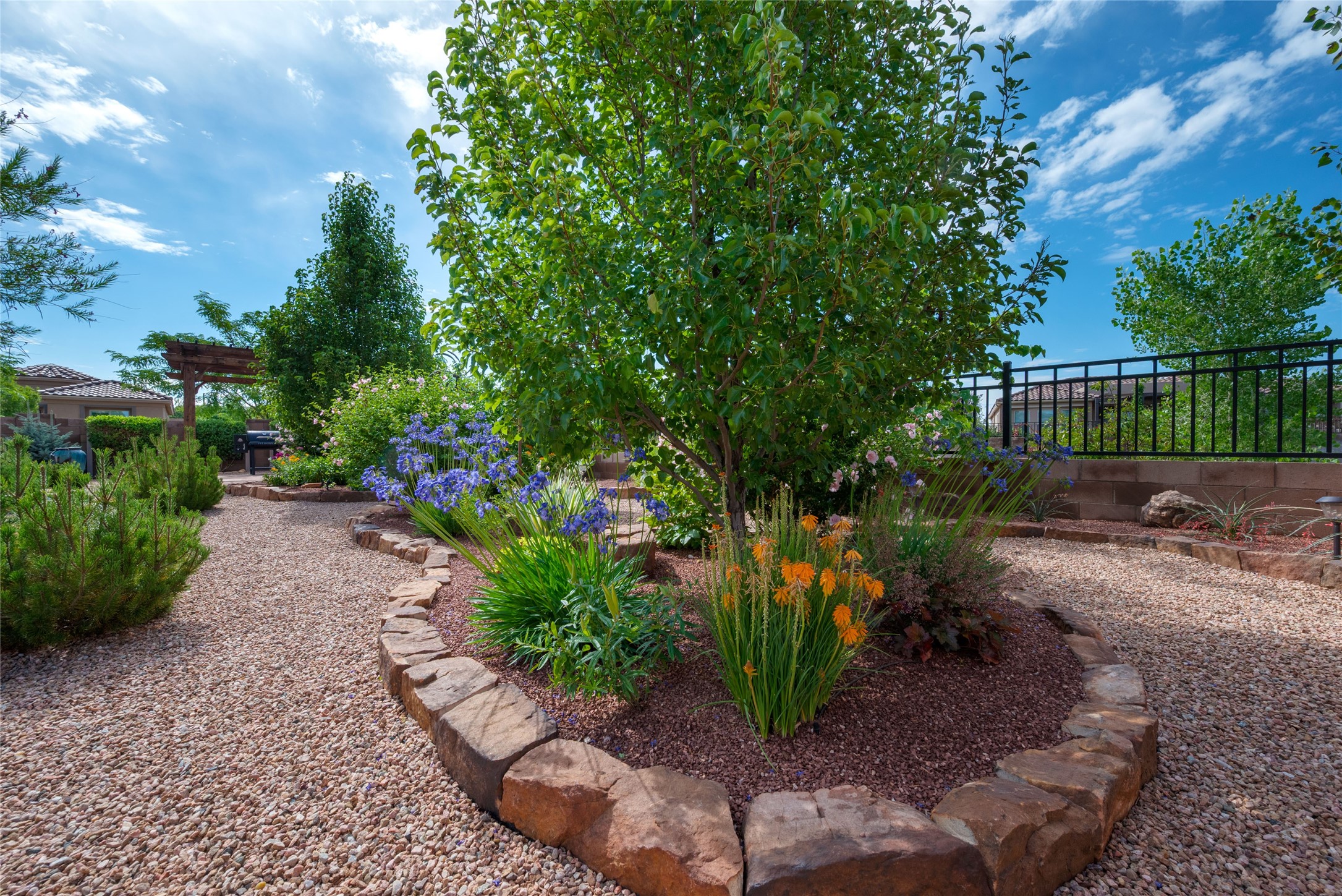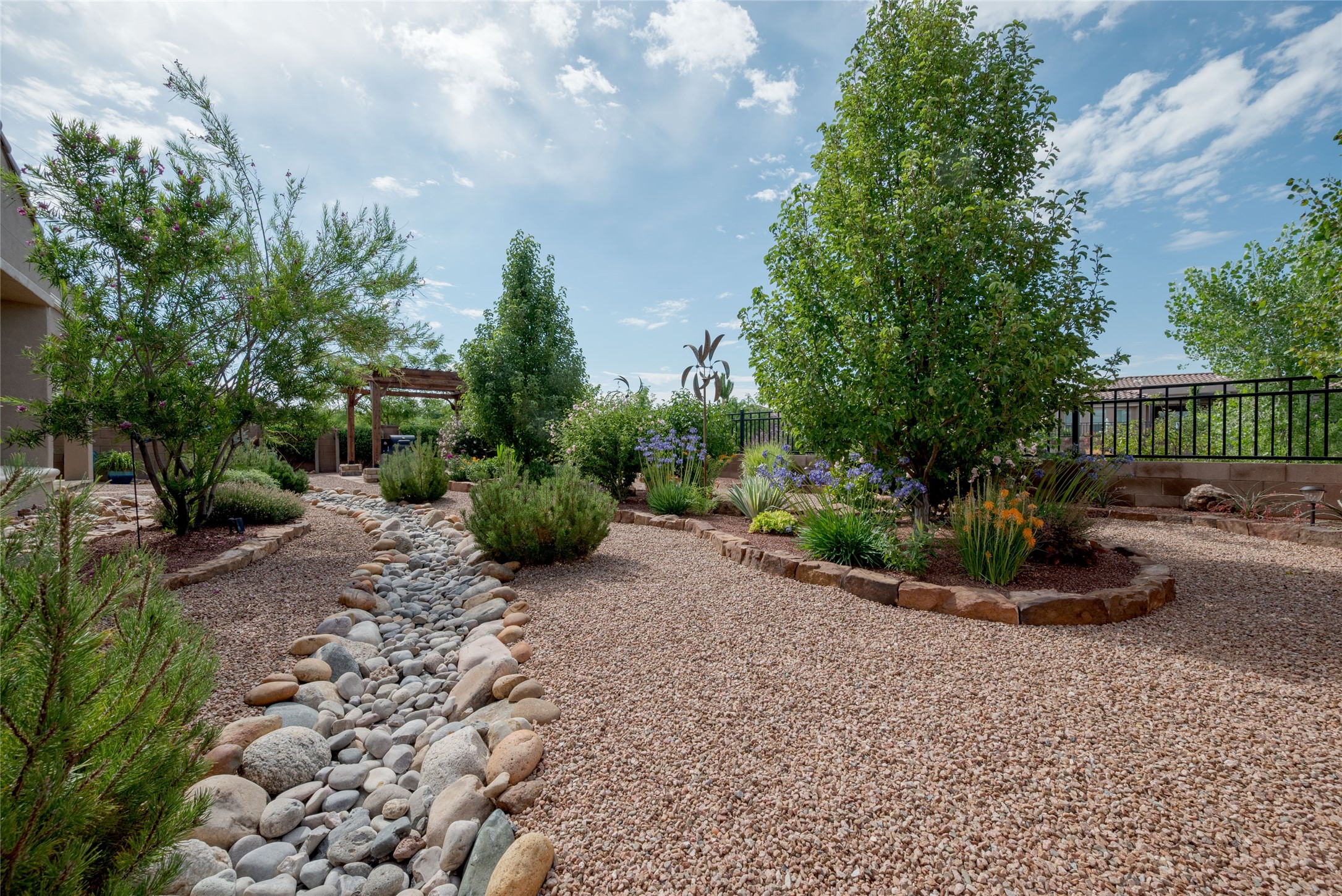 Discover the perfect blend of comfort, style, and convenience in this beautifully designed 2019 home, featuring two private en-suite bedrooms ideal for hosting guests with ease. High-level finishes throughout create a refined yet inviting atmosphere, while the thoughtfully landscaped yard offers year-round beauty with minimal upkeep. The open floor plan accommodates easy living with a kitchen any chef will love. The spacious en-suite bedrooms enjoy separation ensuring privacy for all. A flex room with courtyard window is ideal for home office, library or media room. The large, covered flagstone portal patio off the living room overlooks the water features, gazebo and garden. The oversized garage includes extra storage, making it easy to keep everything organized without sacrificing space for your vehicles. Did we mention this home is on a greenbelt? Designed for the busy professional or those ready to downsize without compromising quality, this home offers low-maintenance living in a serene setting-just move in and enjoy. Shopping, dining and medical options are all nearby. The Las Soleras community offers walking paths and greenspaces for residents to enjoy.