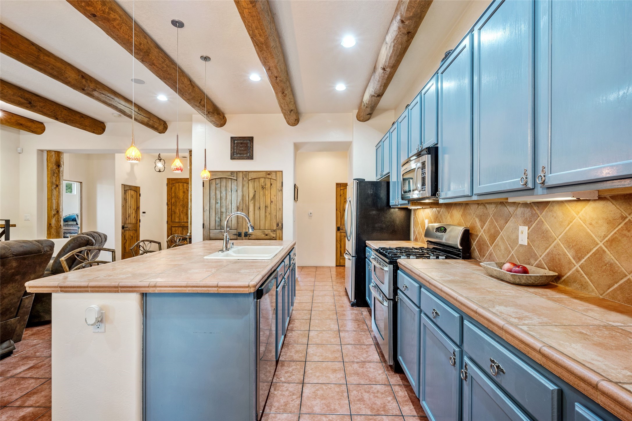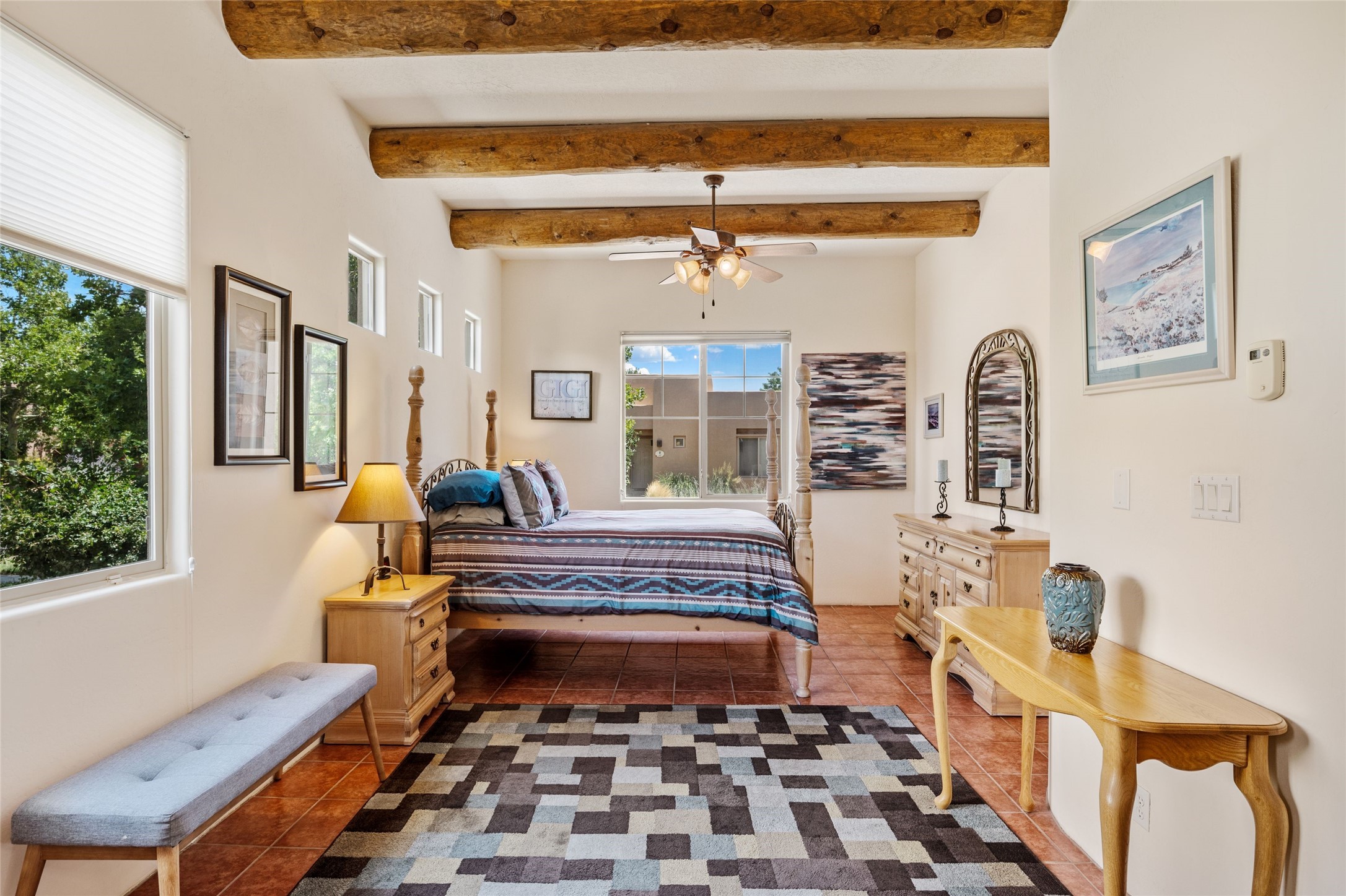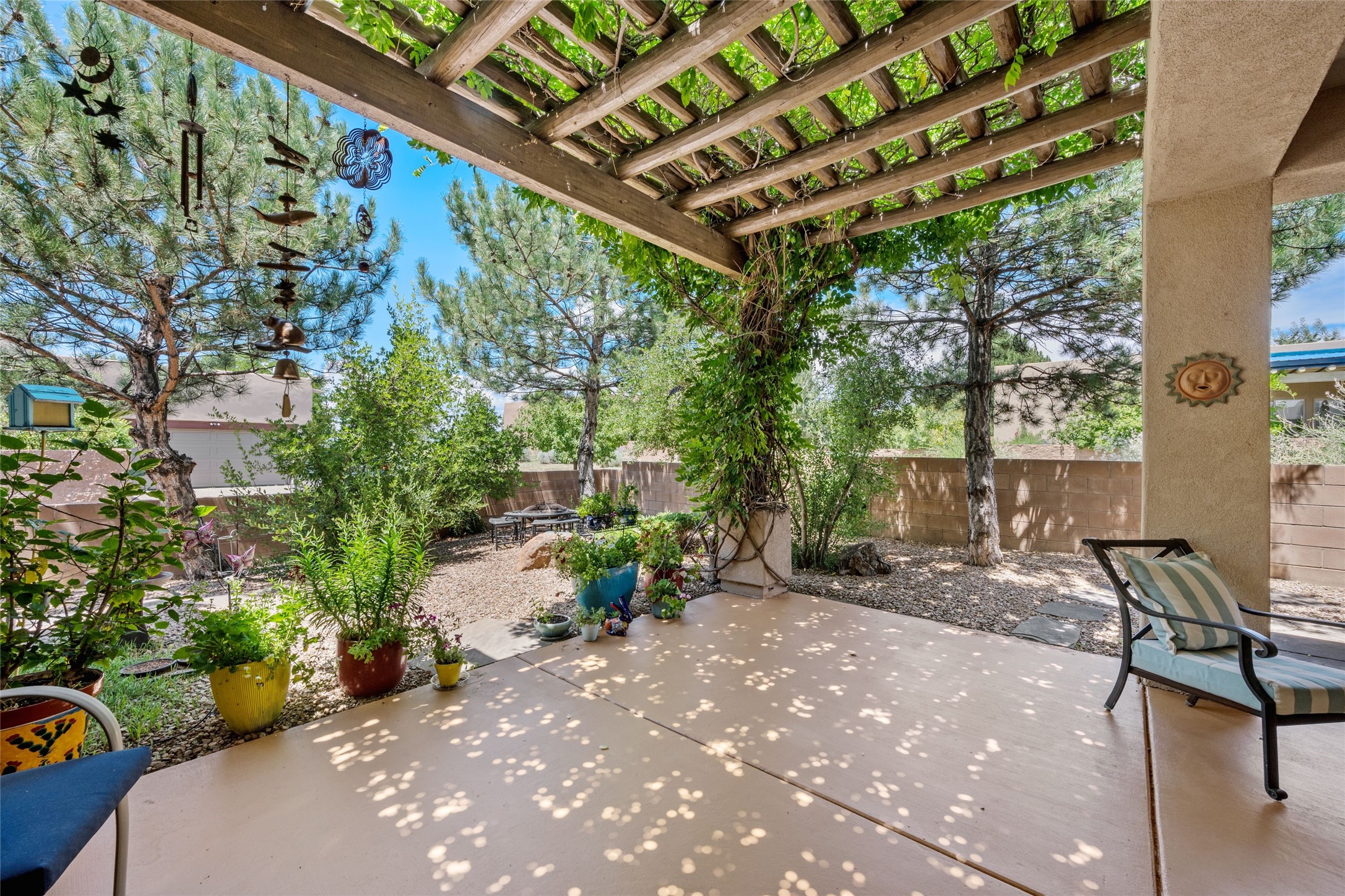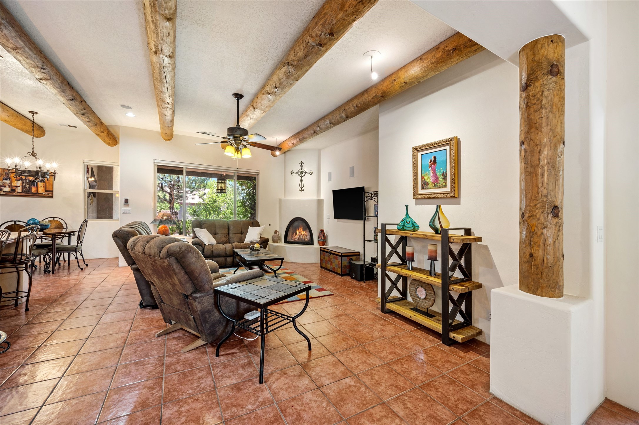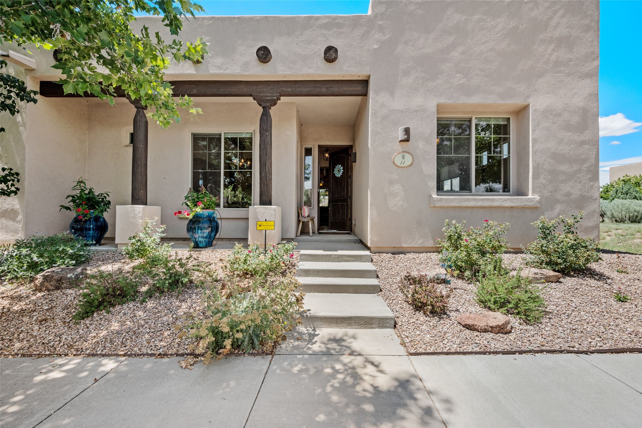 Exceptional 3-Bedroom, 2-Bath Home - Truchas Floor PlanBeautifully maintained and thoughtfully upgraded, this home showcases over $140K in enhancements completed prior to 2009 along with timeless design details. The Truchas Floor Plan is a popular single-level, split-bedroom layout designed for both privacy and flow--featuring an open central living space flanked by a secluded primary suite on one side and two guest bedrooms on the other.The private primary suite includes custom lighting, window treatments, and professional closet organizers. Architectural highlights include viga & beam ceilings, solid alder doors, a gas kiva fireplace, and insulated windows.The gourmet kitchen is equipped with stainless steel Maytag appliances--including a built-in microwave--plus a large sink, a 'Good Water' filtration system and softener, and abundant storage. The open living area includes built-in surround sound for the television system, ideal for entertaining. Year-round comfort is ensured with radiant heating, refrigerated air, and all-tile flooring.Additional features include an extended insulated garage and beautifully landscaped grounds with irrigation system, an extended covered portal for outdoor living, and security system with motion activated lights. Dryer replaced in 2022. Energy Star-rated for efficiency, with exceptional quality.Located next to a green space walkway to a children's park within Rancho Viejo, a master-planned Santa Fe community known for its scenic open spaces, village-style design, and over 12 miles of walking trails, this home offers both a peaceful setting and convenient access to shopping, schools, parks, and downtown Santa Fe.