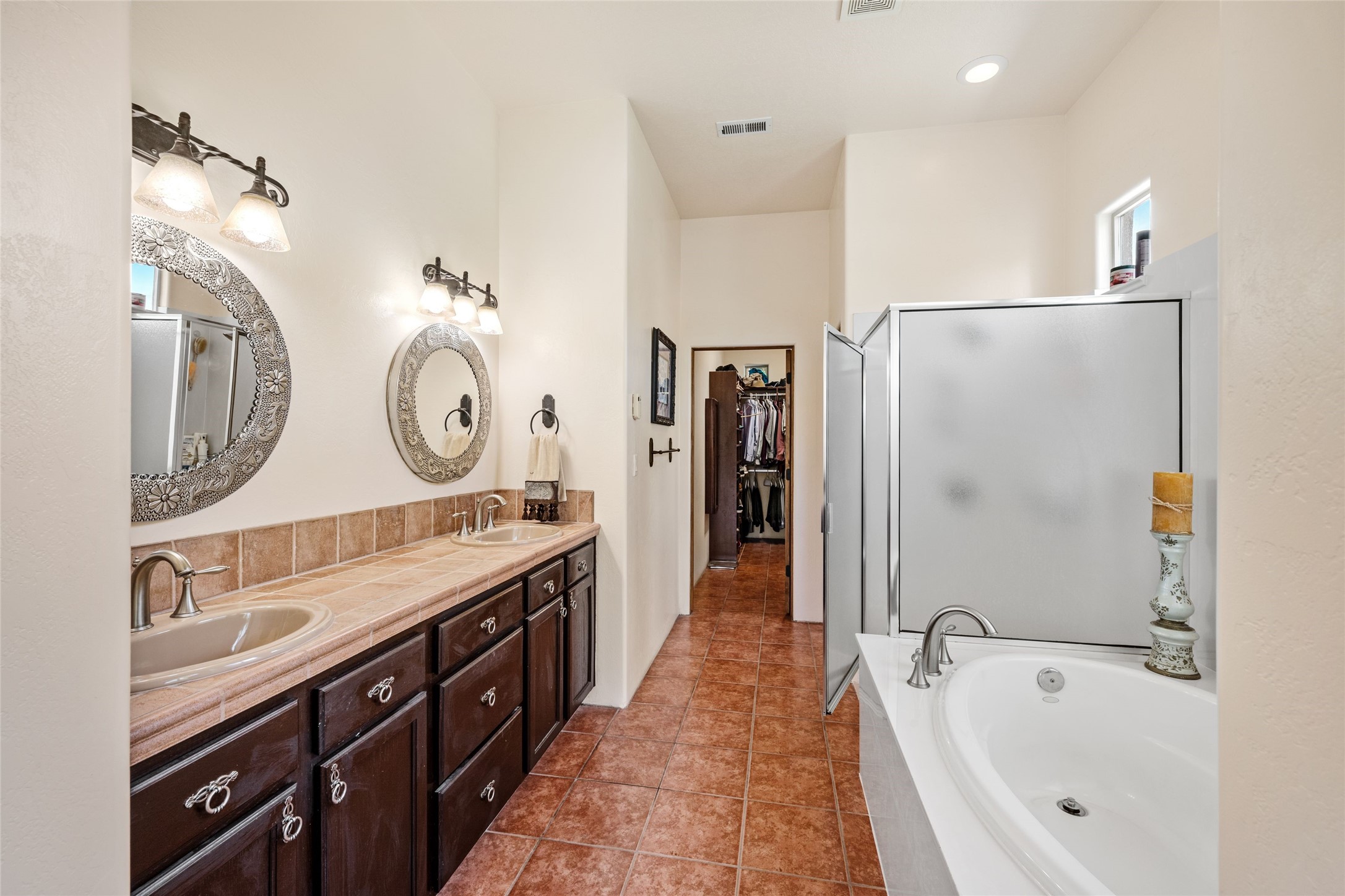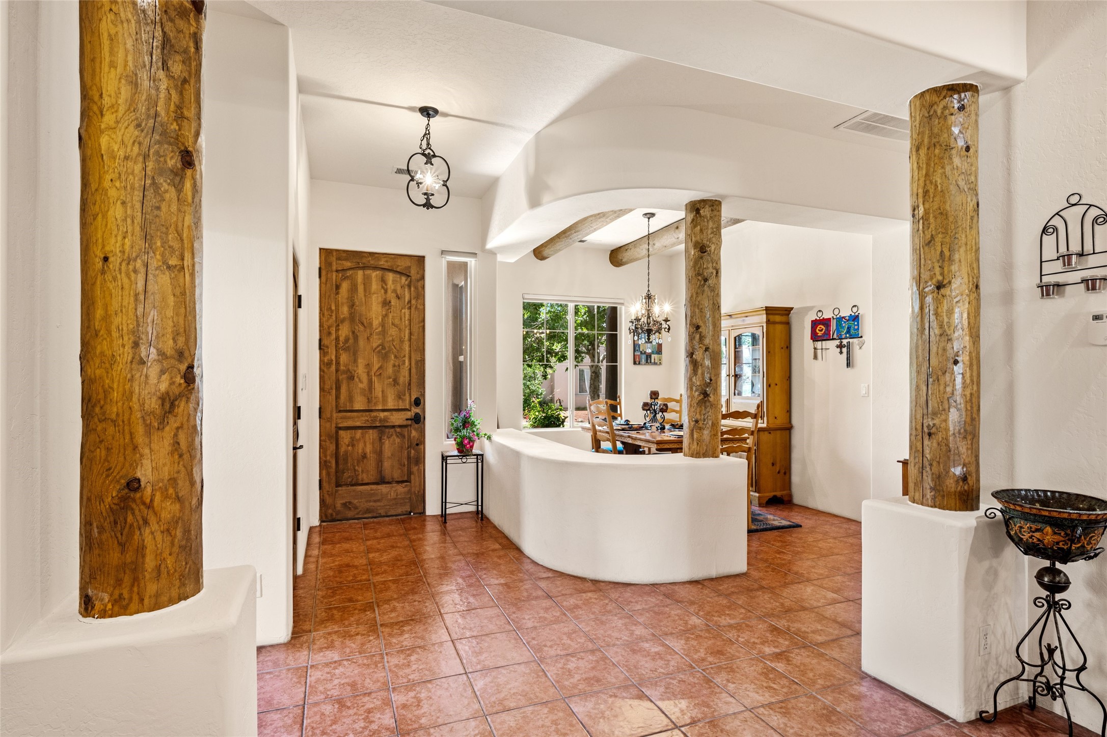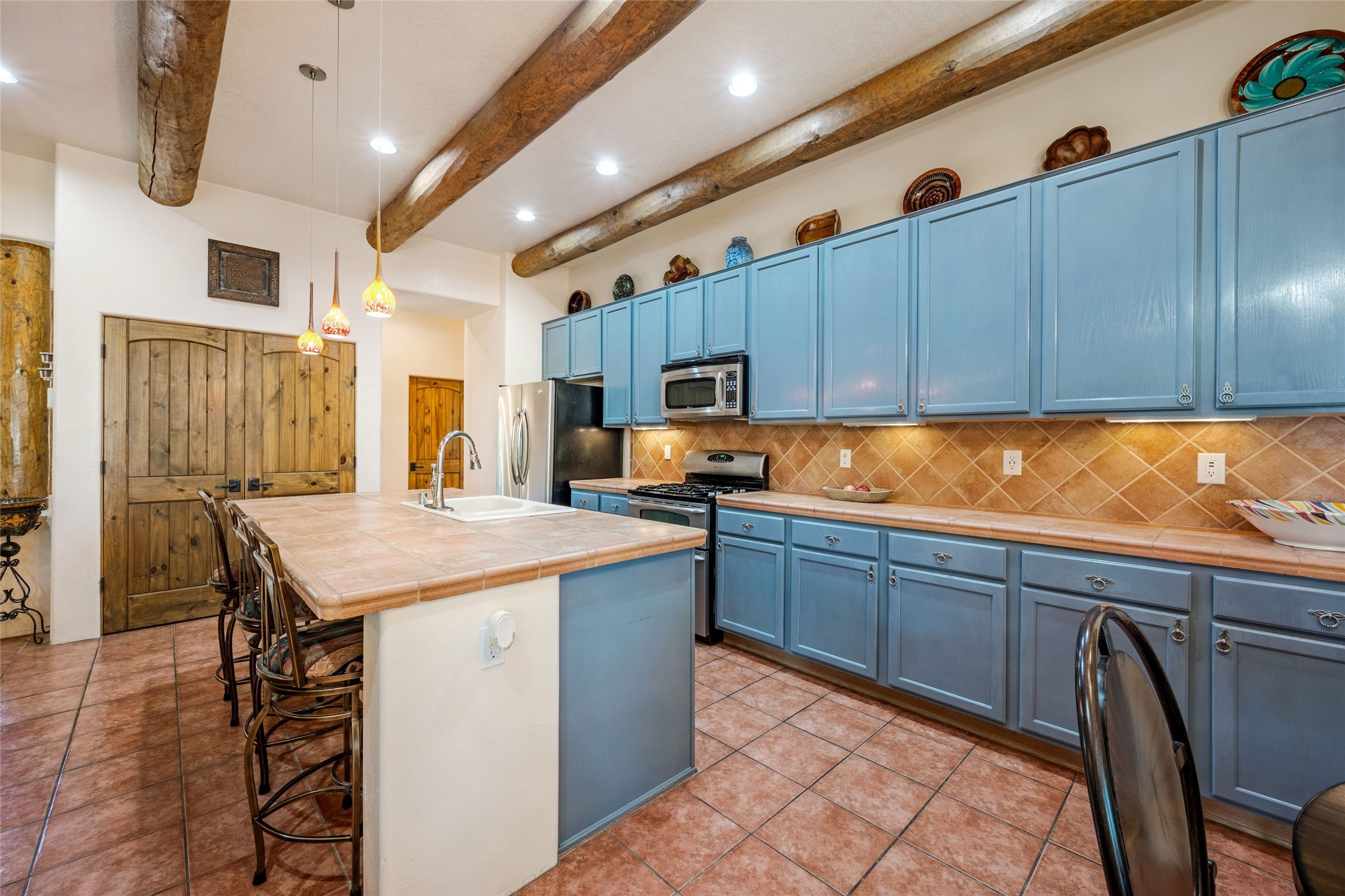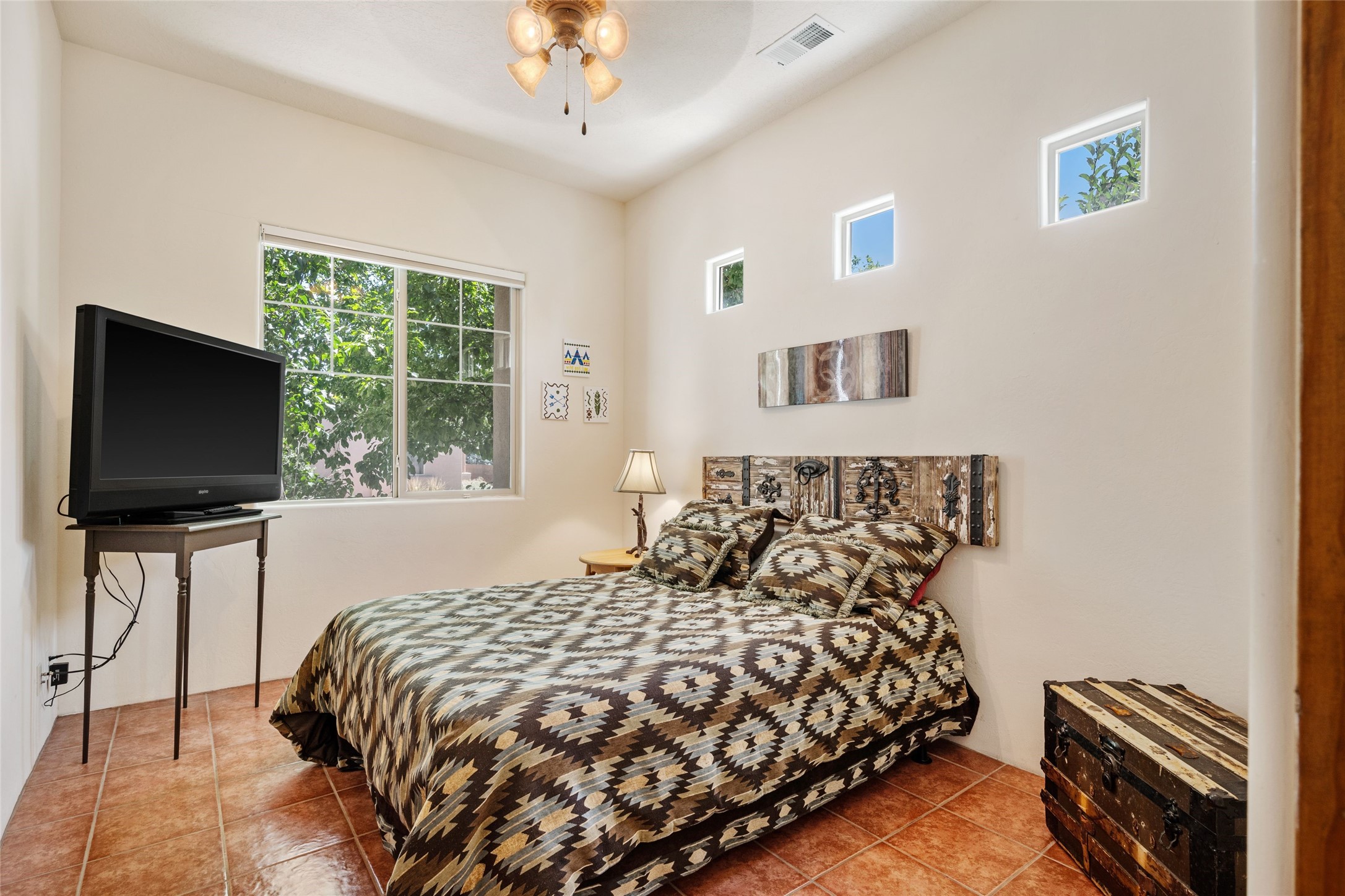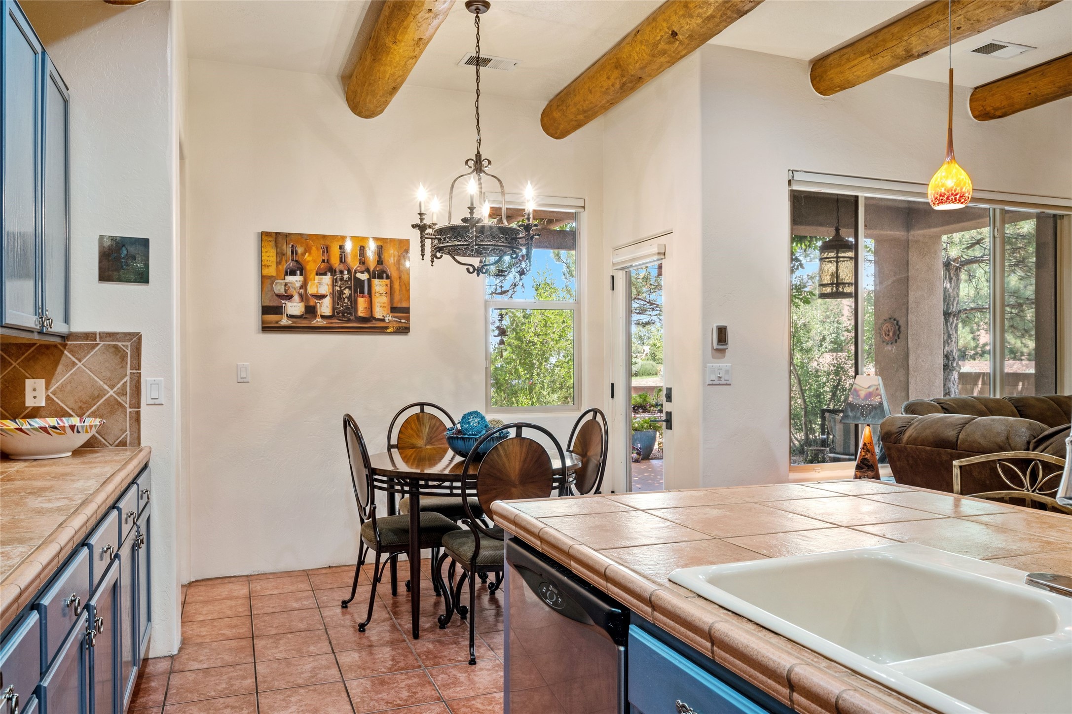 Exceptional 3-Bedroom, 2-Bath Home - Truchas Floor PlanBeautifully maintained and thoughtfully upgraded, this home showcases over $140K in enhancements completed prior to 2009 along with timeless design details. The Truchas Floor Plan is a popular single-level, split-bedroom layout designed for both privacy and flow--featuring an open central living space flanked by a secluded primary suite on one side and two guest bedrooms on the other.The private primary suite includes custom lighting, window treatments, and professional closet organizers. Architectural highlights include viga & beam ceilings, solid alder doors, a gas kiva fireplace, and insulated windows.The gourmet kitchen is equipped with stainless steel Maytag appliances--including a built-in microwave--plus a large sink, a 'Good Water' filtration system and softener, and abundant storage. The open living area includes built-in surround sound for the television system, ideal for entertaining. Year-round comfort is ensured with radiant heating, refrigerated air, and all-tile flooring.Additional features include an extended insulated garage and beautifully landscaped grounds with irrigation system, an extended covered portal for outdoor living, and security system with motion activated lights. Dryer replaced in 2022. Energy Star-rated for efficiency, with exceptional quality.Located next to a green space walkway to a children's park within Rancho Viejo, a master-planned Santa Fe community known for its scenic open spaces, village-style design, and over 12 miles of walking trails, this home offers both a peaceful setting and convenient access to shopping, schools, parks, and downtown Santa Fe.