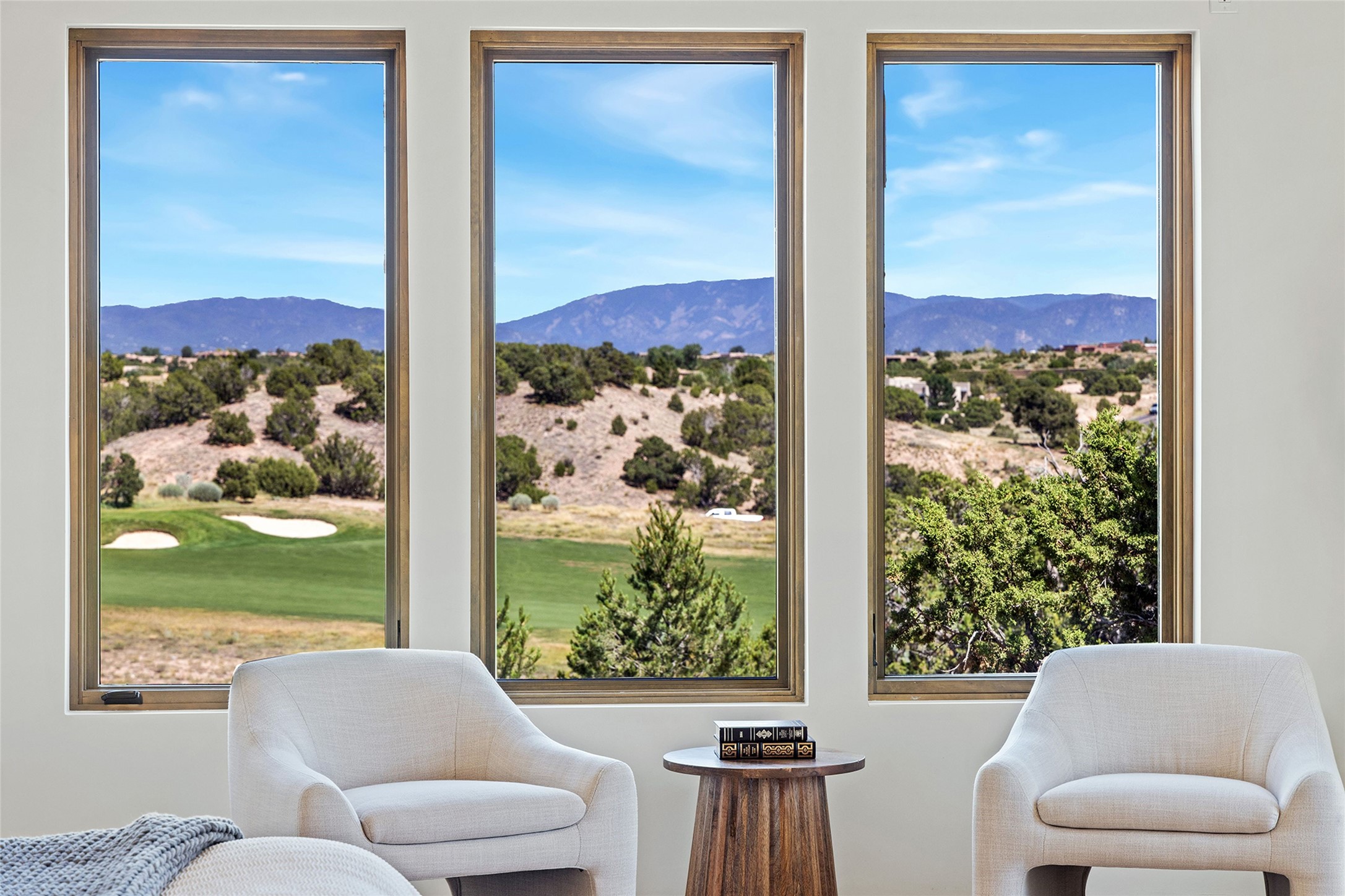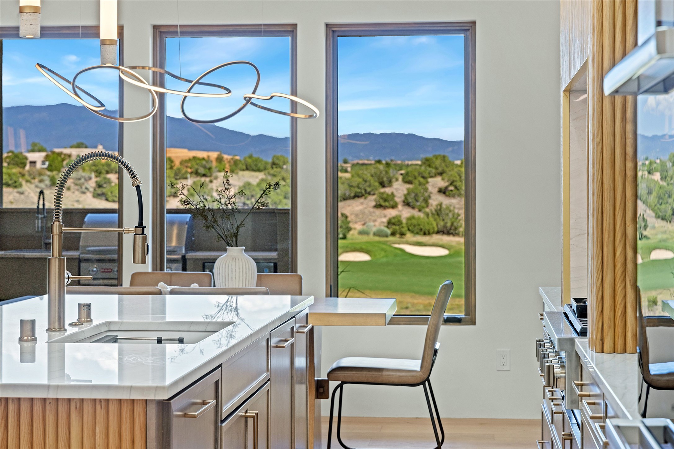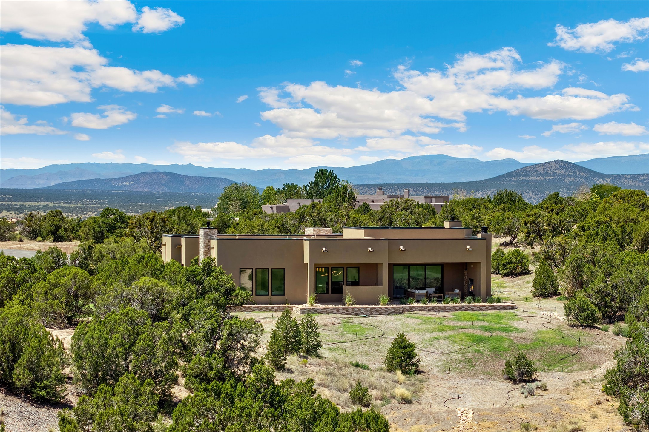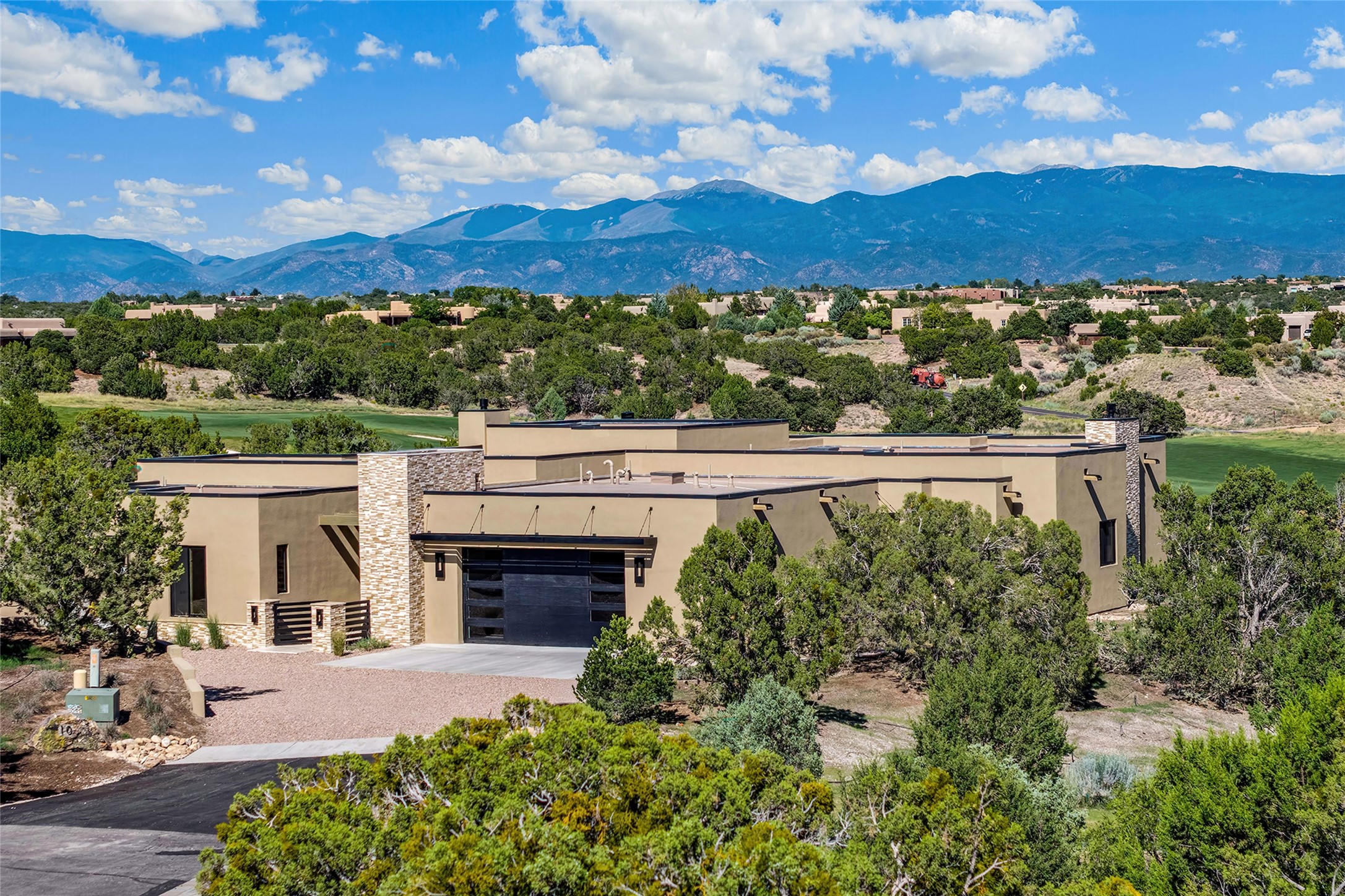 Welcome to 10 Calle Arbusto, an exceptional 2025-built custom contemporary masterpiece by the renowned builder, Clay Custom Homes. Recently completed and featured in the 2025 Haciendas Parade of Homes, this tranquil retreat is perched high above it all, offering breathtaking views of the 17th fairway at Sunset Golf Course and stunning Sangre de Cristo Mountain views. This rare offering showcases striking architecture paired with high-end designer finishes. Located within the famed community of Las Campanas, within close proximity to The Club at Las Campanas, (2) Jack Nicklaus golf courses, Spa, Swim, Tennis & Fitness Center, this home is designed to provide the ultimate indoor-outdoor living experience, ideal as a primary residence or a luxurious secondary retreat. The single-level, open-concept layout features a spacious living room with a wet bar and wine cooler, gas fireplace, sliding glass doors and a spacious dining area that seamlessly extends to outdoor living spaces, including a covered portal with an outdoor fireplace. The state-of-the-art island kitchen boasts expansive mountain and golf course views, rich cabinetry, tambour wood accents, a walk-in pantry, and top-of-the-line Dacor appliances and (2) dishwashers. The generously sized owner's suite delights with views, portal access and a spa-inspired bathroom with a glass walk-in shower, soaking tub, and a large walk-in closet. The separate guest wing includes two ensuite bedrooms and a versatile living room, perfect for accommodating guests, or a media room. Additional features include a private dedicated office, built-in BBQ/grilling station and outdoor kitchen, wood flooring, exotic stone countertops, abundant natural light, rich beam accents in the living room, and an oversized 2 car garage. This home exemplifies the pride and craftsmanship that embody the true Santa Fe lifestyle. Membership to The Club at Las Campanas is optional and by invitation only, though required to access all Club amenities.