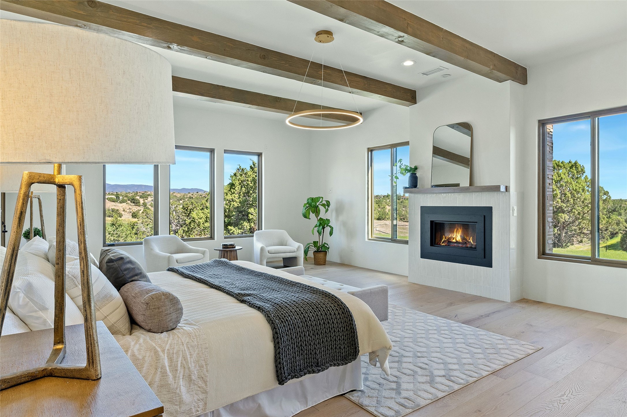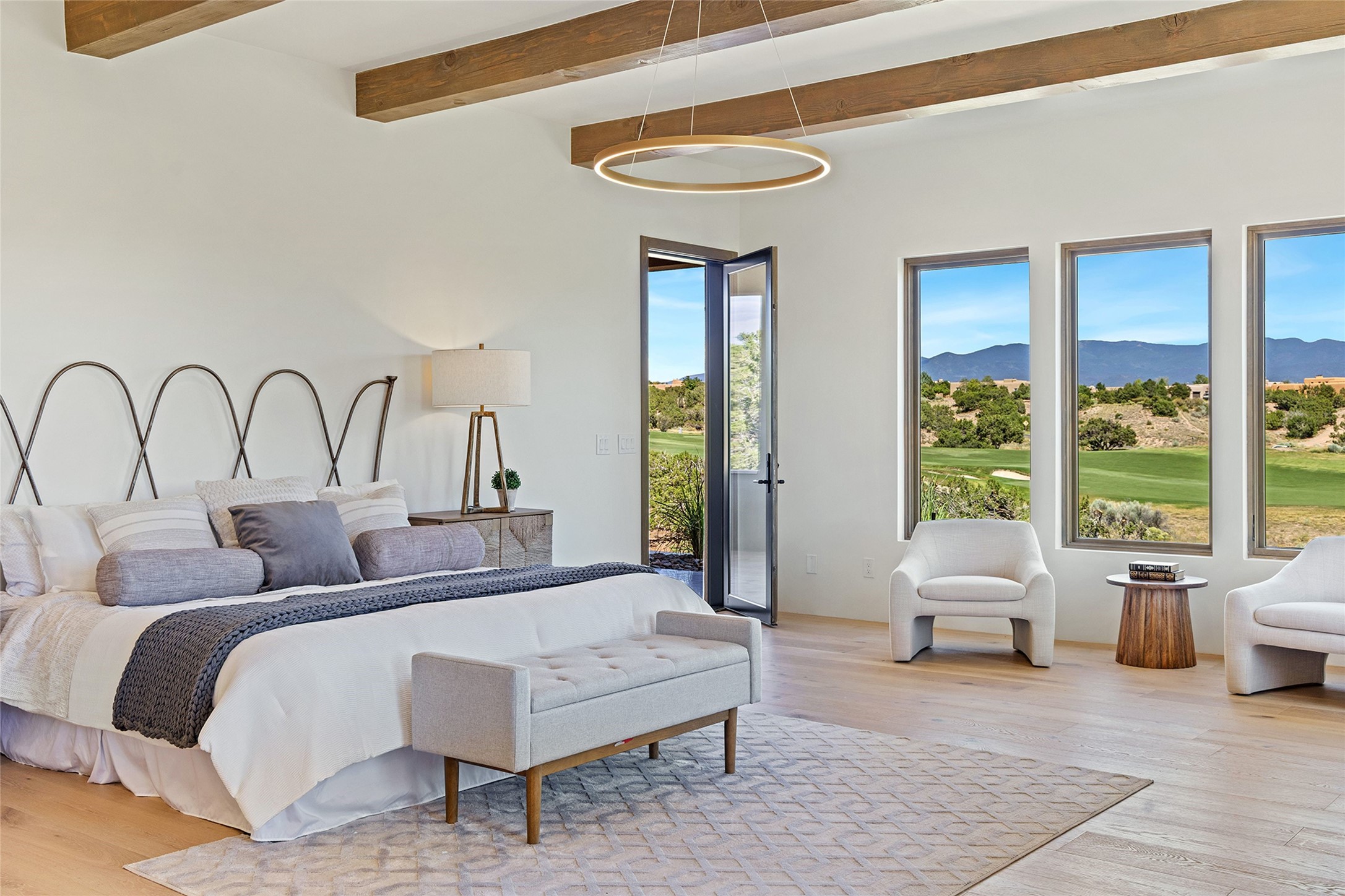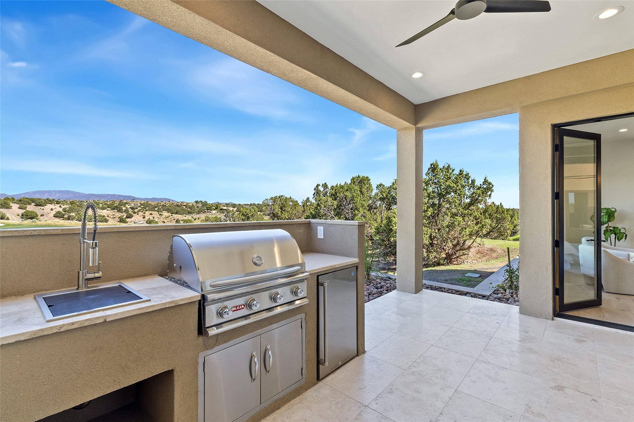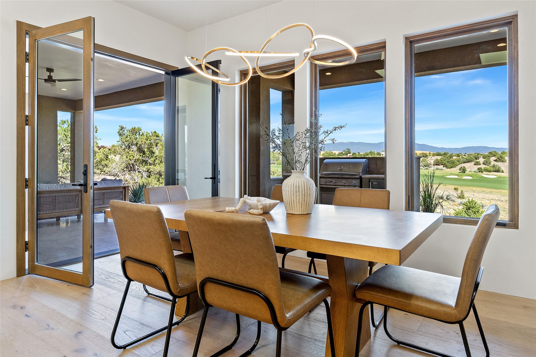 Welcome to 10 Calle Arbusto, an exceptional 2025-built custom contemporary masterpiece by the renowned builder, Clay Custom Homes. Recently completed and featured in the 2025 Haciendas Parade of Homes, this tranquil retreat is perched high above it all, offering breathtaking views of the 17th fairway at Sunset Golf Course and stunning Sangre de Cristo Mountain views. This rare offering showcases striking architecture paired with high-end designer finishes. Located within the famed community of Las Campanas, within close proximity to The Club at Las Campanas, (2) Jack Nicklaus golf courses, Spa, Swim, Tennis & Fitness Center, this home is designed to provide the ultimate indoor-outdoor living experience, ideal as a primary residence or a luxurious secondary retreat. The single-level, open-concept layout features a spacious living room with a wet bar and wine cooler, gas fireplace, sliding glass doors and a spacious dining area that seamlessly extends to outdoor living spaces, including a covered portal with an outdoor fireplace. The state-of-the-art island kitchen boasts expansive mountain and golf course views, rich cabinetry, tambour wood accents, a walk-in pantry, and top-of-the-line Dacor appliances and (2) dishwashers. The generously sized owner's suite delights with views, portal access and a spa-inspired bathroom with a glass walk-in shower, soaking tub, and a large walk-in closet. The separate guest wing includes two ensuite bedrooms and a versatile living room, perfect for accommodating guests, or a media room. Additional features include a private dedicated office, built-in BBQ/grilling station and outdoor kitchen, wood flooring, exotic stone countertops, abundant natural light, rich beam accents in the living room, and an oversized 2 car garage. This home exemplifies the pride and craftsmanship that embody the true Santa Fe lifestyle. Membership to The Club at Las Campanas is optional and by invitation only, though required to access all Club amenities.