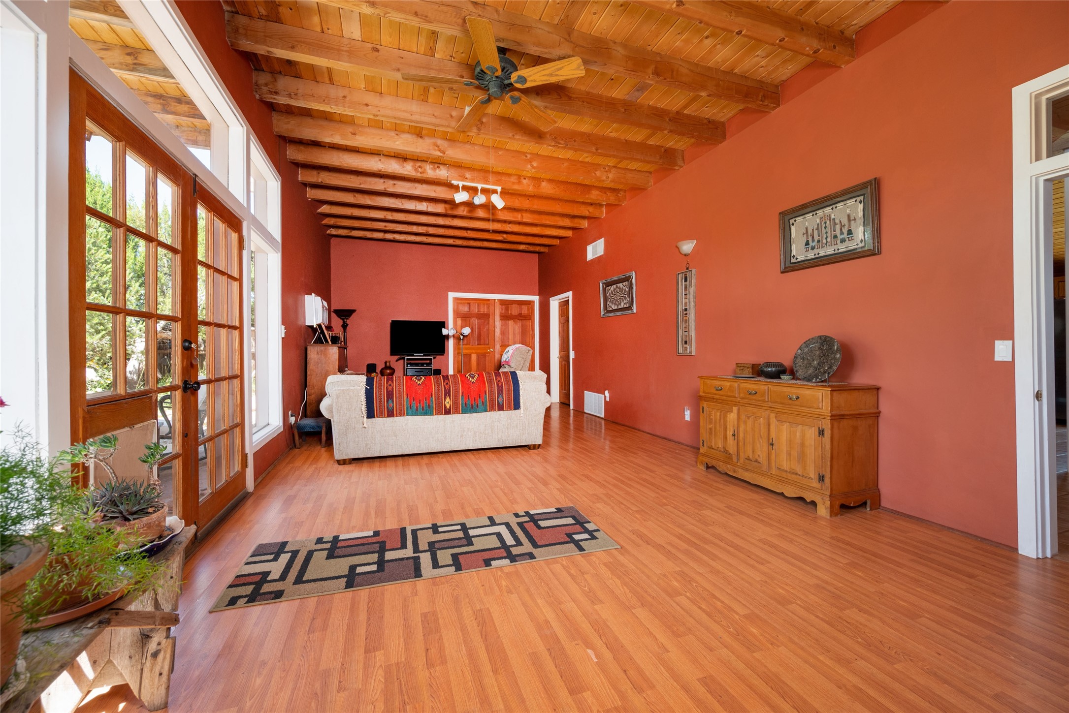 Expansive Views and Endless Possibilities: A Country Retreat on 10 Acres Near Santa FeTucked away in the tranquility of Northern New Mexico, this distinctive property offers a rare combination of privacy, natural beauty, and versatility. Situated on 2 acres with three additional deeded lots--totaling 10 acres--this home invites a lifestyle immersed in sweeping vistas, open skies, and quietude, all within easy reach of Santa Fe.The main residence spans 2,214 square feet, plus 969 sq.ft guest house for 3,383 sq.ft. thoughtfully designed to capture the light and landscape from every room. Warm wood beams, natural flooring, and vaulted ceilings bring a rustic elegance to the interior, enhancing the home's connection to its surroundings. A sun porch entry welcomes you in, setting the tone for a home that is both inviting and expansive.The heart of the home is a custom-designed kitchen with a generous island and adjacent dining area. A gas fireplace adds warmth and ambiance, making it a comfortable space for both quiet meals and lively gatherings. With three bedrooms and three baths, the layout offers flexibility, with the bedrooms that can serve as home offices.The primary suite is a true retreat, featuring a private walk-out balcony, a luxurious whirlpool tub, and breathtaking 360-degree views of the surrounding high plateaus and mountains. Every aspect of this space is designed to create a sense of peace and immersion in the landscape.Attached to the main home is a 969-square-foot guest house, complete with a private entrance, view patio, and three-quarter bath. Whether used for visiting family, long-term guests, or as a rental opportunity, this space offers comfort and privacy without compromising on style.Beyond the living spaces, the property presents substantial value in its land. The three additional lots included in the sale not only offer privacy but also development potential. One of the lots (Lot 3) is already equipped with a transformer and community water access, making it ready for construction--ideal for a second home, studio, or income-generating property.Modern infrastructure meets rural living, with high-speed internet already in place and reliable year-round road access. Located just 25 minutes from Eldorado and another 10 minutes from Santa Fe, the home offers a rare balance: peaceful country living within commuting distance to town amenities, cultural attractions, and restaurants.This is more than a home--it's an opportunity to embrace a different pace of life, where wide-open space, architectural warmth, and modern comfort converge. Whether you're seeking a full-time residence, a family compound, or an investment with room to grow, this remarkable 10-acre estate invites you to imagine the possibilities.