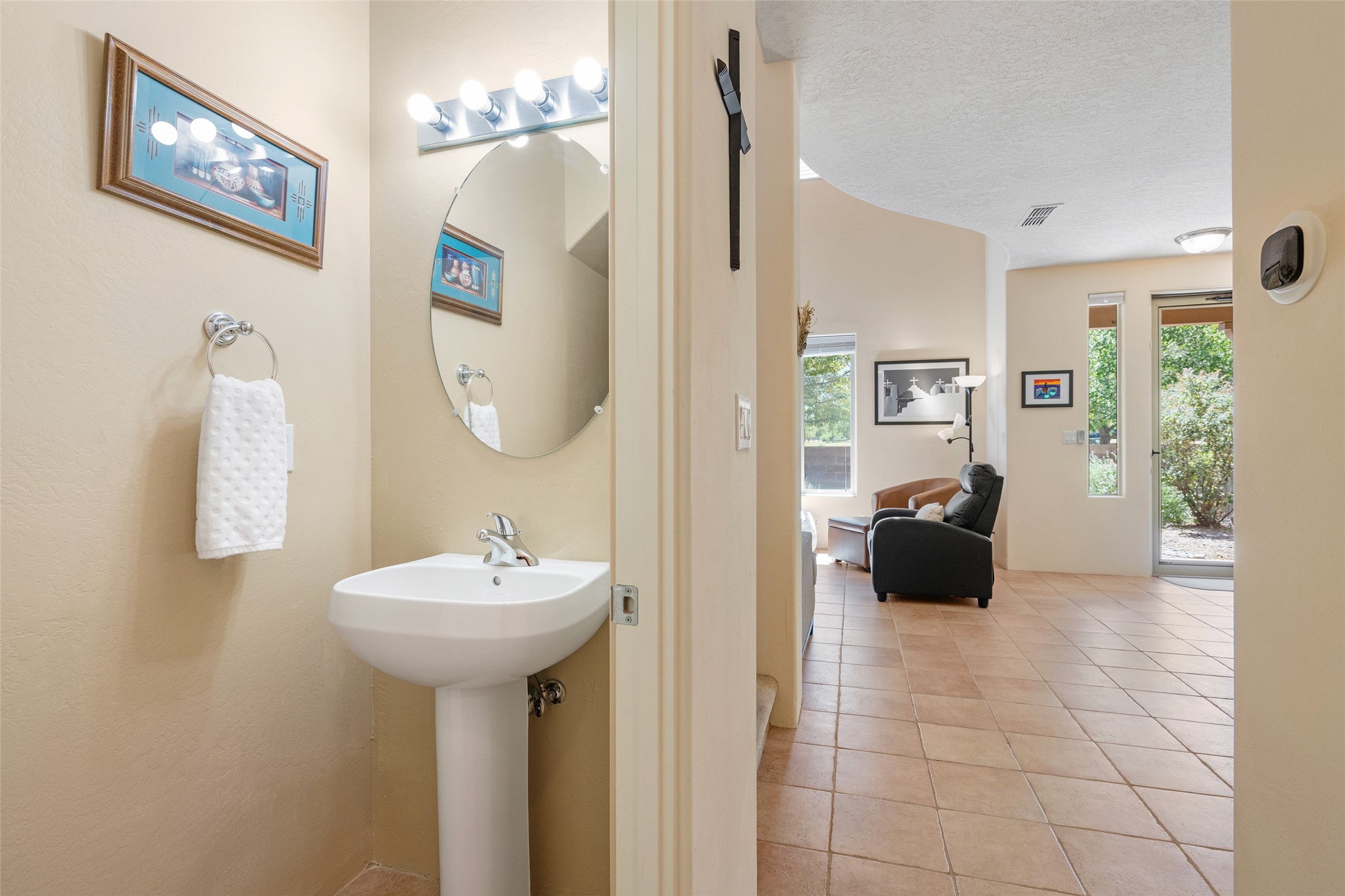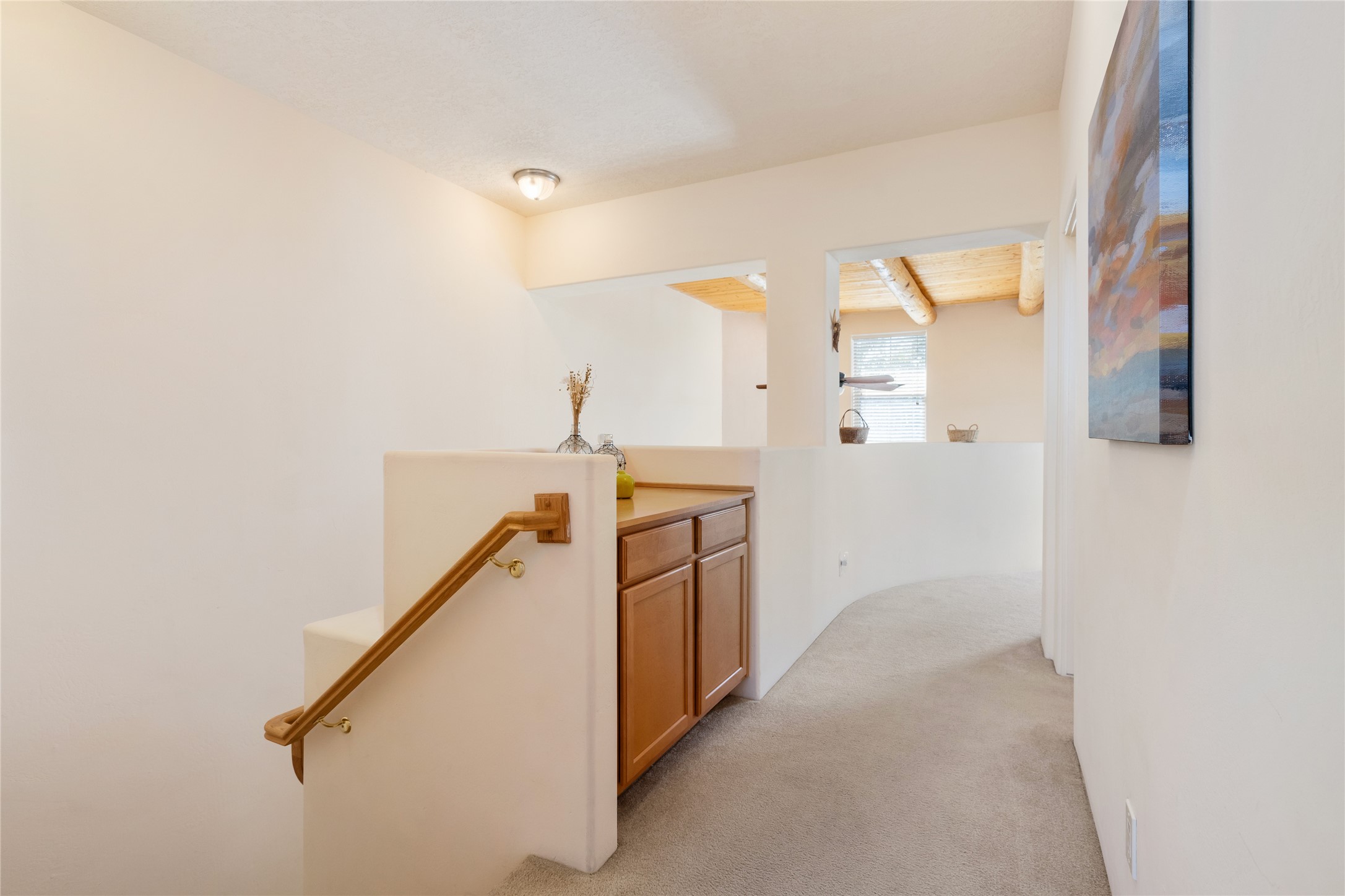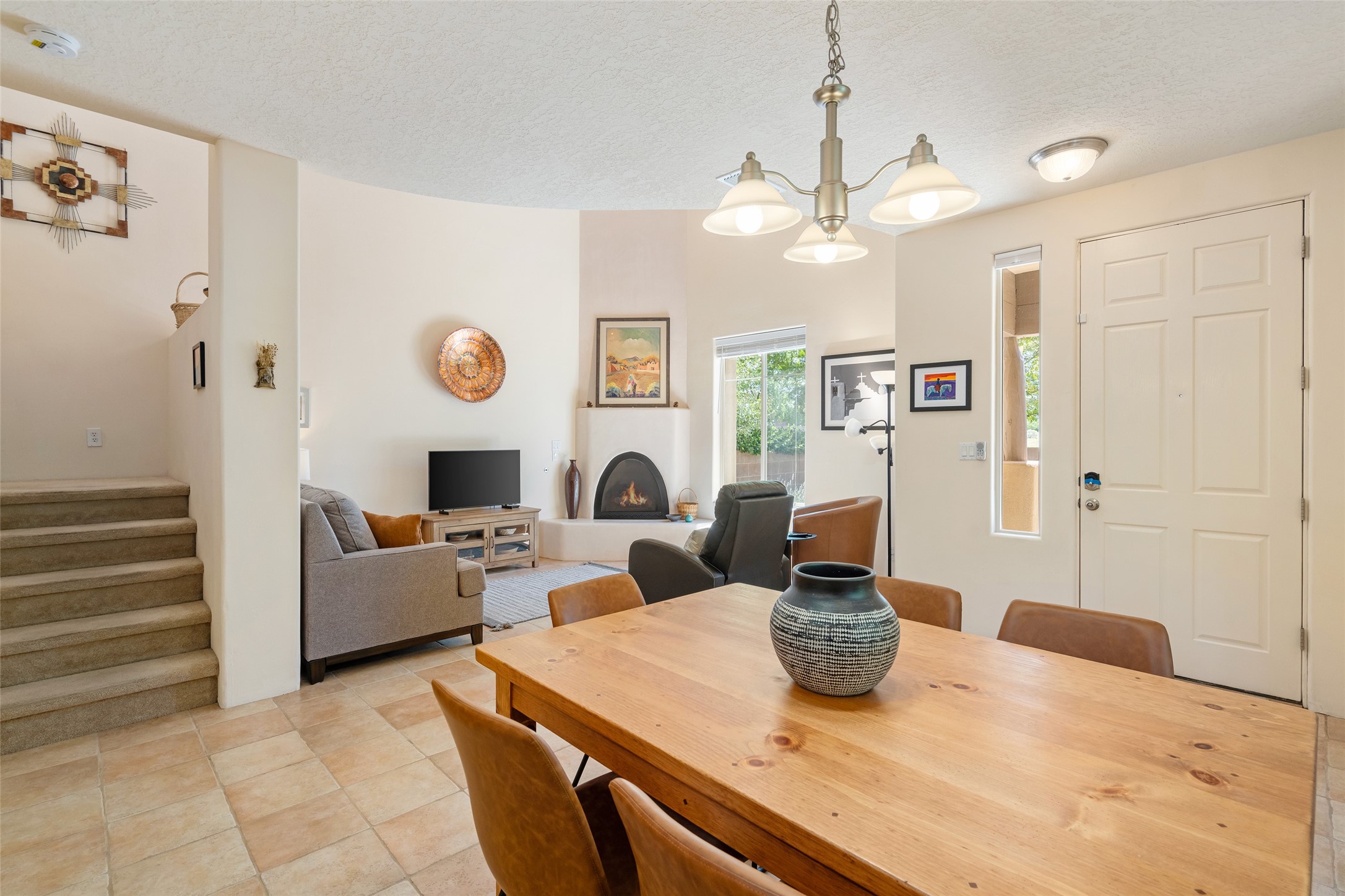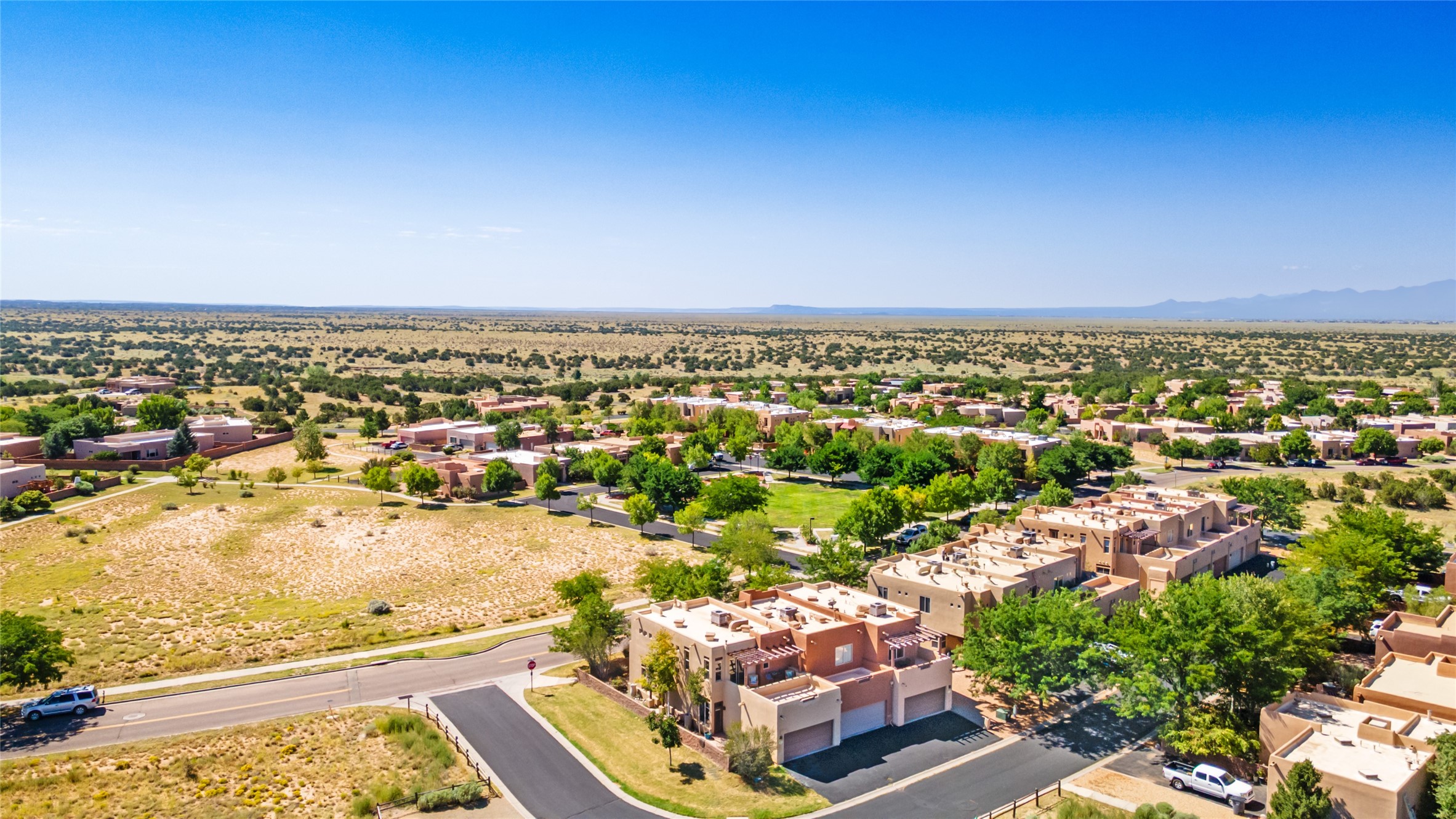 The seller will pay 1 YEAR HOA DUES with an acceptable offer for this Outstanding Windmill Ridge Townhome! So lightly lived in, you'll be amazed at its pristine condition! Located in the desirable Windmill Ridge area of Rancho Viejo, this turn-key property is ideal for full-time living or as a low-maintenance lock-and-leave. The main living area features beautiful tile floors and a soaring 20-foot ceiling, creating an open and expansive feel. A charming gas kiva fireplace, vigas, and wood ceilings add authentic Santa Fe warmth. The kitchen offers generous storage within maple cabinetry, complemented by soft neutral-toned tile countertops. A convenient laundry room and powder bath are located on the main level. Upstairs, a versatile loft provides the perfect space for a home office, media area, or reading nook, complete with a small balcony overlooking southern views and the neighborhood park. The primary suite boasts its own spacious balcony with sweeping views of designated open space and both the Jemez and Sangre de Cristo mountains. This immaculate home is part of a welcoming community featuring over 12 miles of paved walking trails, multiple parks, and an active HOA. Exterior maintenance is included in the townhome dues, making for stress-free living. Priced to sell and ready for its next owner!