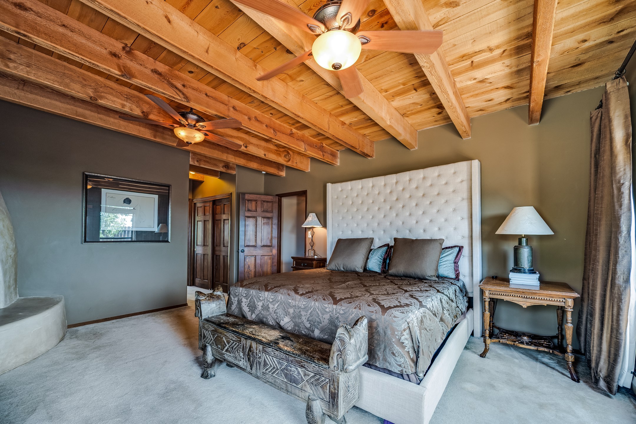 Fabulous Santa Fe detailing throughout this contemporary pueblo, open plan design. This home will wow you from landscaped entry through the foyer to view the pergola and dramatic garden fireplace. Romantic Kiva fireplaces in the owners suite, living room and study, high beam ceilings and gleaming Saltillo tile floors throughout. Remodeled spacious entertainers kitchen with large central island, a formal dining room overlooking the garden, and the main bedroom features a large walk in closet and updated spa-like bathroom. Privately fenced landscaped gardens and patios, portal and pergola for outside entertaining and enjoyment. Located on a quiet cul de sac within easy reach of the Eldorado amenities including the community center, pool, tennis, pickleball, dog parks, playgrounds, parks and disc golf, as well as 2 local shopping centers, library, senior center and schools, and only minutes into Santa Fe.