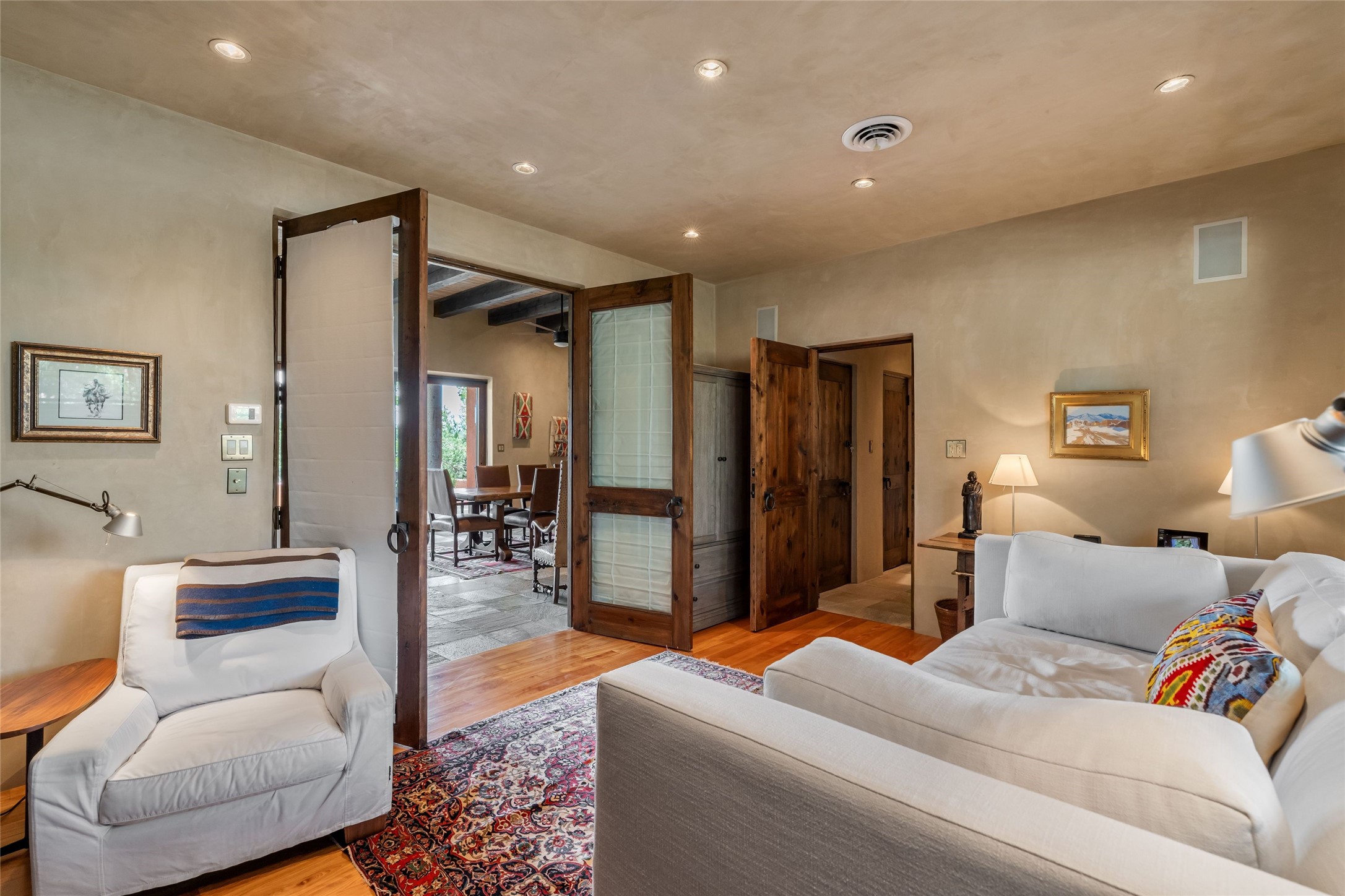 From the moment you arrive, this residence draws you in with its blend of timeless craftsmanship and modern sophistication. Set in the exclusive Puertas enclave of Las Campanas, this soft contemporary home overlooks the 10th fairway of the Jack Nicklaus designed Sunset Course, offering sweeping fairway views and year-round greenery in a serene, private setting. Designed for effortless indoor/outdoor living, with sliding glass doors that recede completely to create a dramatic 16-foot opening, bringing Santa Fe's legendary blue skies and natural light into the heart of the home. Expansive portals and patios frame multiple outdoor living areas, ideal for entertaining or relaxing, including an in-ground spa. Inside, slate and wood floors, hand troweled plaster walls, and four fireplaces--including two kivas--enhance the warm, inviting ambiance. The open-concept living and dining area flows into a chef's kitchen featuring high end appliances, granite counters, custom cabinetry, and a walk-in pantry. Adjacent to the kitchen is an informal living or dining area. The luxurious primary suite enjoys golf course views, a fireplace, private portal, spa-like bath with whirlpool tub, separate shower, custom tilework, and a generous walk-in closet. A private guest suite offers its own kiva fireplace and en-suite bath, while the third bedroom/study with built-ins and adjacent bath provides flexible space for guests or office use. Additional highlights include a two-car garage, refrigerated A/C, hand-forged hardware, hardwood accents, and an adobe entry wall with flagstone detail that sets a distinctive tone. Combining rustic authenticity with contemporary elegance, this home delivers the best of Santa Fe living in a true "lock and leave" setting with unparalleled design, fine finishes, and breathtaking fairway views.