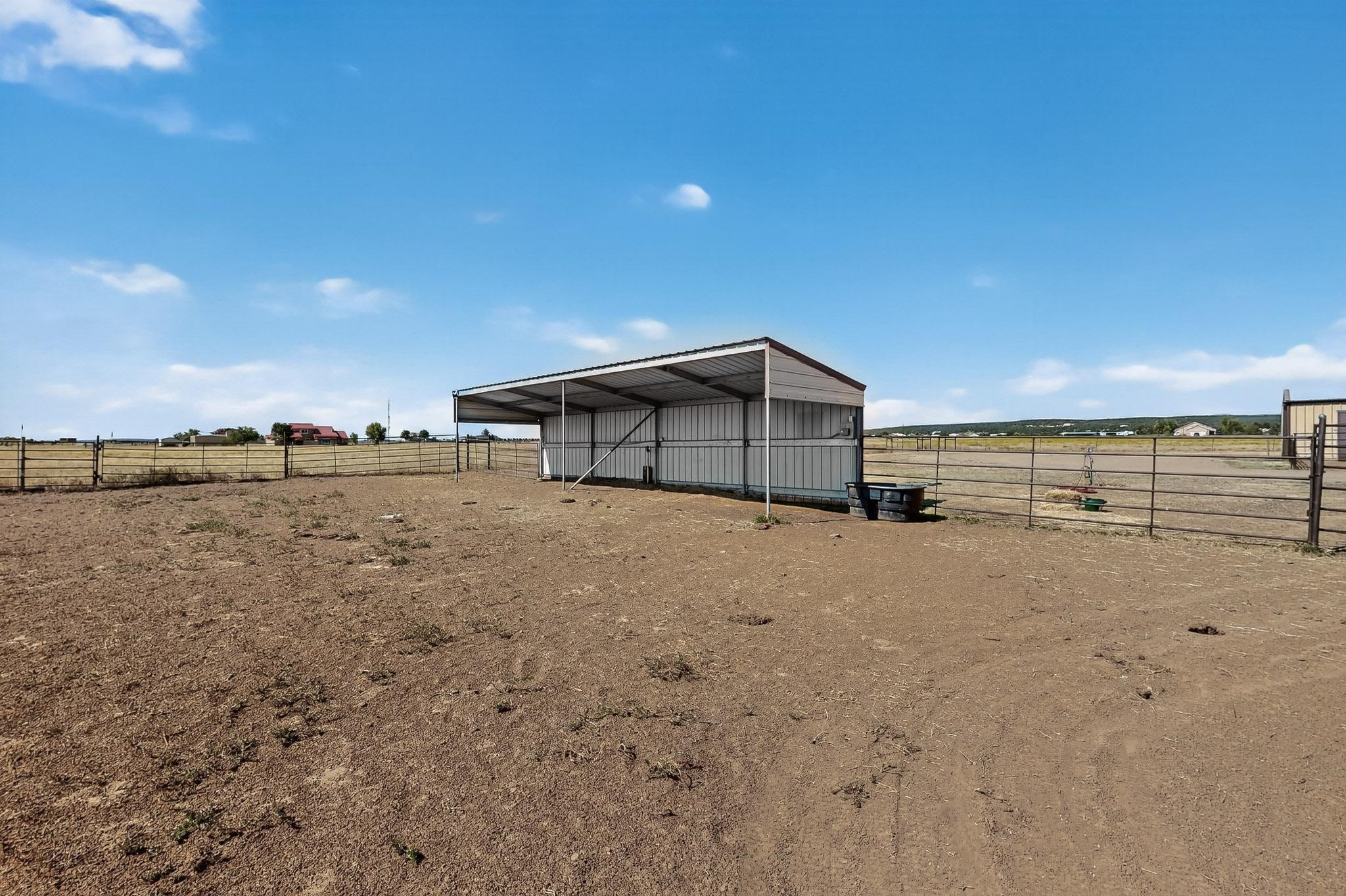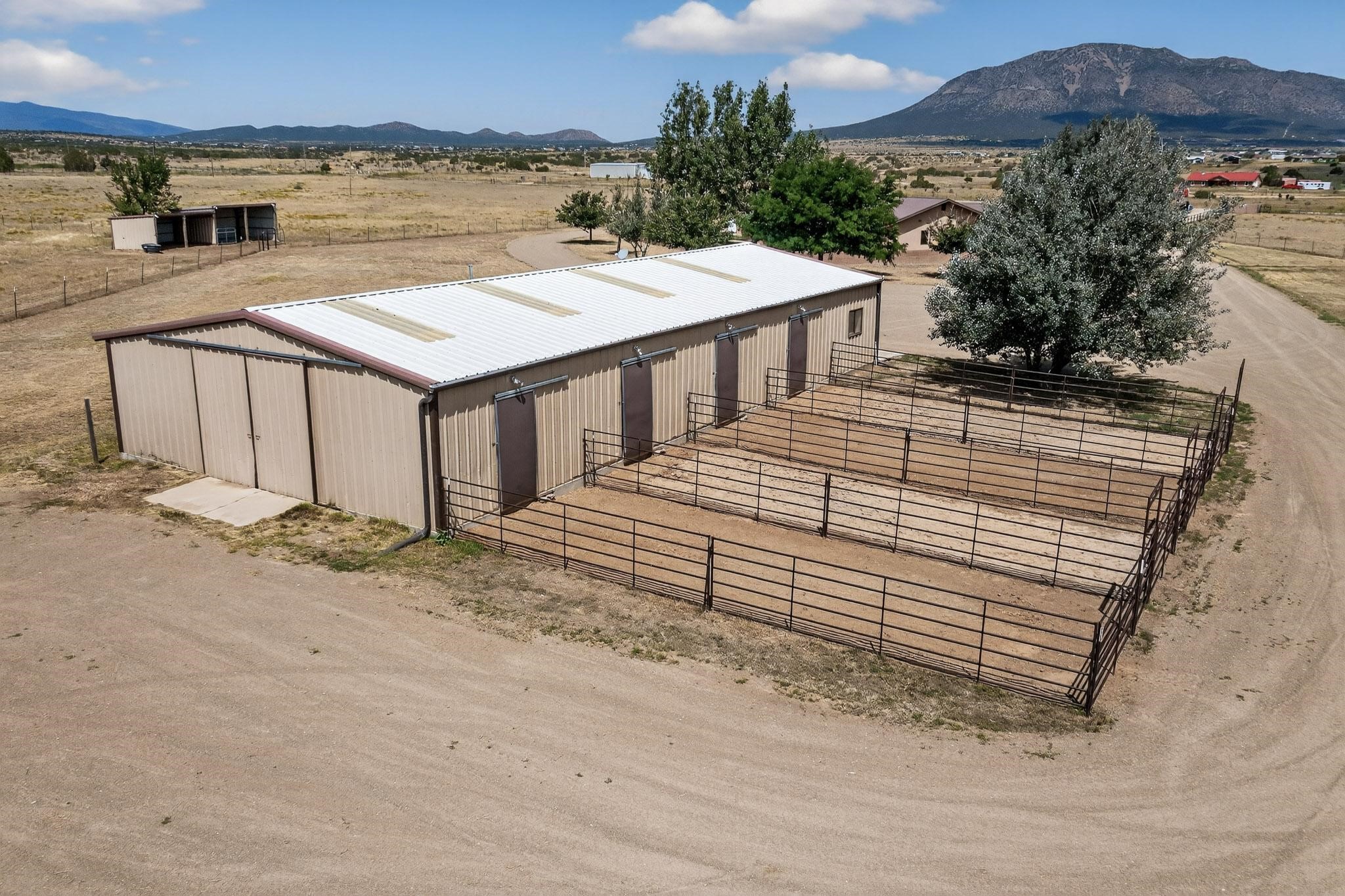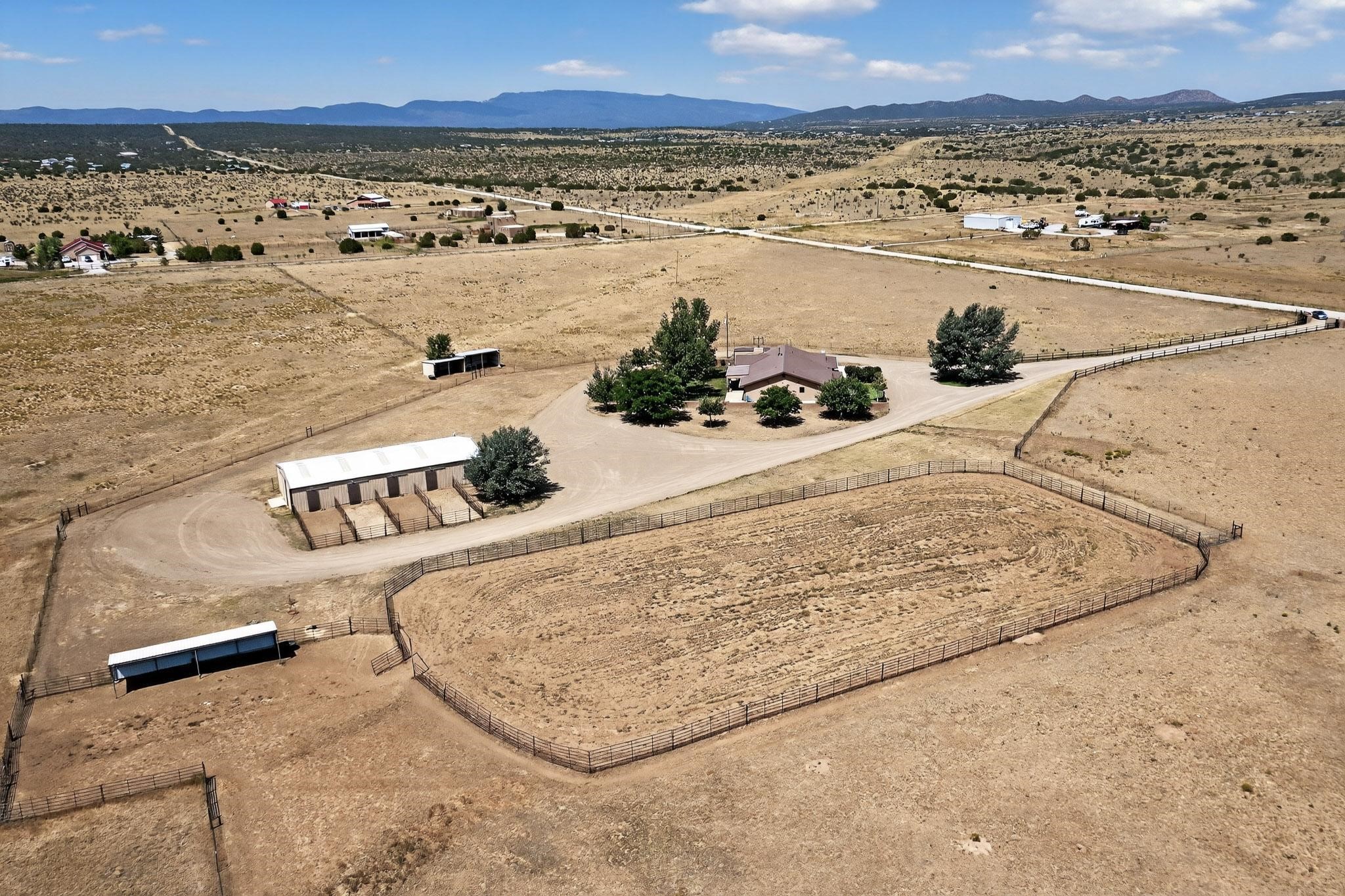 This true equine estate has finally come on the market so don't miss your opportunity to own this amazing property. 38.8 acres fully fenced and cross fenced! 3051 heated sqft of main home and guest suite. This estate home boasts hardwood floors throughout, with custom touches, large spacious open floor plan with great room and kitchen for entertaining, primary bedroom suite with wall to wall closets, double vanities, and exterior access. 3bed 2bath main home, 2 living areas, gourmet stainless steel kitchen, laundry room with storage. There are so many built in storage and closets the possibilities are endless on how you use it. Oversized finished 2 car garage with built in storage. 4 stall barn with finished tack room, and 1 bedroom, 1 bath, kitchenette, walk in closet: guest suite.Not only are you going to love this estate, but your animals will love it too! Full sized arena for your use and three cross fenced pastures all with barn loafing sheds. Water has been run throughout the property to the barns for the convenience of keeping the critters taken care of. The approx. 2300 sqft barn has pull through capability, a finished tack room, 4 walk out stalls, hay storage, rubber floor mats, and a 363 sqft guest living quarters! A large equine estate like this doesn't come up for sale in the East Mountains/Southern Santa Fe County area too often, and none are as nice and custom as this property. If you are needing a place to kick up your boots, let your critters stretch their legs, and for yourself to relax from dawn to dusk, you have found your 38.8 acre slice of paradise with this equine estate.