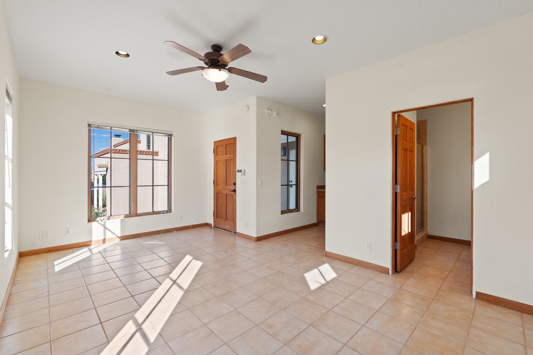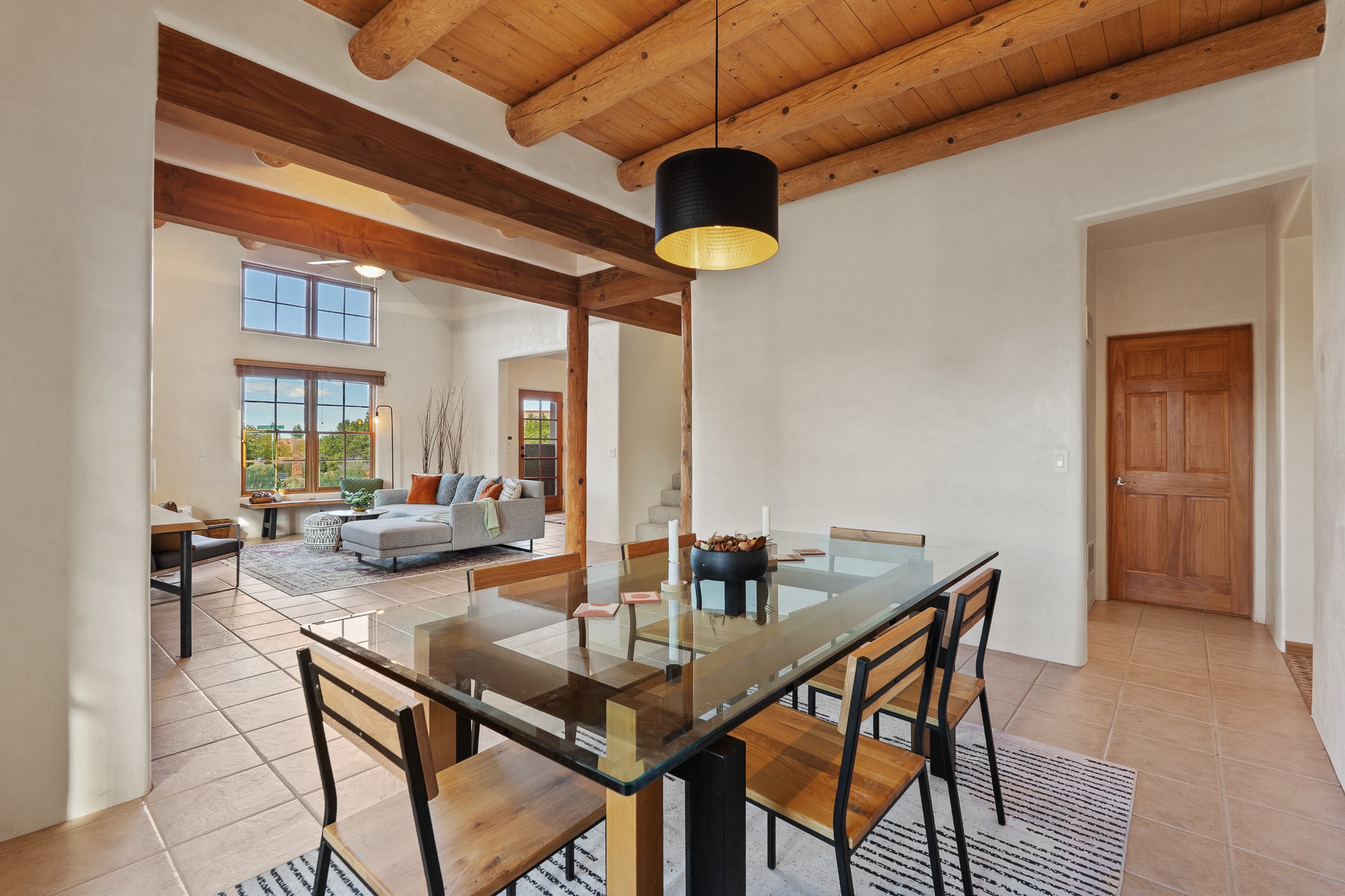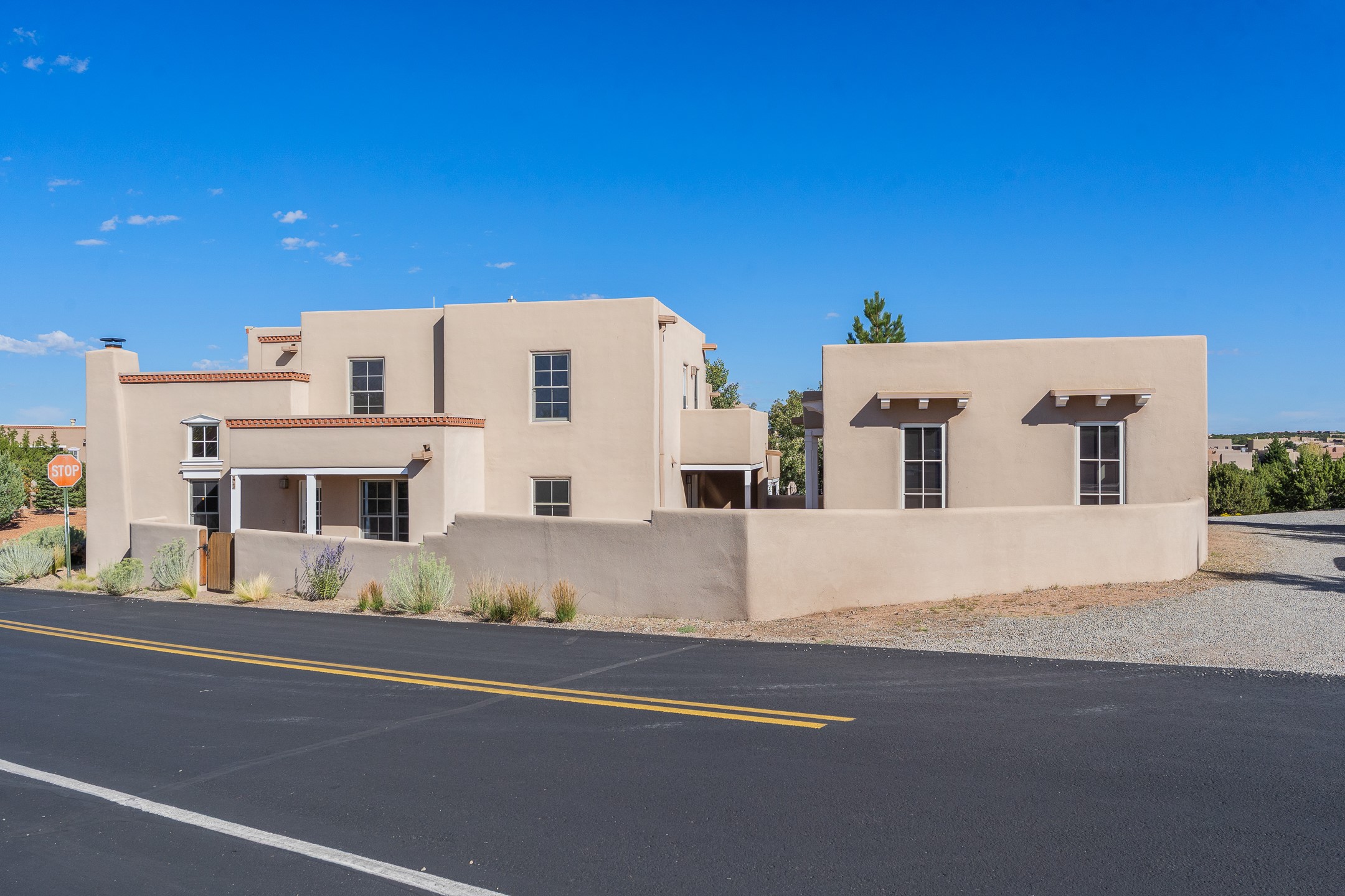 First time on the market in Santa Fe's Aldea de Santa Fe community! Built in 2003 by Bruce Thompson, this wonderfully flexible configuration offers a three-bedroom main house and detached casita perfectly suited to serve creative pursuits and hosting-needs. The main home's central living and dining spaces are adorned with Santa Fe-classics: plaster walls, viga-accented ceilings, and a cozy wood-burning kiva fireplace. Adjacent to the light-filled living room is a private nook, finished with built-in bookcases, that functions effortlessly as an office/study, secondary seating area, or creative space. The kitchen is complete with abundant countertop space, ample cabinetry/storage and an informal dining area. Upstairs, the primary bedroom is a relaxing retreat with its own private deck. Outside, the patio area is a serene setting to unwind and the surrounding yard is well-suited for low-fuss flower and garden beds. The detached 345+/- sqft casita is a work-from-home dream, or a comfortable arrangement for hosting friends and family. Sensibility and style collide in one of Santa Fe's vibrant and well-cared for communities. Aldea is an active community with miles of walking trails, a community center and other amenities--all just 15 minutes from downtown Santa Fe.