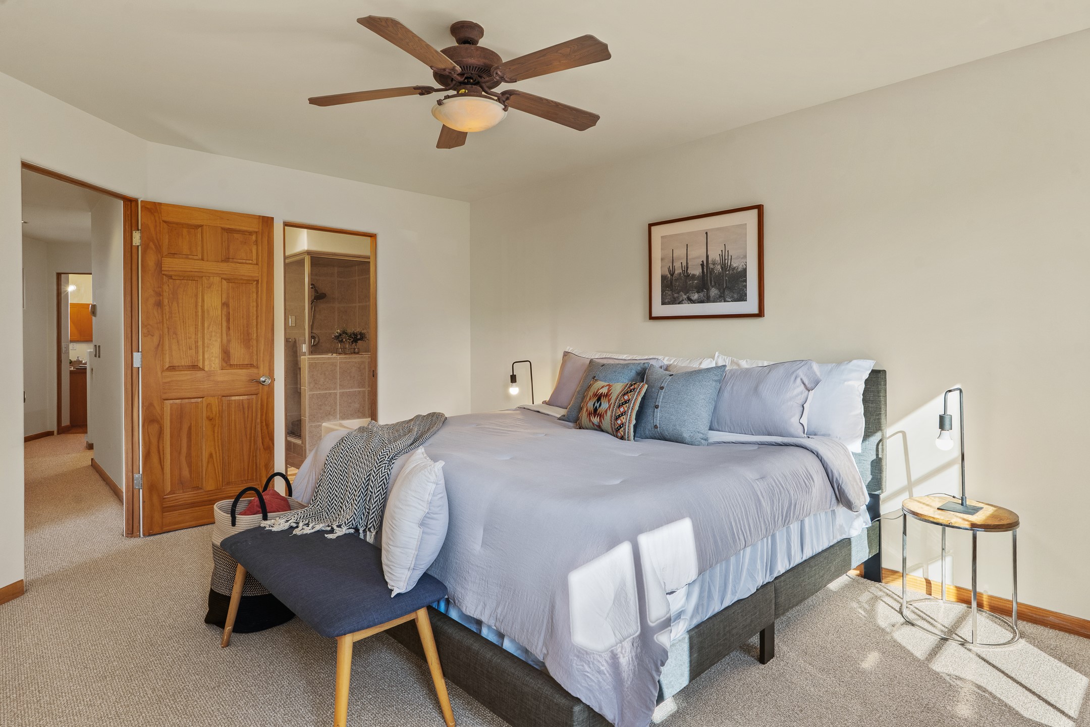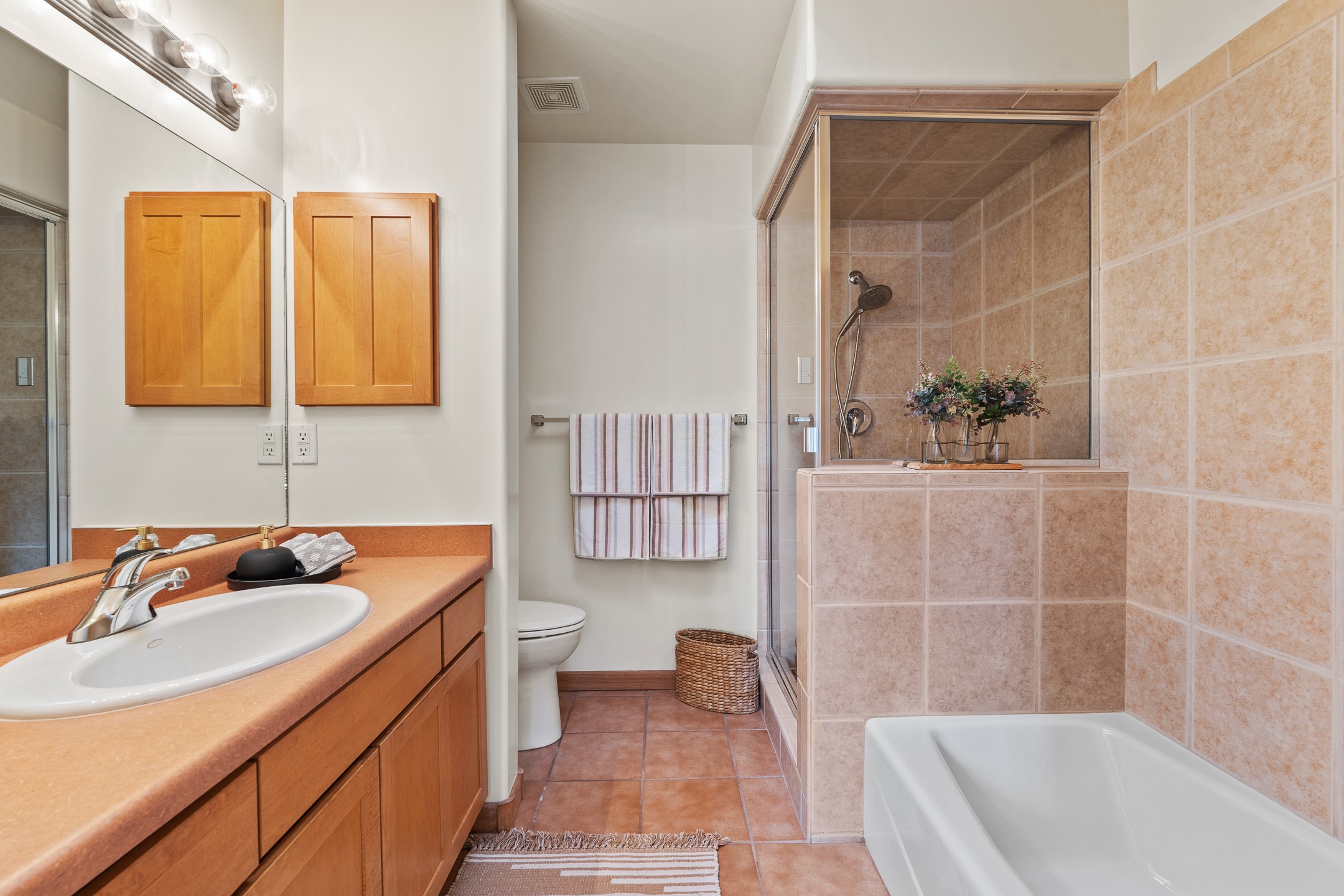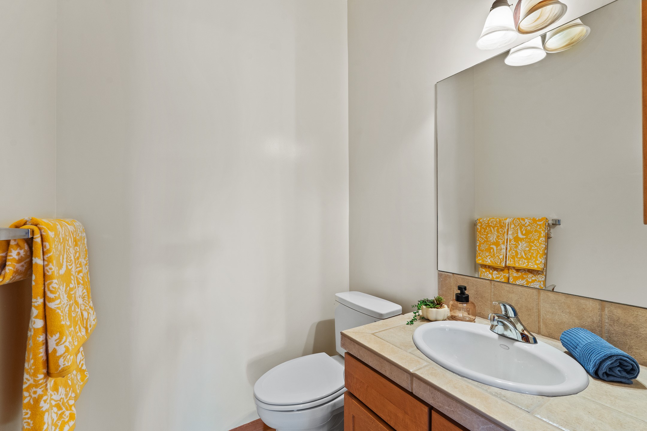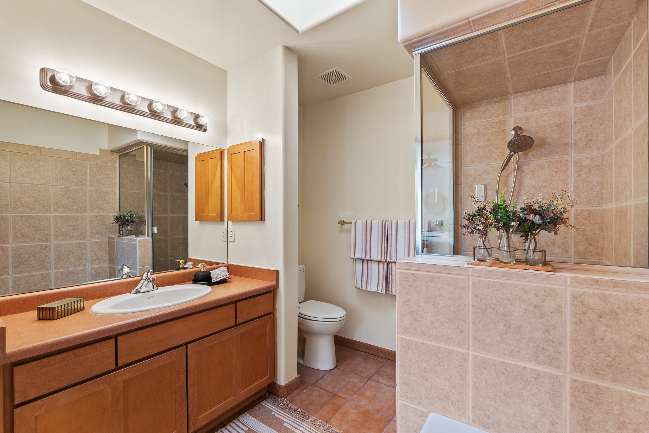 First time on the market in Santa Fe's Aldea de Santa Fe community! Built in 2003 by Bruce Thompson, this wonderfully flexible configuration offers a three-bedroom main house and detached casita perfectly suited to serve creative pursuits and hosting-needs. The main home's central living and dining spaces are adorned with Santa Fe-classics: plaster walls, viga-accented ceilings, and a cozy wood-burning kiva fireplace. Adjacent to the light-filled living room is a private nook, finished with built-in bookcases, that functions effortlessly as an office/study, secondary seating area, or creative space. The kitchen is complete with abundant countertop space, ample cabinetry/storage and an informal dining area. Upstairs, the primary bedroom is a relaxing retreat with its own private deck. Outside, the patio area is a serene setting to unwind and the surrounding yard is well-suited for low-fuss flower and garden beds. The detached 345+/- sqft casita is a work-from-home dream, or a comfortable arrangement for hosting friends and family. Sensibility and style collide in one of Santa Fe's vibrant and well-cared for communities. Aldea is an active community with miles of walking trails, a community center and other amenities--all just 15 minutes from downtown Santa Fe.