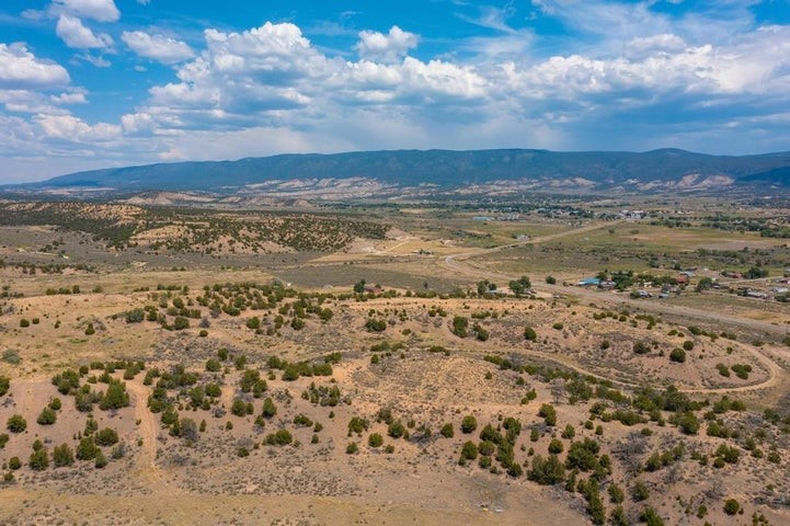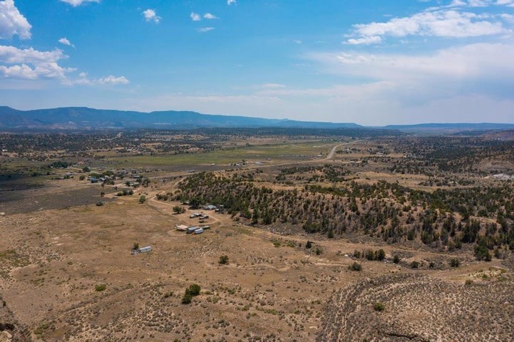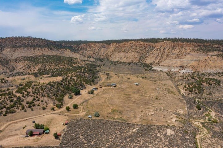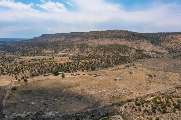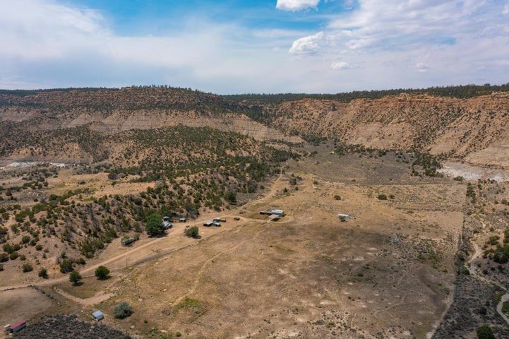 This versatile 81 acre property nestled in a peaceful canyon surrounded by grand mesas, abuts a 'hike-in' area of the Santa Fe National Forest to the west and BLM land to the north! Plenty of potential for horses, hunting, livestock and more. Watch Elk graze right outside your front porch while enjoying magnificent sunrises and sunsets. There is source of gravel and petrified wood is prevalent. Outbuildings include a shop/garage/storage 20'W x 40'D x 12'H (approx),a detached two level cellar/storage building, a tack room, a horse corral plus shaded area and more. The house has a propane line running to it.