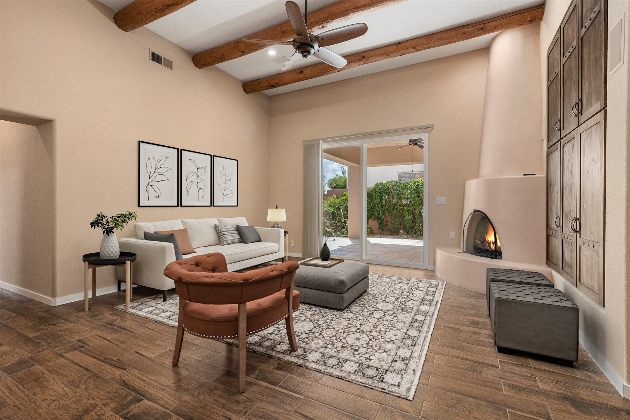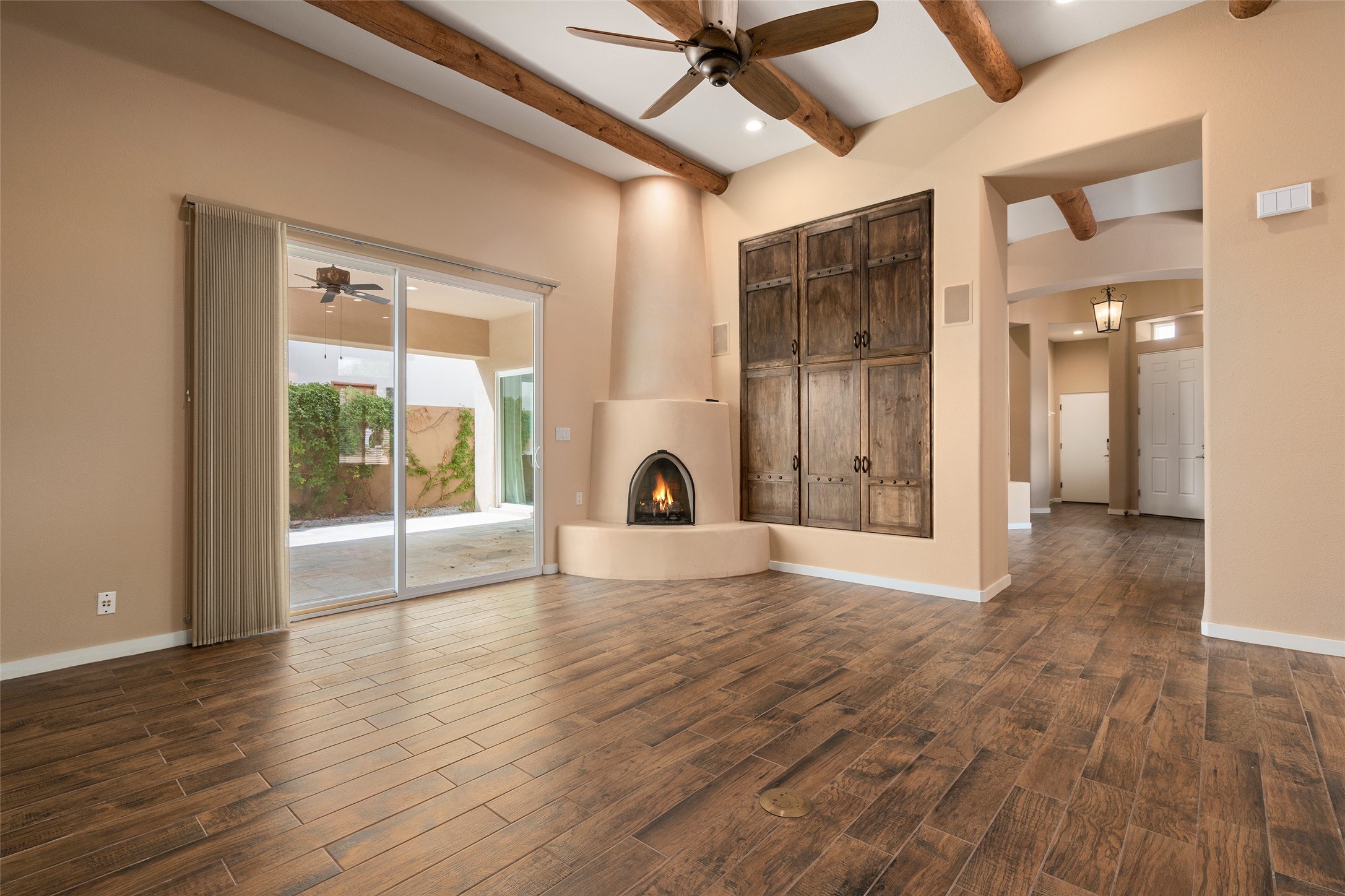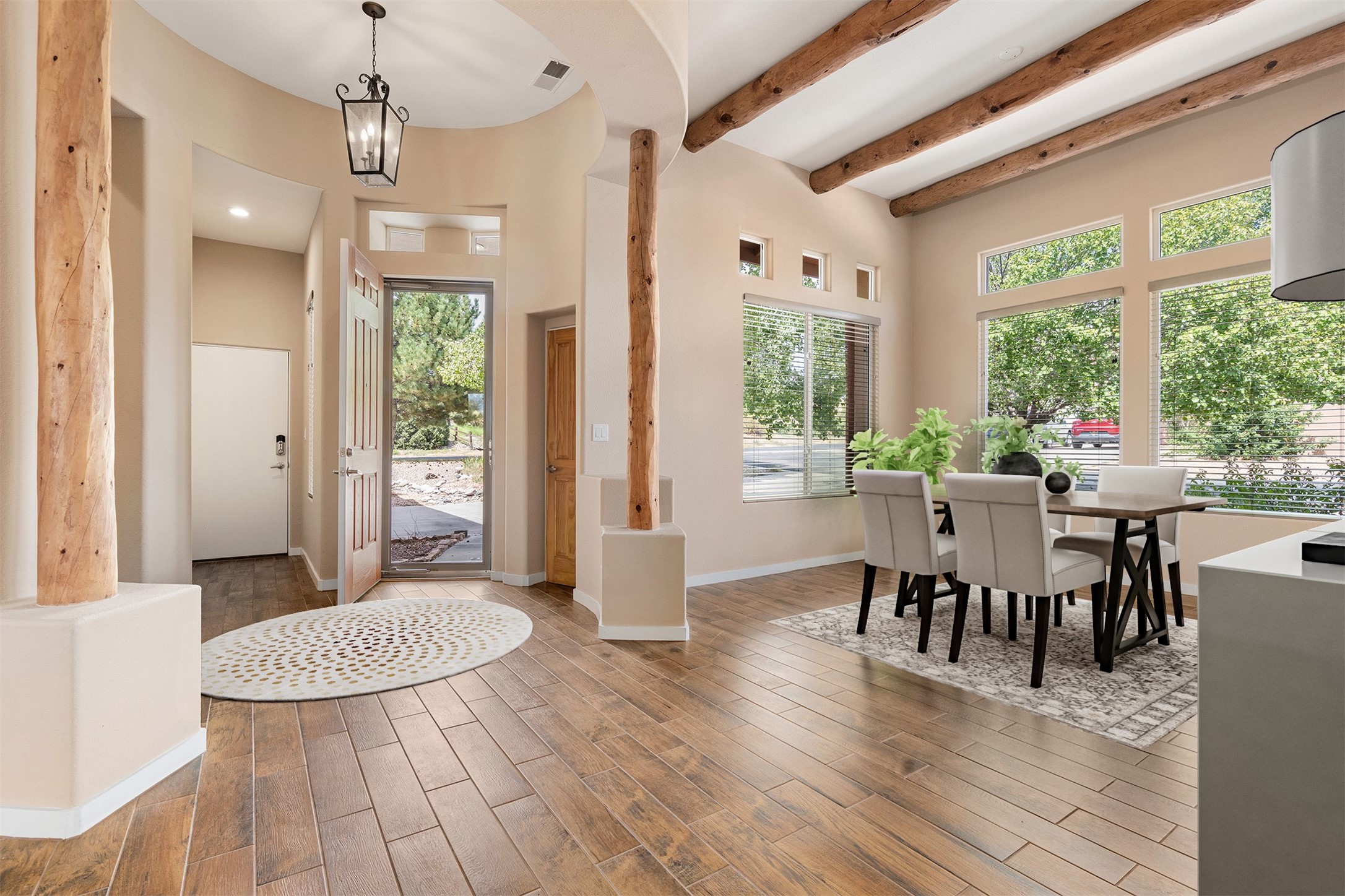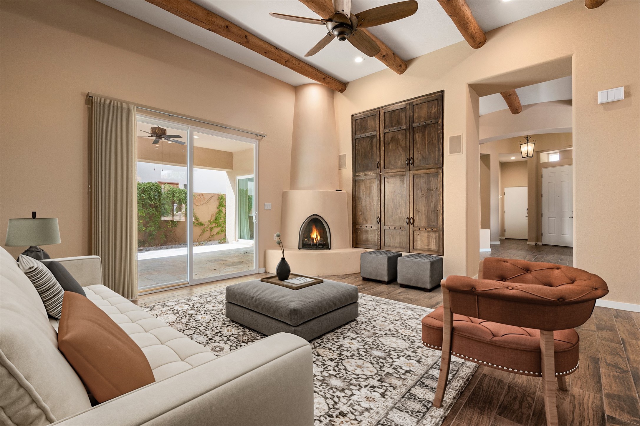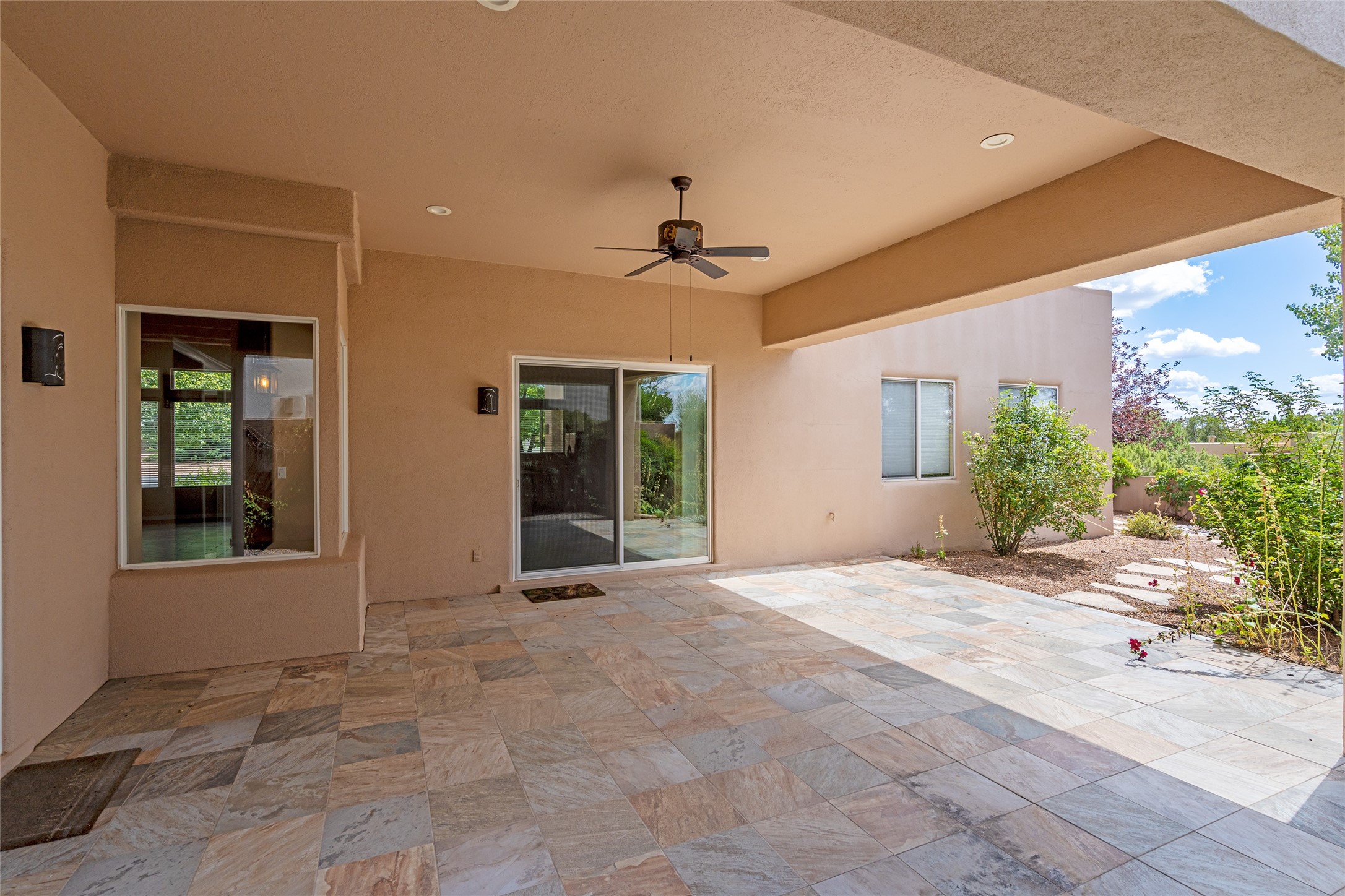 Look here: a stylish and updated home on a desirable corner lot! This immaculate single-level home has been extensively updated and shows beautifully. With over $170,000 in thoughtful renovations completed just a few years ago, the home feels modern, fresh, and move-in ready. The kitchen is a true centerpiece, featuring granite countertops, a custom tile backsplash, double ovens, a five-burner gas cooktop, under-cabinet lighting, a remodeled island, and a charming window seat. Wood-look tile flooring, bedroom carpet, and a paint refresh complement the home's warm modern-rustic style, while recessed LED lighting adds everyday brightness. The spacious primary suite is a serene retreat with a spa-like bath. You will love the separation from the other bedrooms. With four additional bedrooms--including a private ensuite with its own exterior access--the floor plan offers flexibility for guests, a studio, an in-home office, exercise room, media room and more! Outdoors, enjoy a covered portal with views of the Ortiz Mountains and thoughtfully designed landscaping that bursts with seasonal color from Virginia creepers, rose bushes, and ornamental fruit trees. All this in an unbeatable location: just 12 miles from the historic Santa Fe Plaza and only minutes to shopping and dining. The Rancho Viejo HOA enhances the neighborhood with multiple parks, vast open spaces, scenic paved trails, and well-kept surroundings protected by reasonable covenants. A home that blends style, comfort, and convenience -- and one you'll be proud to call your own.