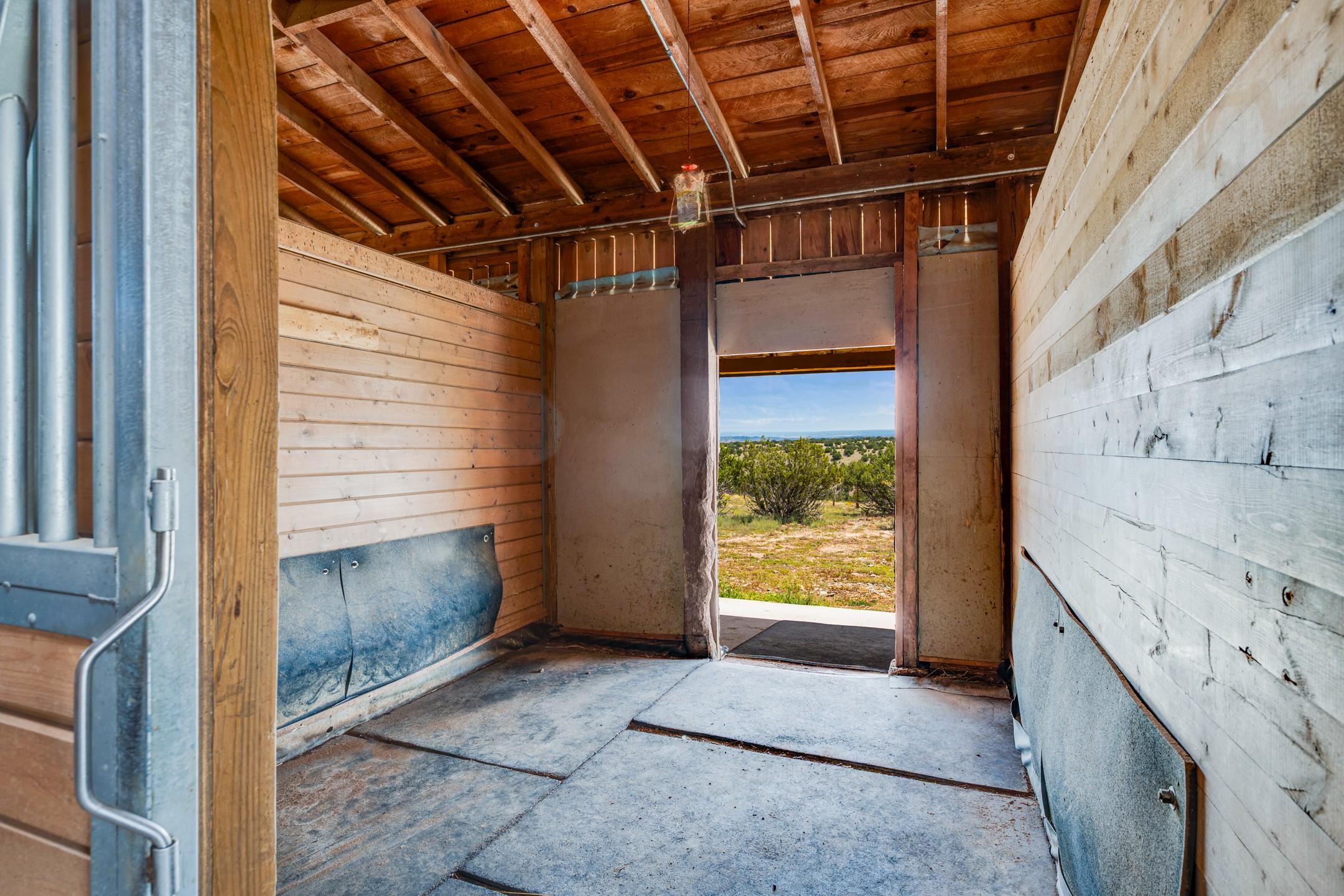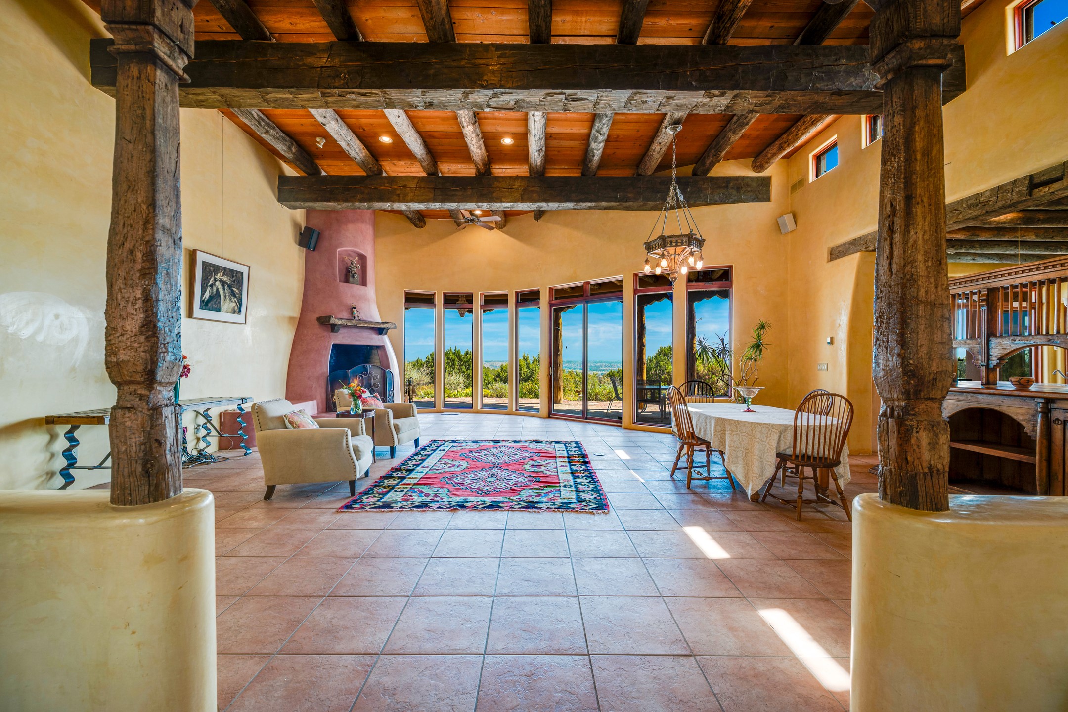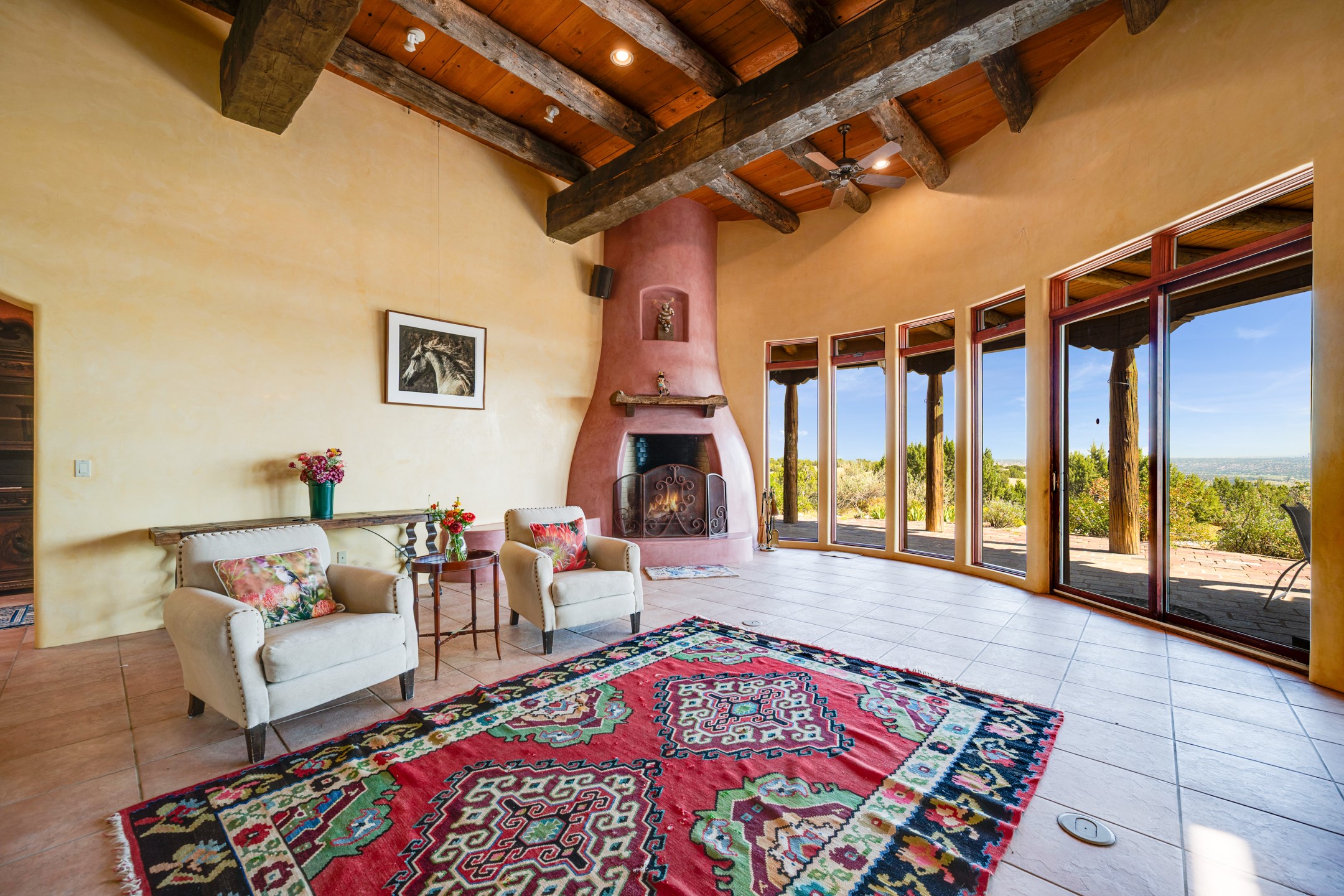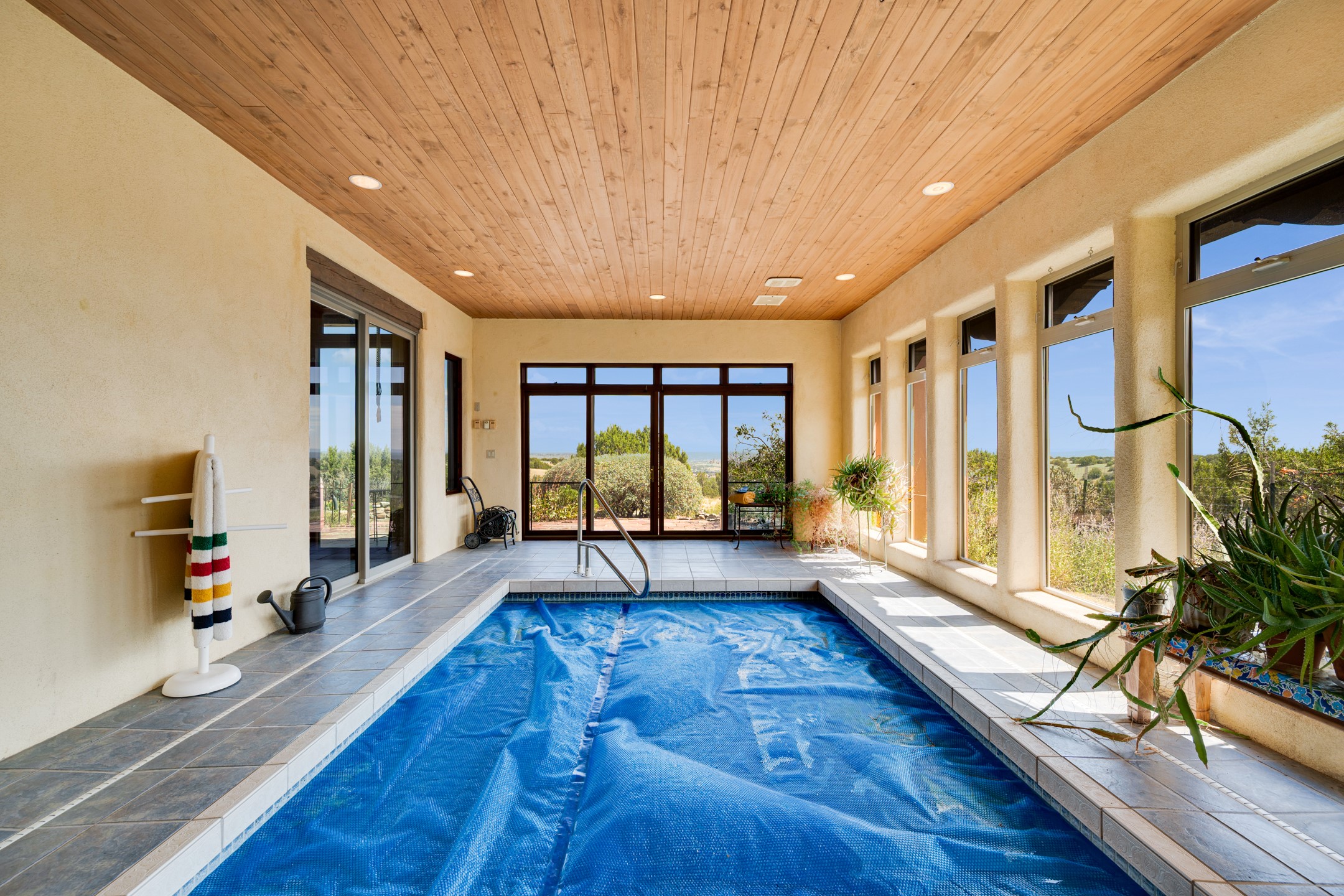Oro Viejo Ranch is a timeless sanctuary on 106 acres. A harmonious blend of natural splendor, meticulous craftsmanship, and modern convenience. There are breathtaking panoramic views of the Sangre de Cristo, Ortiz Mountains, Cerrillos Hills, and the iconic Lone Butte. The main residence showcases authentic Southwest style, adobe and rastra construction. It features intricate plasterwork, recycled wood vigas, and a heated indoor pool, the rooftop deck offers truly unobstructed views. The solid oak cabin adds rustic charm, originally owned by the Hoover family, and rebuilt on-site. Horse enthusiasts will appreciate the six-stall, barn, tack room, workshop, covered hay storage, electric, and hot water, and protected outdoor runs. An insulated chicken coop provides the perfect setup for fresh eggs, while a private well with a large storage tank ensures a reliable water source.A convenient RV hookup is also available on the property.