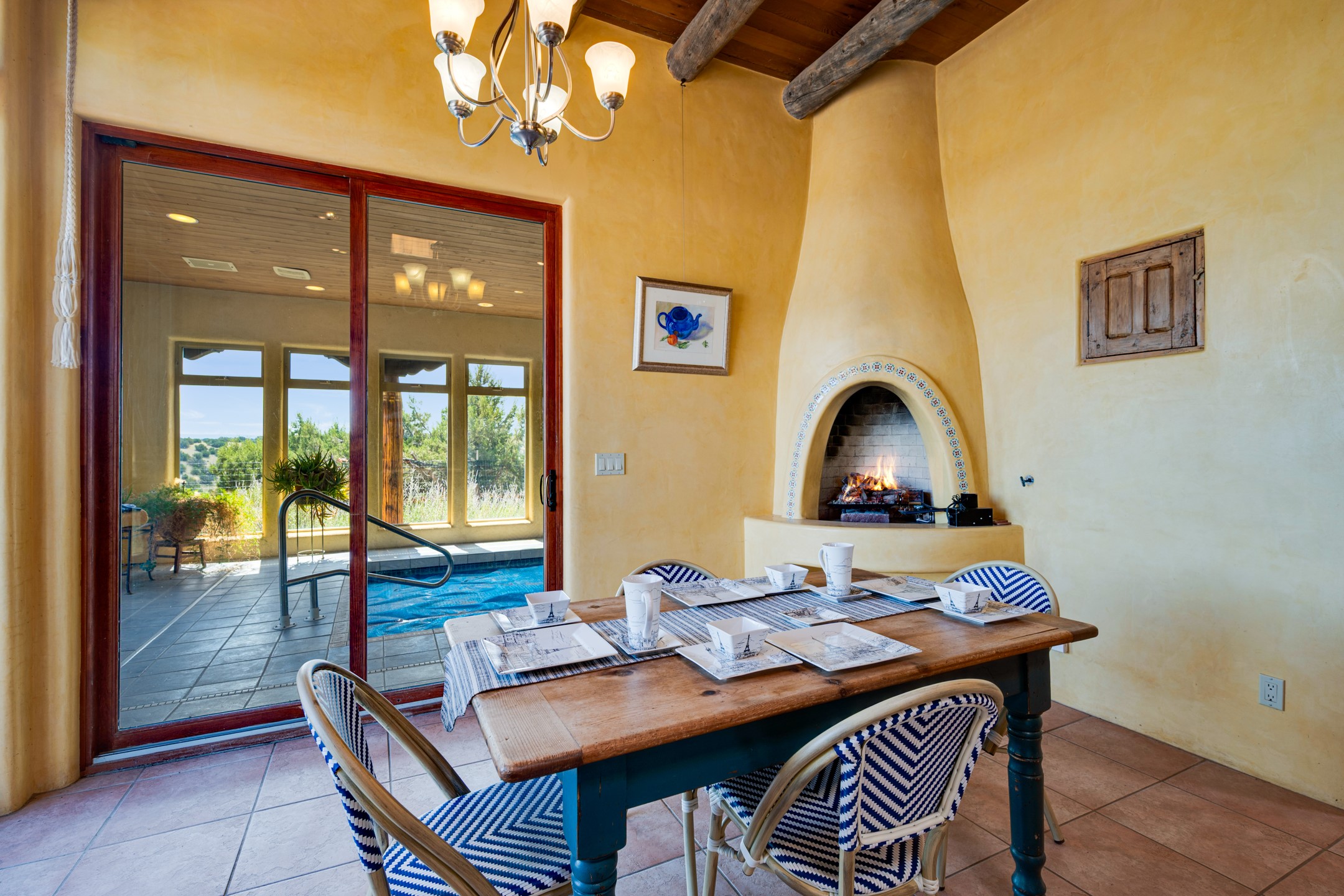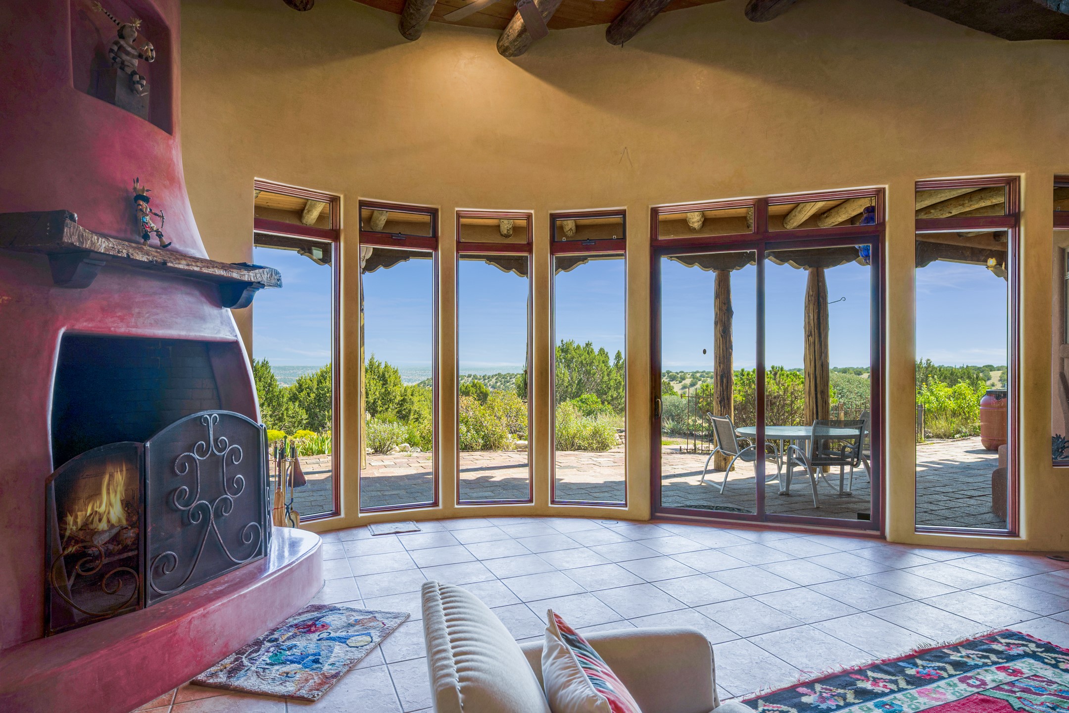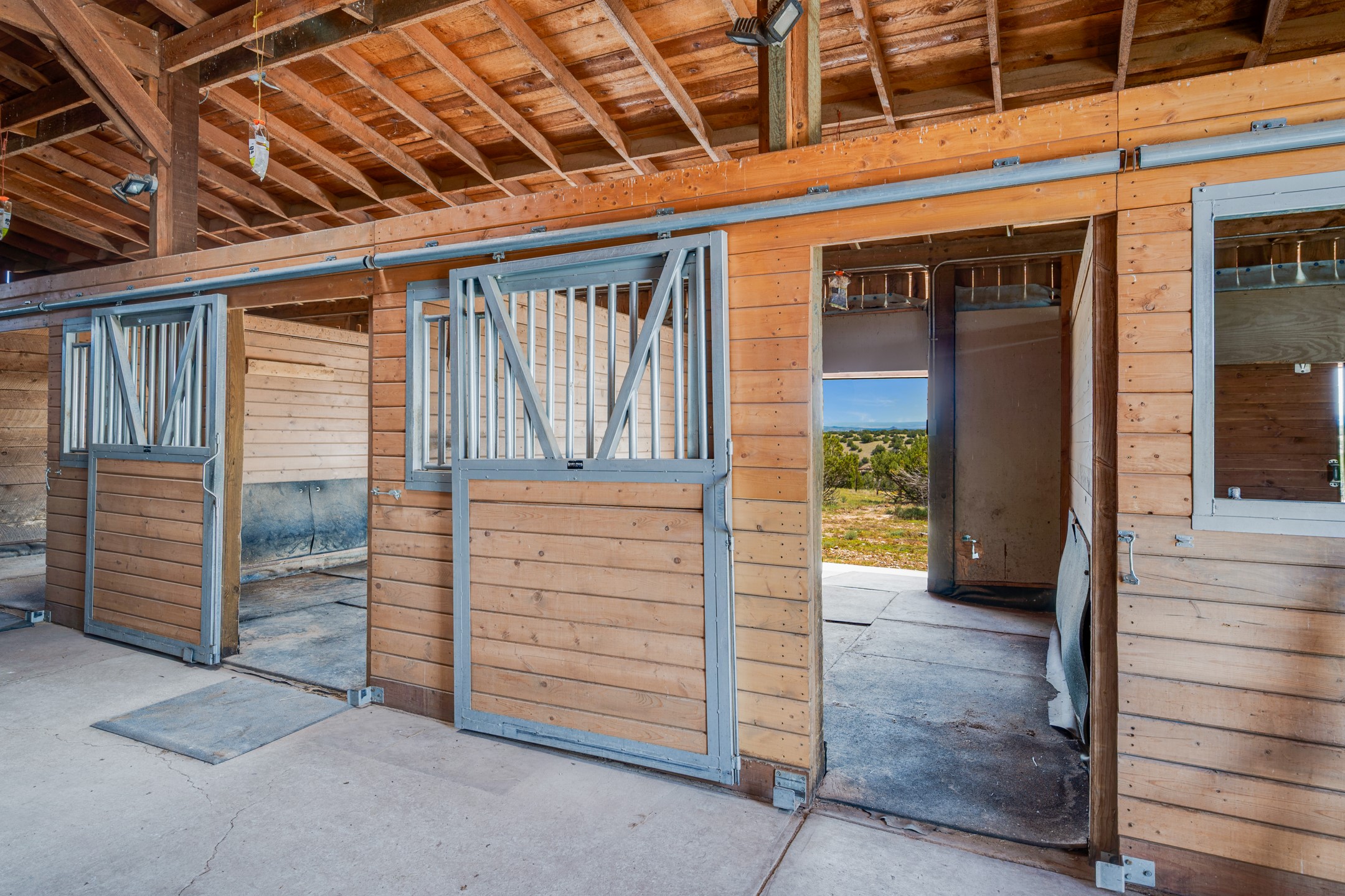 Oro Viejo Ranch is a timeless sanctuary on 106 acres. A harmonious blend of natural splendor, meticulous craftsmanship, and modern convenience. There are breathtaking panoramic views of the Sangre de Cristo, Ortiz Mountains, Cerrillos Hills, and the iconic Lone Butte. The main residence showcases authentic Southwest style, adobe and rastra construction. It features intricate plasterwork, recycled wood vigas, and a heated indoor pool, the rooftop deck offers truly unobstructed views. The solid oak cabin adds rustic charm, originally owned by the Hoover family, and rebuilt on-site. Horse enthusiasts will appreciate the six-stall, barn, tack room, workshop, covered hay storage, electric, and hot water, and protected outdoor runs. An insulated chicken coop provides the perfect setup for fresh eggs, while a private well with a large storage tank ensures a reliable water source.A convenient RV hookup is also available on the property.