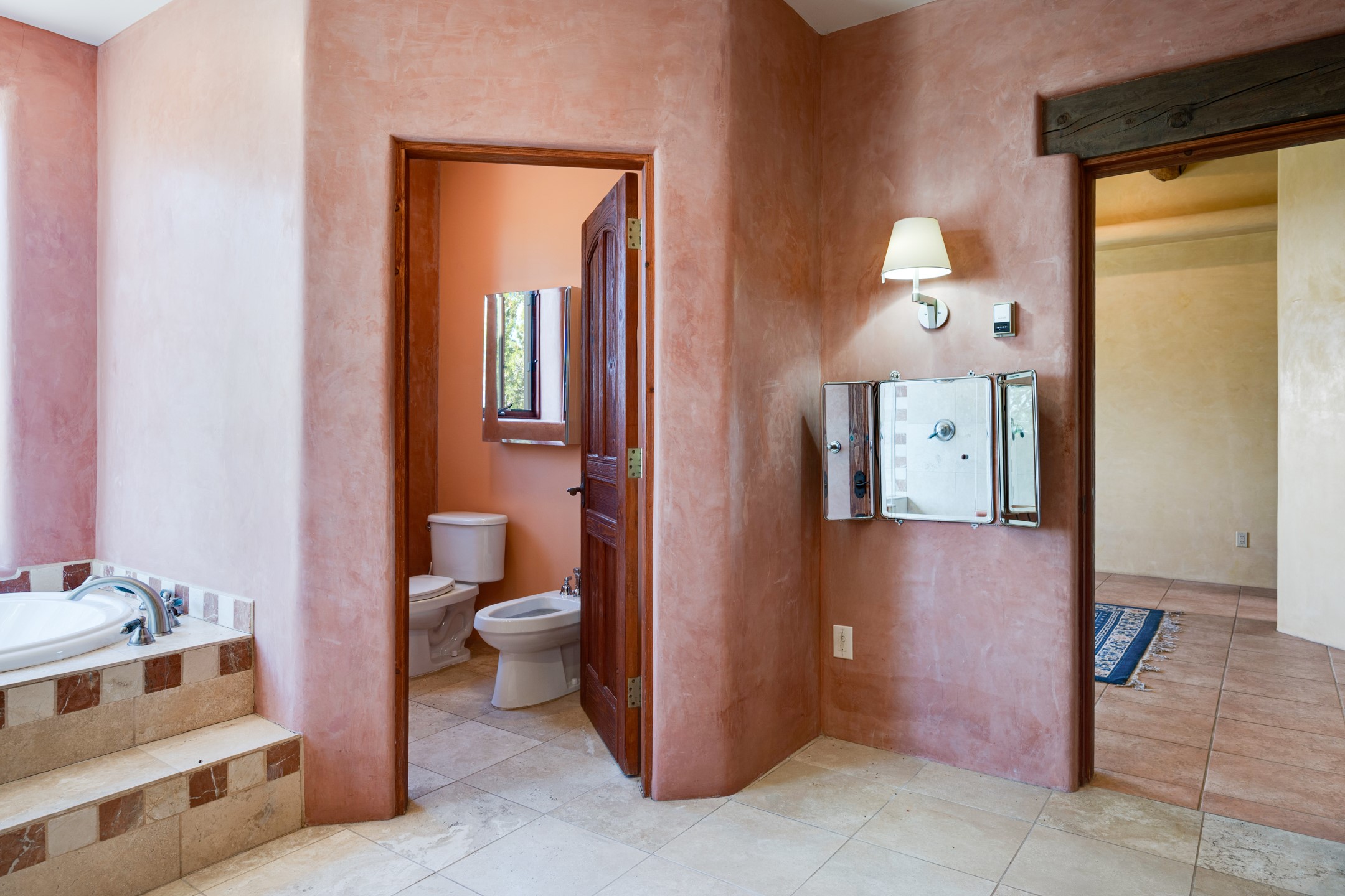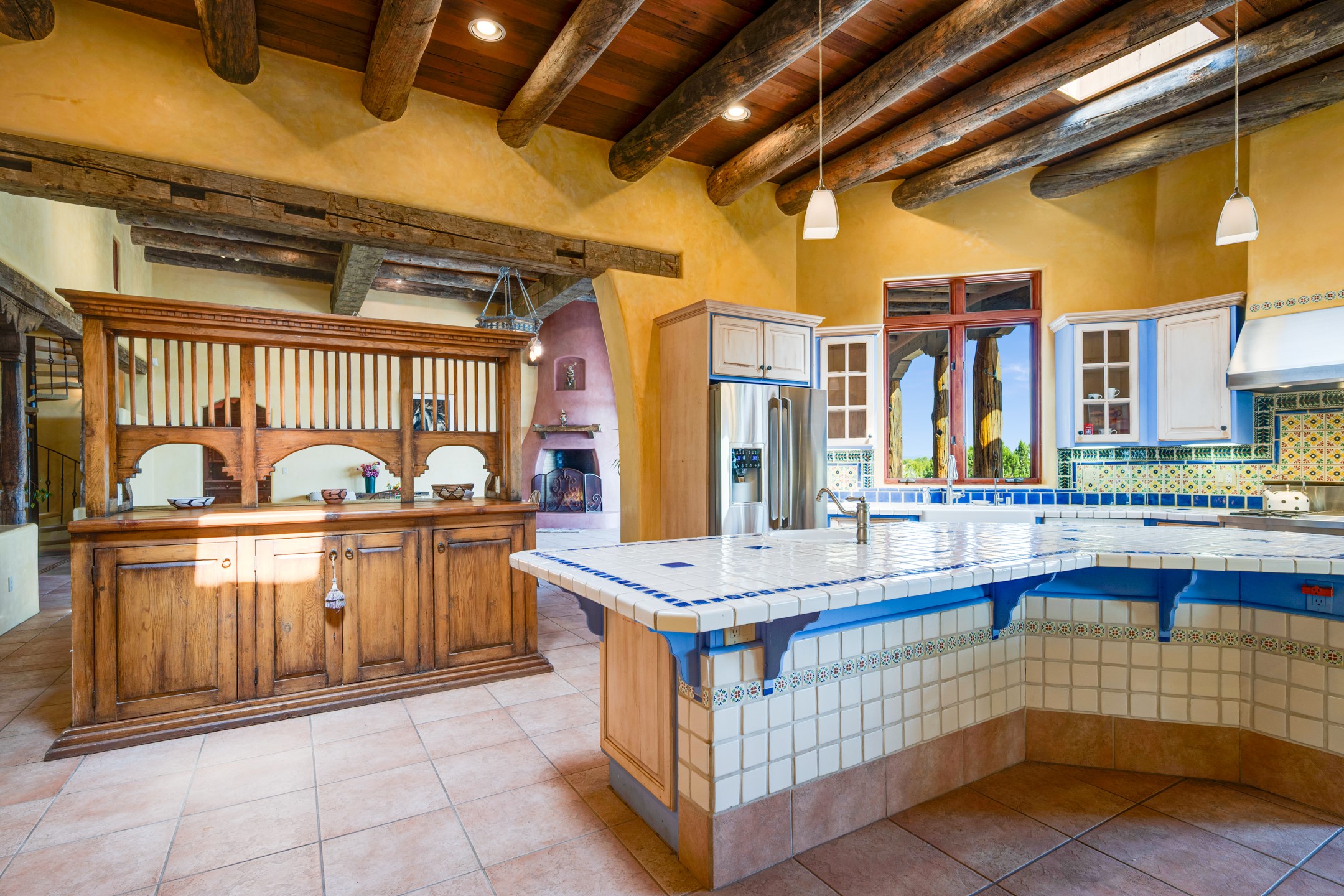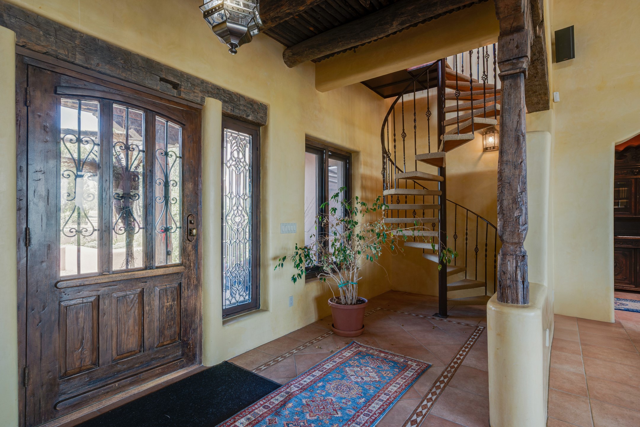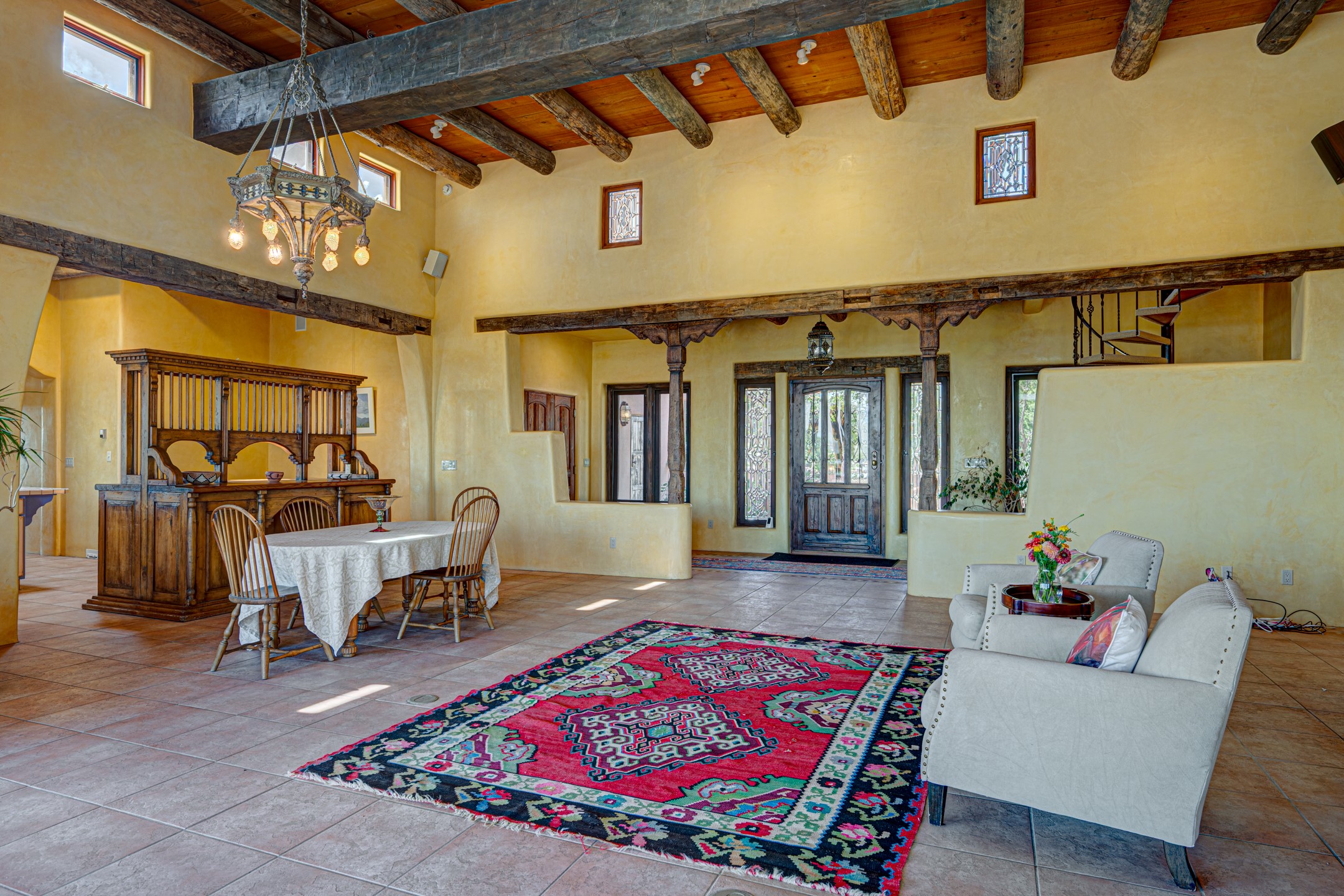 Oro Viejo Ranch is a timeless sanctuary on 106 acres. A harmonious blend of natural splendor, meticulous craftsmanship, and modern convenience. There are breathtaking panoramic views of the Sangre de Cristo, Ortiz Mountains, Cerrillos Hills, and the iconic Lone Butte. The main residence showcases authentic Southwest style, adobe and rastra construction. It features intricate plasterwork, recycled wood vigas, and a heated indoor pool, the rooftop deck offers truly unobstructed views. The solid oak cabin adds rustic charm, originally owned by the Hoover family, and rebuilt on-site. Horse enthusiasts will appreciate the six-stall, barn, tack room, workshop, covered hay storage, electric, and hot water, and protected outdoor runs. An insulated chicken coop provides the perfect setup for fresh eggs, while a private well with a large storage tank ensures a reliable water source.A convenient RV hookup is also available on the property.