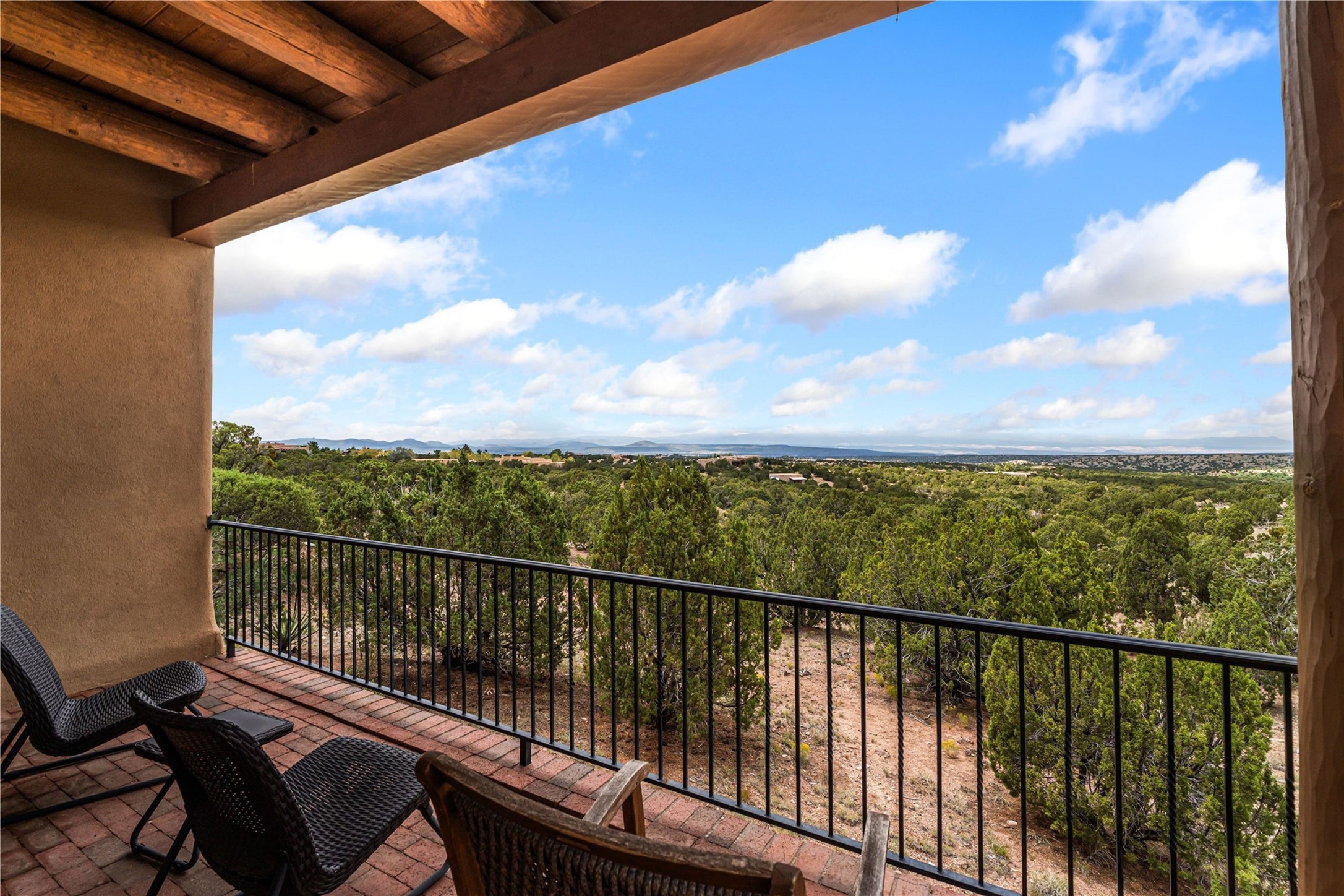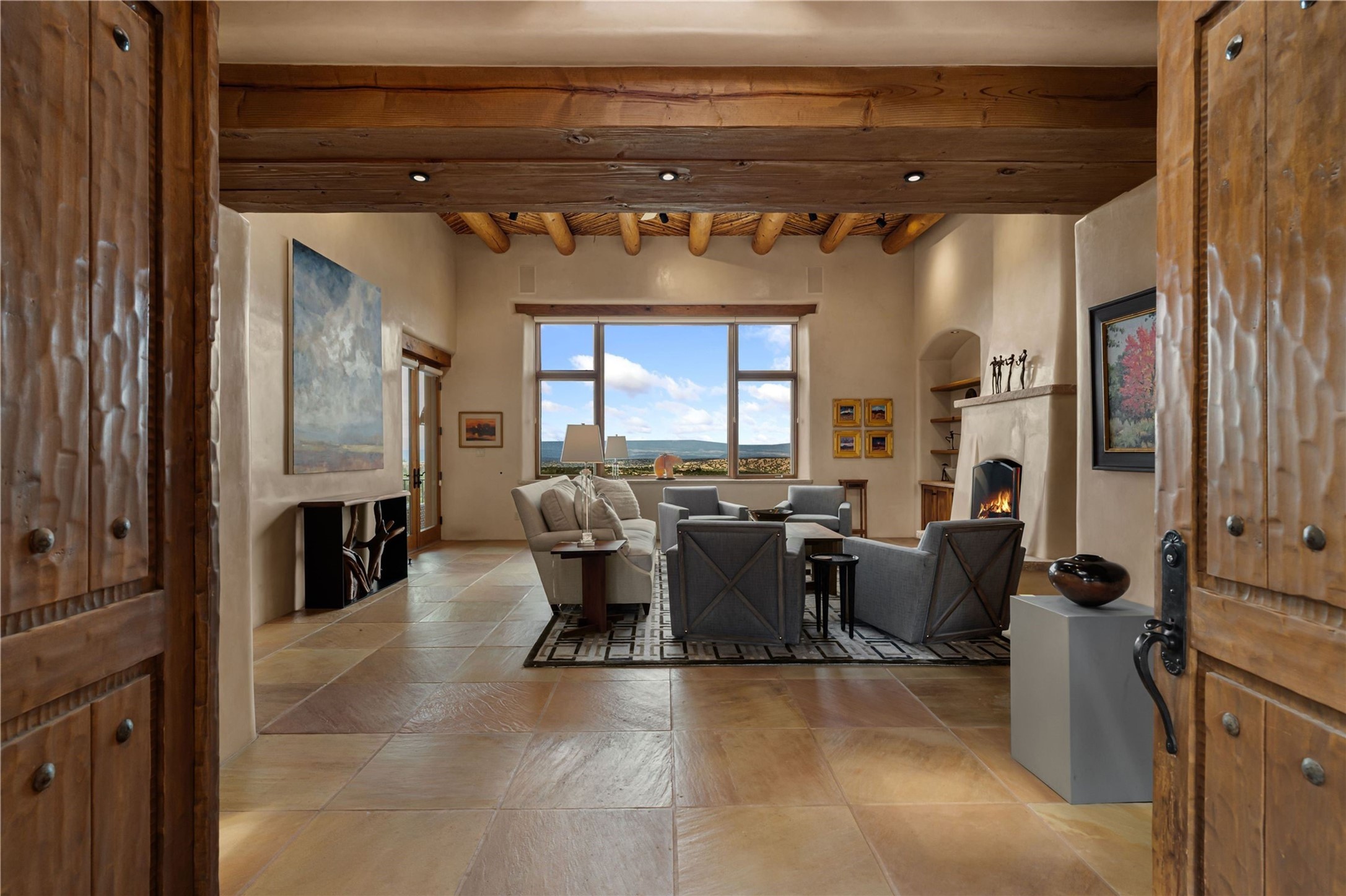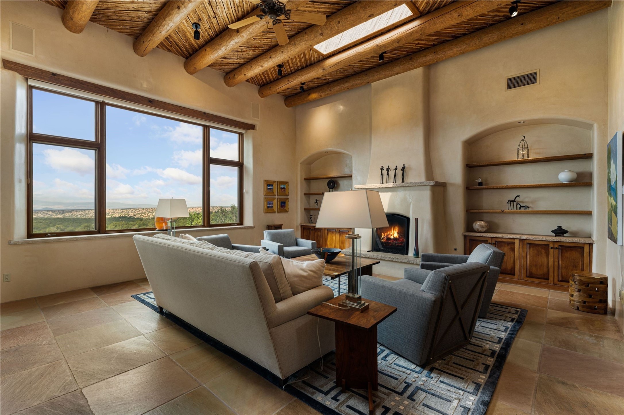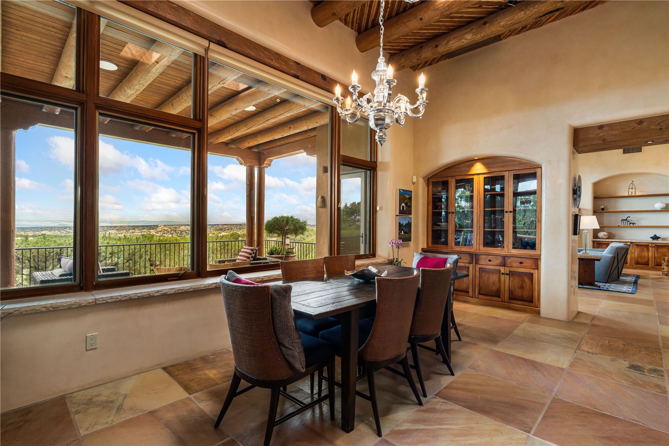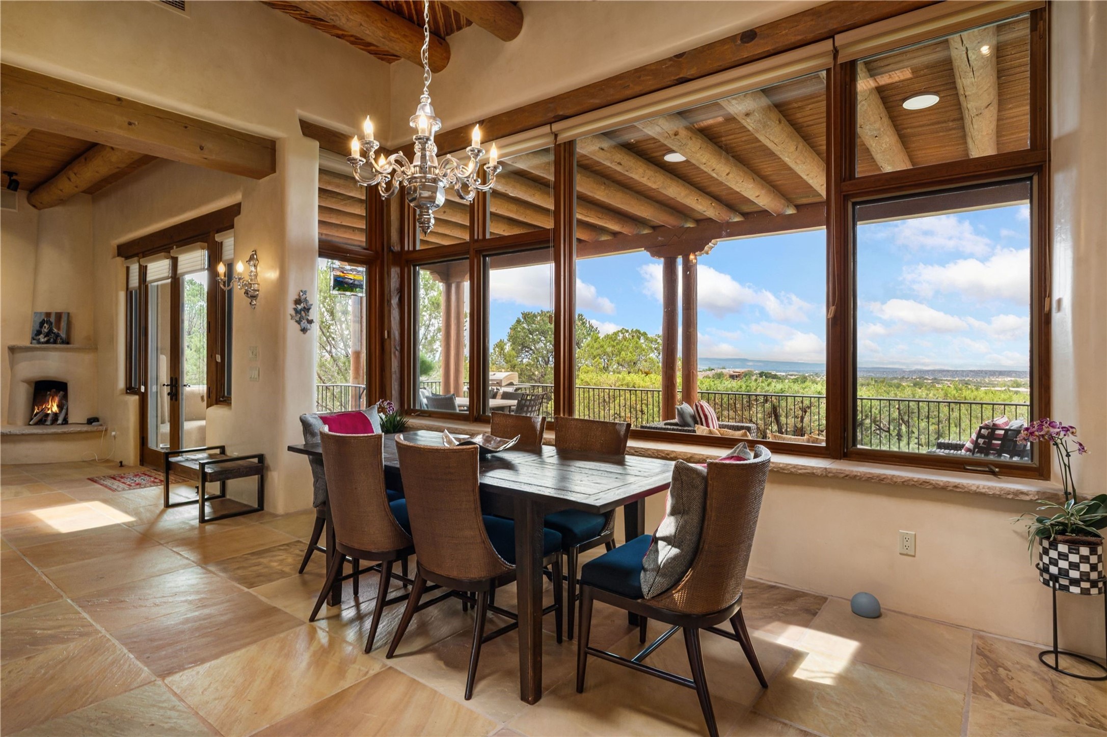Tucked high up in Las Campanas on a generous 2.4-acre lot, this gorgeous Kim Dressel pueblo-style home is all about views, vibes, and space to breathe. From the moment you stroll through the professionally landscaped courtyard, you'll feel the magic--unobstructed vistas of the Jemez Mountains and sunsets that'll make you stop mid-sentence just to stare. Inside, it's a custom masterpiece. Think flagstone floors, hand-hewn beams, and those classic vigas that give it that warm, earthy soul. The ceilings and walls? Absolutely stunning, with textures and treatments that make every room feel like a work of art. Natural light pours in through expansive skylights, bouncing off the hand-troweled plaster walls and stone floors, creating that signature New Mexican glow. The chef's kitchen is a showstopper--top-tier appliances, loads of granite counter space, and a butler's pantry that's ready for your next dinner party or midnight snack run. And if you've got guests (or just want a little extra privacy), the attached casita is a sweet bonus: separate entrance, kitchenette, and all the cozy charm. You'll find two primary suites plus two additional bedroom suites--one even has its own mini kitchen and sitting room, perfect for long-term guests or multi-gen living. Whether you're hosting a formal gathering or kicking back in the informal living spaces, this home flows effortlessly. Over 1,000 square feet of private outdoor space to soak in the views, sip your morning coffee, or toast the sunset. With its perch on one of the highest lots in the area, you'll enjoy peace, privacy, and those jaw-dropping Northwest views over untouched land. This isn't just a house--it's a lifestyle. Come see it, feel it, fall in love.