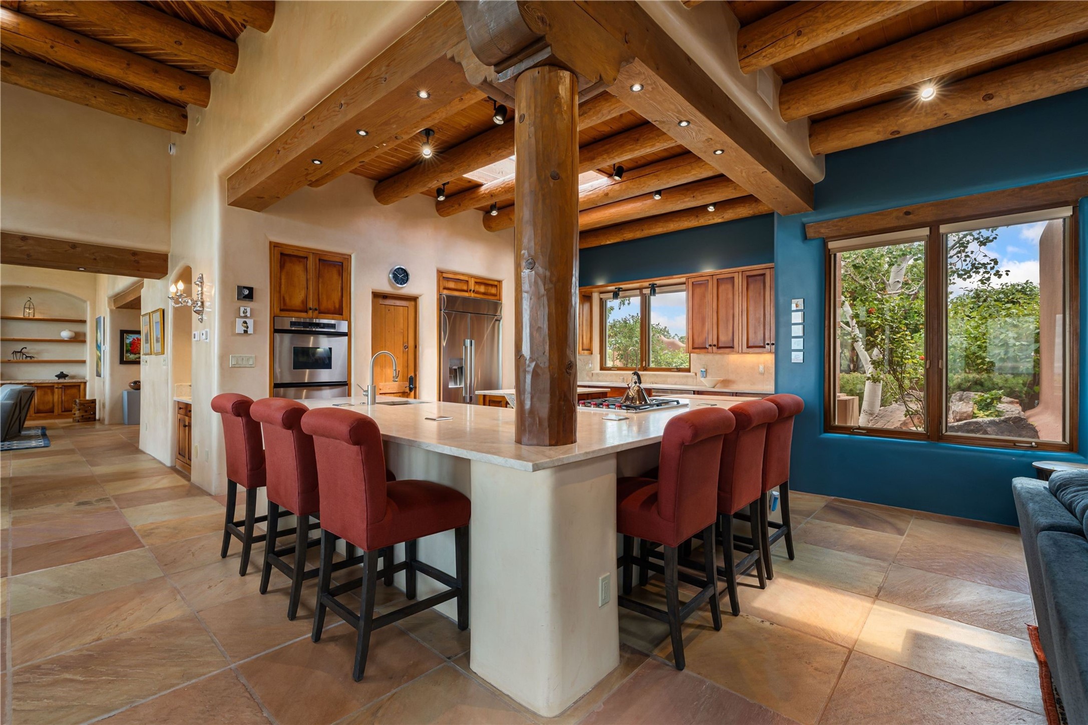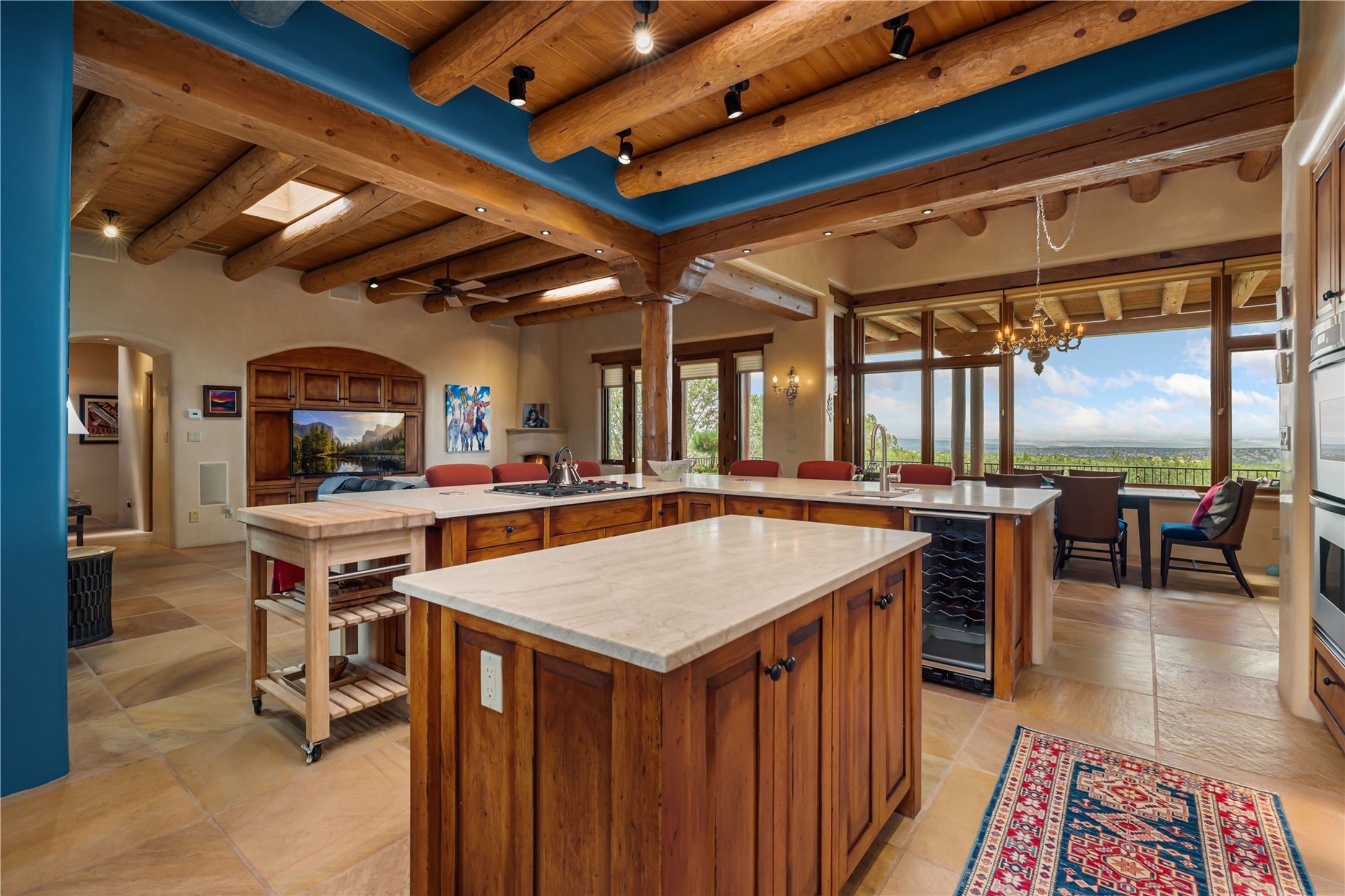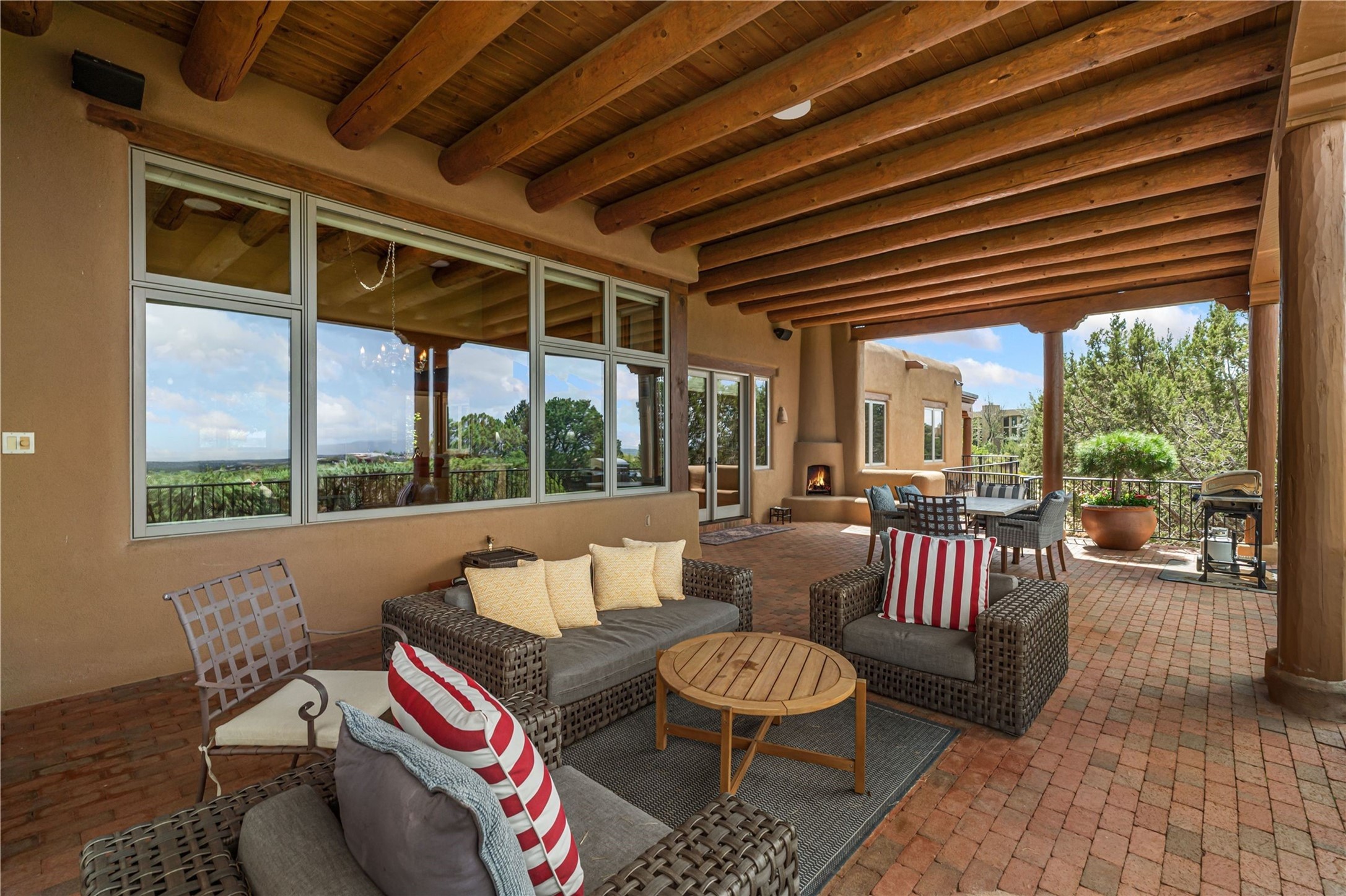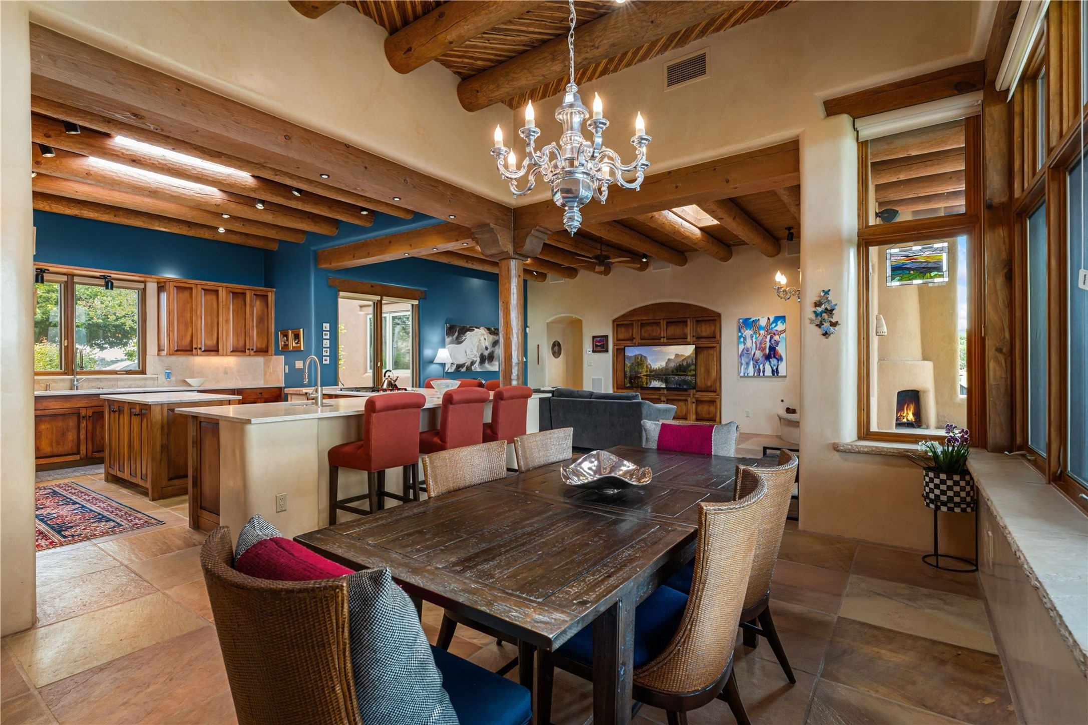 Tucked high up in Las Campanas on a generous 2.4-acre lot, this gorgeous Kim Dressel pueblo-style home is all about views, vibes, and space to breathe. From the moment you stroll through the professionally landscaped courtyard, you'll feel the magic--unobstructed vistas of the Jemez Mountains and sunsets that'll make you stop mid-sentence just to stare. Inside, it's a custom masterpiece. Think flagstone floors, hand-hewn beams, and those classic vigas that give it that warm, earthy soul. The ceilings and walls? Absolutely stunning, with textures and treatments that make every room feel like a work of art. Natural light pours in through expansive skylights, bouncing off the hand-troweled plaster walls and stone floors, creating that signature New Mexican glow. The chef's kitchen is a showstopper--top-tier appliances, loads of granite counter space, and a butler's pantry that's ready for your next dinner party or midnight snack run. And if you've got guests (or just want a little extra privacy), the attached casita is a sweet bonus: separate entrance, kitchenette, and all the cozy charm. You'll find two primary suites plus two additional bedroom suites--one even has its own mini kitchen and sitting room, perfect for long-term guests or multi-gen living. Whether you're hosting a formal gathering or kicking back in the informal living spaces, this home flows effortlessly. Over 1,000 square feet of private outdoor space to soak in the views, sip your morning coffee, or toast the sunset. With its perch on one of the highest lots in the area, you'll enjoy peace, privacy, and those jaw-dropping Northwest views over untouched land. This isn't just a house--it's a lifestyle. Come see it, feel it, fall in love.