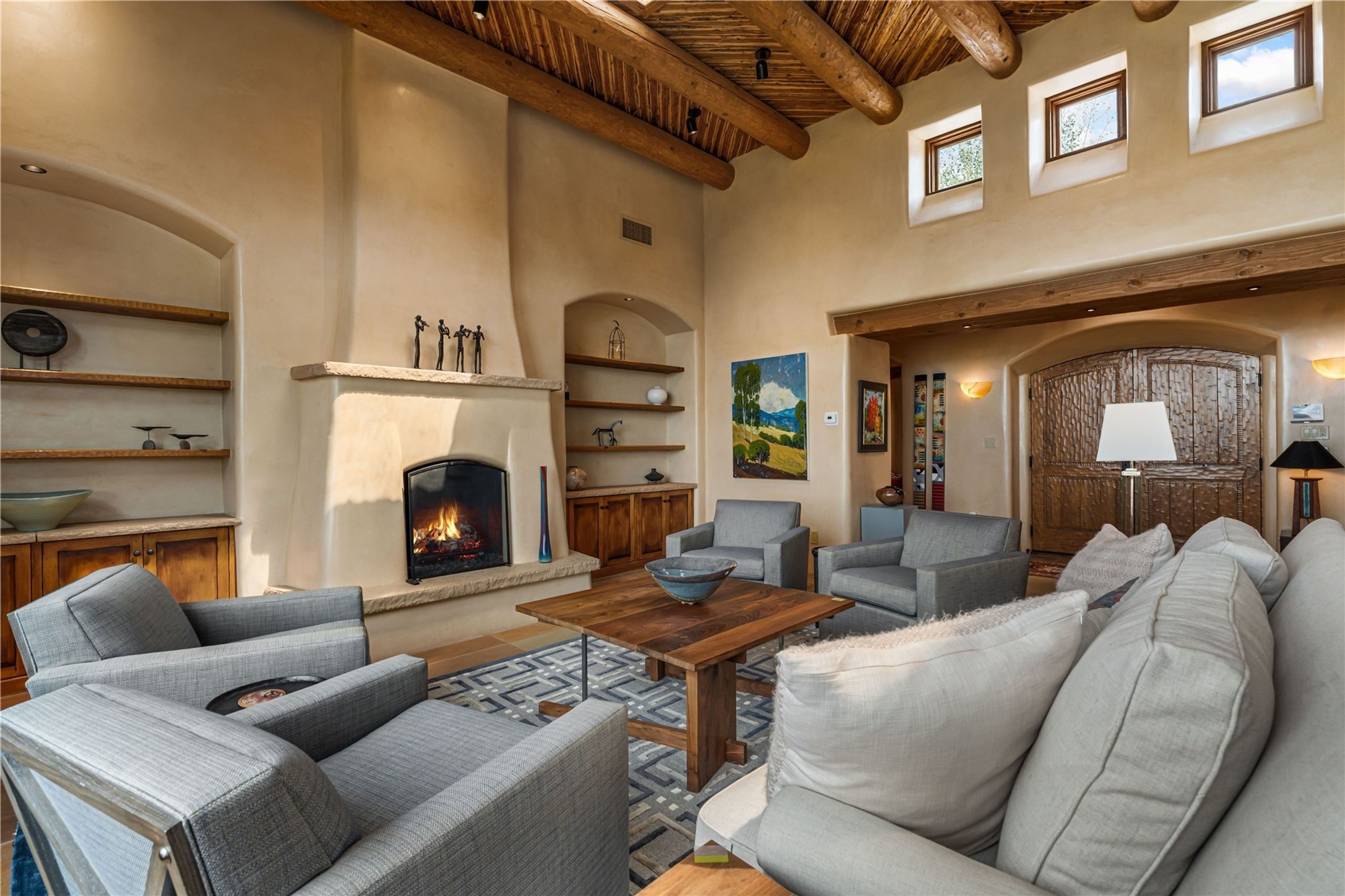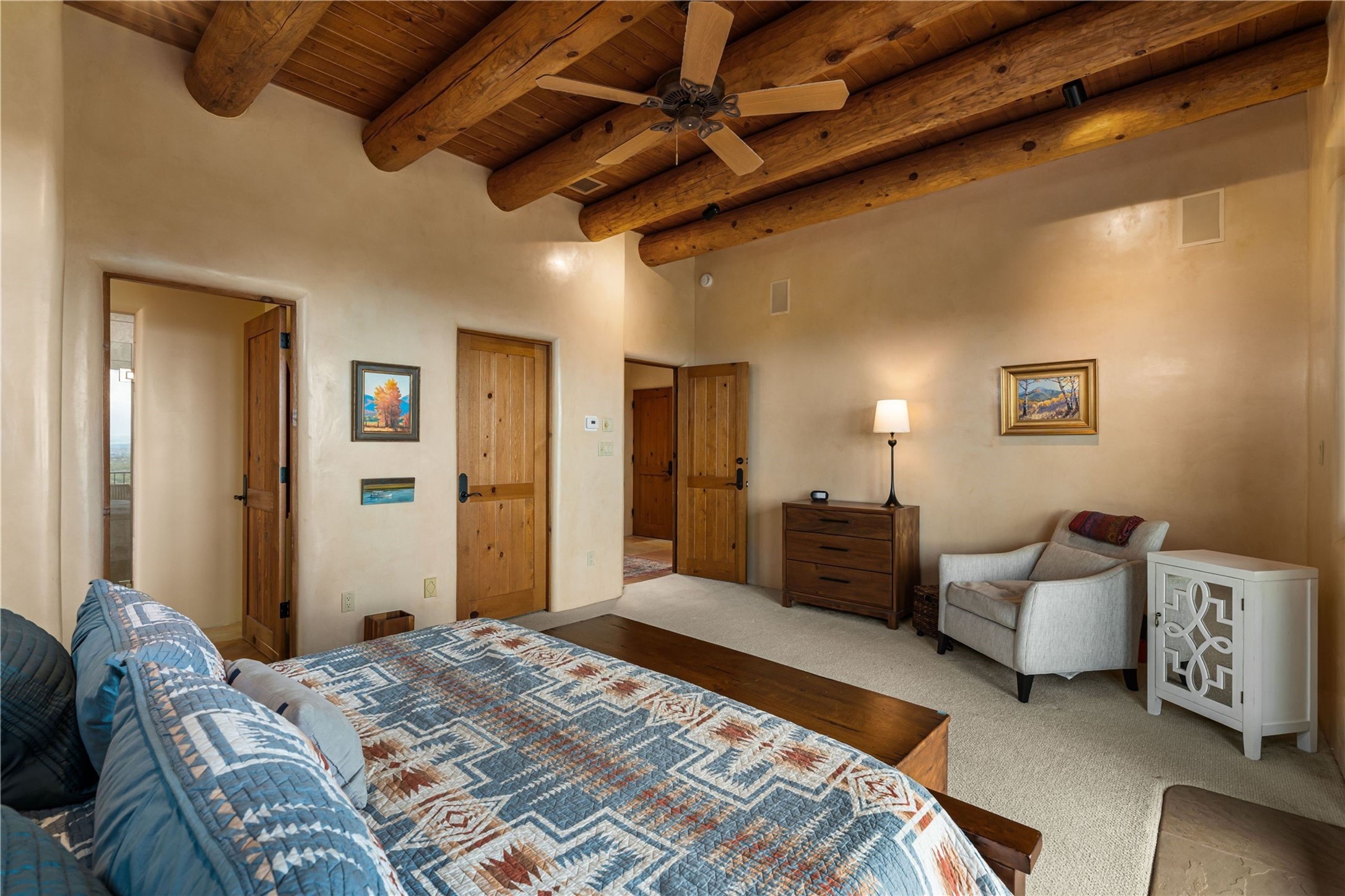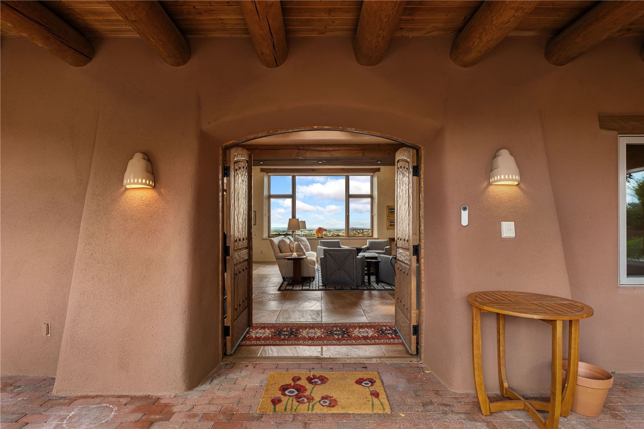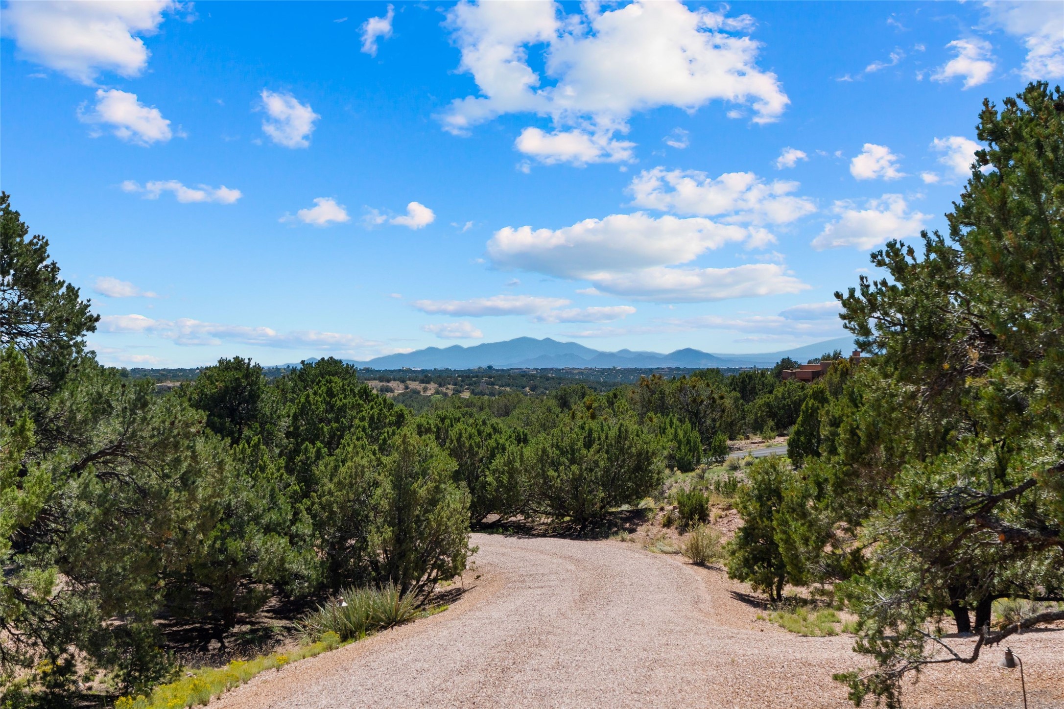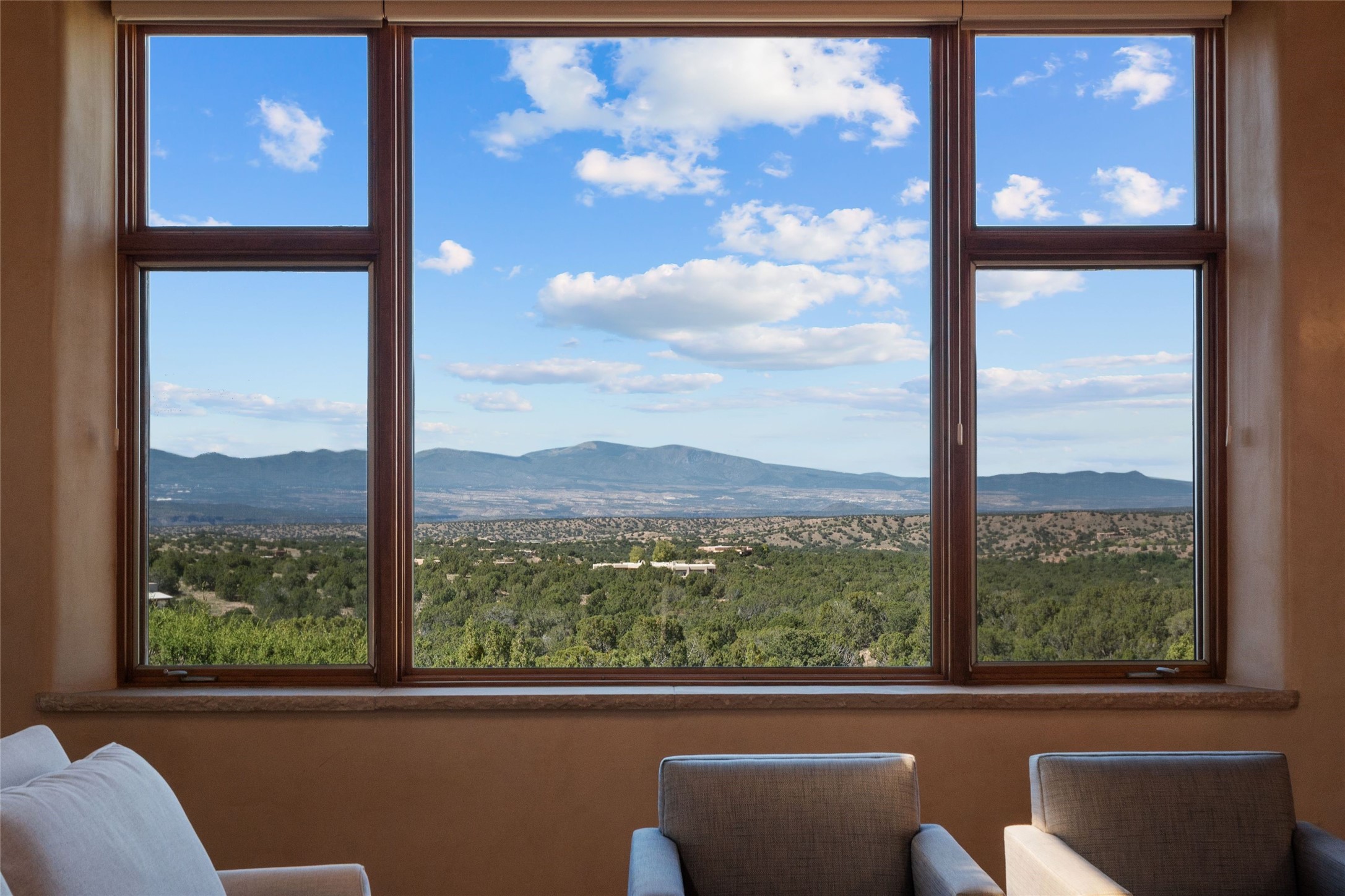 Tucked high up in Las Campanas on a generous 2.4-acre lot, this gorgeous Kim Dressel pueblo-style home is all about views, vibes, and space to breathe. From the moment you stroll through the professionally landscaped courtyard, you'll feel the magic--unobstructed vistas of the Jemez Mountains and sunsets that'll make you stop mid-sentence just to stare. Inside, it's a custom masterpiece. Think flagstone floors, hand-hewn beams, and those classic vigas that give it that warm, earthy soul. The ceilings and walls? Absolutely stunning, with textures and treatments that make every room feel like a work of art. Natural light pours in through expansive skylights, bouncing off the hand-troweled plaster walls and stone floors, creating that signature New Mexican glow. The chef's kitchen is a showstopper--top-tier appliances, loads of granite counter space, and a butler's pantry that's ready for your next dinner party or midnight snack run. And if you've got guests (or just want a little extra privacy), the attached casita is a sweet bonus: separate entrance, kitchenette, and all the cozy charm. You'll find two primary suites plus two additional bedroom suites--one even has its own mini kitchen and sitting room, perfect for long-term guests or multi-gen living. Whether you're hosting a formal gathering or kicking back in the informal living spaces, this home flows effortlessly. Over 1,000 square feet of private outdoor space to soak in the views, sip your morning coffee, or toast the sunset. With its perch on one of the highest lots in the area, you'll enjoy peace, privacy, and those jaw-dropping Northwest views over untouched land. This isn't just a house--it's a lifestyle. Come see it, feel it, fall in love.