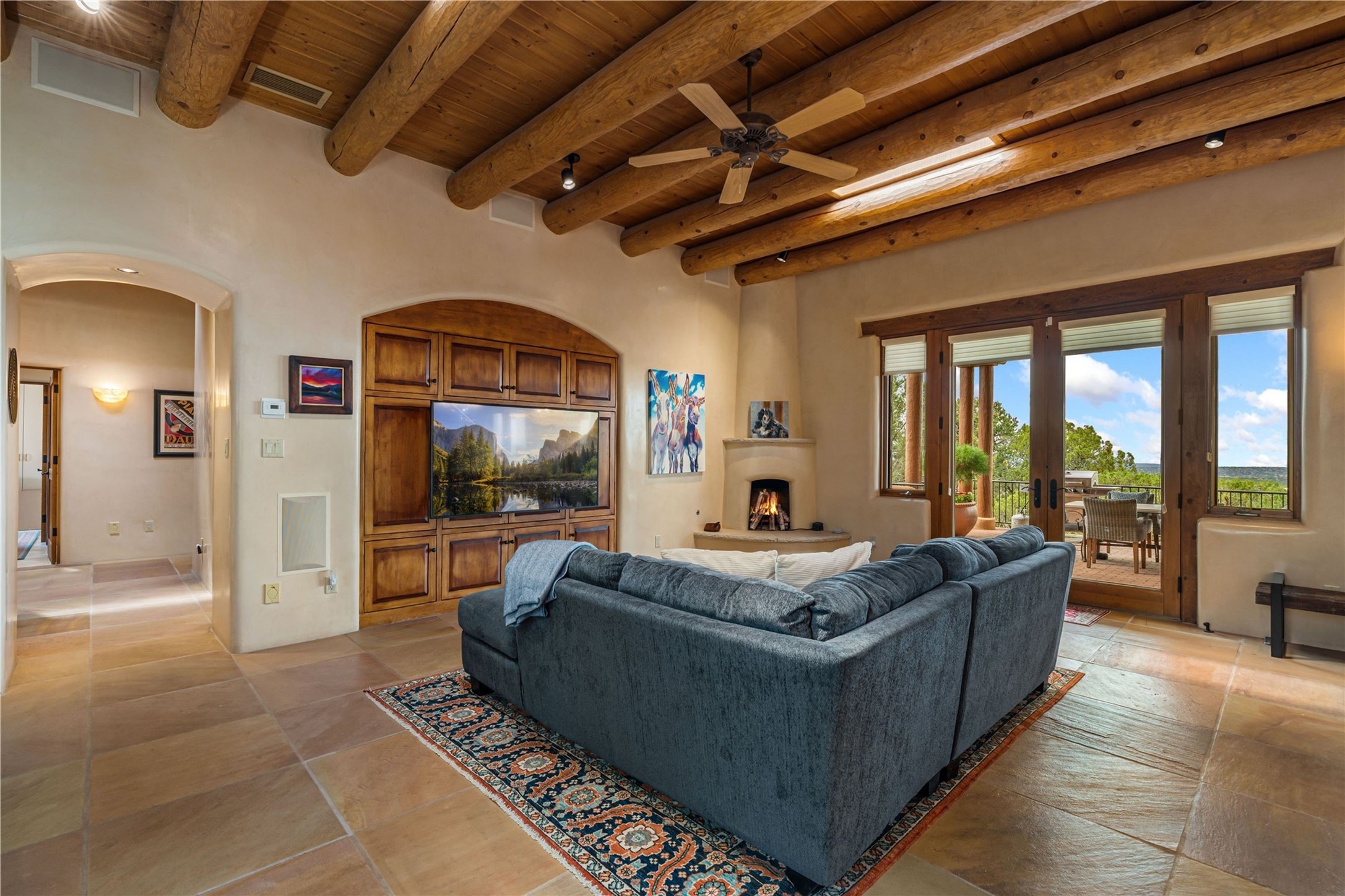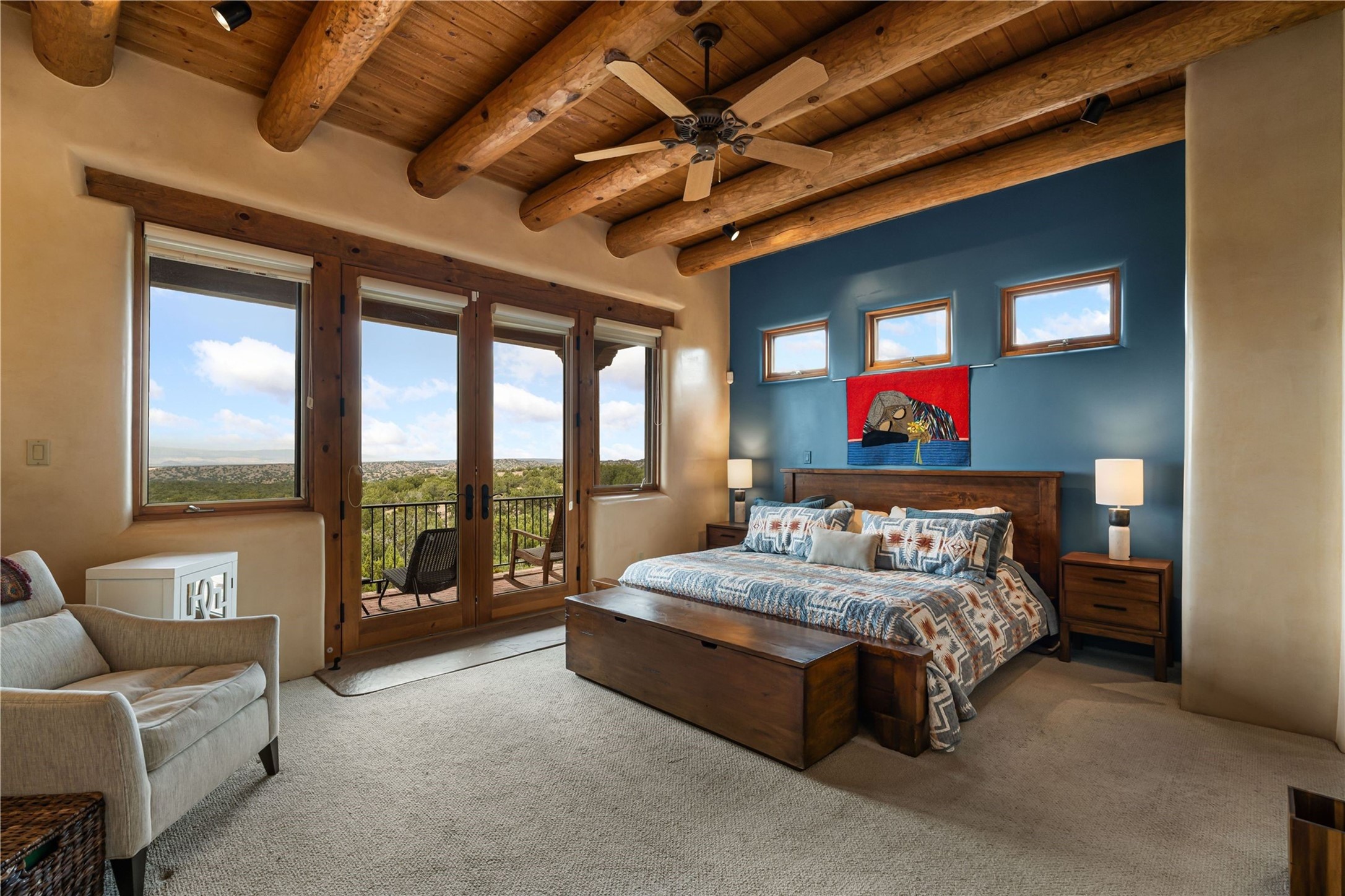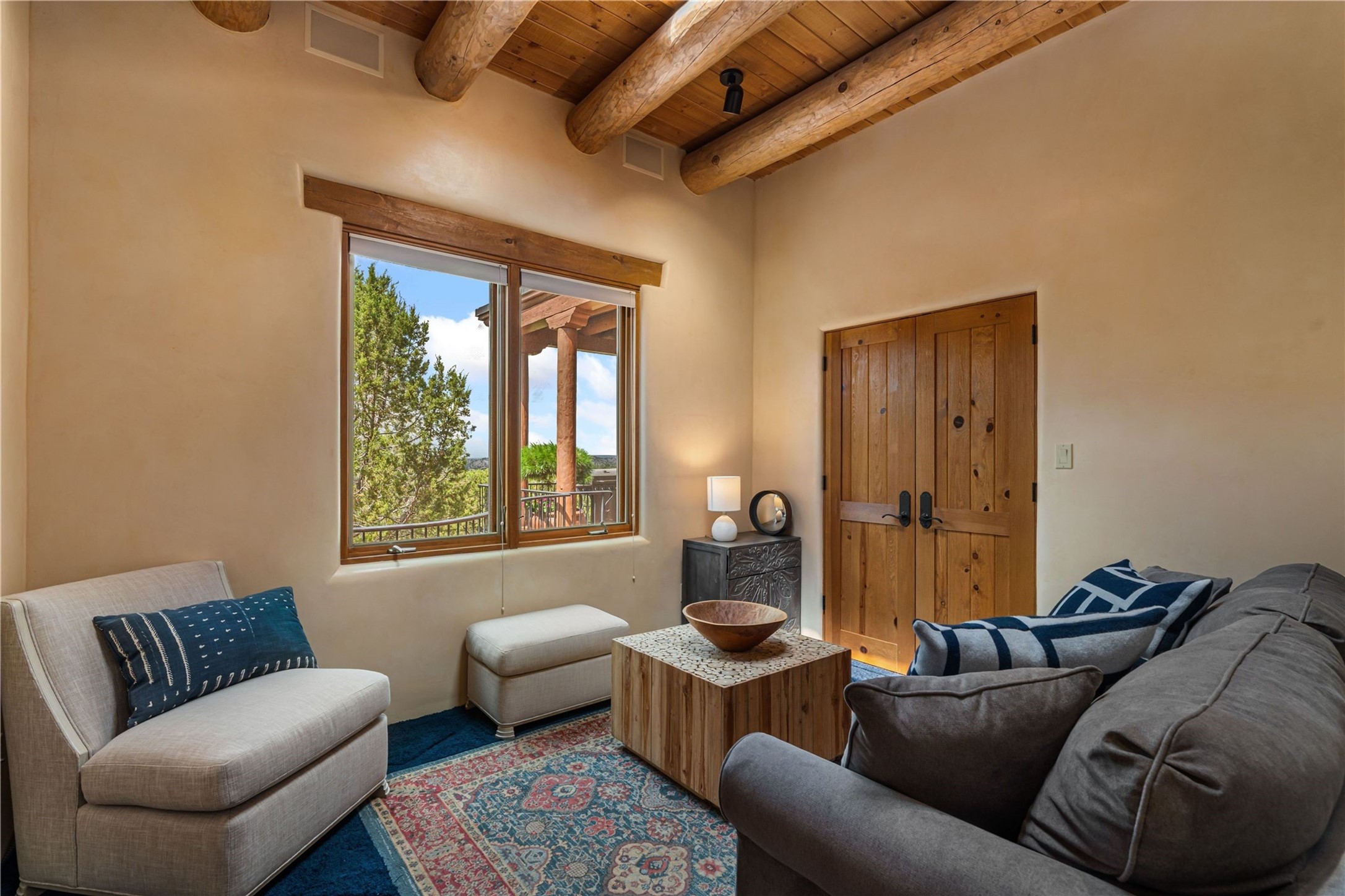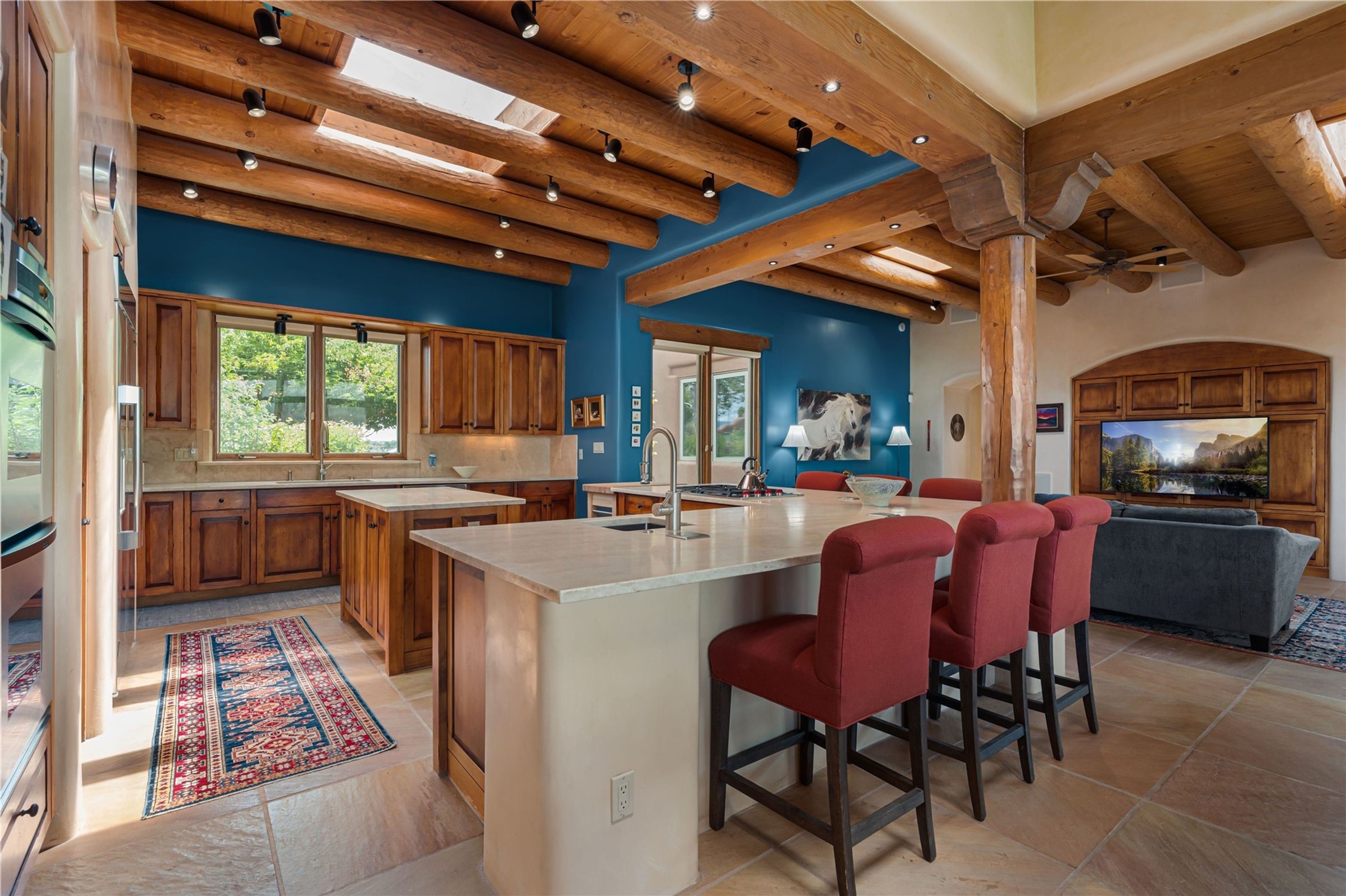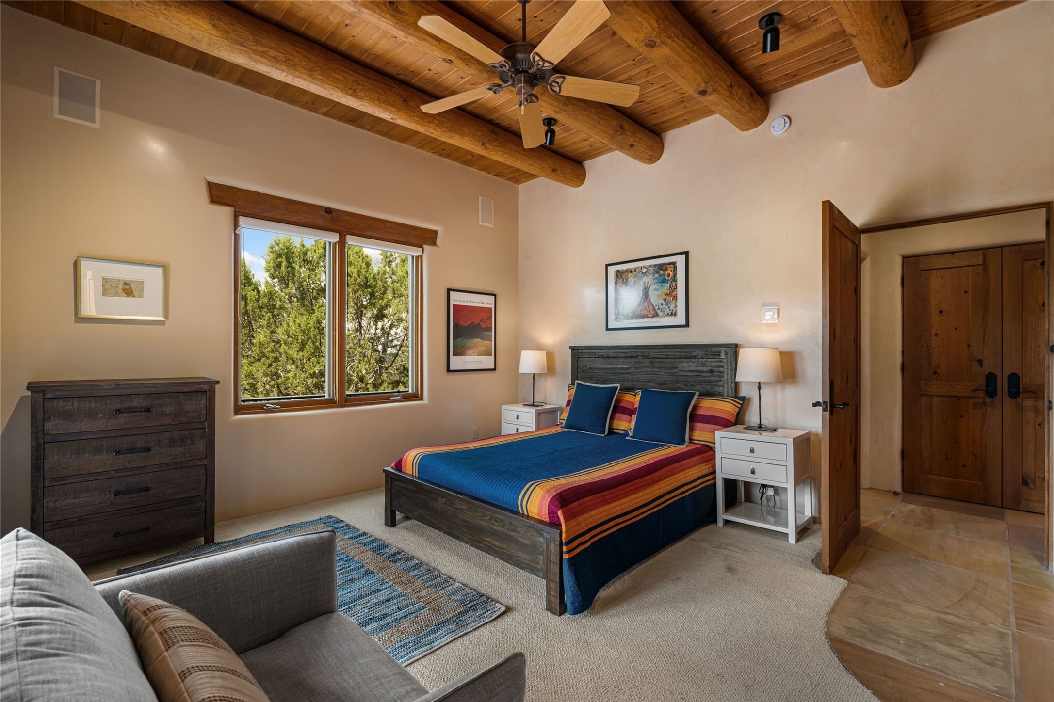 Tucked high up in Las Campanas on a generous 2.4-acre lot, this gorgeous Kim Dressel pueblo-style home is all about views, vibes, and space to breathe. From the moment you stroll through the professionally landscaped courtyard, you'll feel the magic--unobstructed vistas of the Jemez Mountains and sunsets that'll make you stop mid-sentence just to stare. Inside, it's a custom masterpiece. Think flagstone floors, hand-hewn beams, and those classic vigas that give it that warm, earthy soul. The ceilings and walls? Absolutely stunning, with textures and treatments that make every room feel like a work of art. Natural light pours in through expansive skylights, bouncing off the hand-troweled plaster walls and stone floors, creating that signature New Mexican glow. The chef's kitchen is a showstopper--top-tier appliances, loads of granite counter space, and a butler's pantry that's ready for your next dinner party or midnight snack run. And if you've got guests (or just want a little extra privacy), the attached casita is a sweet bonus: separate entrance, kitchenette, and all the cozy charm. You'll find two primary suites plus two additional bedroom suites--one even has its own mini kitchen and sitting room, perfect for long-term guests or multi-gen living. Whether you're hosting a formal gathering or kicking back in the informal living spaces, this home flows effortlessly. Over 1,000 square feet of private outdoor space to soak in the views, sip your morning coffee, or toast the sunset. With its perch on one of the highest lots in the area, you'll enjoy peace, privacy, and those jaw-dropping Northwest views over untouched land. This isn't just a house--it's a lifestyle. Come see it, feel it, fall in love.