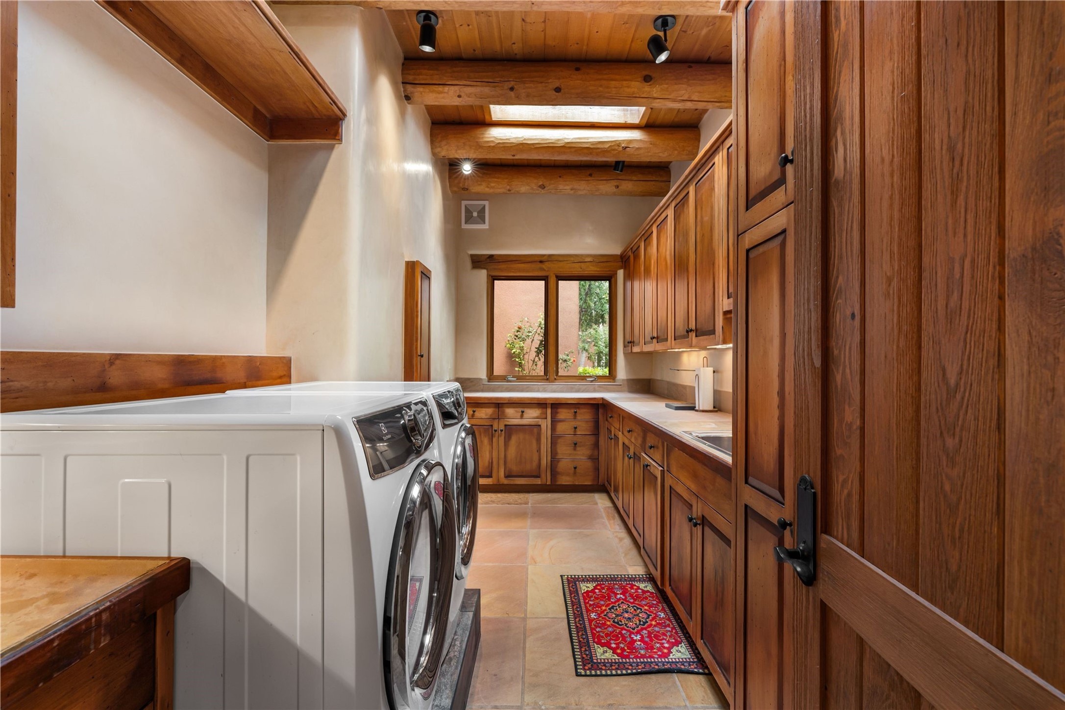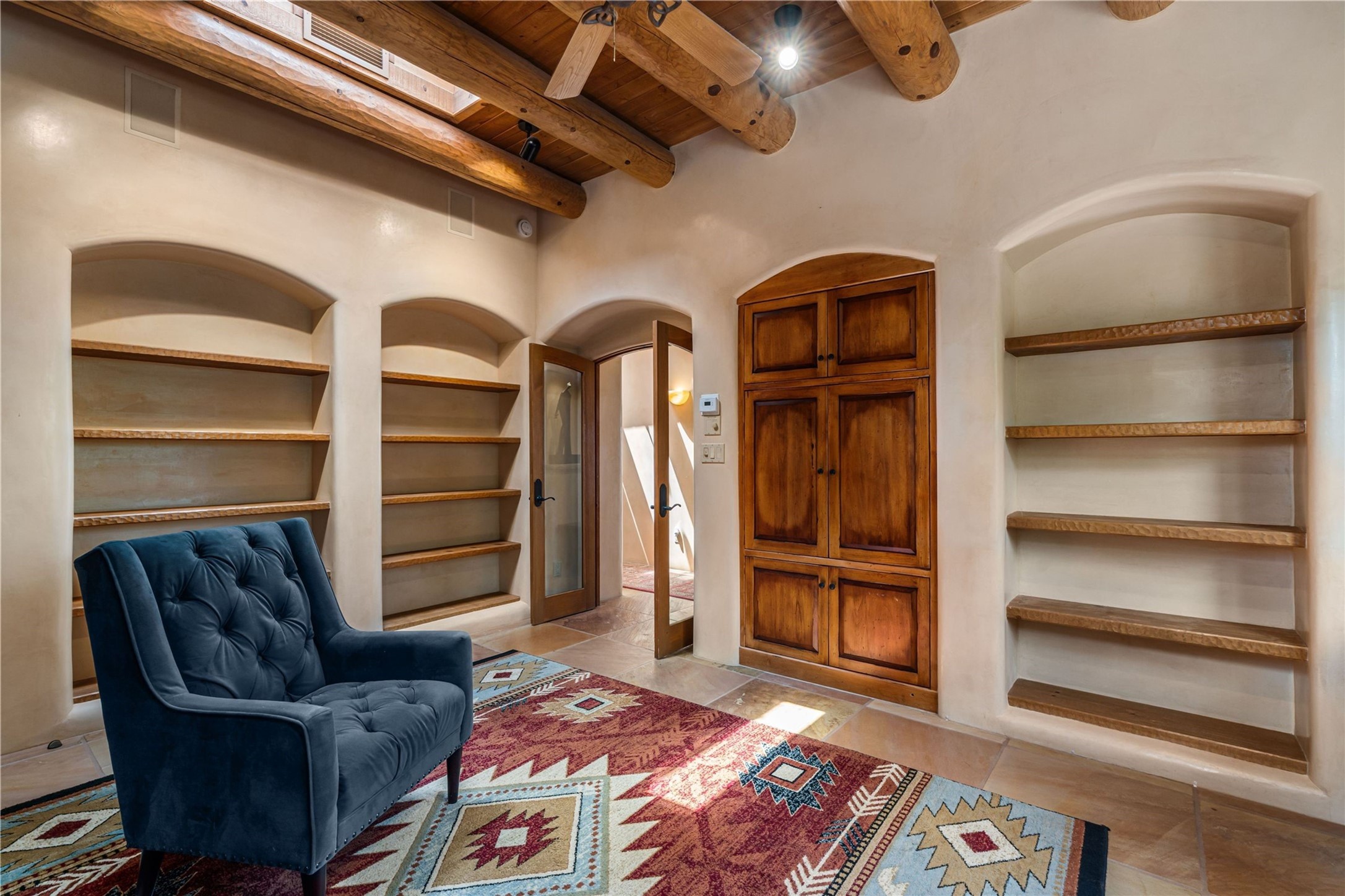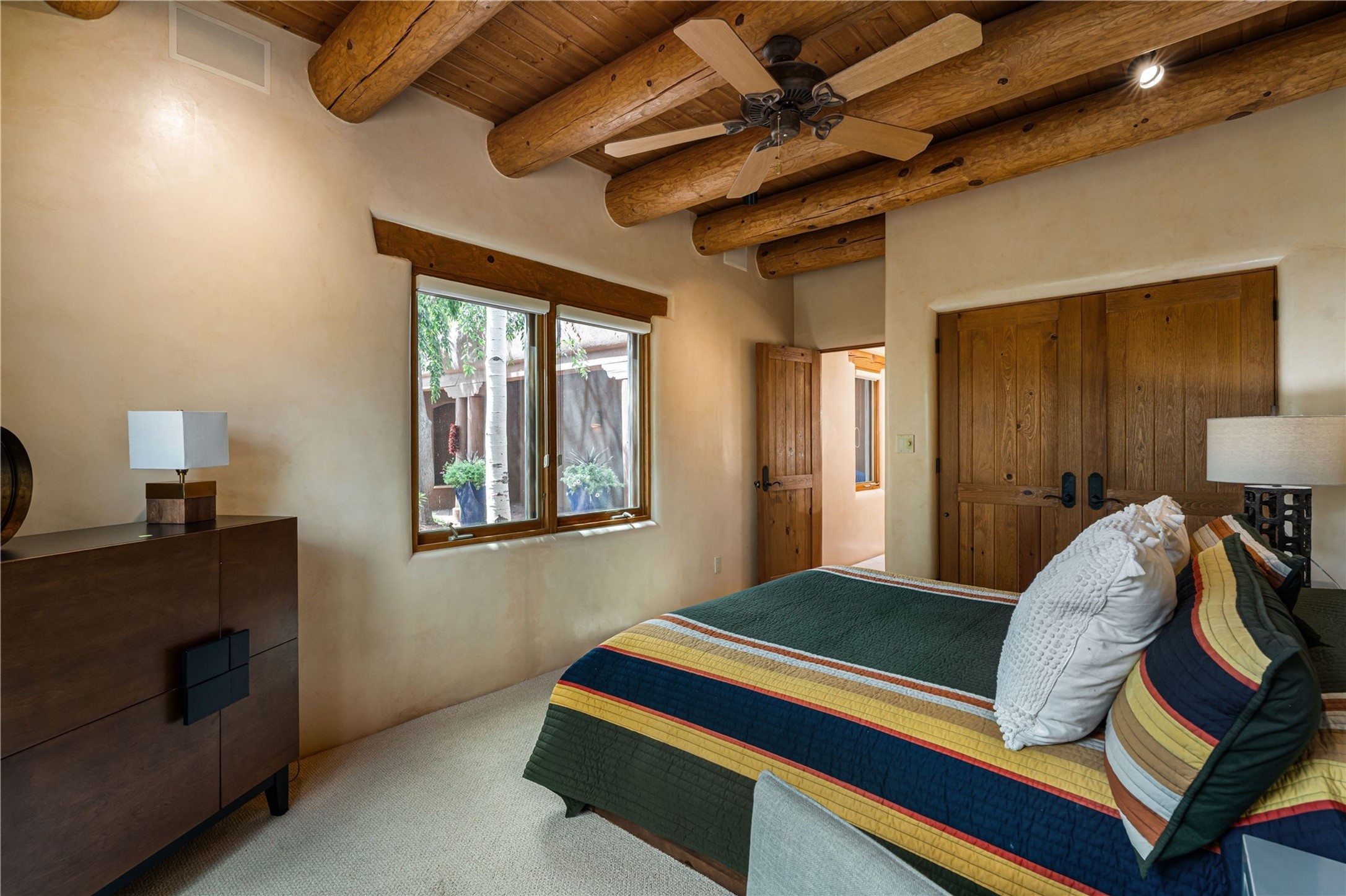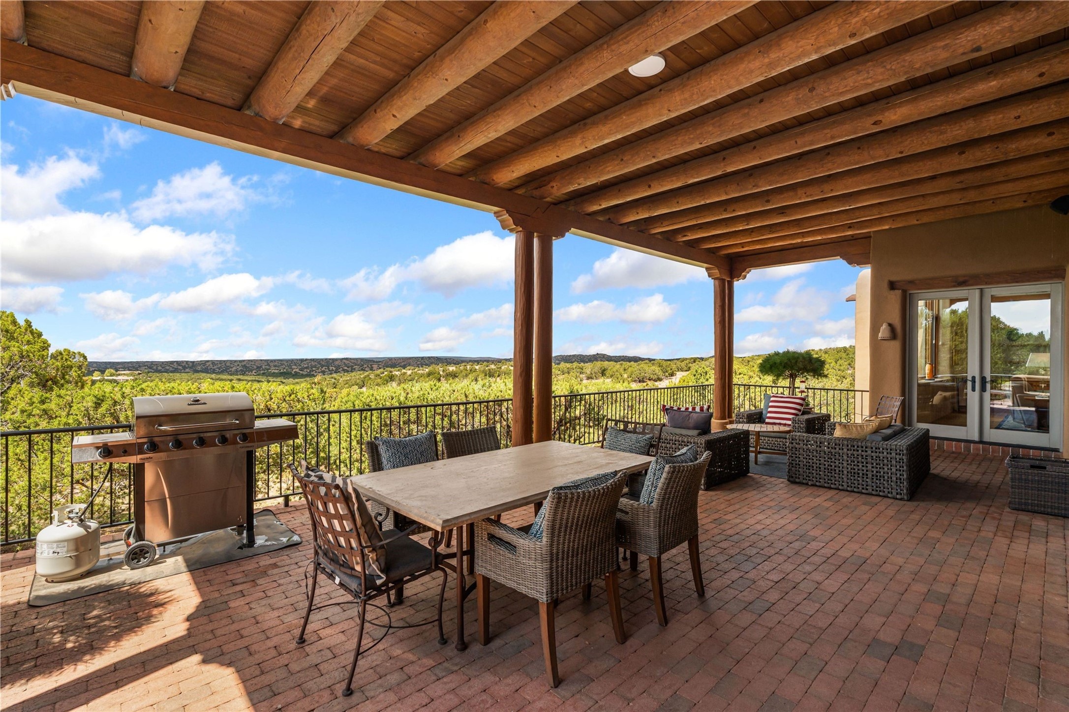Tucked high up in Las Campanas on a generous 2.4-acre lot, this gorgeous Kim Dressel pueblo-style home is all about views, vibes, and space to breathe. From the moment you stroll through the professionally landscaped courtyard, you'll feel the magic--unobstructed vistas of the Jemez Mountains and sunsets that'll make you stop mid-sentence just to stare. Inside, it's a custom masterpiece. Think flagstone floors, hand-hewn beams, and those classic vigas that give it that warm, earthy soul. The ceilings and walls? Absolutely stunning, with textures and treatments that make every room feel like a work of art. Natural light pours in through expansive skylights, bouncing off the hand-troweled plaster walls and stone floors, creating that signature New Mexican glow. The chef's kitchen is a showstopper--top-tier appliances, loads of granite counter space, and a butler's pantry that's ready for your next dinner party or midnight snack run. And if you've got guests (or just want a little extra privacy), the attached casita is a sweet bonus: separate entrance, kitchenette, and all the cozy charm. You'll find two primary suites plus two additional bedroom suites--one even has its own mini kitchen and sitting room, perfect for long-term guests or multi-gen living. Whether you're hosting a formal gathering or kicking back in the informal living spaces, this home flows effortlessly. Over 1,000 square feet of private outdoor space to soak in the views, sip your morning coffee, or toast the sunset. With its perch on one of the highest lots in the area, you'll enjoy peace, privacy, and those jaw-dropping Northwest views over untouched land. This isn't just a house--it's a lifestyle. Come see it, feel it, fall in love.