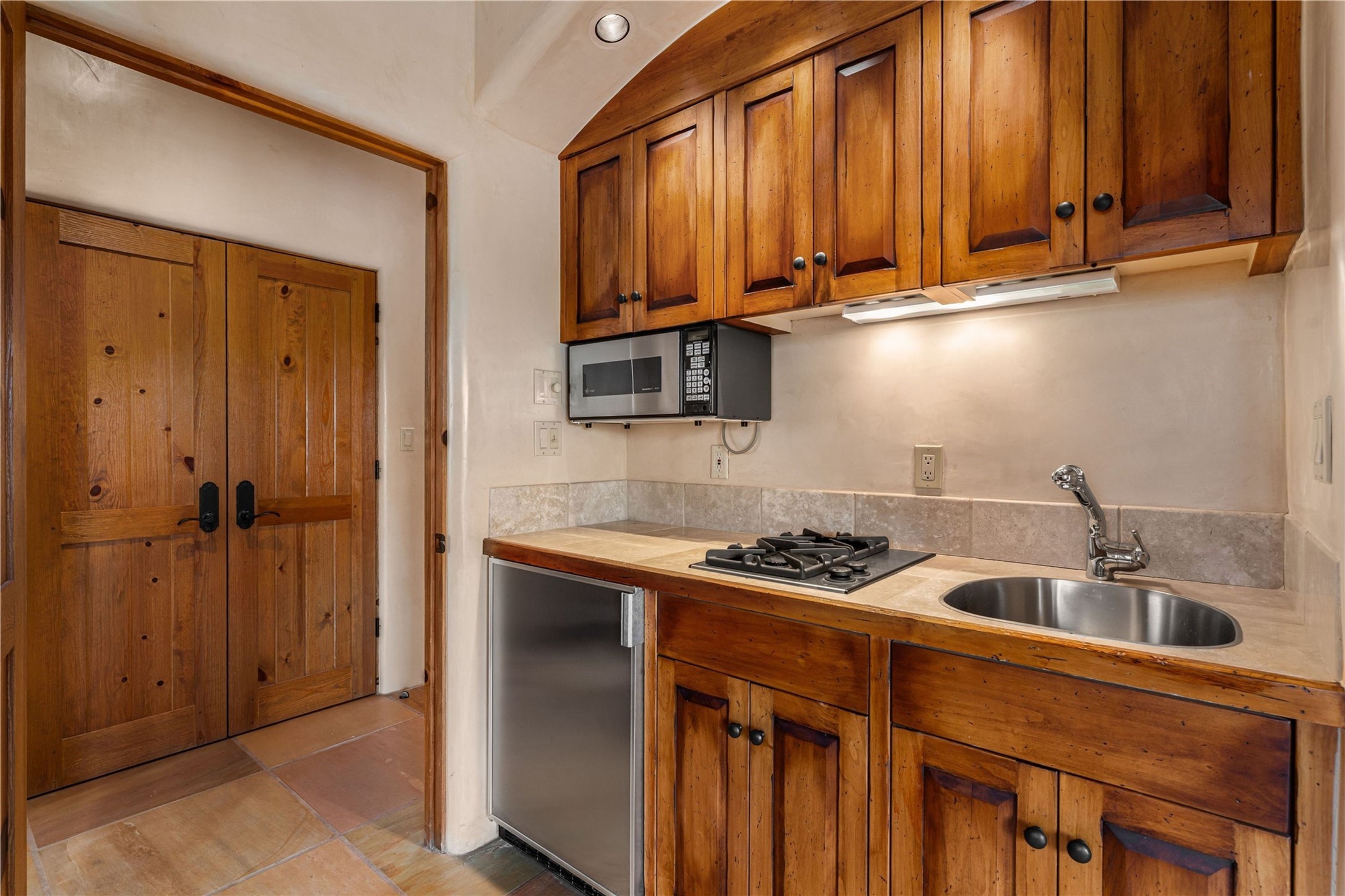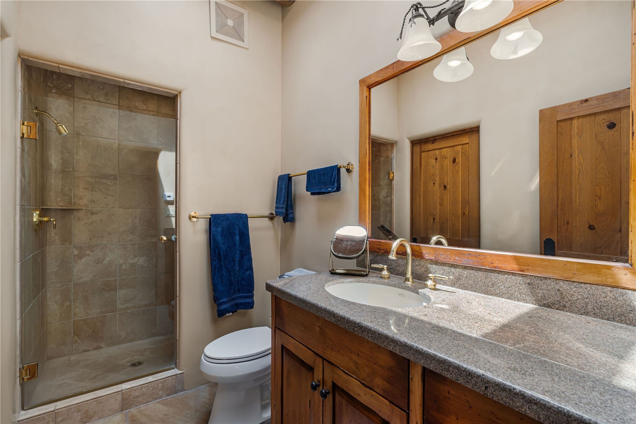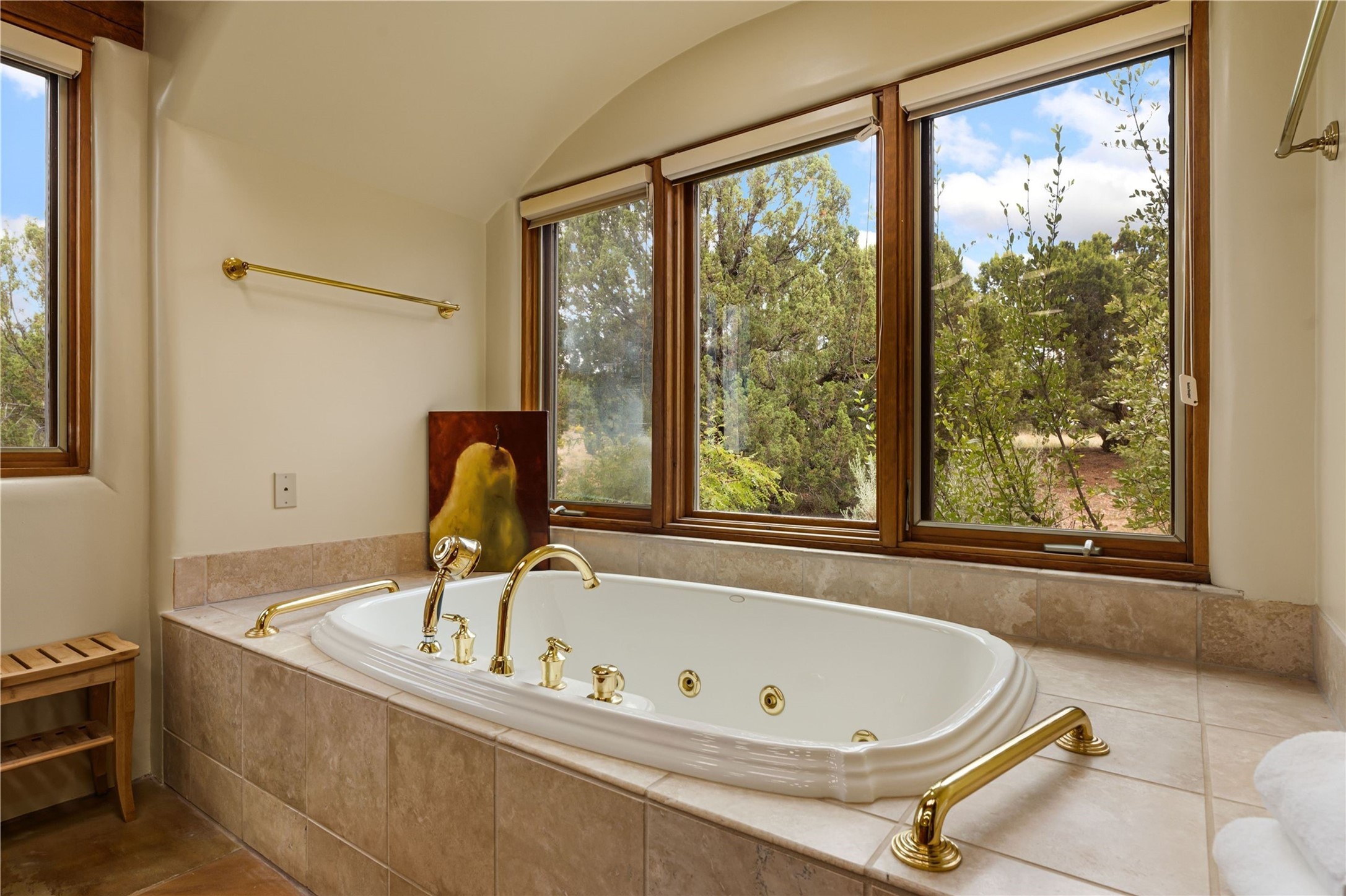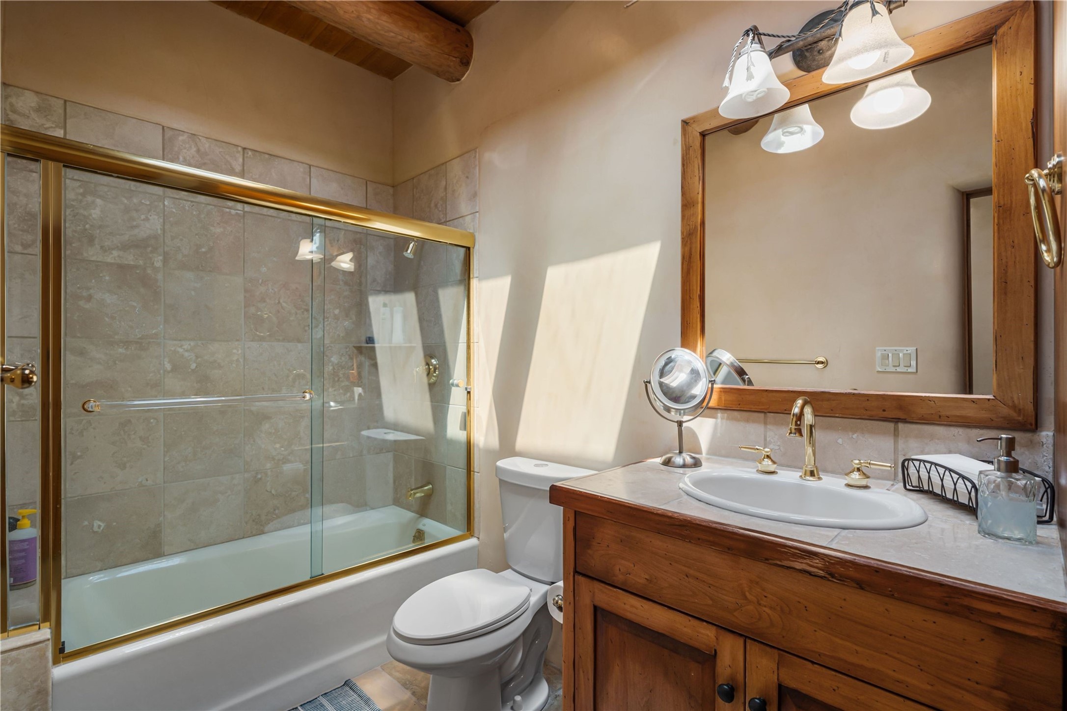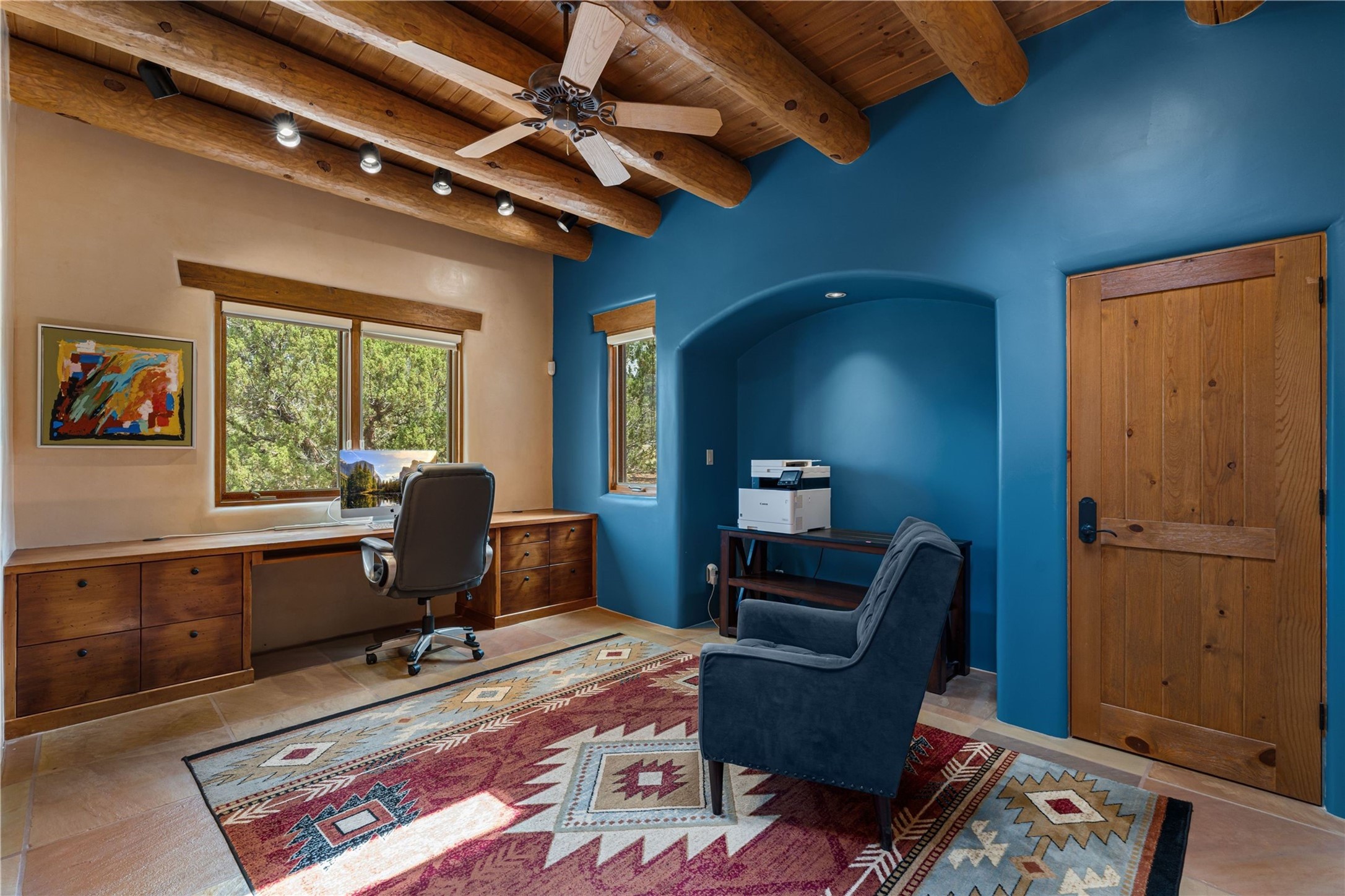 Tucked high up in Las Campanas on a generous 2.4-acre lot, this gorgeous Kim Dressel pueblo-style home is all about views, vibes, and space to breathe. From the moment you stroll through the professionally landscaped courtyard, you'll feel the magic--unobstructed vistas of the Jemez Mountains and sunsets that'll make you stop mid-sentence just to stare. Inside, it's a custom masterpiece. Think flagstone floors, hand-hewn beams, and those classic vigas that give it that warm, earthy soul. The ceilings and walls? Absolutely stunning, with textures and treatments that make every room feel like a work of art. Natural light pours in through expansive skylights, bouncing off the hand-troweled plaster walls and stone floors, creating that signature New Mexican glow. The chef's kitchen is a showstopper--top-tier appliances, loads of granite counter space, and a butler's pantry that's ready for your next dinner party or midnight snack run. And if you've got guests (or just want a little extra privacy), the attached casita is a sweet bonus: separate entrance, kitchenette, and all the cozy charm. You'll find two primary suites plus two additional bedroom suites--one even has its own mini kitchen and sitting room, perfect for long-term guests or multi-gen living. Whether you're hosting a formal gathering or kicking back in the informal living spaces, this home flows effortlessly. Over 1,000 square feet of private outdoor space to soak in the views, sip your morning coffee, or toast the sunset. With its perch on one of the highest lots in the area, you'll enjoy peace, privacy, and those jaw-dropping Northwest views over untouched land. This isn't just a house--it's a lifestyle. Come see it, feel it, fall in love.