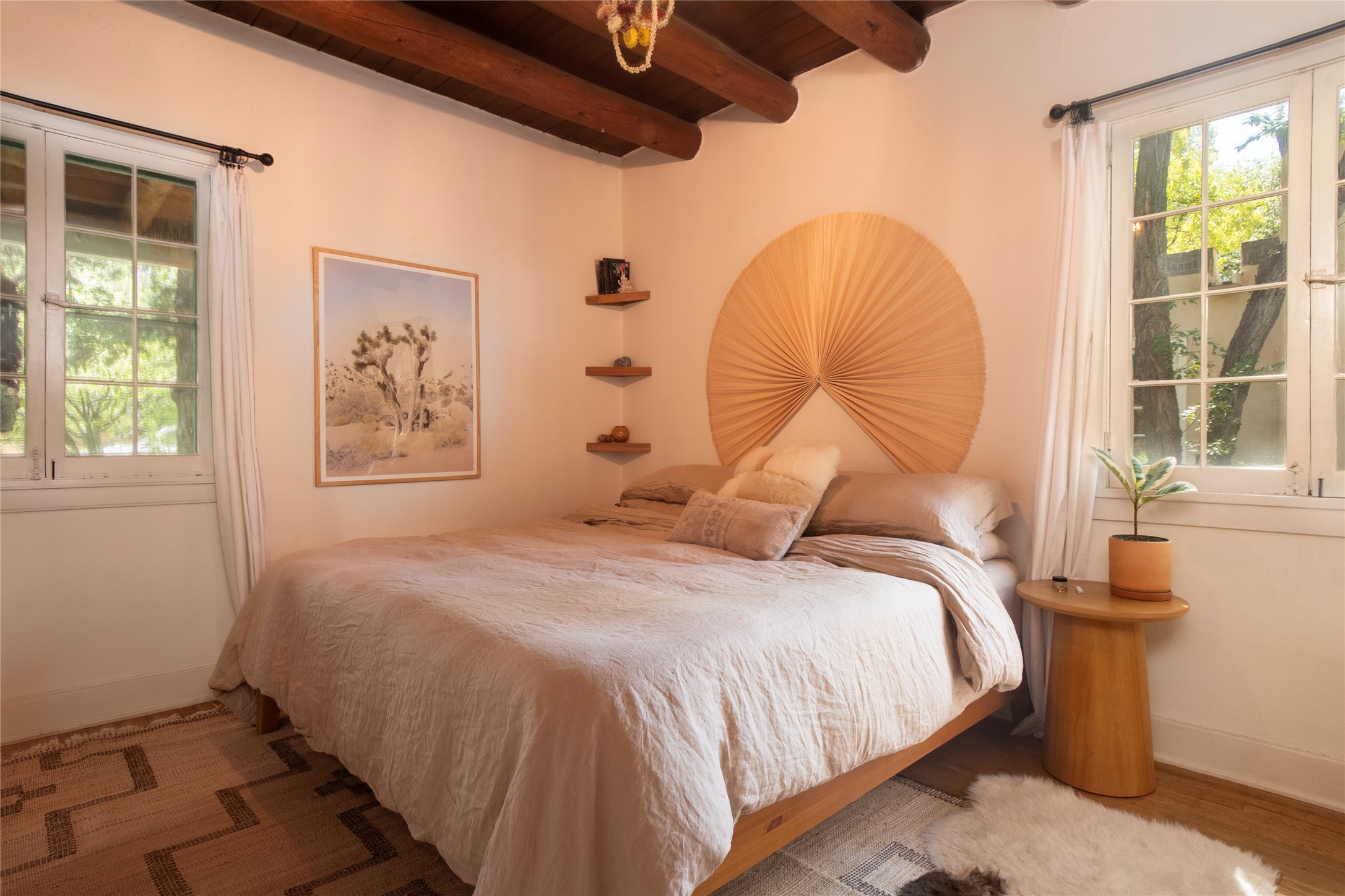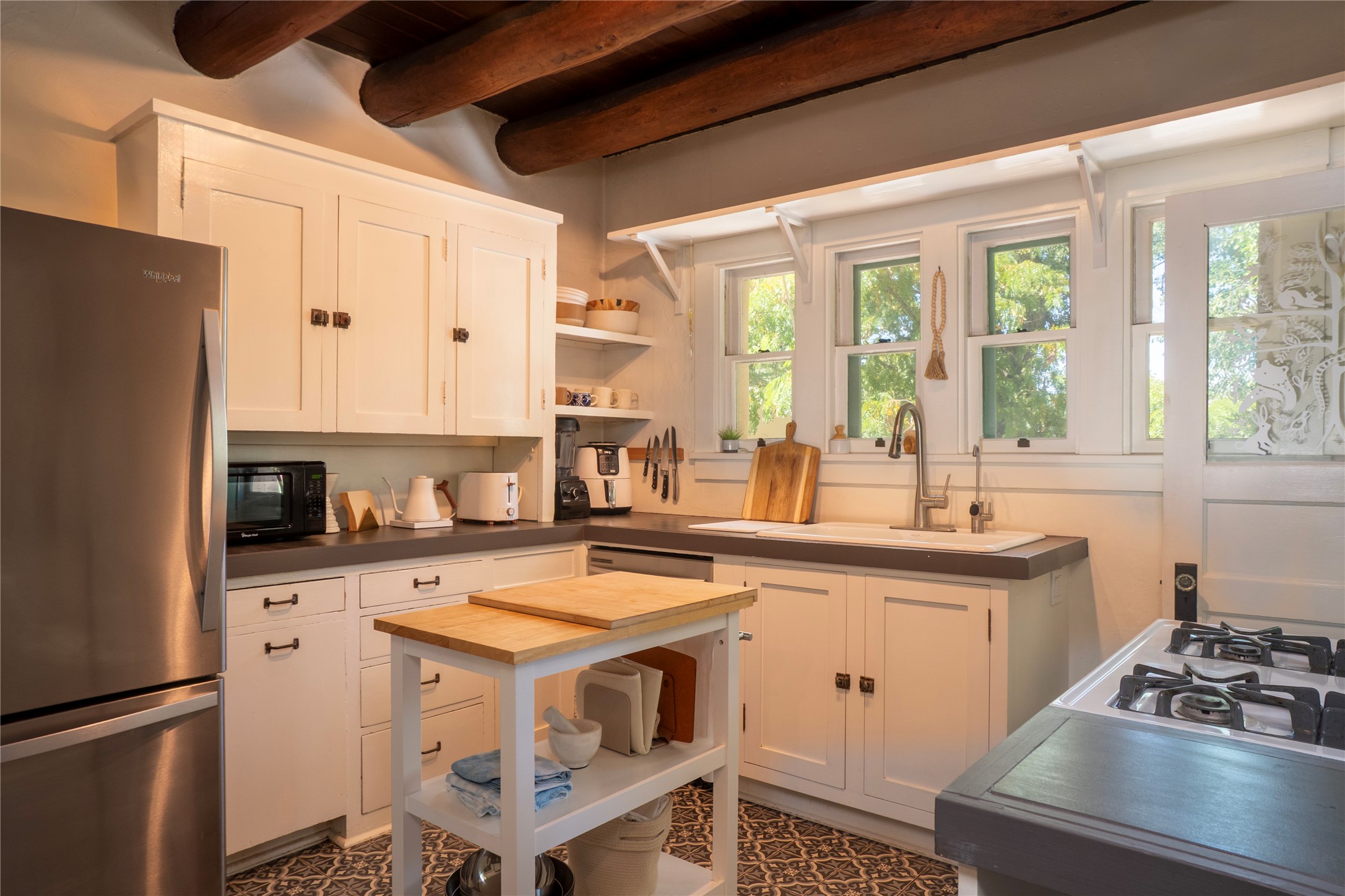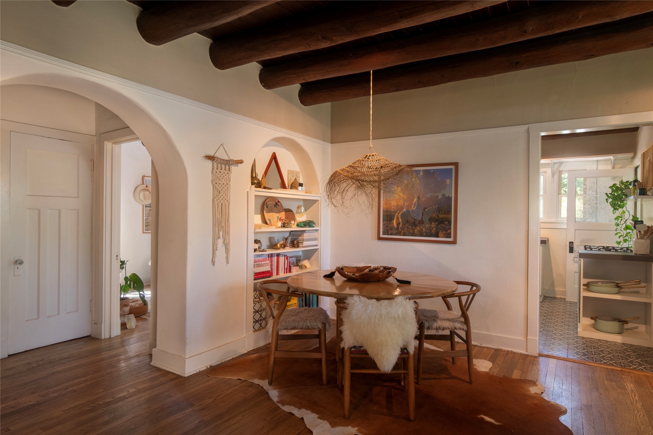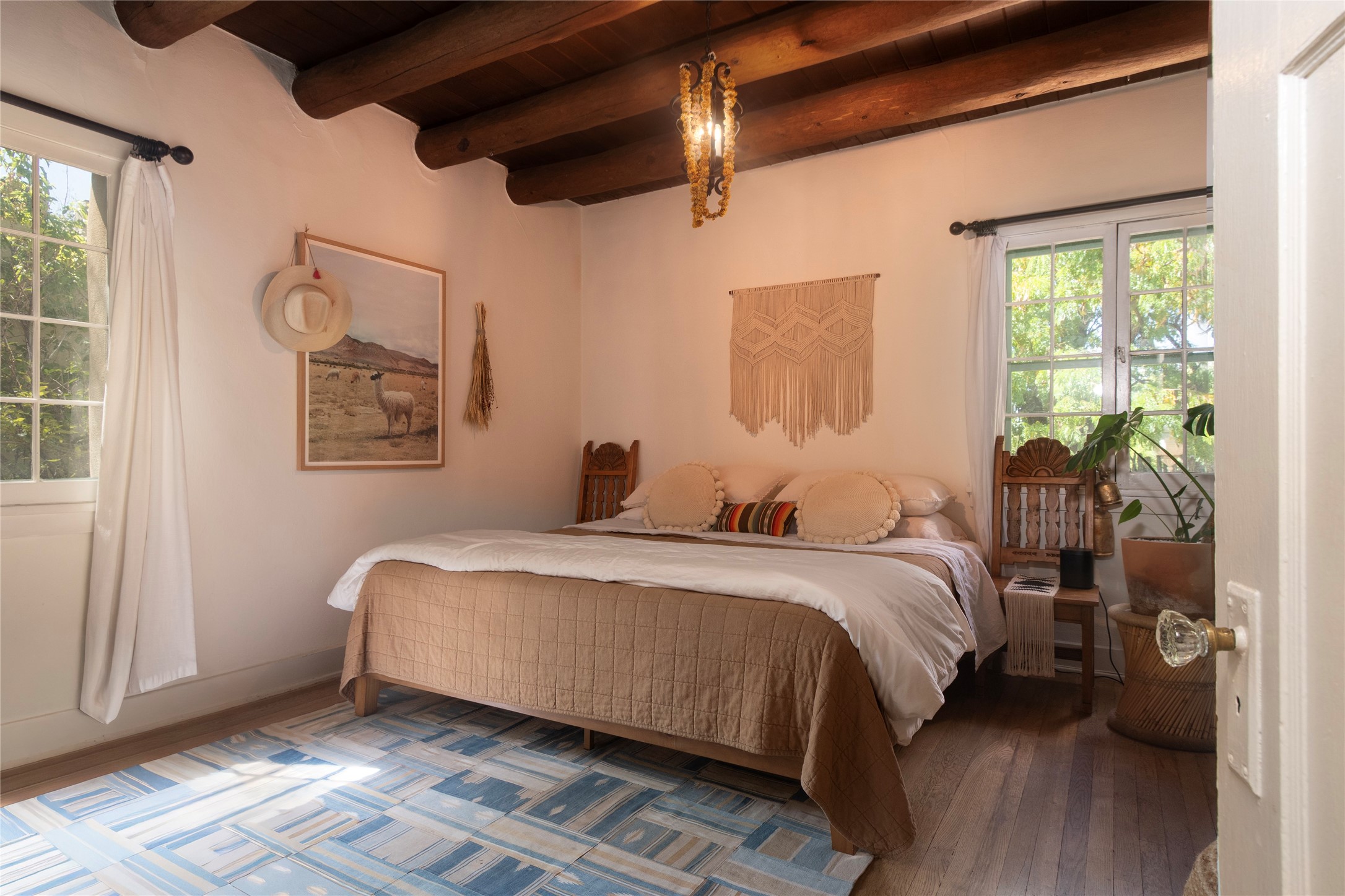 Charming two-bedroom, one-bath Eastside residence situated on 0.18-acres. This territorial-style adobe home is the perfect blend of its original charm and modern updates, offering 1,340 square feet of living space. A cozy fireplace in the living room gives a warm ambiance and dining room provides plenty of room for guests to gather or an extra space to work from home. A quaint kitchen with a pantry and a nearby laundry room adds convenience. The generous front and back yard provides ample space for entertaining guests. Additionally, the detached garage could possibly be used as extra storage or an opportunity for creatives to convert into a private studio space. Located on the corner of Acequia Madre and San Antonio within minutes from Canyon Road and the historic Plaza, allowing for easy access to the city's rich cultural offerings. This is truly an Eastside gem in the most wonderful location!