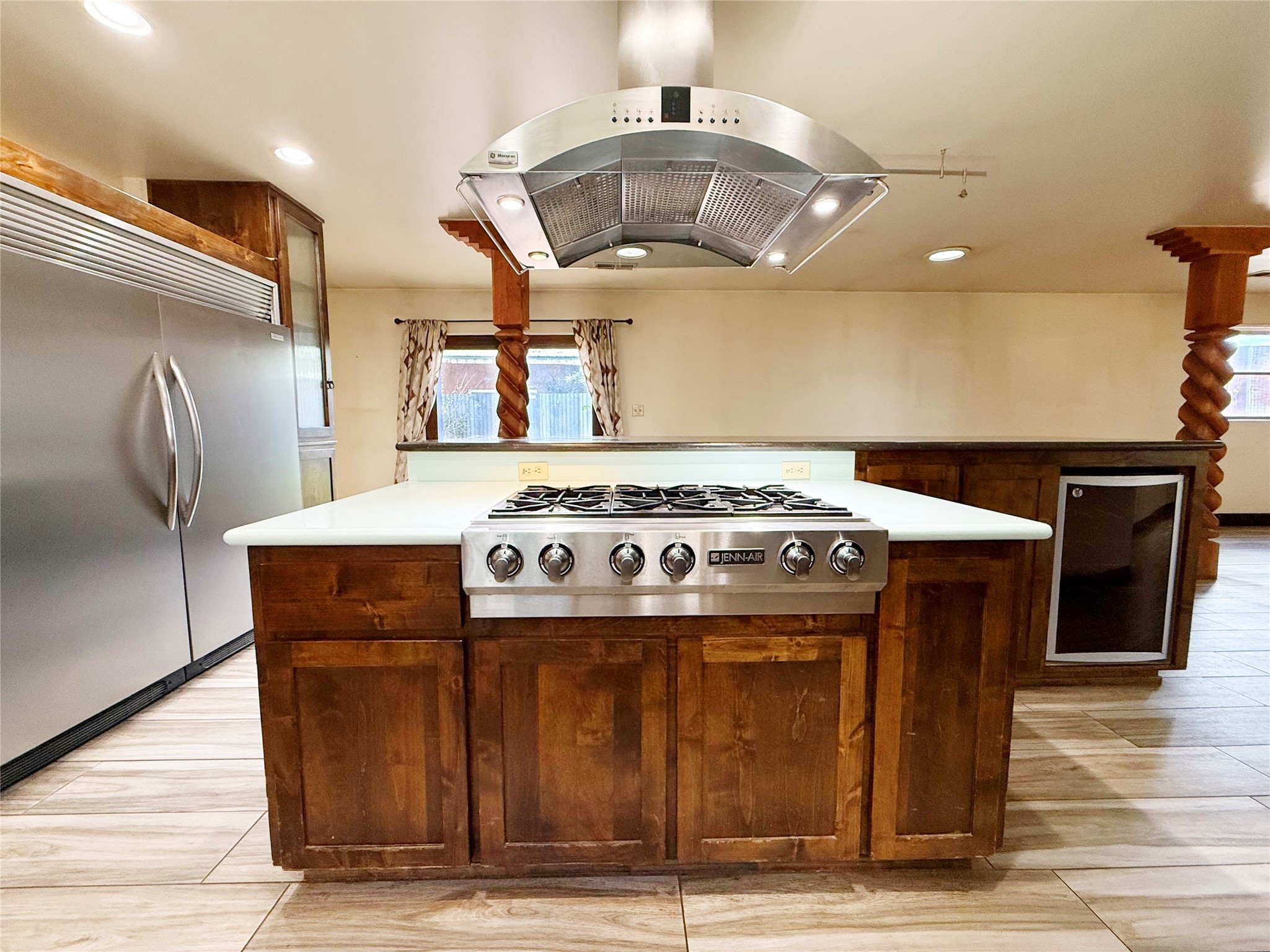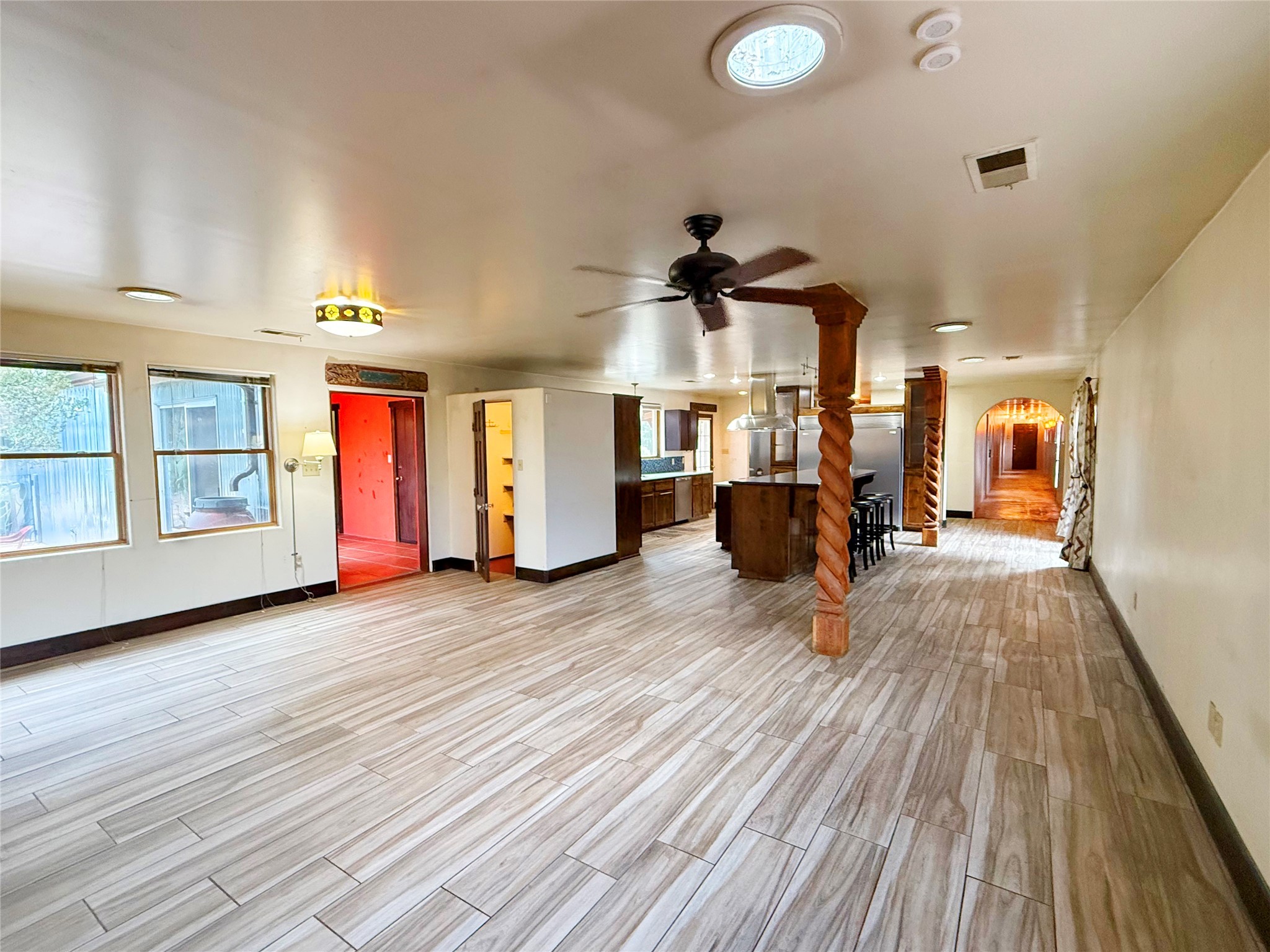 Stunning former hotel transformed into a luxurious 3-bedroom, 2.5-bathroom residence on almost 3/4 acre along the Gallinas River. This chef's dream home features an open-concept living area anchored by a beautiful river rock fireplace, seamlessly connecting to a gourmet kitchen with double-sized refrigerator and freezer, 6-burner gas cooktop island with bar seating, wine refrigerator, double oven, microwave, and abundant pantry and cabinet space with stunning display cabinets, space for a butler's pantry or coffee bar and hard surface countertops. The master suite features a gas kiva fireplace, dual closets, step-down rainfall shower, and French doors opening to landscaped gardens and patios. A versatile sunroom/den with gas fireplace offers endless possibilities for relaxation or entertainment. Three bedrooms are accessed via a dramatic long hallway, with rooms tastefully numbered as a nod to the property's historic hotel past. Nearly every living area in the home features French doors leading to beautifully landscaped patios throughout the lush, green grounds. The property includes a three-car detached garage with workshop, storage shed, garden shed, and covered firewood storage. Grounds are accented with beautiful large mountain rocks and offer wide open spaces perfect for outdoor living. Located directly next to the Gallinas River, this unique property combines luxury amenities with historic charm and natural beauty - truly a must-see opportunity.