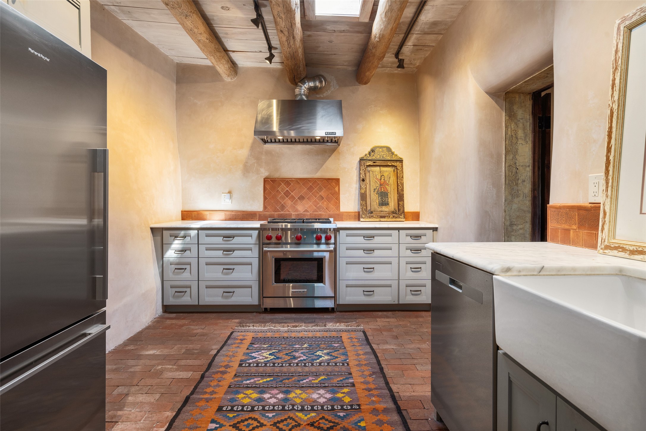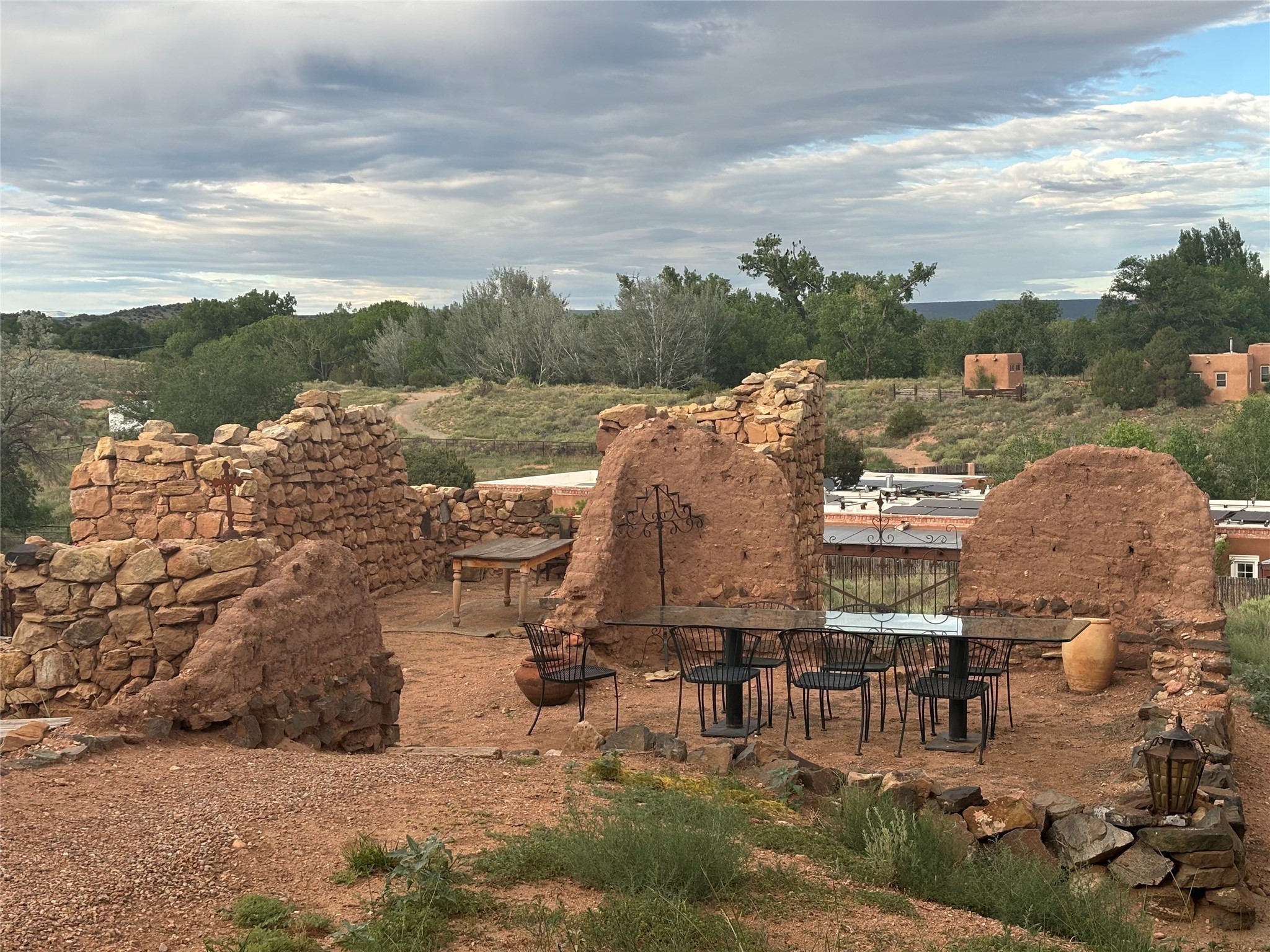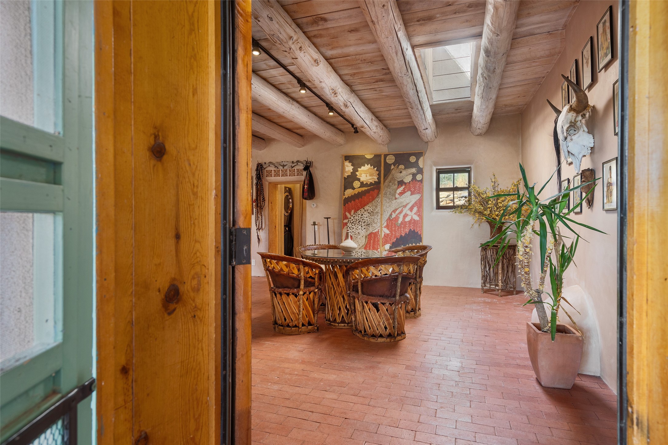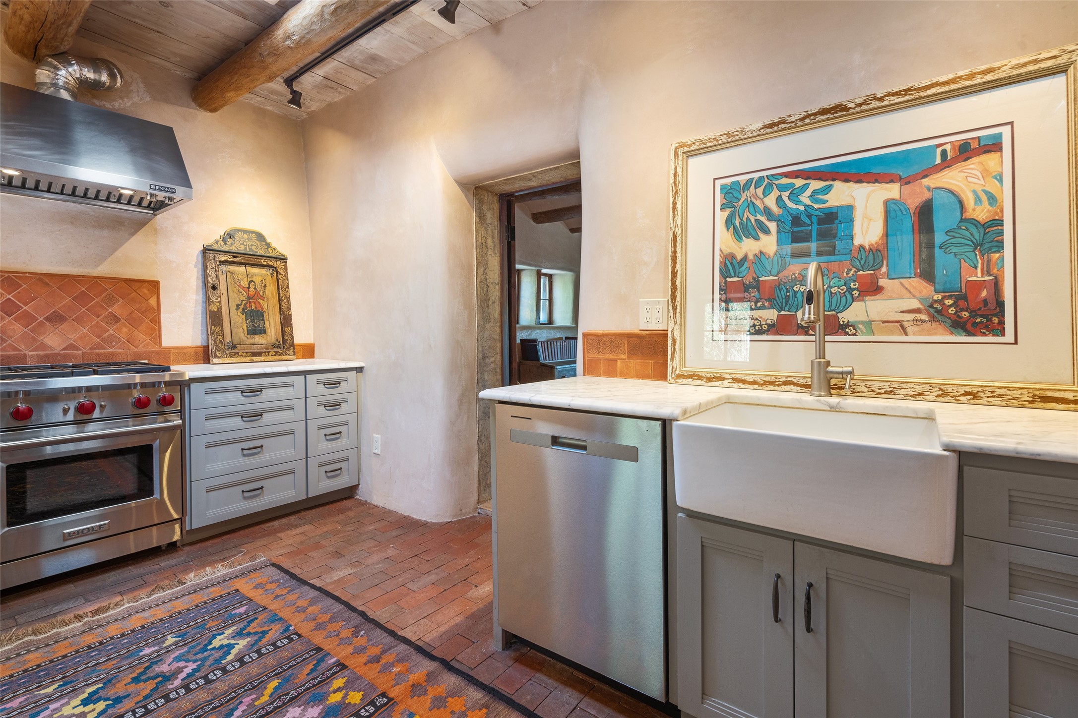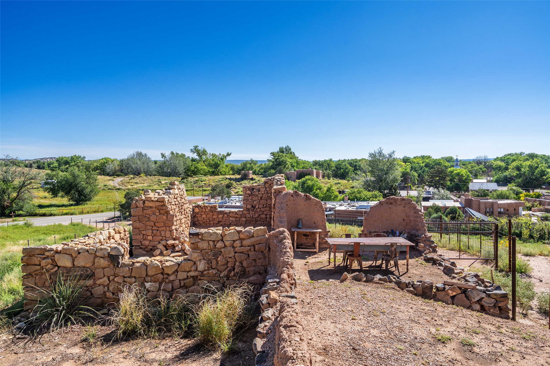 Step into a rare piece of New Mexico history with this authentic adobe home, originally built in the 1800s and beautifully renovated in 2016. Blending timeless Southwestern character with modern comforts, this 2-bedroom, 2.5-bath residence offers a truly one-of-a-kind living experience.Classic architectural details abound--hand-hewn vigas, plaster walls, nichos, brick and Saltillo tile floors, and artistically hand-painted doors showcase the craftsmanship of another era. The home's thoughtful renovation preserved these historic elements while seamlessly integrating updates for today's lifestyle.The gourmet kitchen is a centerpiece, featuring a farmhouse sink, honed marble countertops, Wolf range/oven, Fisher & Paykel refrigerator, KitchenAid dishwasher, and custom cabinetry.Outside, a charming courtyard offers stunning views over the historic village of Galisteo, creating a serene and inspiring retreat. Significant historic ruins on the property add depth and authenticity, connecting you to the story of the land.This home is a rare opportunity to own a piece of Galisteo's rich past while enjoying the comforts of a tasteful, modern renovation.