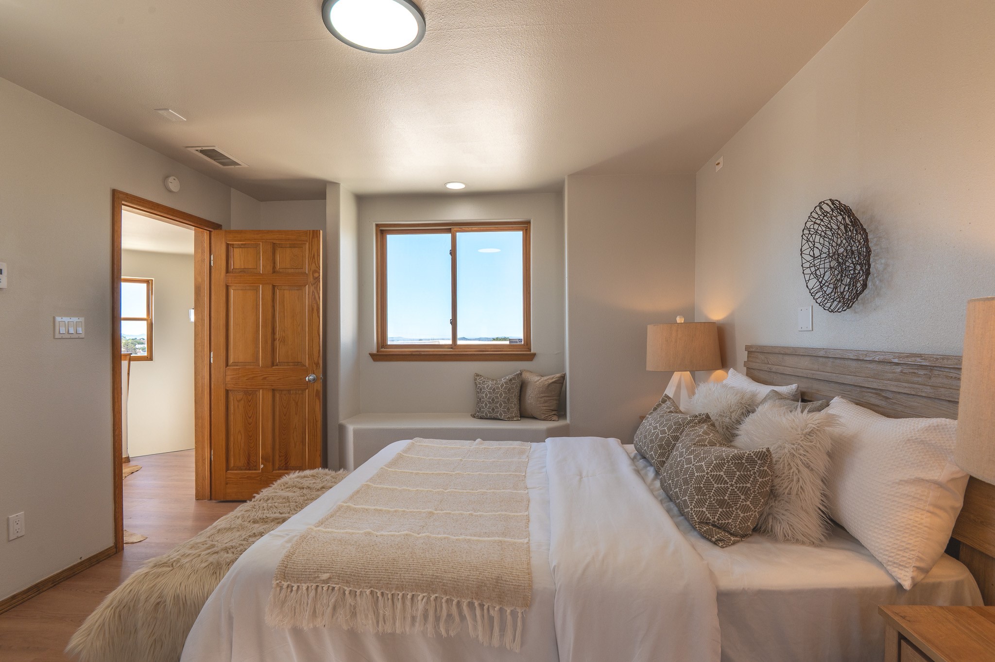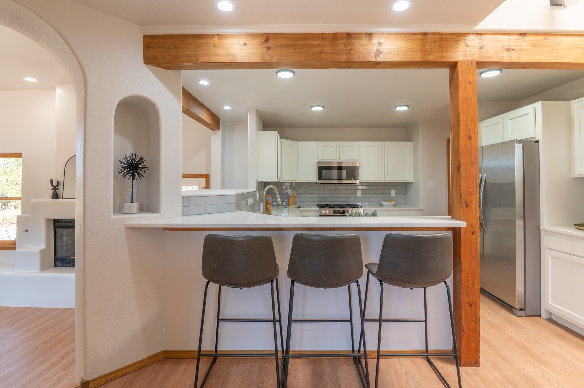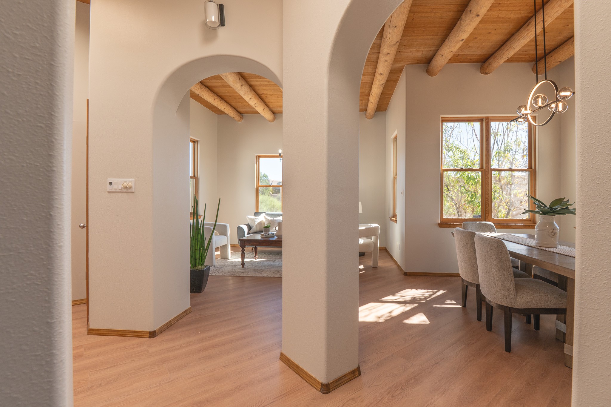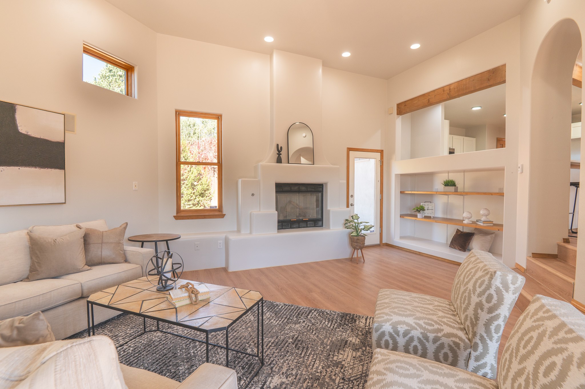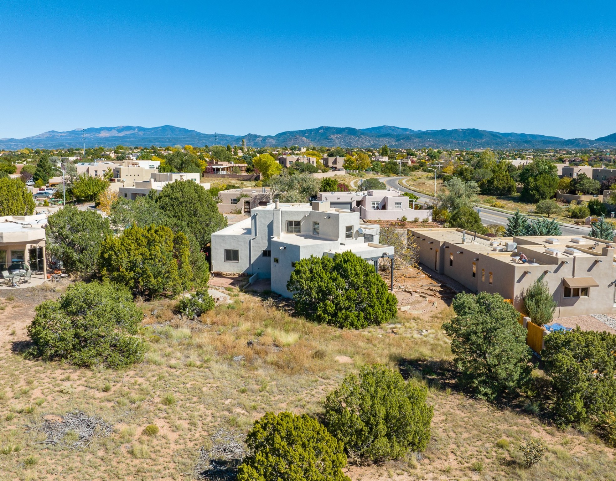 This is the house where you actually live the great Santa Fe life effortlessly. Nestled on a quarter acre of beautiful land, it's been completely updated so you don't spend weekends dealing with a contractor. This generous 2,200 sq ft, adobe-style home just got a serious glow up. We're talking newly installed TPO roof, fresh interior paint, and gorgeous newly installed LVP flooring all done. The place feels legitimately new, running on a newly installed evaporative cooling unit, plus, lovely newly installed light fixtures throughout the entire home. The main level is the ultimate hang out zone, offering three distinct living spaces for any mood. The chef's kitchen (newly installed granite, cabinets, and appliances) anchorsthe flow between the open Living and Dining areas, which feature amazing rounded Vigas and classic ceilings, perfect for hosting. Need a quiet retreat? There's a large great room with soaring ceilings and beautiful fireplace for cozy winter nights. Two flexible bedrooms and a full bath are conveniently located on this main level, along with a huge laundry room with tons of storage and counter space.Upstairs is the Primary Suite, your luxurious private retreat. It features a spacious walk in closet, a newly remodeled and updated spa-worthy en suite bath, and a private deck on this level for morning coffee under the New Mexico sky.The outside is a peaceful haven. Your backyard is perfect for relaxing, under the covered patio.An oversized two-car garage with workspace ensures this home combines classic Santa Fe style with zero compromises on convenience. All the big, annoying projects are done.Come see the home that lets you stop working on your house, and start living in it.
