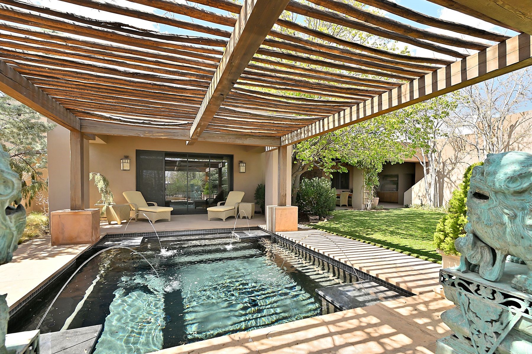 In the rugged reaches of exclusive Las Campanas this secluded estate--a sophisticated home and guesthouse--was custom-designed and -built amid blossoming trees, aspens, and stalwart evergreens. The residence is a bastion of color and volume featuring three luxuriously restful bedroom suites, formal living and dining rooms, a vast cook's kitchen with a wet bar and a family room, an inviting guesthouse with a full kitchen and bath, and painstakingly landscaped grounds. Vibrantly colored polished plaster walls combine with soaring ceilings, wide windows, multiple fireplaces, a collection of portales, a roof deck, and a swimming pool shaded by a pergola to create an ideal setting for grand entertaining, a haven crafted for the appreciation of the outdoors, and the perfect venue for the display of art. Surrounding the home are natural greenery, carefully chosen landscaping, sculpture gardens, water features, and a water-wise artificial turf lawn.