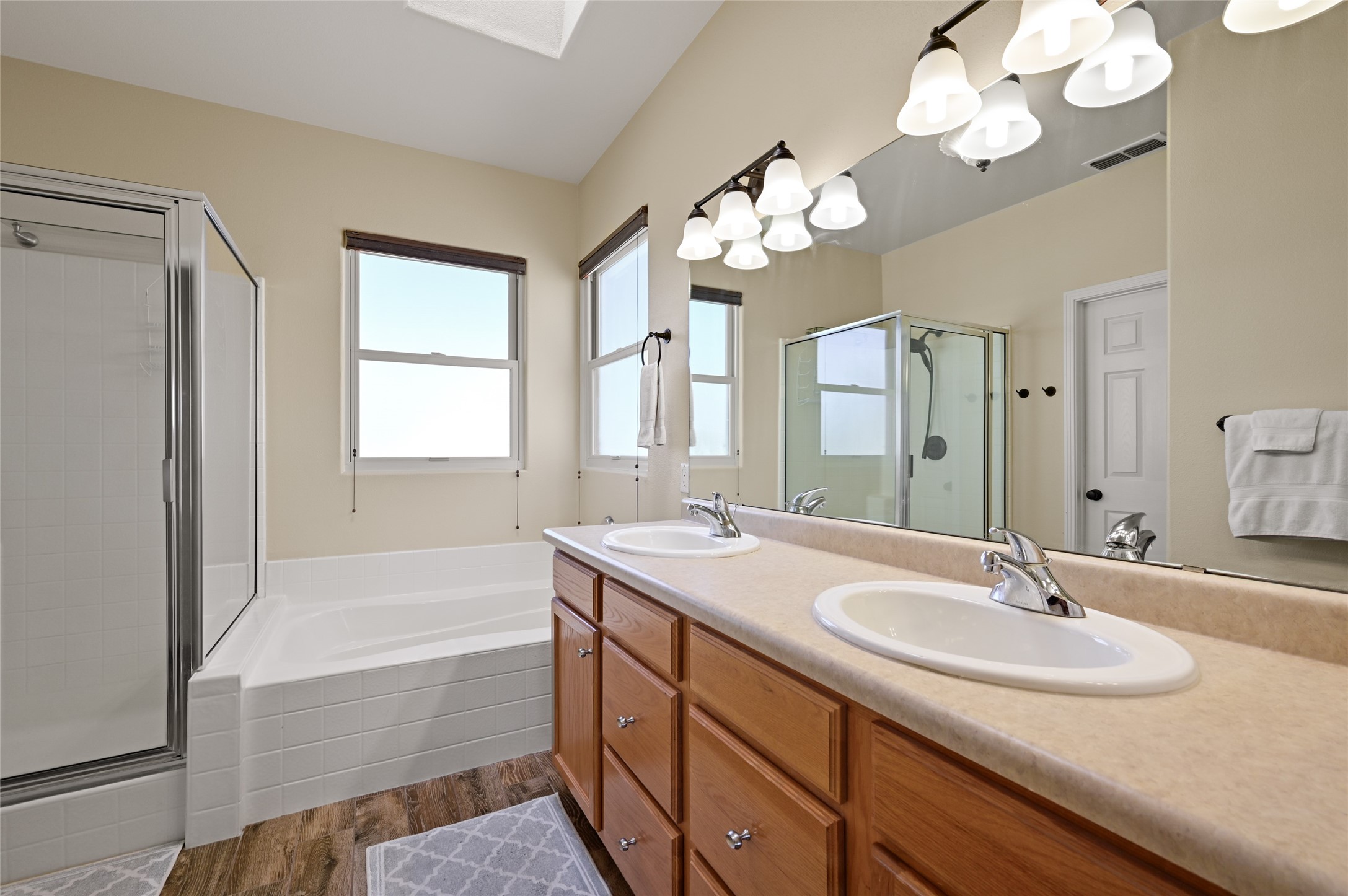 Welcome to your new home! This well-maintained 5-bedroom home offers lots of space with a practical and flexible floor plan. The main living area is inviting with an open concept kitchen and den area with a cozy fireplace and access to the backyard with portal. The easy to maintain, fully fenced backyard is perfect for entertaining and outdoor grilling. There is a bonus room that makes an ideal bedroom or office. Upstairs is the generously sized primary bedroom with an outdoor deck, an ensuite bathroom that includes dual sinks, a large tub, separate shower, and a walk-in closet. There are 3 additional bedrooms upstairs. Additional highlights are oversized 2 car garage, new windows in 2022 and a new roof substrate in 2023 with approximately 7 1/2 years remaining on the transferrable limited warranty that includes yearly maintenance and a new water heater in 2025. Really, you need to see this home.