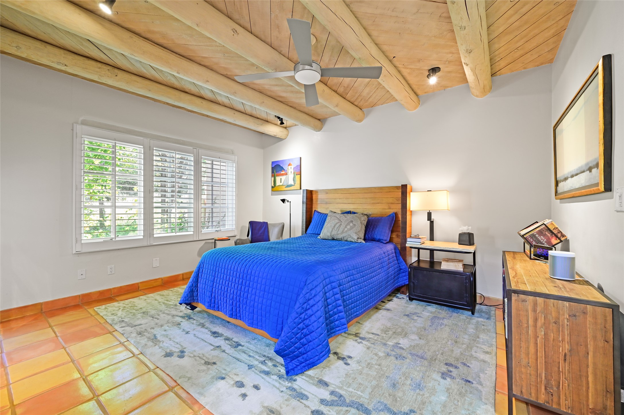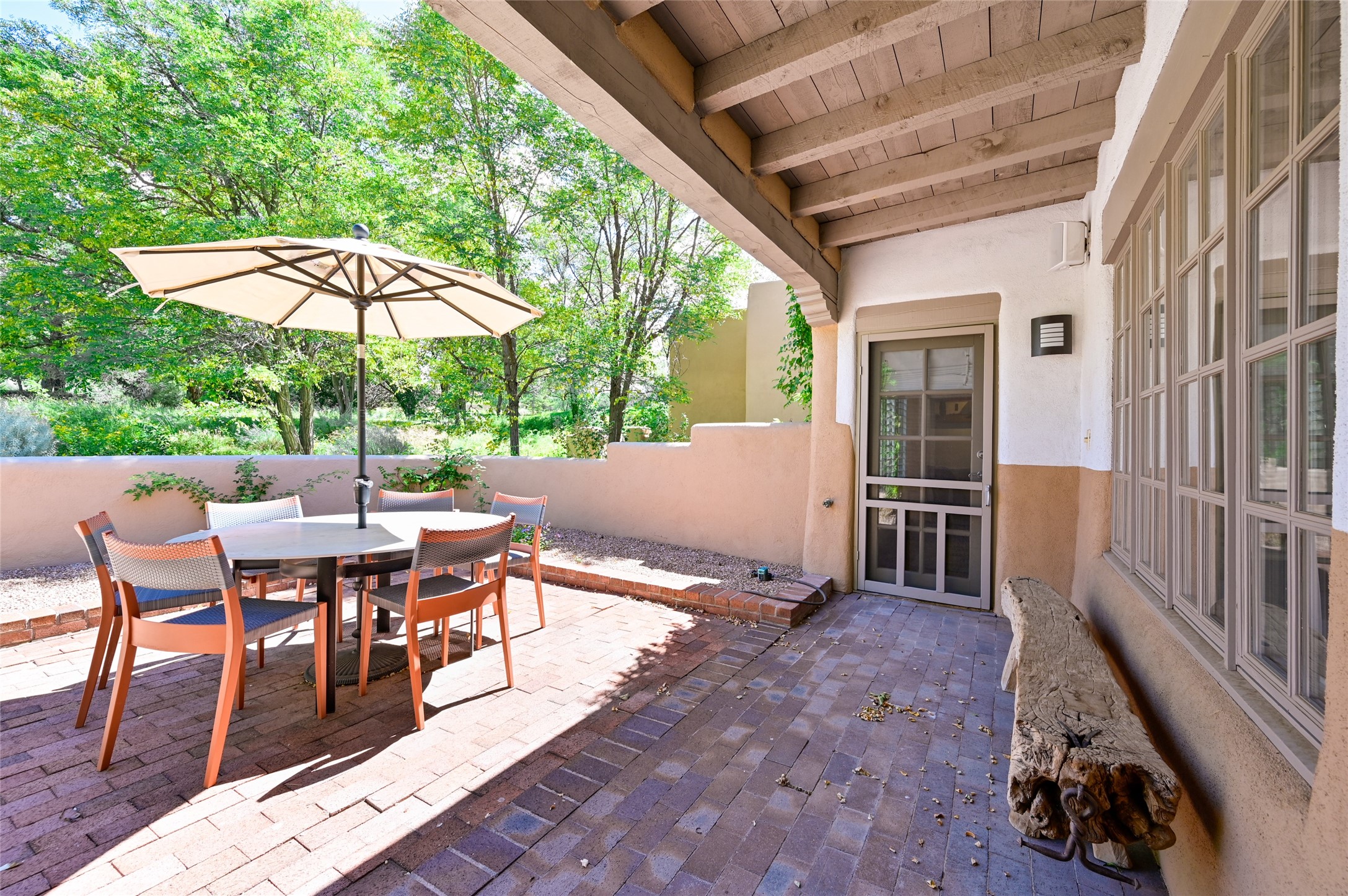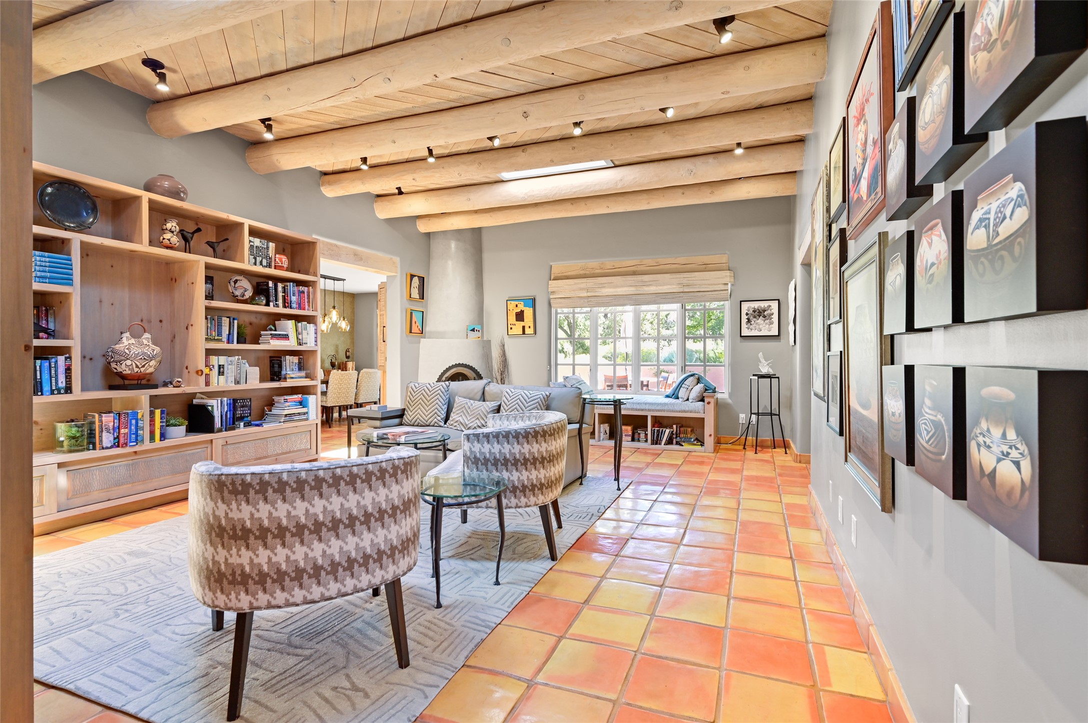 A rare opportunity to own the sought-after Casita floor plan in the Quail Run community! Enter through the gated courtyard, where a gentle water feature, lush landscaping, and a covered seating area create an immediate sense of welcome.Inside, you'll find two bedrooms, two baths, classic Vigas, Saltillo tile floors, and a traditional Kiva fireplace that sets a warm, authentic Santa Fe tone. Skylights fill the home with natural light, and the single-level, no-steps layout enhances comfort and ease of living.The spacious living room features beautifully handcrafted wood built-ins and ample wall space for art. The kitchen includes updated granite counters, a stylish backsplash, stainless steel appliances, a gas stove, and generous cabinetry with copper edging for both storage and character.The primary suite is its own private retreat, offering a custom barn door, window shutters, and access to the back courtyard. The updated adjoining bath features a nicely sized closet and a large vanity. The dining room opens onto a back patio overlooking wide-open green space, with brick detailing, vigas, lush landscaping, and charming corbels -- a private sanctuary for relaxing or entertaining.A spacious two-car garage provides additional storage and convenience.Ownership at Quail Run includes exceptional amenities: 24-hour hosted security, state-of-the-art fitness facilities, a swimming pool, golf, pickleball, fitness classes, social events, and an on-site restaurant. Come see why this special home at Quail Run offers the perfect blend of Santa Fe style and resort-style living.