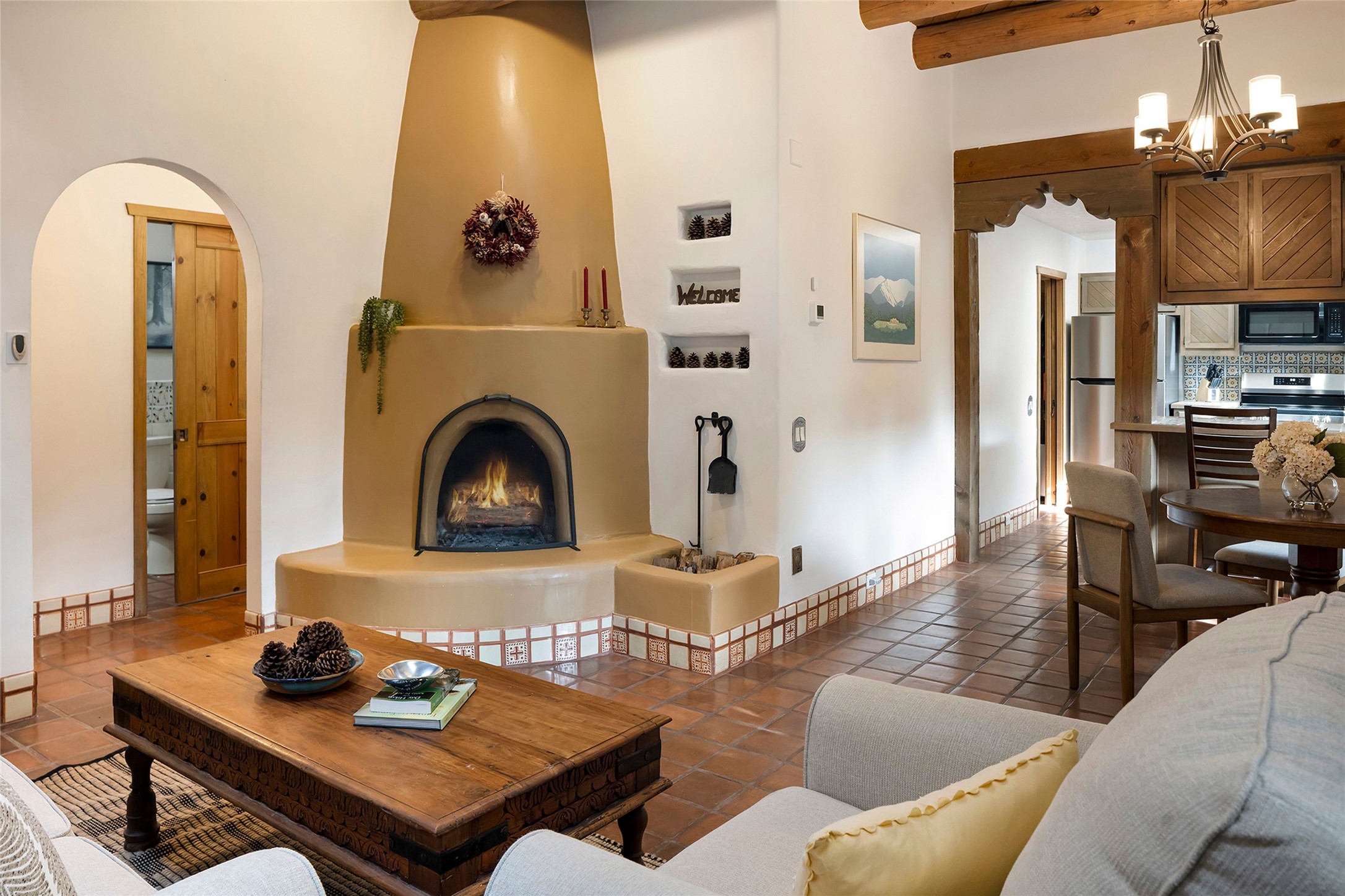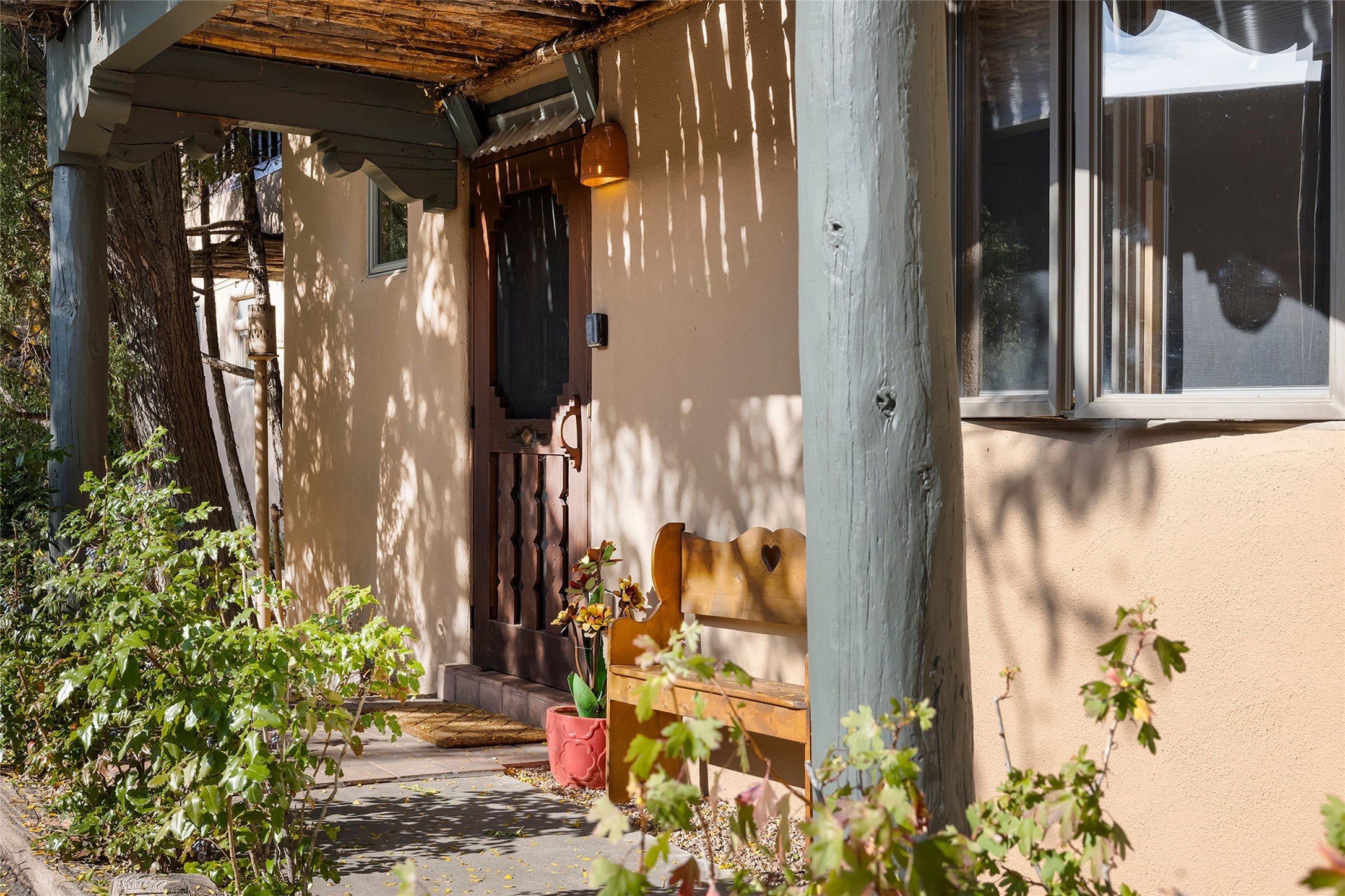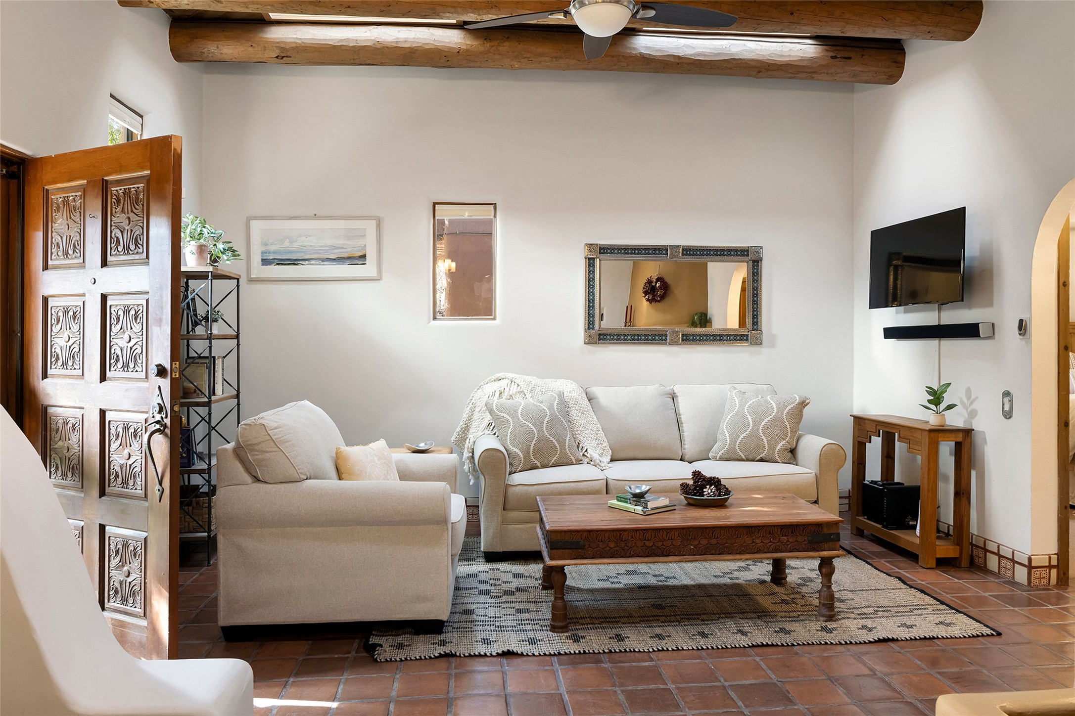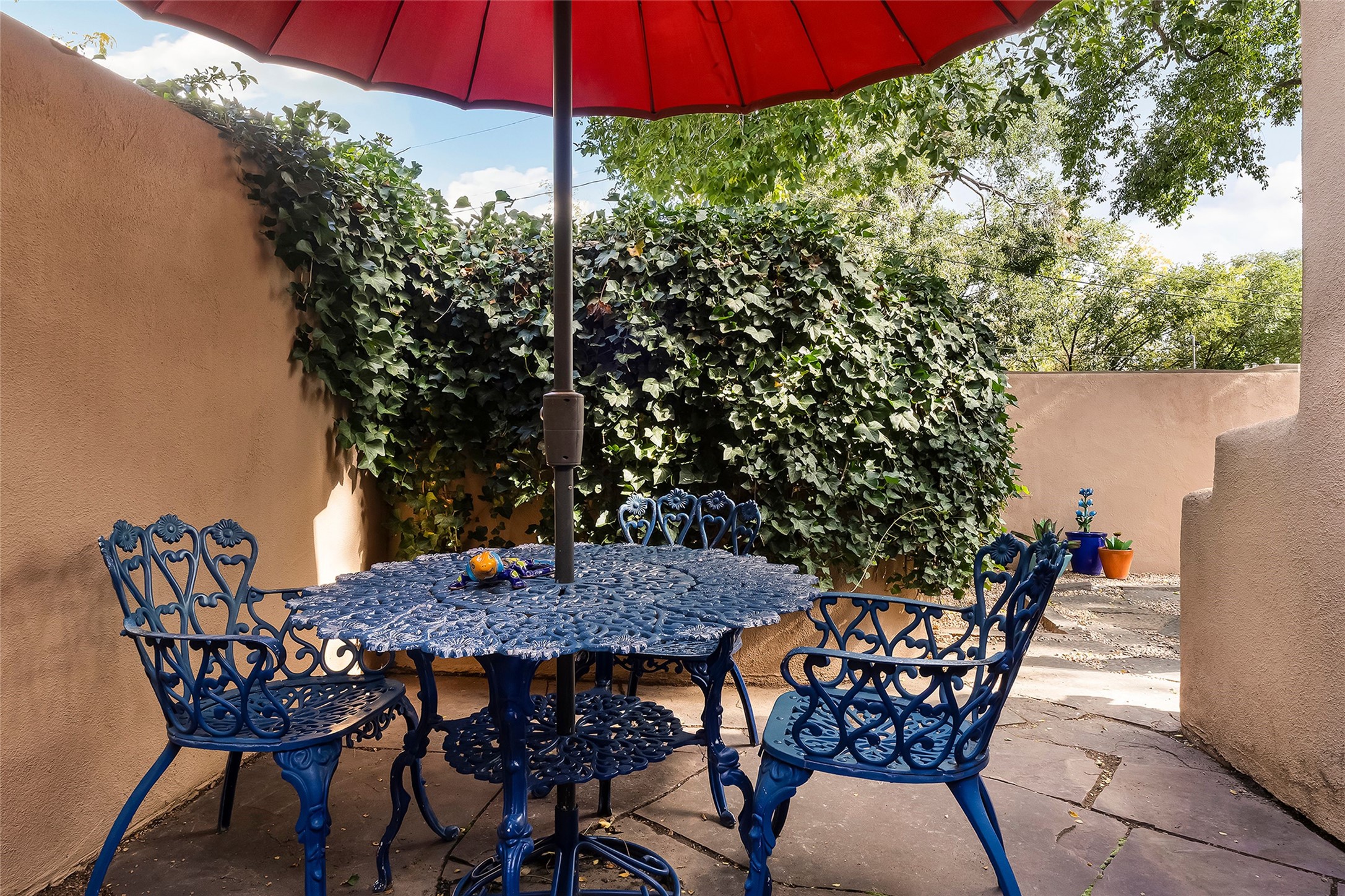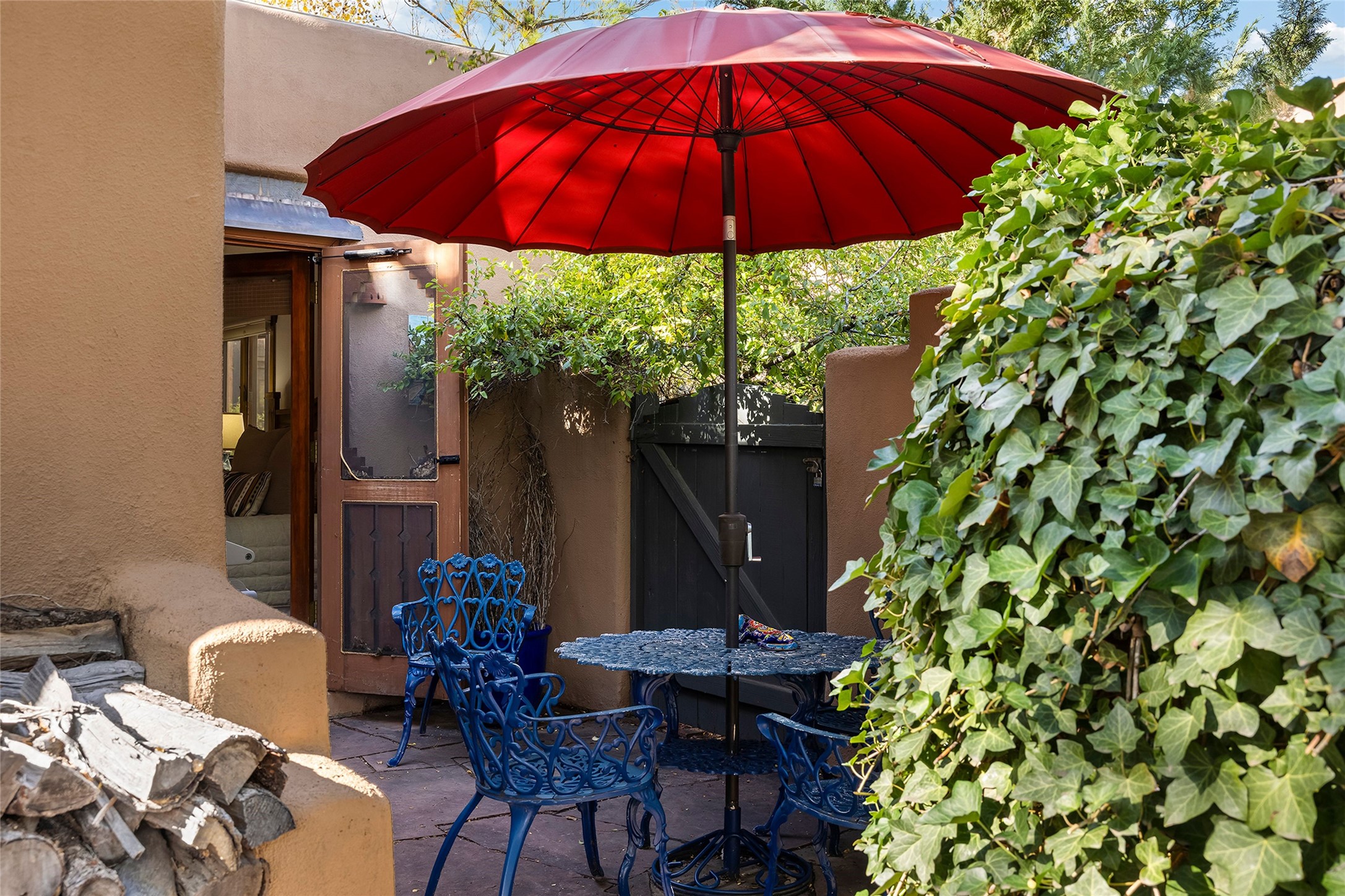 In-town Santa Fe living at its best!Rare single-level, 2-bedroom, 2-bath Santa Fe-style condo in the highly sought-after Griffin Park Condo community--just a few blocks from the Plaza. This charming home features classic Santa Fe details including a front portal with Latillas, Vigas, Saltillo tile floors and two Kiva wood burning fireplaces. In September 2025, the seller added a built in wine refrigerator and a stainless steel Frigidaire appliance package that included a stove, refrigerator and dishwasher. The kitchen has a bar seating and the pantry/laundry room connects directly to the attached single car garage for easy access and extra storage. The spacious primary suite offers a large closet and its own fireplace with French doors that open to the private courtyard under a canopy of trees. Modern comforts include central heating and air, tankless water heater and full-size washer and dryer. HOA covers water, sewer, trash, roof, stucco, and exterior landscaping. Quiet end-unit location on a peaceful street--ideal as a primary residence, pied--terre, or investment.