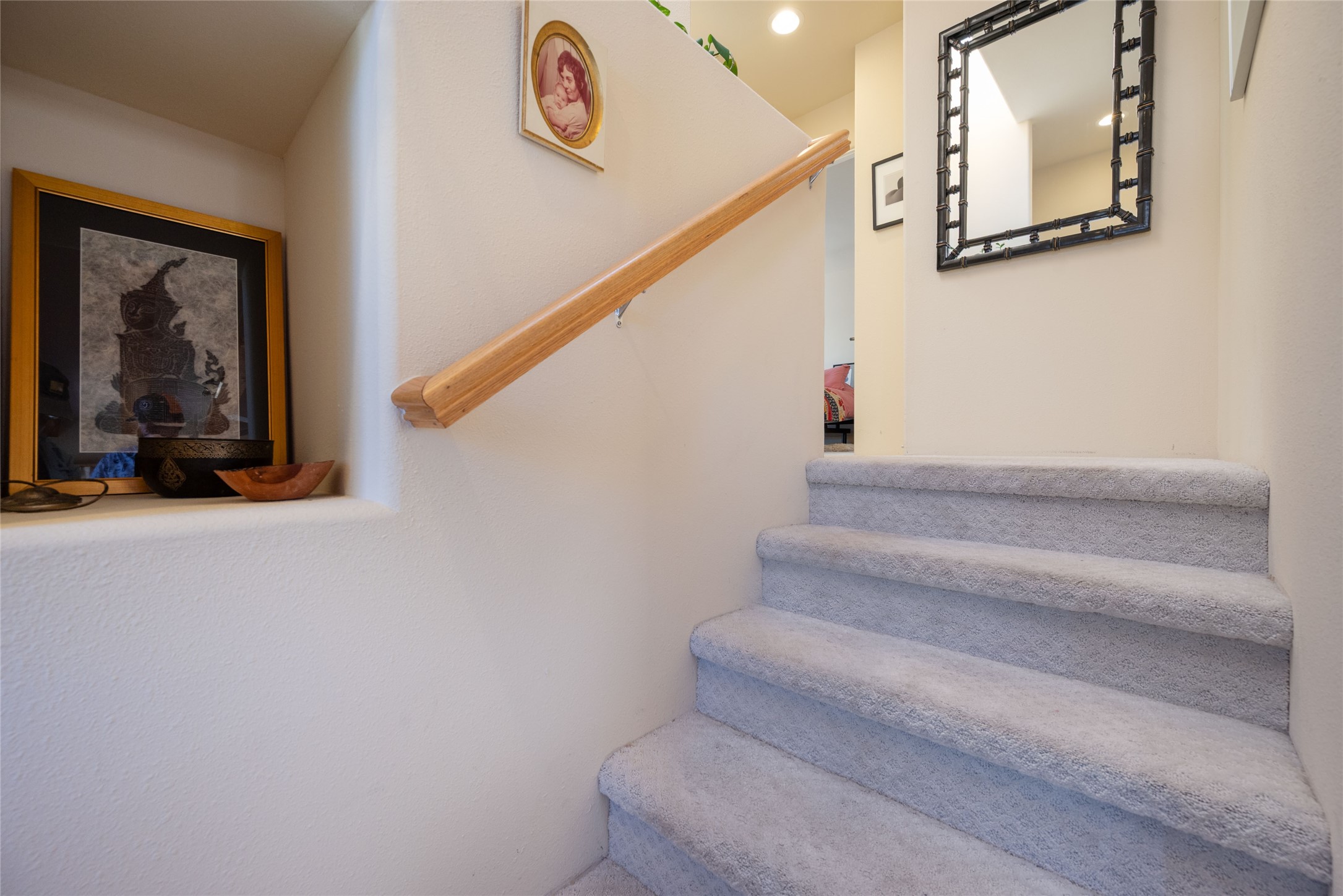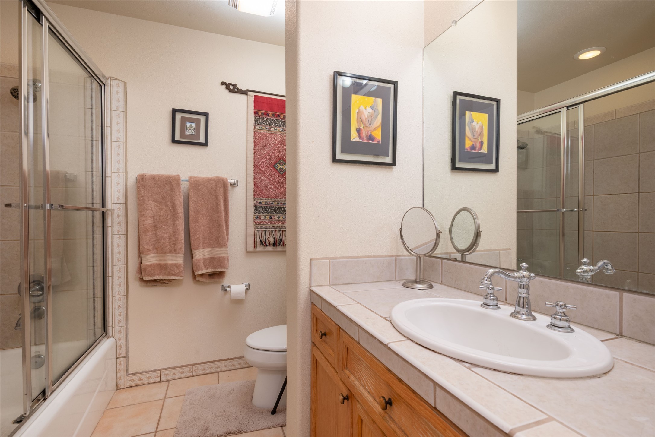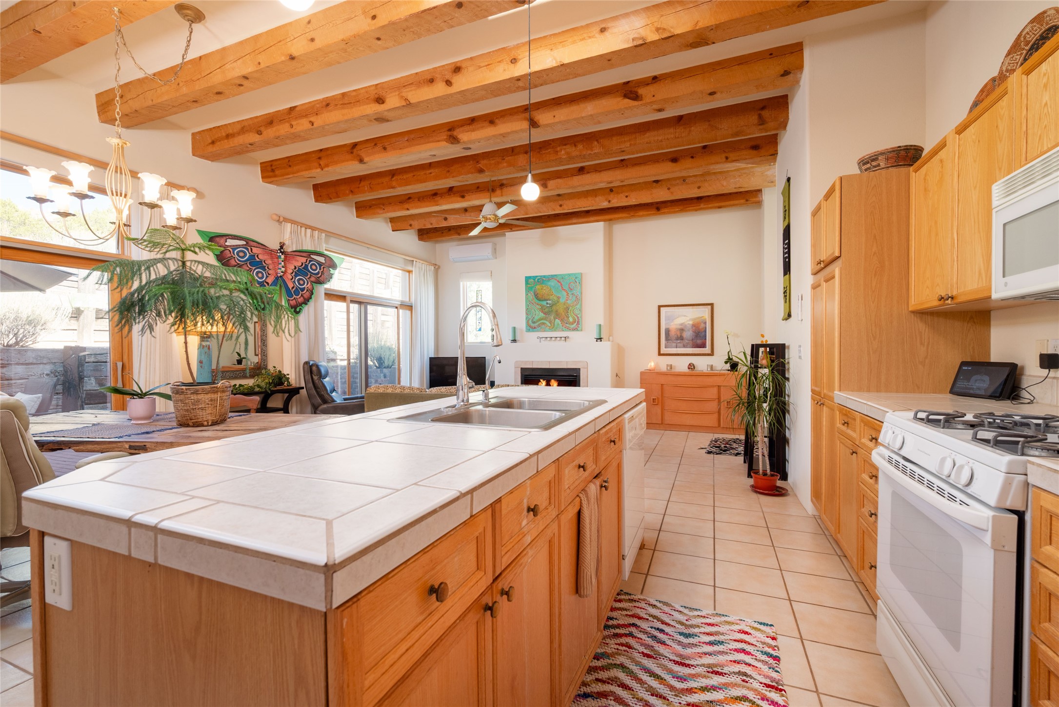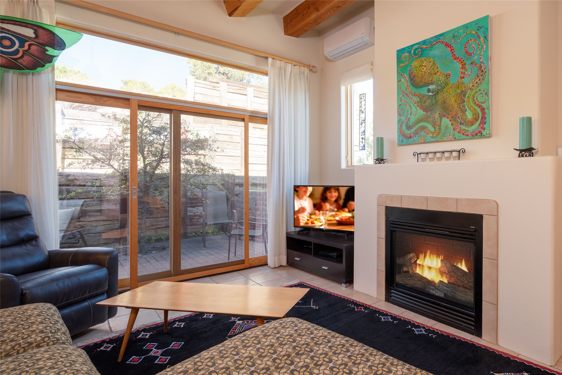 Minutes to De Vargas Mall, Down Town Plaza and Highway 285/84 .This light filled Townhome with spectacular views has it all. The open Living area features Cathedral ceilings, vigas, fireplace and walk out to private courtyard..The radiant floor heating is enhanced with refrigerated ductless A/C heat splits in living room and both upstairs bedrooms. Each Bedroom features en suite baths and the primary bedroom has its own balcony and walk in closet. Other features include skylights, nichos, and parking for guests .. Furniture for sale separately...Don't forget the oversized 2 car garage which offers extra storage space !!