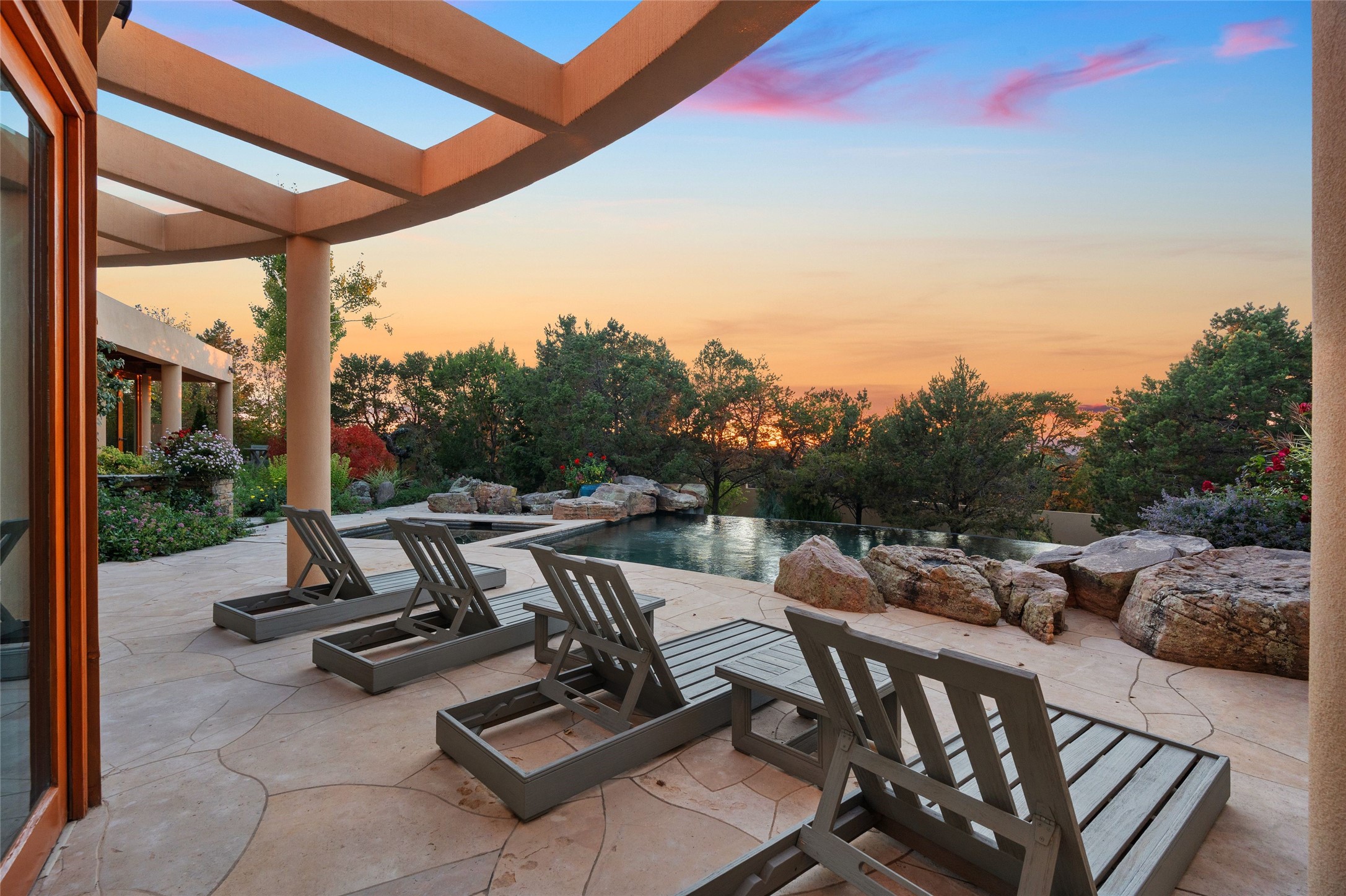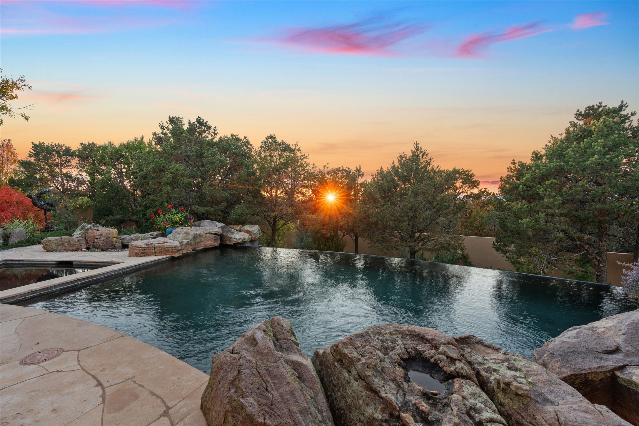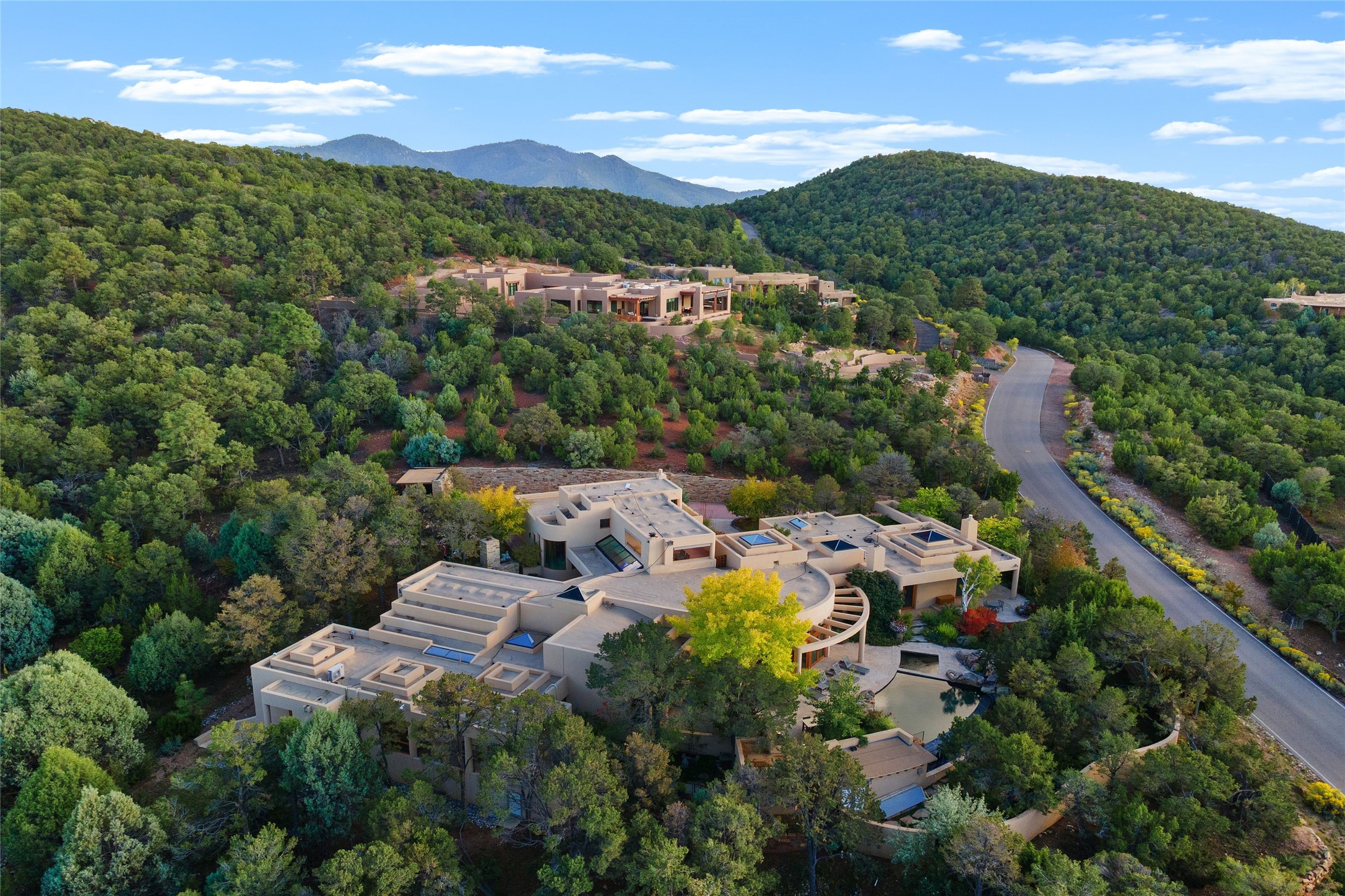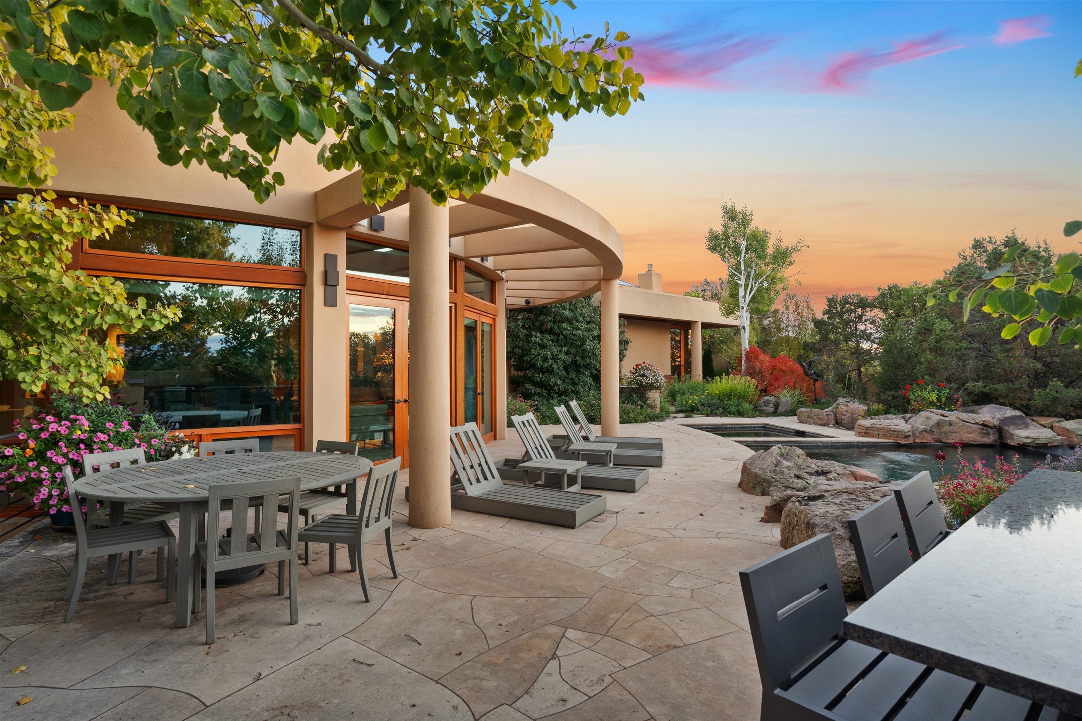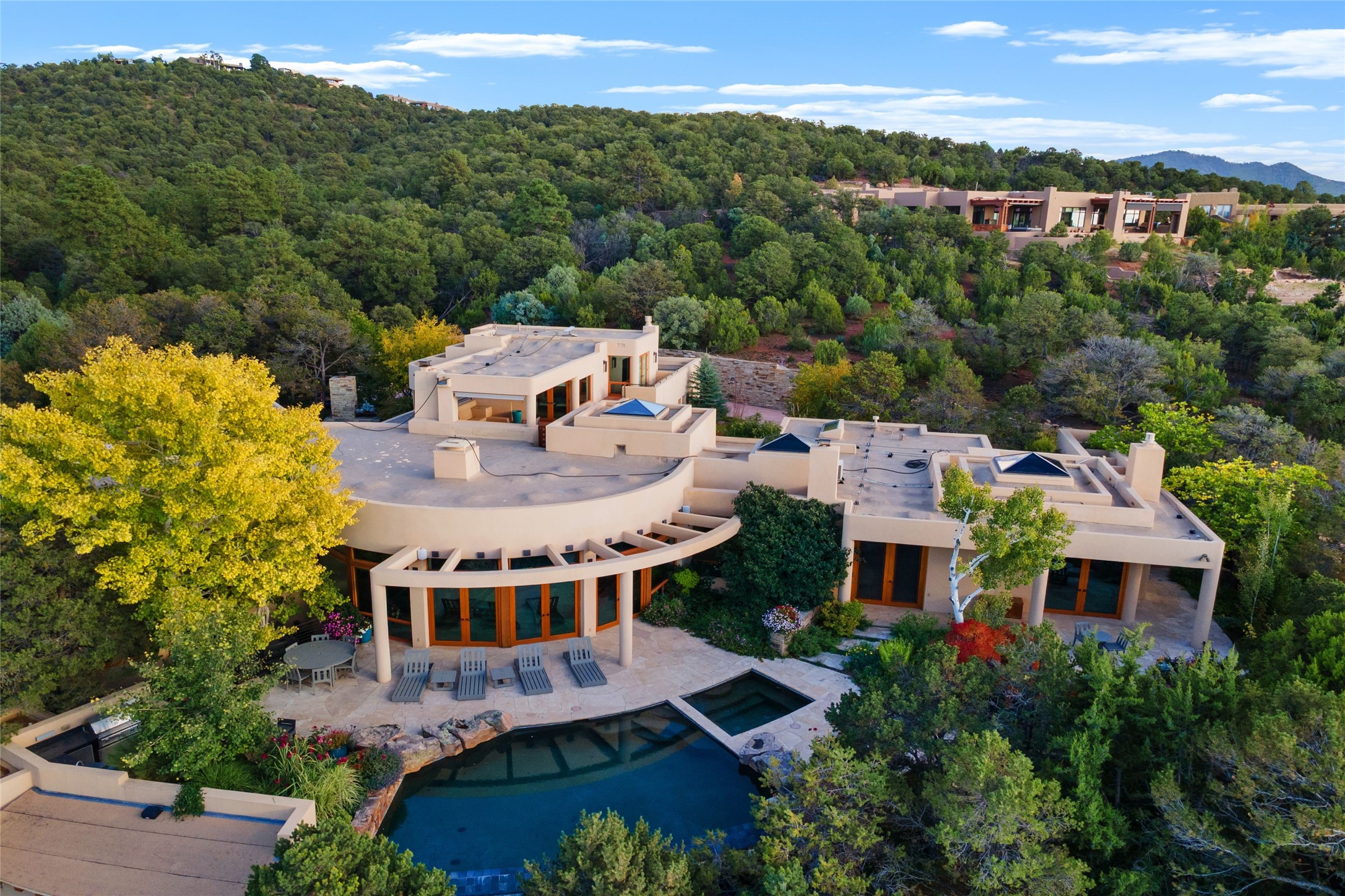 A Rare Masterpiece in Sierra del Norte! Welcome to 1056 Sierra del Norte--an architectural triumph and one of Santa Fe's most extraordinary residences! This estate offers breathtaking panoramic views and unmatched privacy from the moment you pass through the gated entrance. The heated driveway, stacked stone retaining walls, full-capacity generator, and an oversized four-car garage set the tone for the exceptional quality of this one-of-a-kind residence. Inside, grand entertaining spaces flow effortlessly around a world-class chef's kitchen, where top-tier appliances and exquisite finishes inspire culinary creativity. The design and craftsmanship throughout the home are truly unparalleled, with amazing custom details and impressive execution of unique design elements throughout. The expansive living room and formal dining area are anchored by a stunning natural stacked-stone gas fireplace, creating warmth and elegance. Enjoy evenings in the spacious media room, unwind at the custom bar, or challenge friends to Pool or Darts in the dedicated game room. Upstairs, a versatile studio space--perfect as a fifth bedroom--features a sitting room, bath, and access to a private viewing deck. Step outside to discover a sanctuary of lush, mature landscaping, multiple covered portals and patios, and a high-end outdoor kitchen ideal for alfresco dining. The infinity-edge pool and hot tub, complemented by a newly-built pool bath house, offer resort quality relaxation at your own property. The primary suite is a retreat unto itself, with a cozy library, a grand sleeping room, two fireplaces, a spa-inspired bath, and a magnificent walk-in closet. Each guest bedroom is a private suite, thoughtfully separated for lavish comfort and complete tranquility. This is more than a home--it's a lifestyle! With room to grow and views that inspire, 1056 Sierra del Norte is a rare opportunity to own a piece of Santa Fe paradise! Included with the home is a vacant, unimproved adjacent lot, offering rare potential for future expansion or permanent open space.