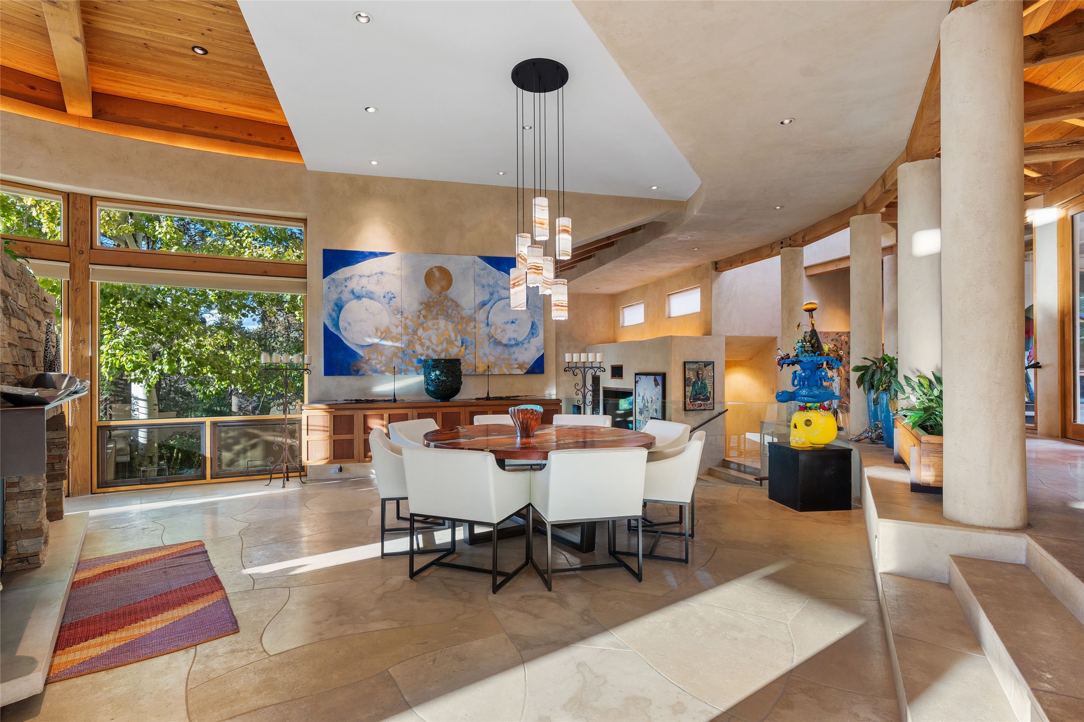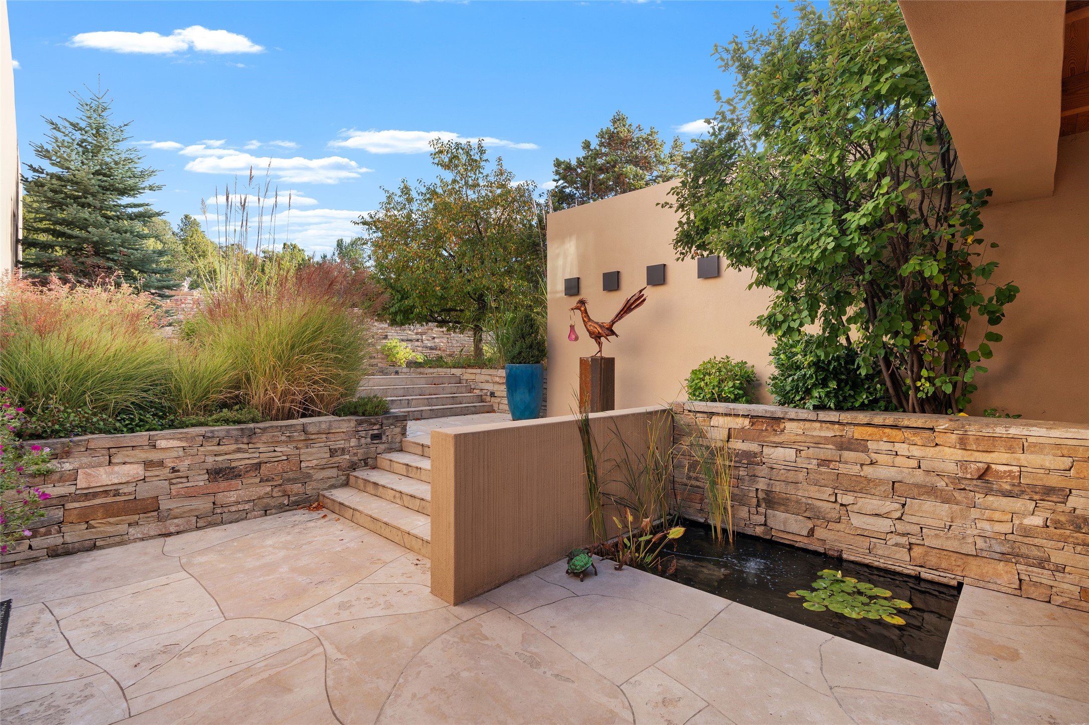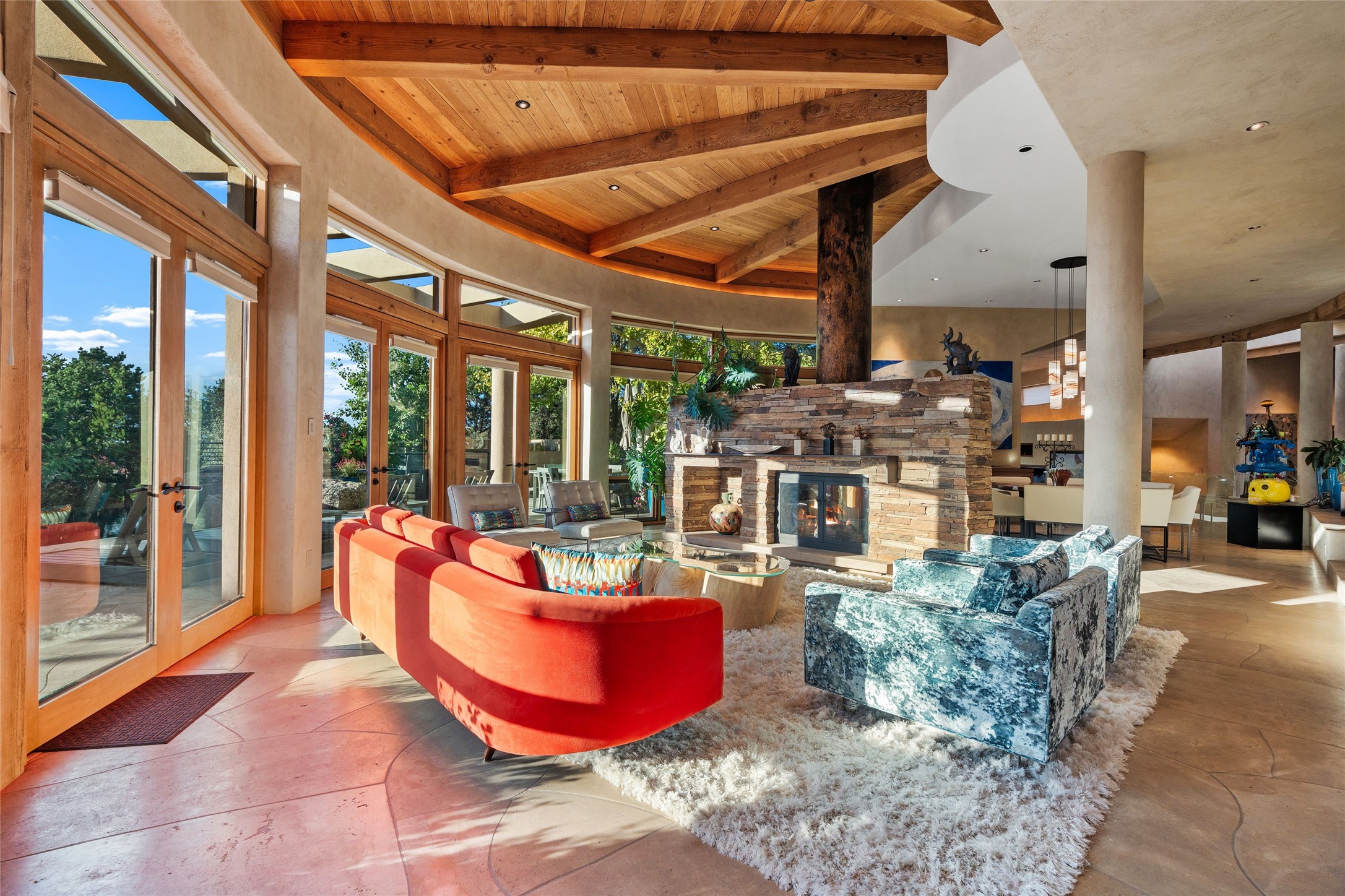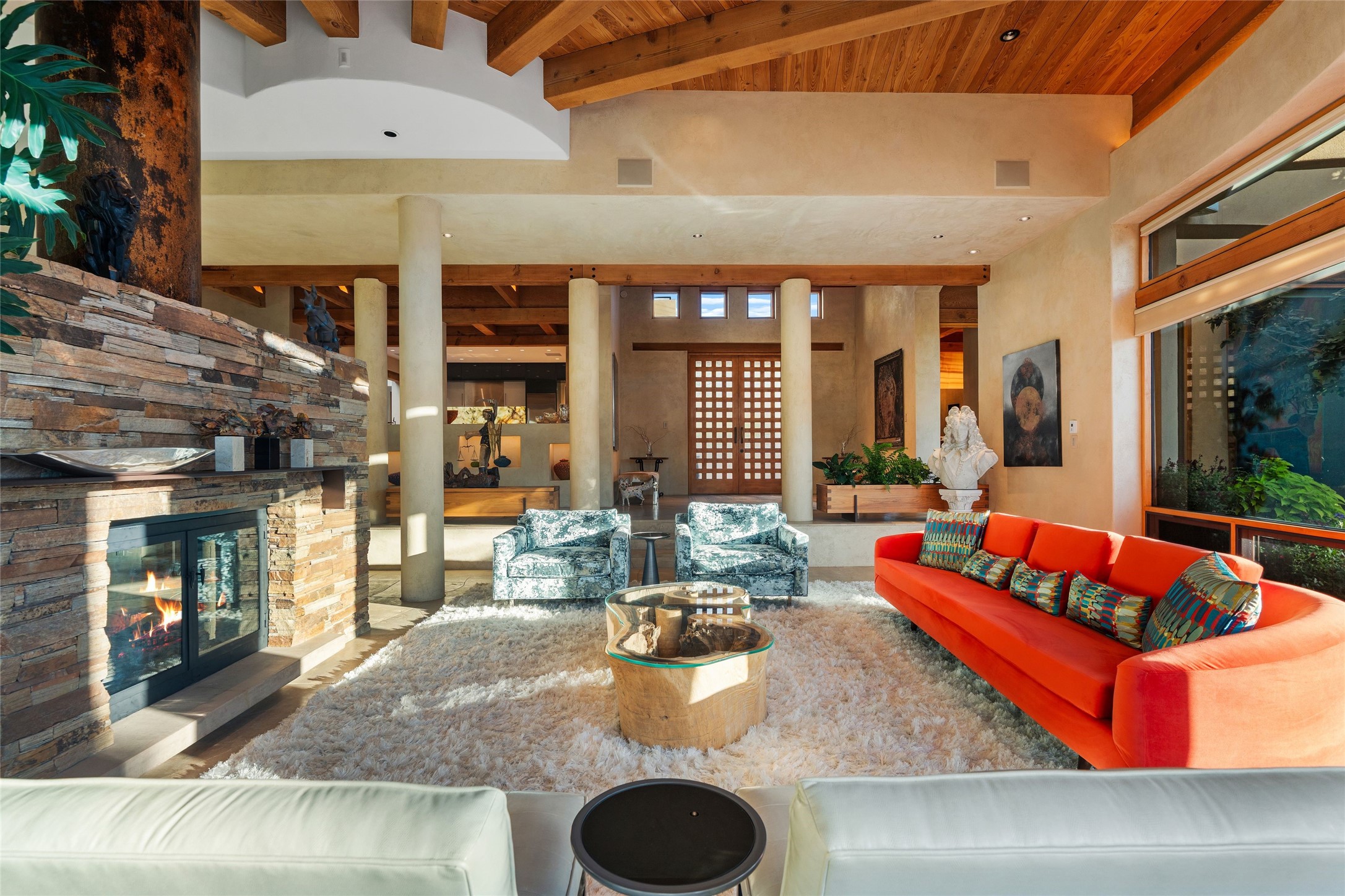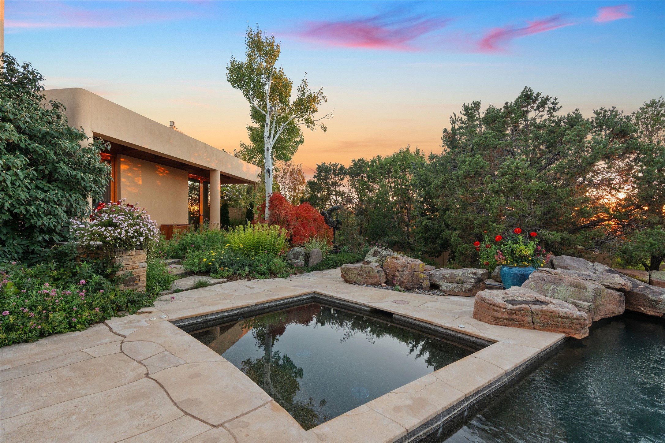 A Rare Masterpiece in Sierra del Norte! Welcome to 1056 Sierra del Norte--an architectural triumph and one of Santa Fe's most extraordinary residences! This estate offers breathtaking panoramic views and unmatched privacy from the moment you pass through the gated entrance. The heated driveway, stacked stone retaining walls, full-capacity generator, and an oversized four-car garage set the tone for the exceptional quality of this one-of-a-kind residence. Inside, grand entertaining spaces flow effortlessly around a world-class chef's kitchen, where top-tier appliances and exquisite finishes inspire culinary creativity. The design and craftsmanship throughout the home are truly unparalleled, with amazing custom details and impressive execution of unique design elements throughout. The expansive living room and formal dining area are anchored by a stunning natural stacked-stone gas fireplace, creating warmth and elegance. Enjoy evenings in the spacious media room, unwind at the custom bar, or challenge friends to Pool or Darts in the dedicated game room. Upstairs, a versatile studio space--perfect as a fifth bedroom--features a sitting room, bath, and access to a private viewing deck. Step outside to discover a sanctuary of lush, mature landscaping, multiple covered portals and patios, and a high-end outdoor kitchen ideal for alfresco dining. The infinity-edge pool and hot tub, complemented by a newly-built pool bath house, offer resort quality relaxation at your own property. The primary suite is a retreat unto itself, with a cozy library, a grand sleeping room, two fireplaces, a spa-inspired bath, and a magnificent walk-in closet. Each guest bedroom is a private suite, thoughtfully separated for lavish comfort and complete tranquility. This is more than a home--it's a lifestyle! With room to grow and views that inspire, 1056 Sierra del Norte is a rare opportunity to own a piece of Santa Fe paradise! Included with the home is a vacant, unimproved adjacent lot, offering rare potential for future expansion or permanent open space.