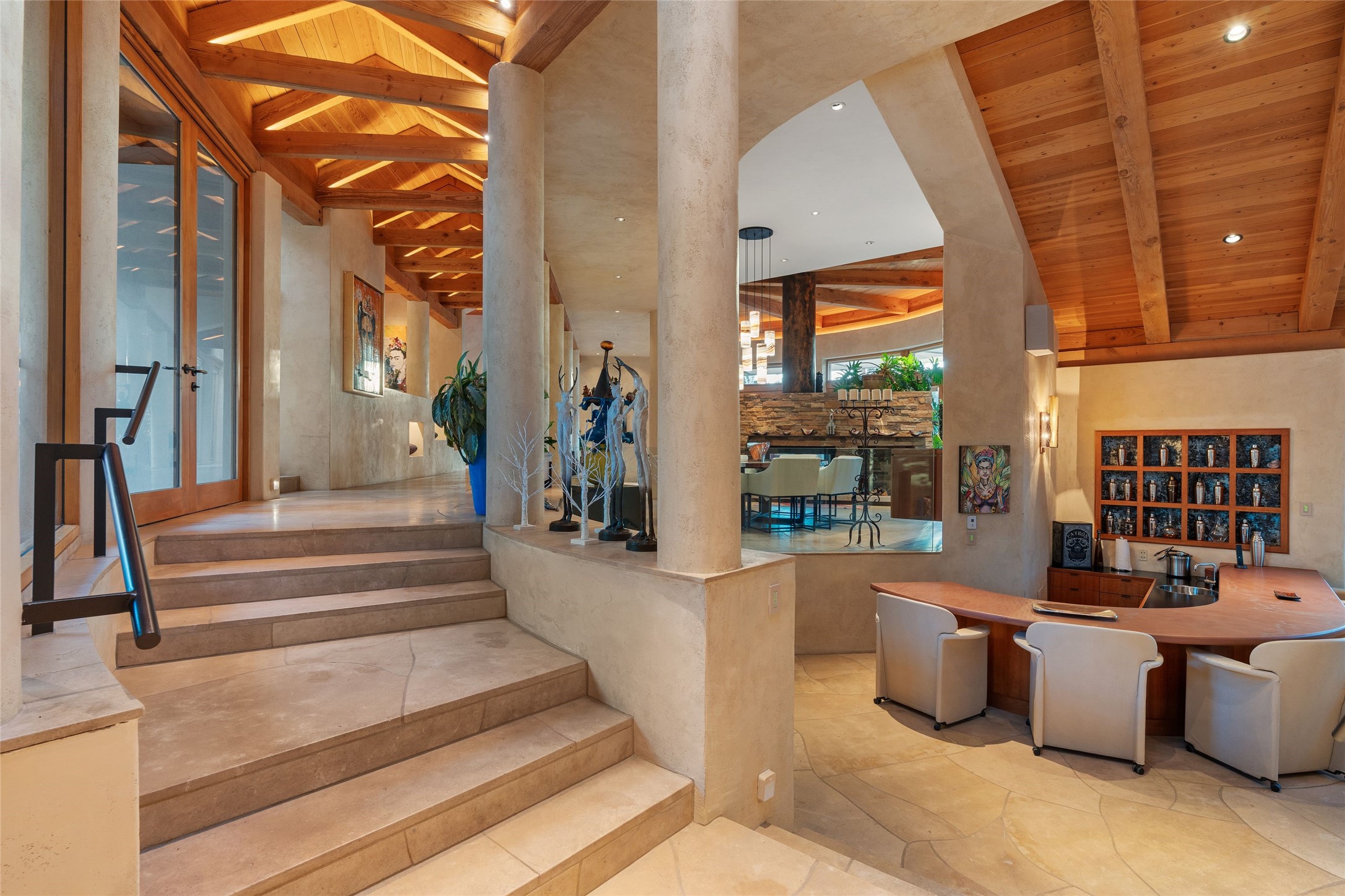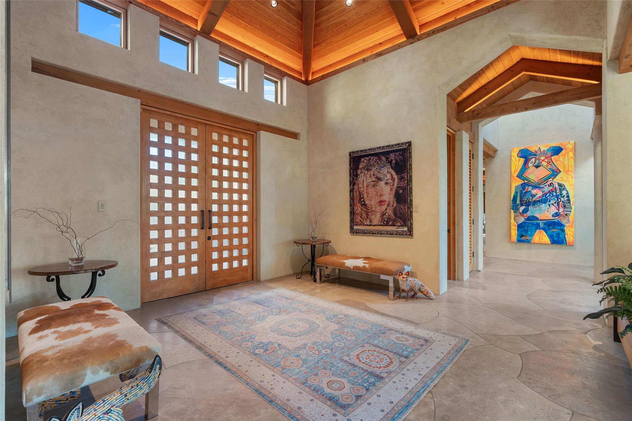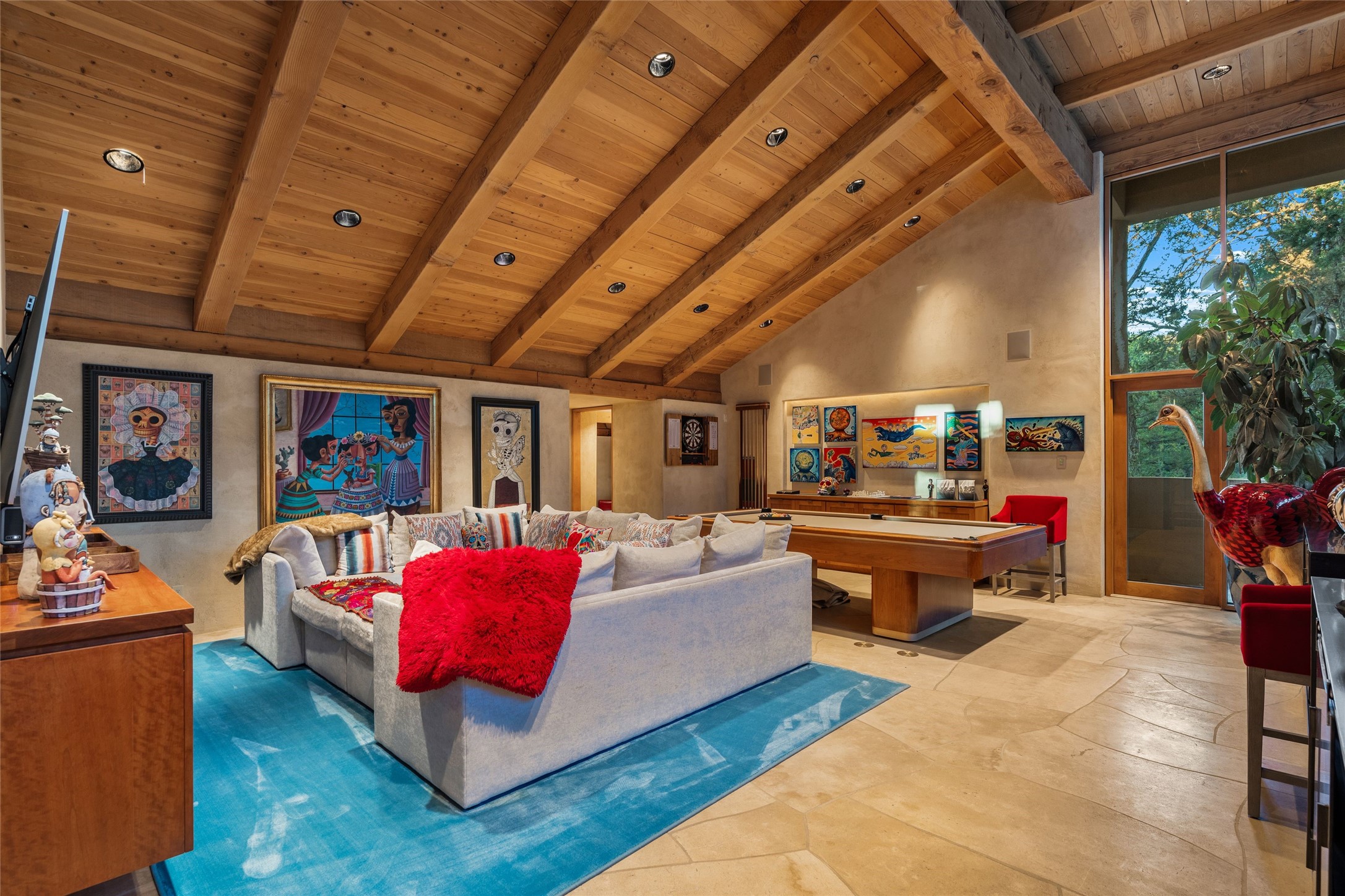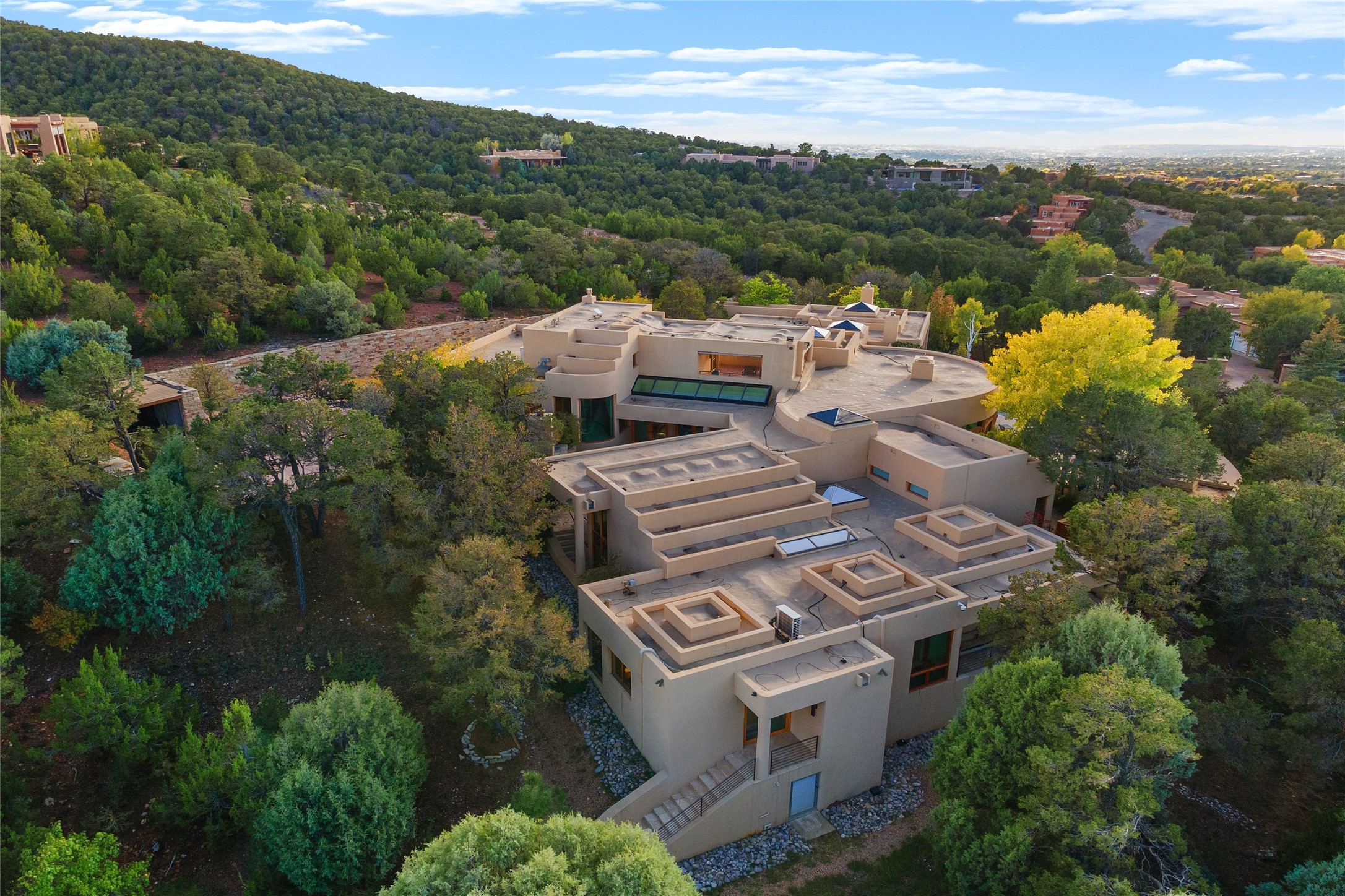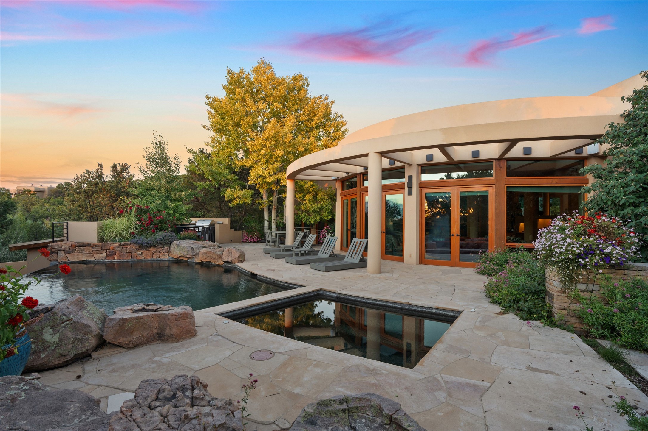 A Rare Masterpiece in Sierra del Norte! Welcome to 1056 Sierra del Norte--an architectural triumph and one of Santa Fe's most extraordinary residences! This estate offers breathtaking panoramic views and unmatched privacy from the moment you pass through the gated entrance. The heated driveway, stacked stone retaining walls, full-capacity generator, and an oversized four-car garage set the tone for the exceptional quality of this one-of-a-kind residence. Inside, grand entertaining spaces flow effortlessly around a world-class chef's kitchen, where top-tier appliances and exquisite finishes inspire culinary creativity. The design and craftsmanship throughout the home are truly unparalleled, with amazing custom details and impressive execution of unique design elements throughout. The expansive living room and formal dining area are anchored by a stunning natural stacked-stone gas fireplace, creating warmth and elegance. Enjoy evenings in the spacious media room, unwind at the custom bar, or challenge friends to Pool or Darts in the dedicated game room. Upstairs, a versatile studio space--perfect as a fifth bedroom--features a sitting room, bath, and access to a private viewing deck. Step outside to discover a sanctuary of lush, mature landscaping, multiple covered portals and patios, and a high-end outdoor kitchen ideal for alfresco dining. The infinity-edge pool and hot tub, complemented by a newly-built pool bath house, offer resort quality relaxation at your own property. The primary suite is a retreat unto itself, with a cozy library, a grand sleeping room, two fireplaces, a spa-inspired bath, and a magnificent walk-in closet. Each guest bedroom is a private suite, thoughtfully separated for lavish comfort and complete tranquility. This is more than a home--it's a lifestyle! With room to grow and views that inspire, 1056 Sierra del Norte is a rare opportunity to own a piece of Santa Fe paradise! Included with the home is a vacant, unimproved adjacent lot, offering rare potential for future expansion or permanent open space.