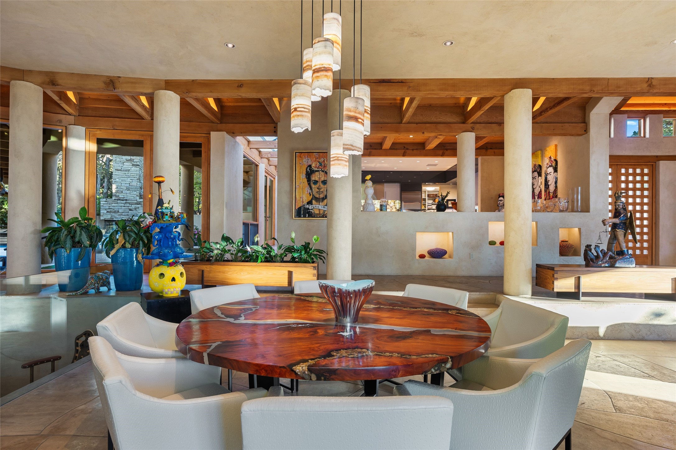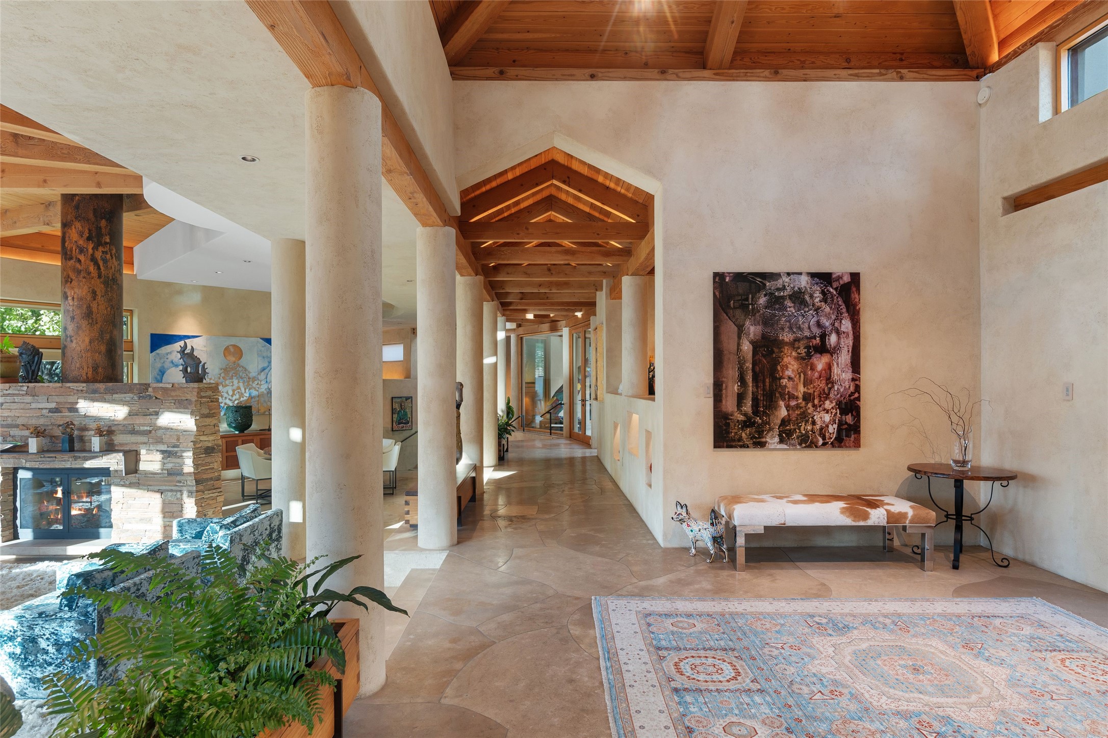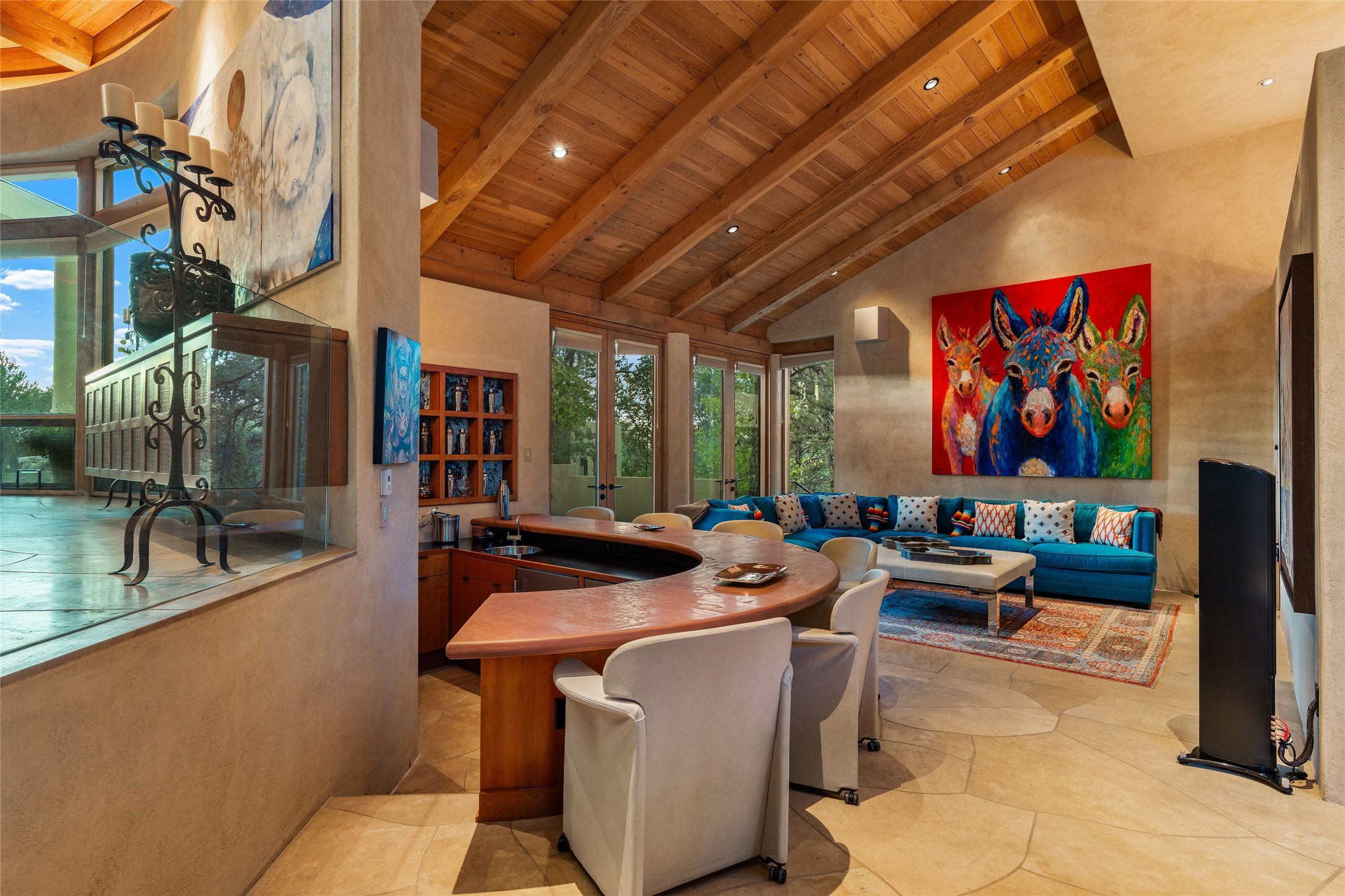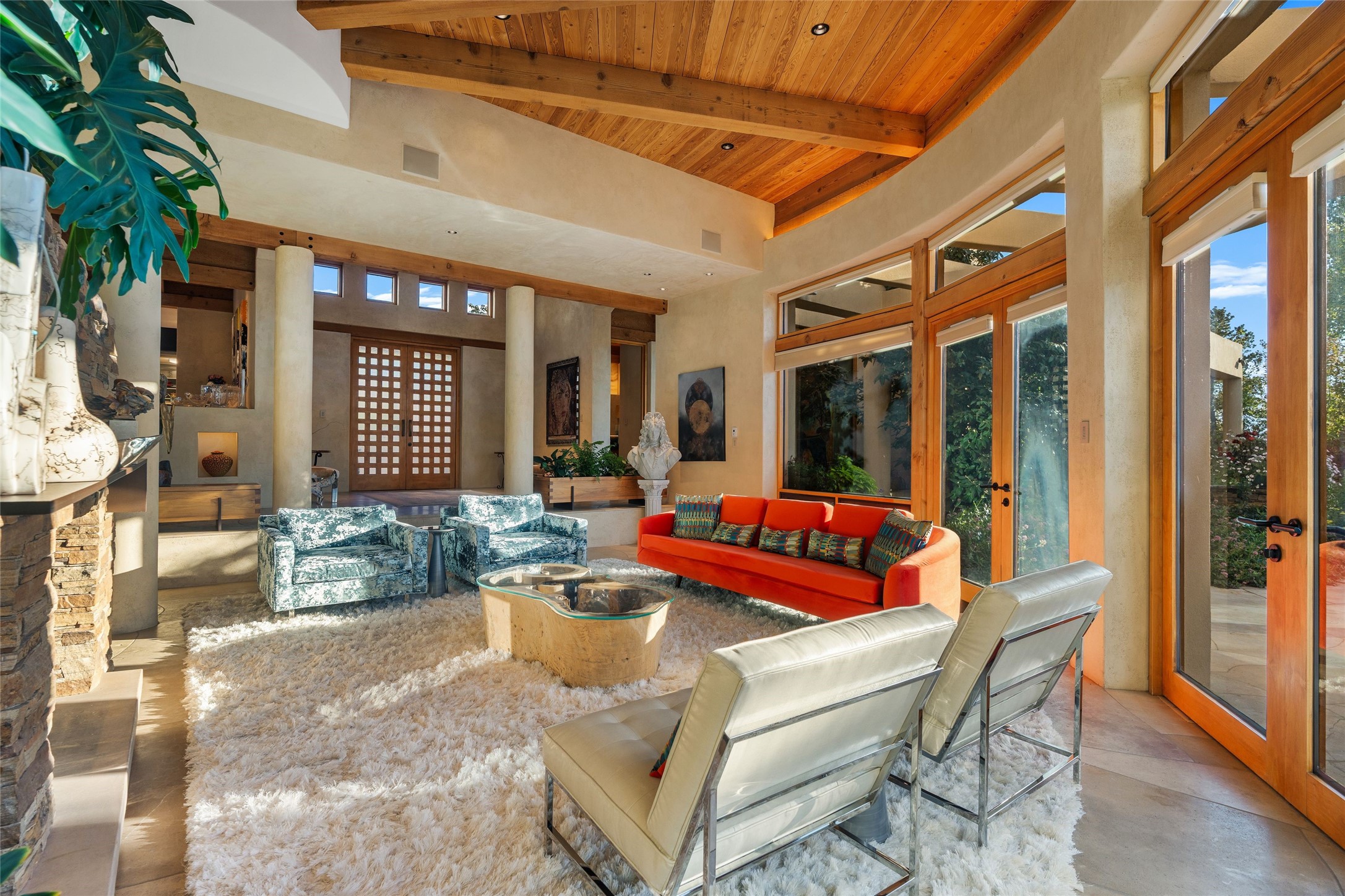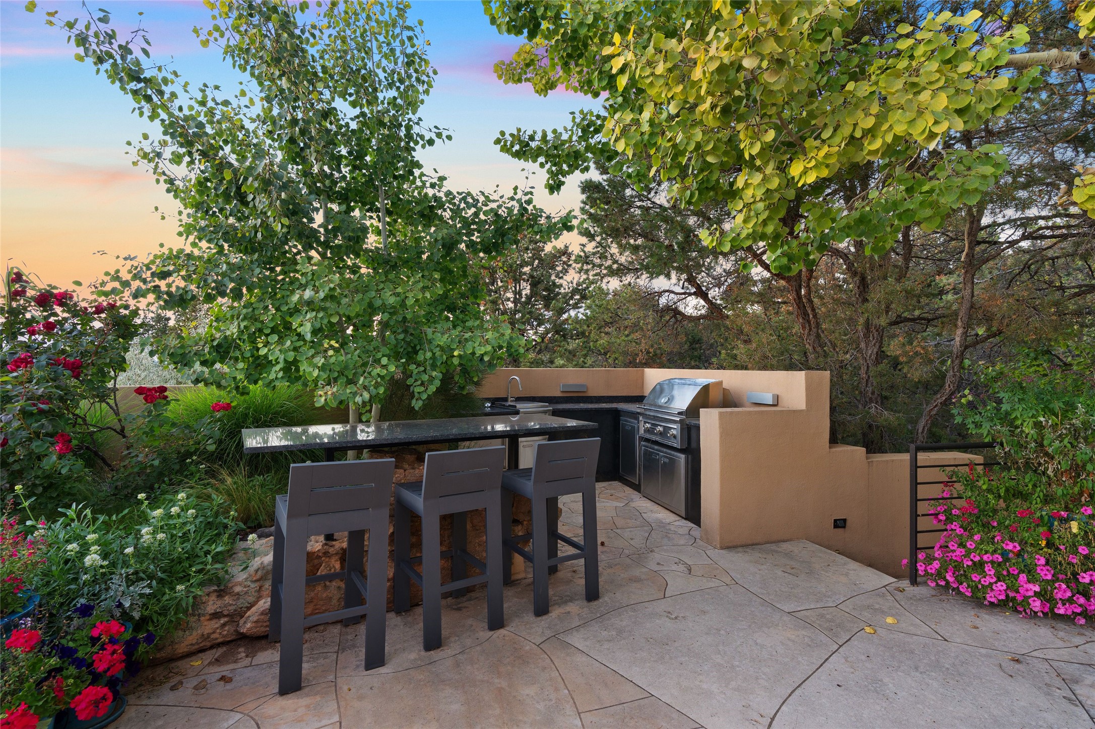 A Rare Masterpiece in Sierra del Norte! Welcome to 1056 Sierra del Norte--an architectural triumph and one of Santa Fe's most extraordinary residences! This estate offers breathtaking panoramic views and unmatched privacy from the moment you pass through the gated entrance. The heated driveway, stacked stone retaining walls, full-capacity generator, and an oversized four-car garage set the tone for the exceptional quality of this one-of-a-kind residence. Inside, grand entertaining spaces flow effortlessly around a world-class chef's kitchen, where top-tier appliances and exquisite finishes inspire culinary creativity. The design and craftsmanship throughout the home are truly unparalleled, with amazing custom details and impressive execution of unique design elements throughout. The expansive living room and formal dining area are anchored by a stunning natural stacked-stone gas fireplace, creating warmth and elegance. Enjoy evenings in the spacious media room, unwind at the custom bar, or challenge friends to Pool or Darts in the dedicated game room. Upstairs, a versatile studio space--perfect as a fifth bedroom--features a sitting room, bath, and access to a private viewing deck. Step outside to discover a sanctuary of lush, mature landscaping, multiple covered portals and patios, and a high-end outdoor kitchen ideal for alfresco dining. The infinity-edge pool and hot tub, complemented by a newly-built pool bath house, offer resort quality relaxation at your own property. The primary suite is a retreat unto itself, with a cozy library, a grand sleeping room, two fireplaces, a spa-inspired bath, and a magnificent walk-in closet. Each guest bedroom is a private suite, thoughtfully separated for lavish comfort and complete tranquility. This is more than a home--it's a lifestyle! With room to grow and views that inspire, 1056 Sierra del Norte is a rare opportunity to own a piece of Santa Fe paradise! Included with the home is a vacant, unimproved adjacent lot, offering rare potential for future expansion or permanent open space.