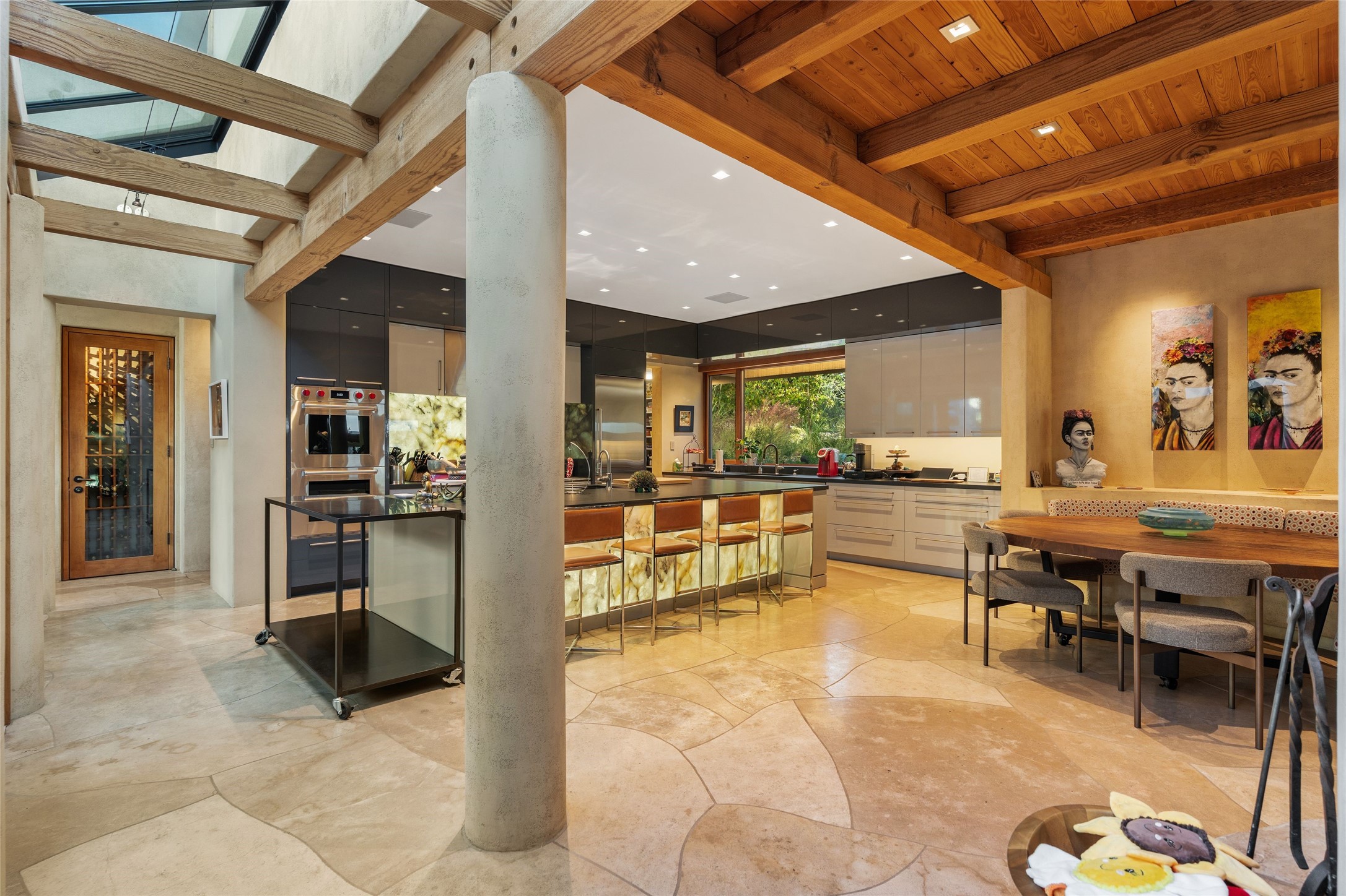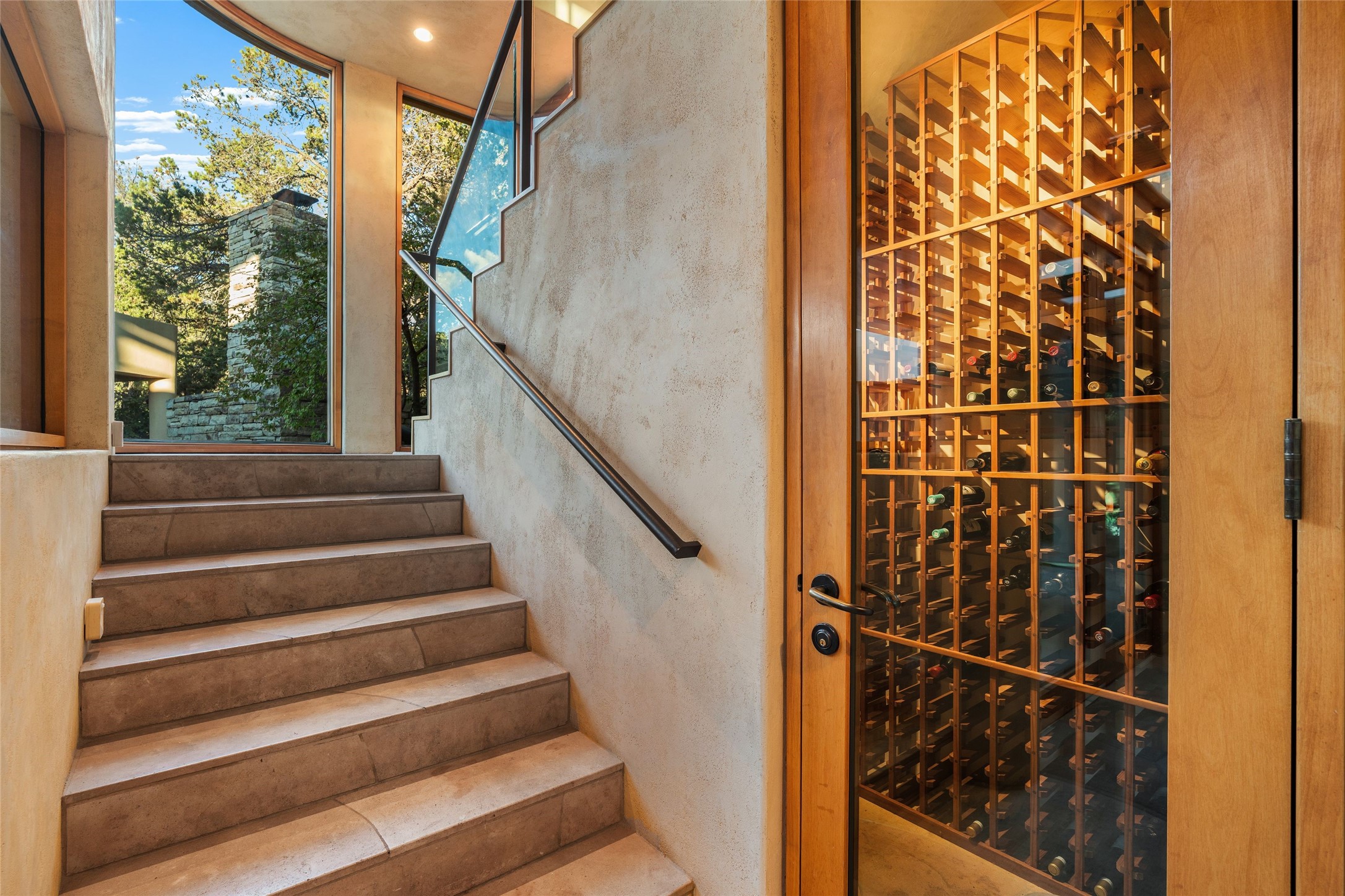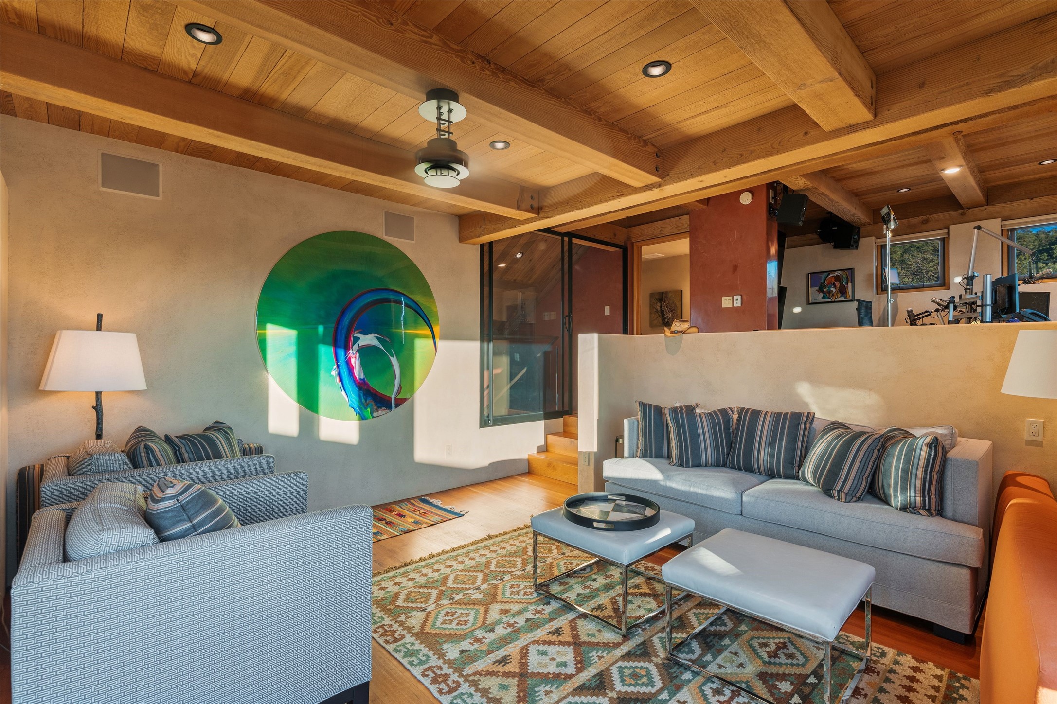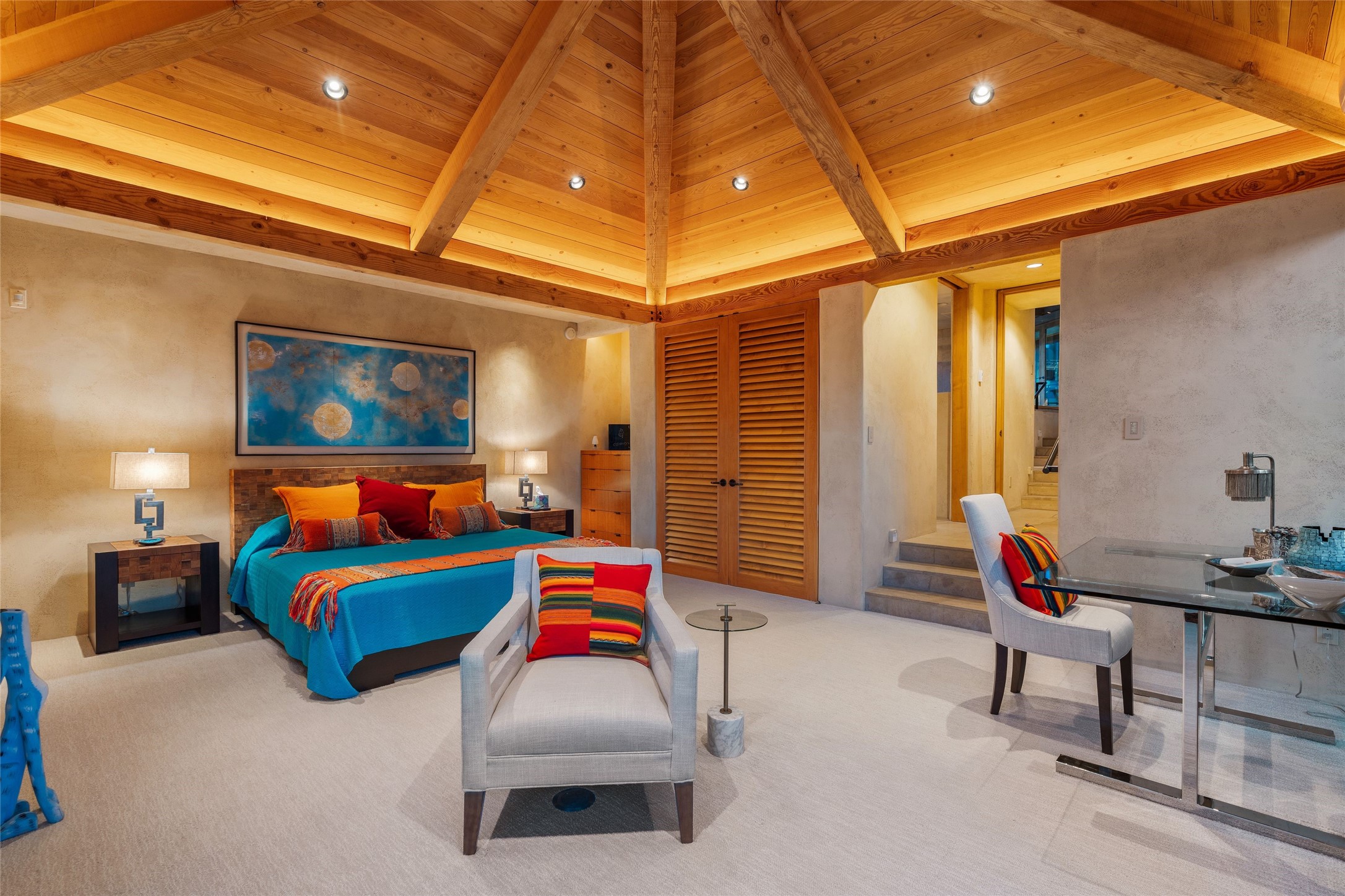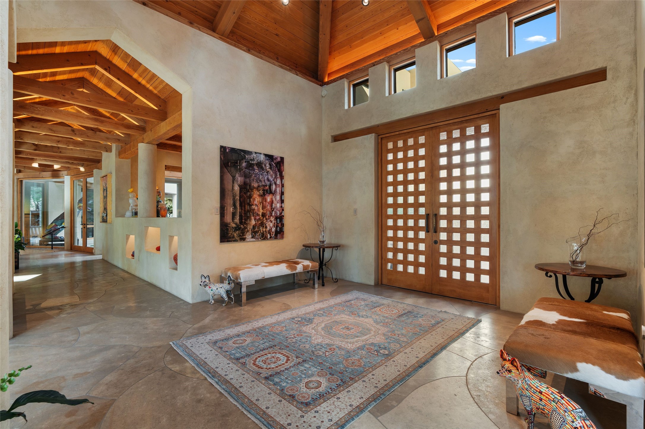 A Rare Masterpiece in Sierra del Norte! Welcome to 1056 Sierra del Norte--an architectural triumph and one of Santa Fe's most extraordinary residences! This estate offers breathtaking panoramic views and unmatched privacy from the moment you pass through the gated entrance. The heated driveway, stacked stone retaining walls, full-capacity generator, and an oversized four-car garage set the tone for the exceptional quality of this one-of-a-kind residence. Inside, grand entertaining spaces flow effortlessly around a world-class chef's kitchen, where top-tier appliances and exquisite finishes inspire culinary creativity. The design and craftsmanship throughout the home are truly unparalleled, with amazing custom details and impressive execution of unique design elements throughout. The expansive living room and formal dining area are anchored by a stunning natural stacked-stone gas fireplace, creating warmth and elegance. Enjoy evenings in the spacious media room, unwind at the custom bar, or challenge friends to Pool or Darts in the dedicated game room. Upstairs, a versatile studio space--perfect as a fifth bedroom--features a sitting room, bath, and access to a private viewing deck. Step outside to discover a sanctuary of lush, mature landscaping, multiple covered portals and patios, and a high-end outdoor kitchen ideal for alfresco dining. The infinity-edge pool and hot tub, complemented by a newly-built pool bath house, offer resort quality relaxation at your own property. The primary suite is a retreat unto itself, with a cozy library, a grand sleeping room, two fireplaces, a spa-inspired bath, and a magnificent walk-in closet. Each guest bedroom is a private suite, thoughtfully separated for lavish comfort and complete tranquility. This is more than a home--it's a lifestyle! With room to grow and views that inspire, 1056 Sierra del Norte is a rare opportunity to own a piece of Santa Fe paradise! Included with the home is a vacant, unimproved adjacent lot, offering rare potential for future expansion or permanent open space.