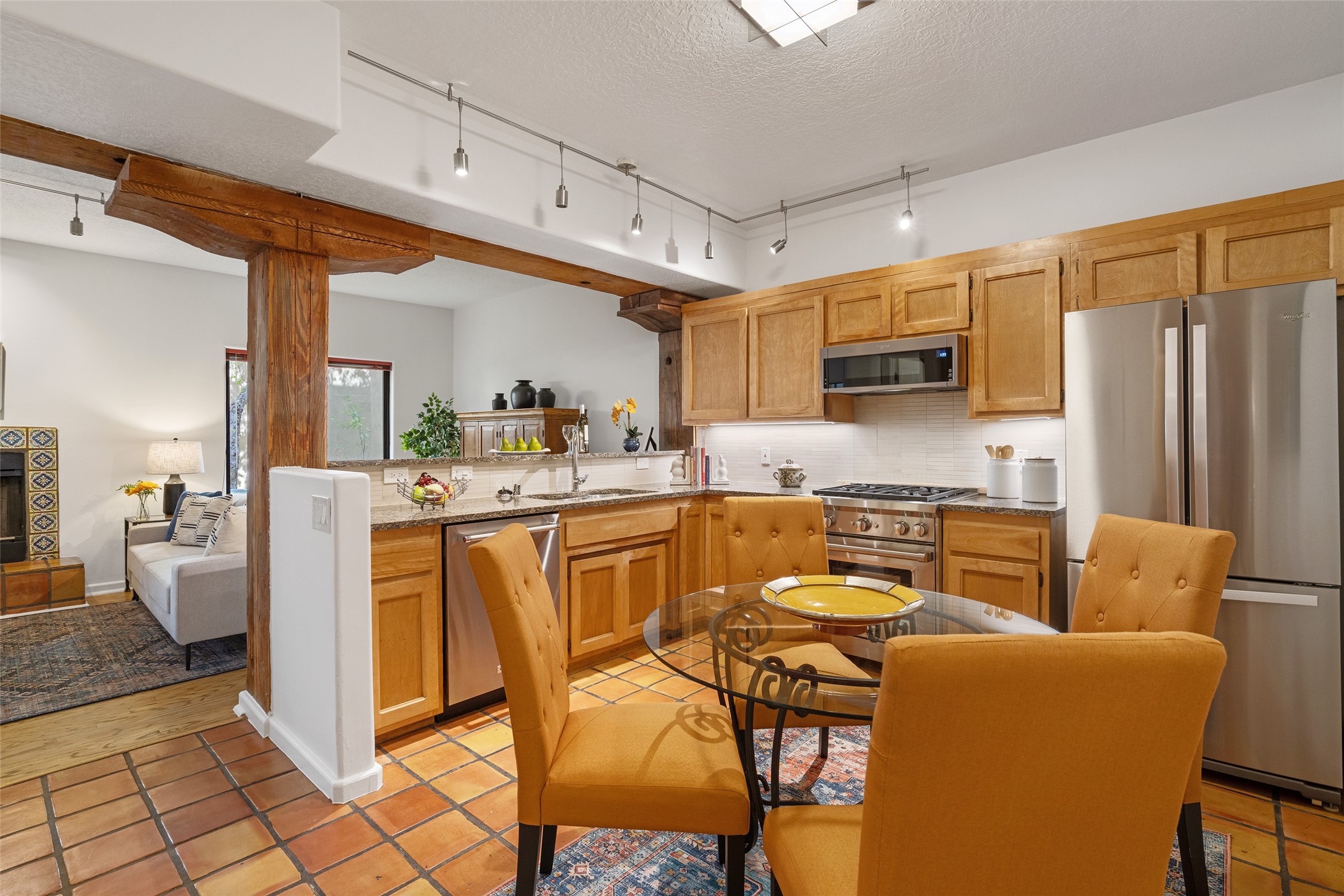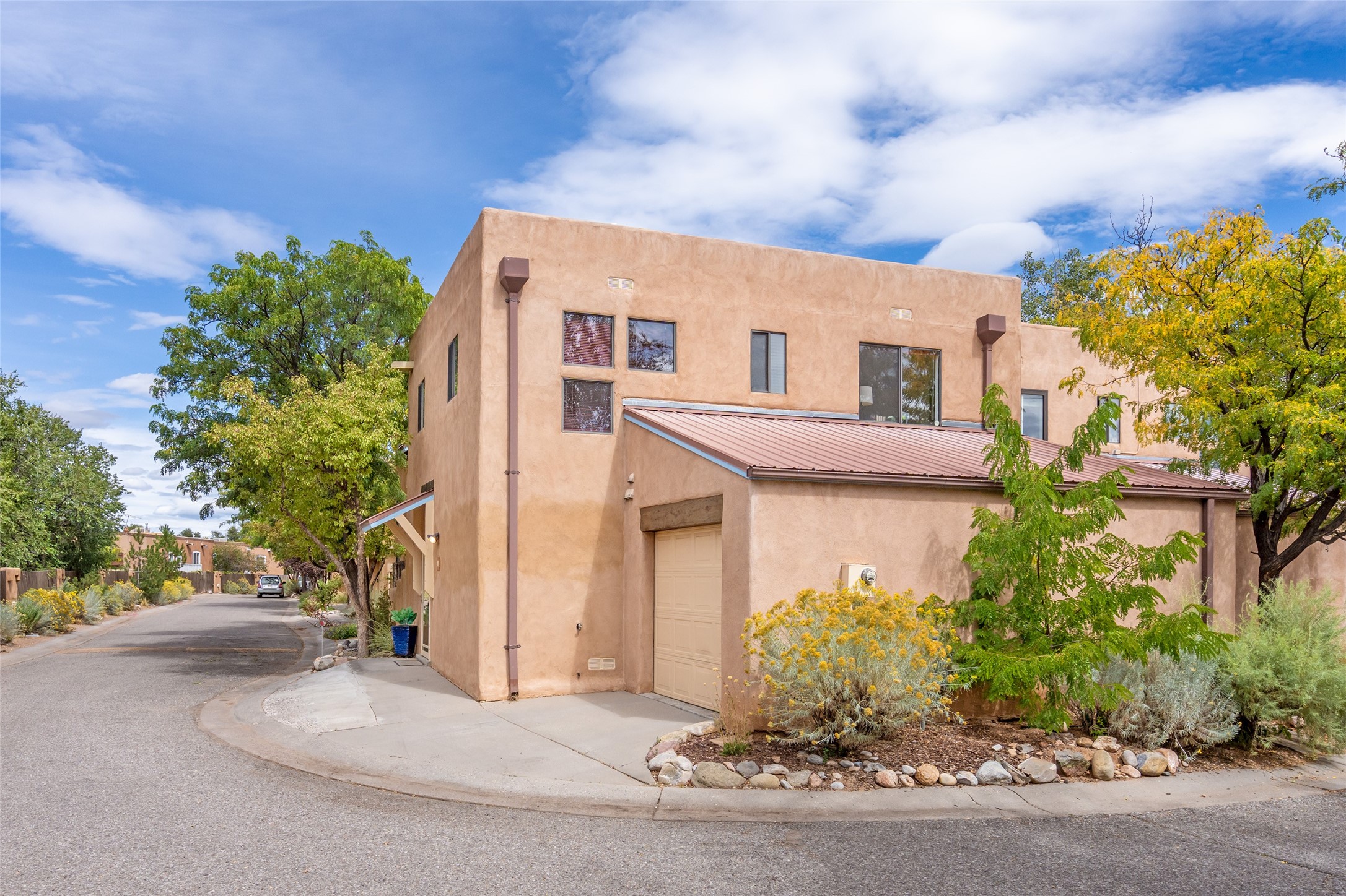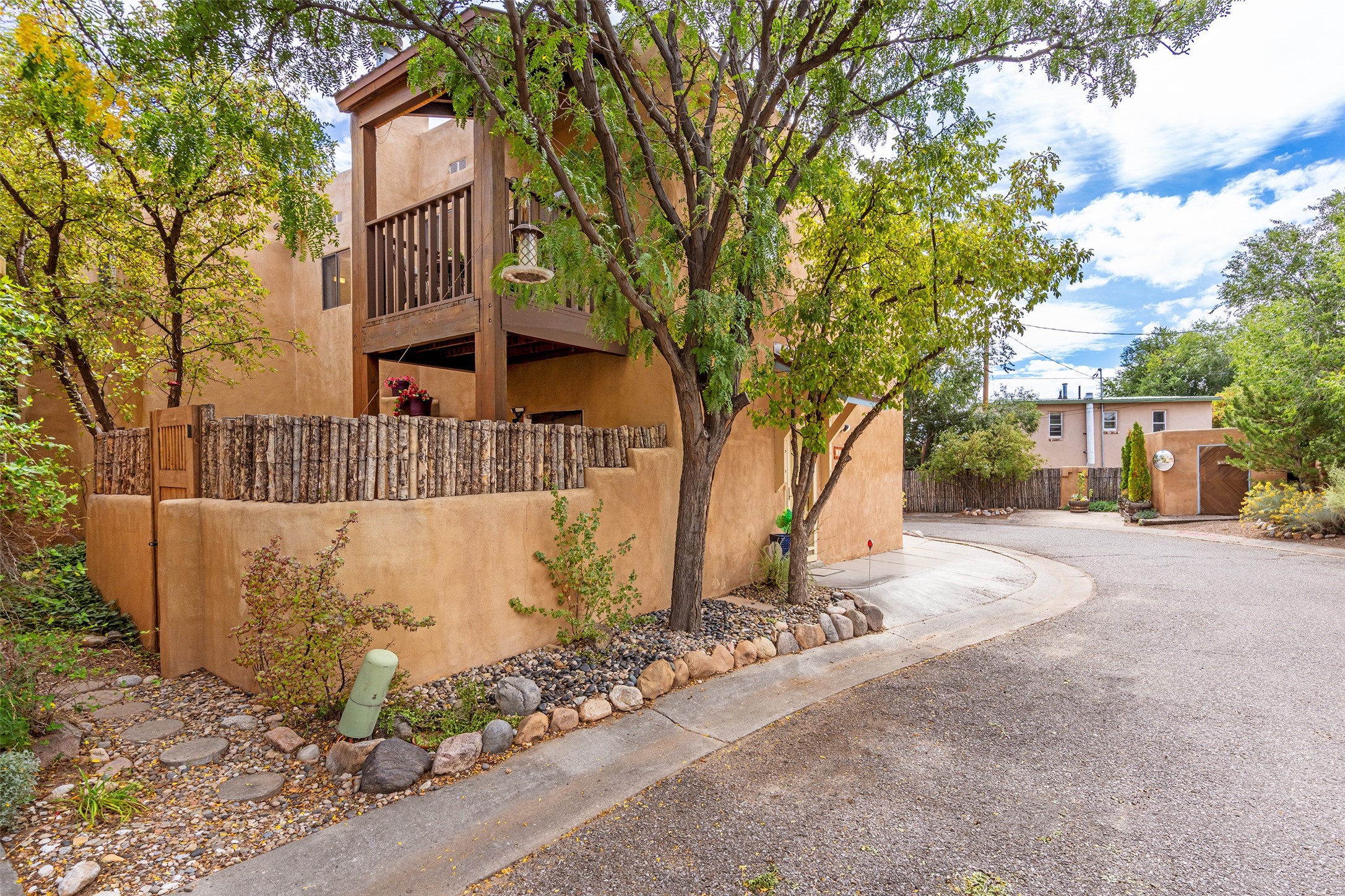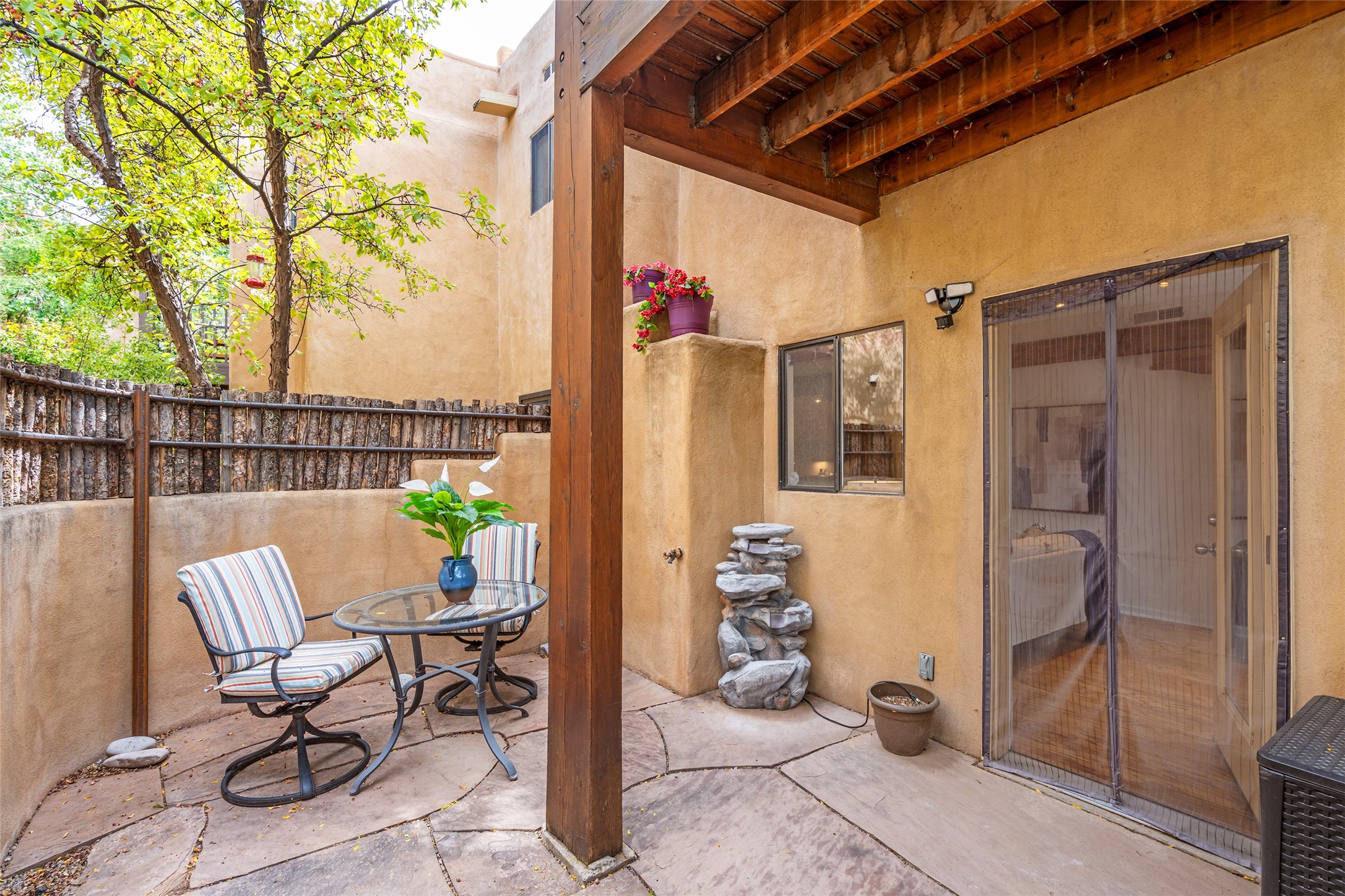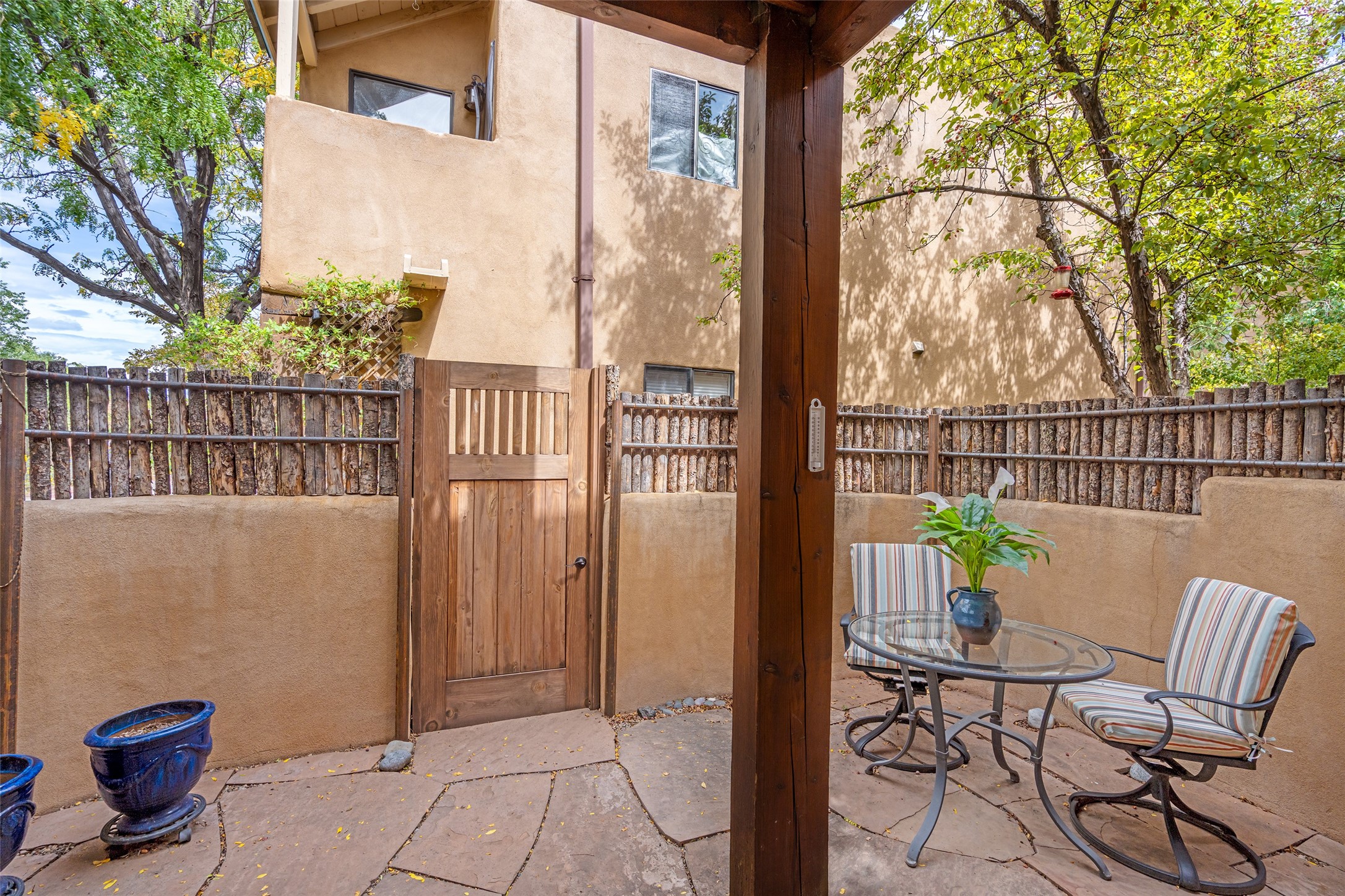Tucked into the Westside/Guadalupe Historic District neighborhood, is a quiet, private condo compound just five minutes to the Railyard, Farmer's Market, Sky Cinemas, dining, and galleries--making every day feel like a Santa Fe adventure. This 2-bed, 3-bath home blends charm with thoughtful updates. The living area is highlighted by vigas and beams that evoke timeless Southwest charm. The kitchen features a Wolf gas stove, stainless steel appliances, stylish under-cabinet lighting, silestone countertops and ample storage with a backsplash and microwave installed in 2023. A cozy fireplace, central air, and newer Skuttle humidifier bring year-round comfort. Enjoy the flagstone patio off the living area enclosed by stucco, newer coyote fencing and a newer gate, plus a deck off the primary suite for relaxing sunsets. Additional perks include tub/tile/faucets installed 2023 in the guest bath, a one-car garage with high ceilings and storage shelves, a laundry area, and a prime location in the heart of the Railyard. Bring Santa Fe's best right to your doorstep.