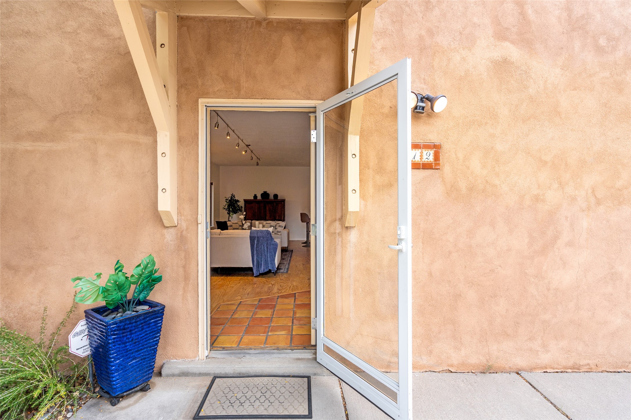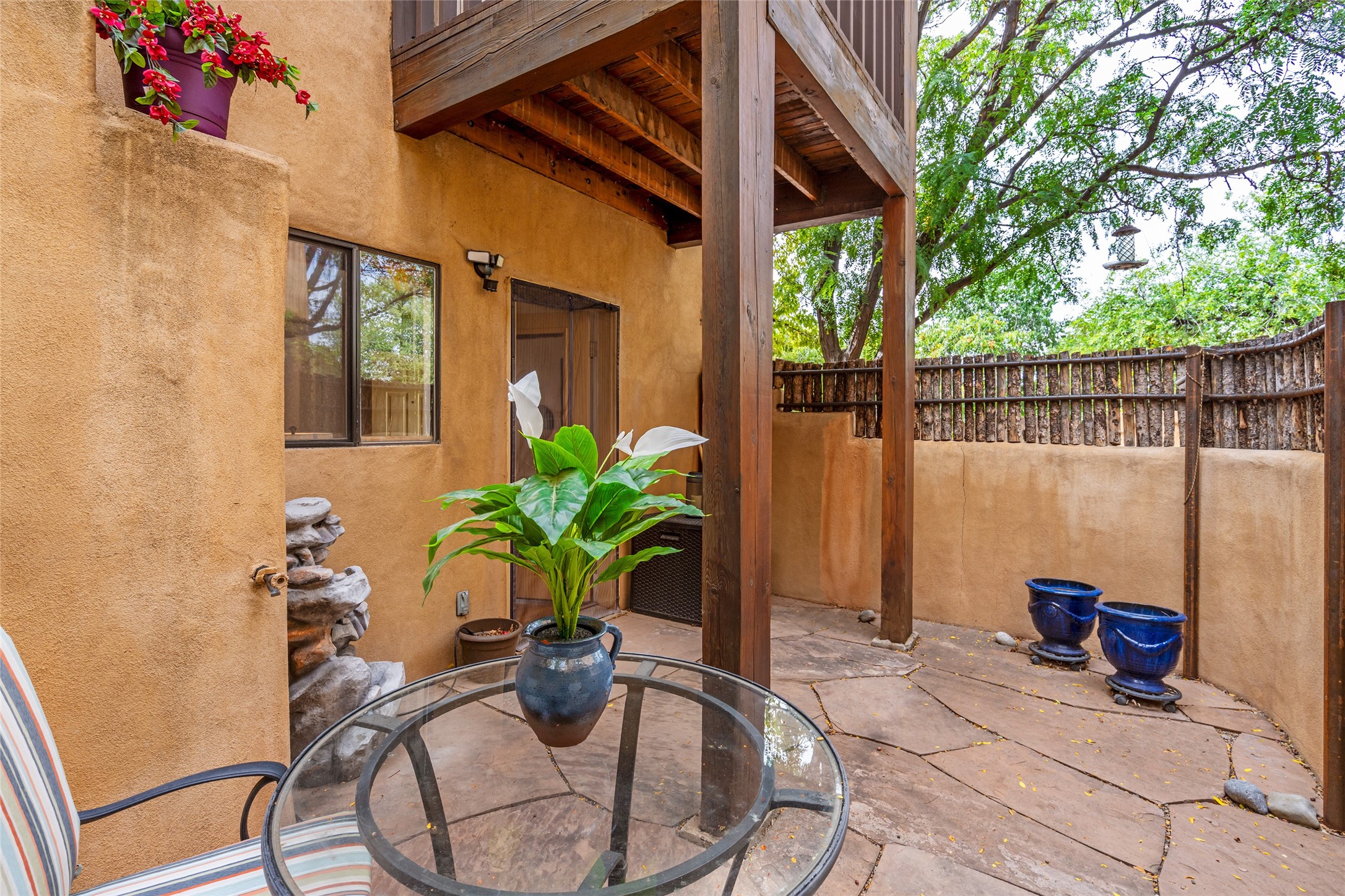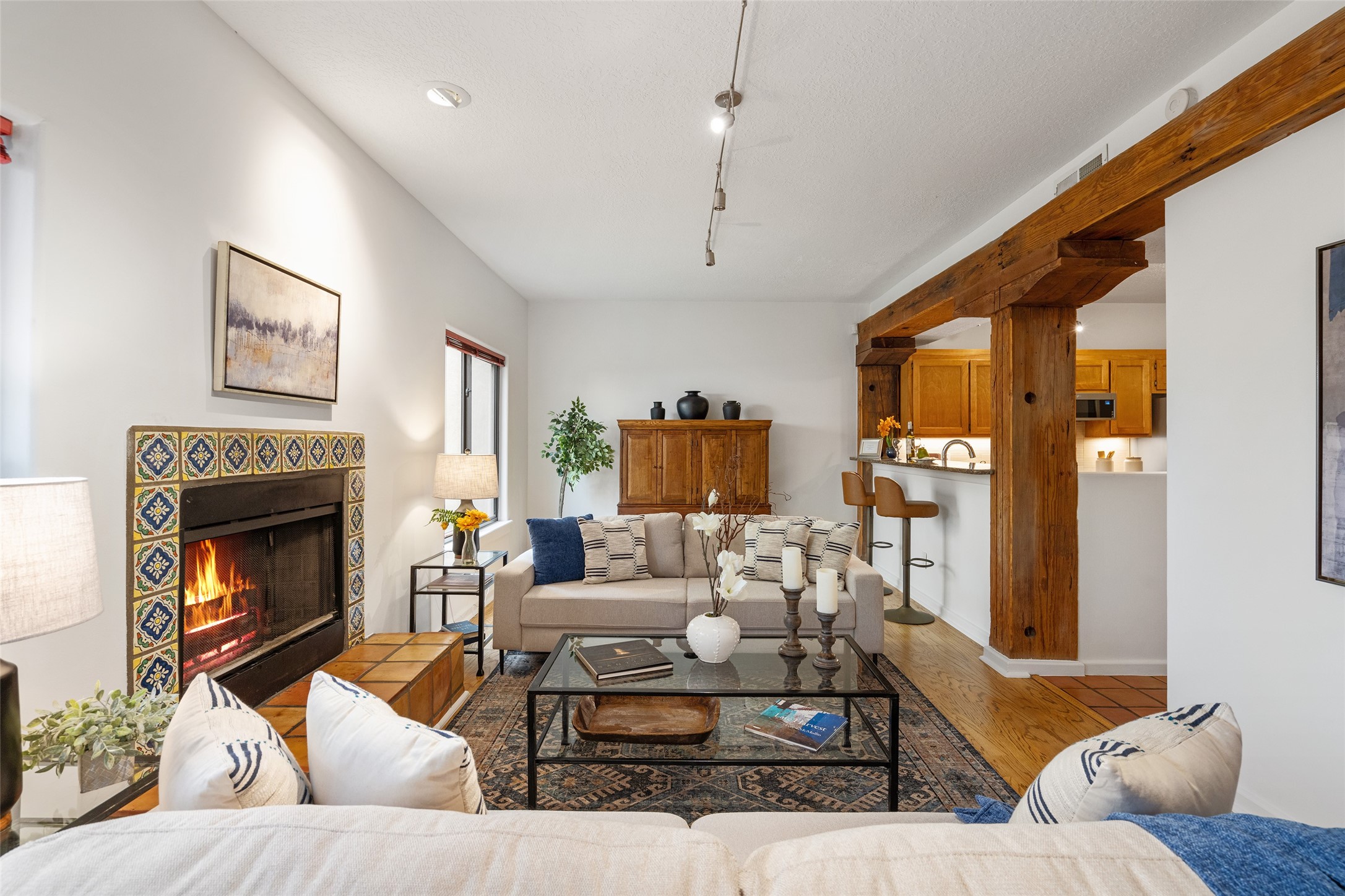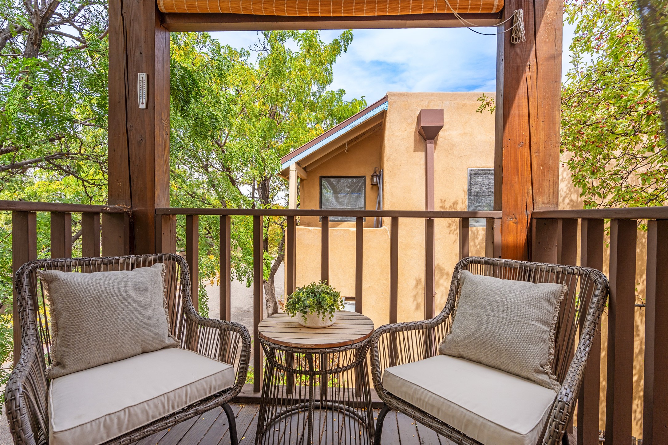Tucked into the Westside/Guadalupe Historic District neighborhood, is a quiet, private condo compound just five minutes to the Railyard, Farmer's Market, Sky Cinemas, dining, and galleries--making every day feel like a Santa Fe adventure. This 2-bed, 3-bath home blends charm with thoughtful updates. The living area is highlighted by vigas and beams that evoke timeless Southwest charm. The kitchen features a Wolf gas stove, stainless steel appliances, stylish under-cabinet lighting, silestone countertops and ample storage with a backsplash and microwave installed in 2023. A cozy fireplace, central air, and newer Skuttle humidifier bring year-round comfort. Enjoy the flagstone patio off the living area enclosed by stucco, newer coyote fencing and a newer gate, plus a deck off the primary suite for relaxing sunsets. Additional perks include tub/tile/faucets installed 2023 in the guest bath, a one-car garage with high ceilings and storage shelves, a laundry area, and a prime location in the heart of the Railyard. Bring Santa Fe's best right to your doorstep.