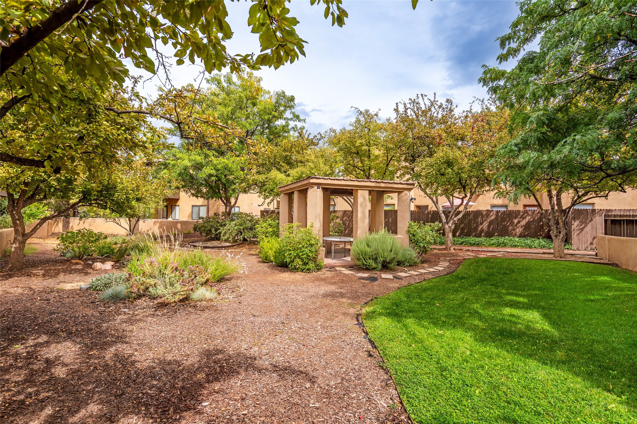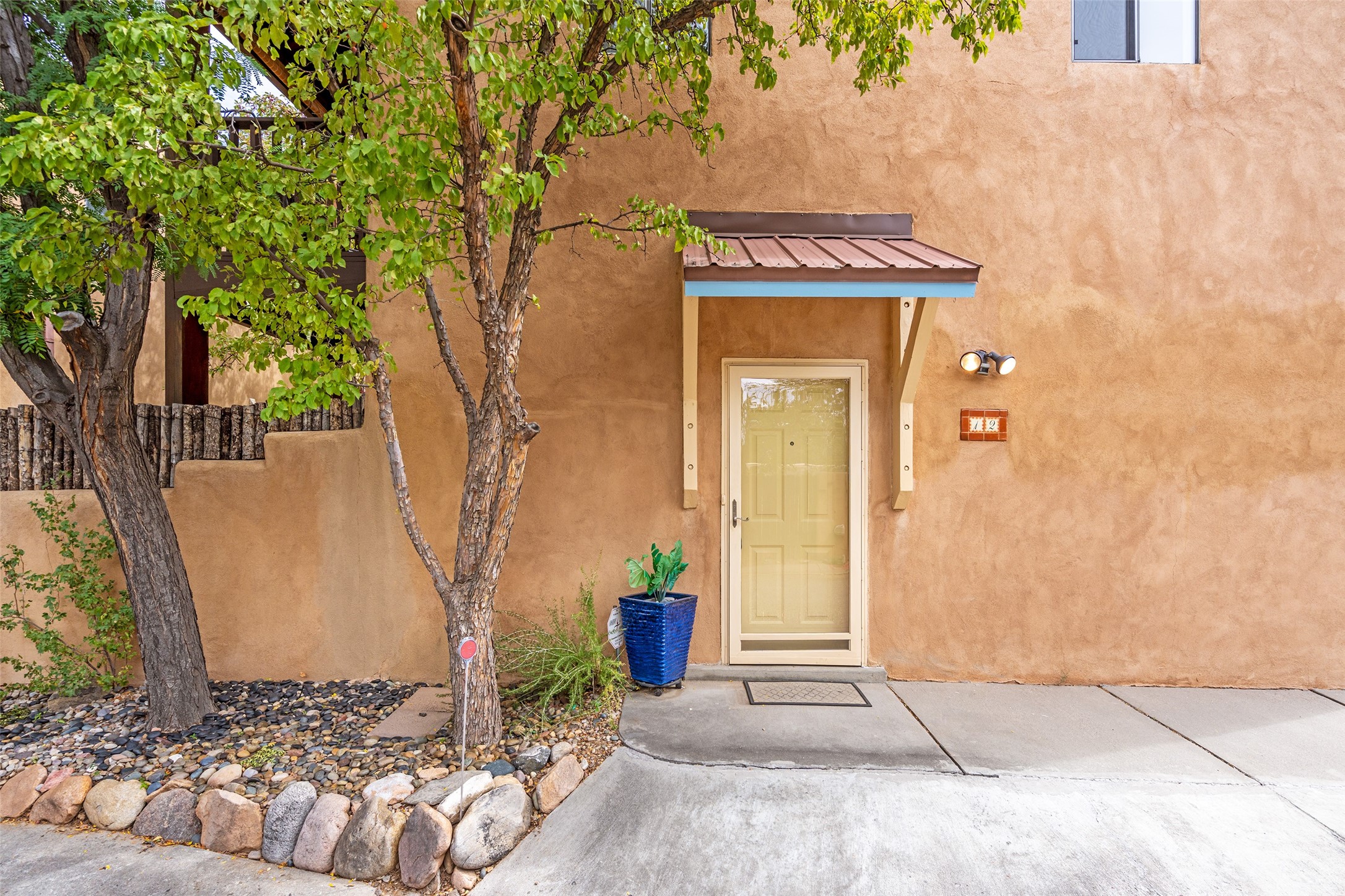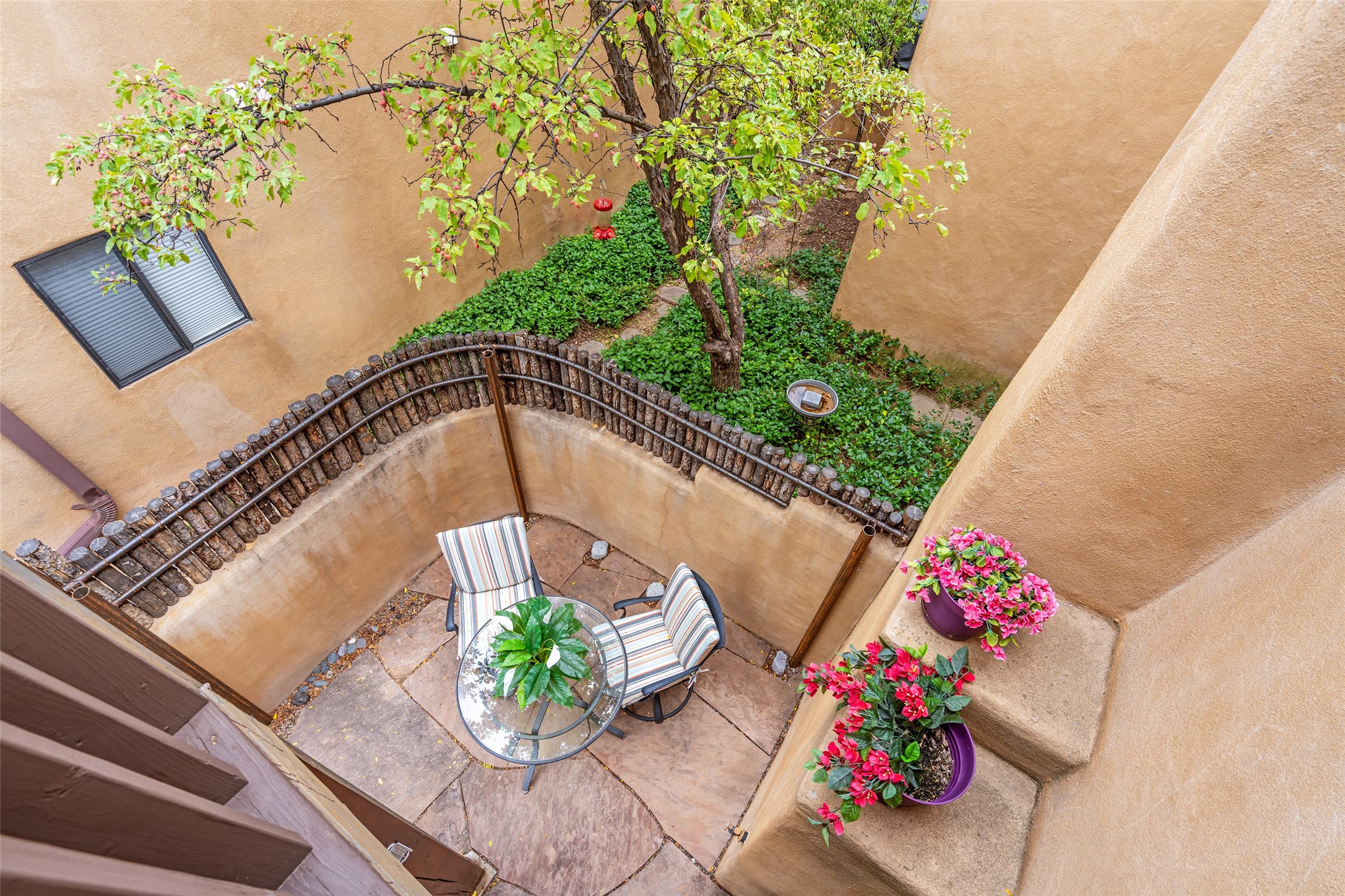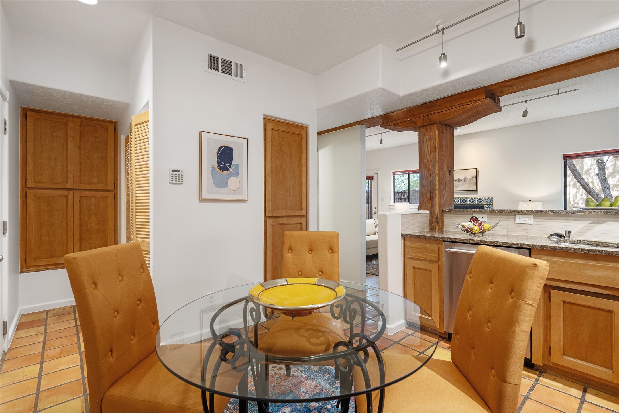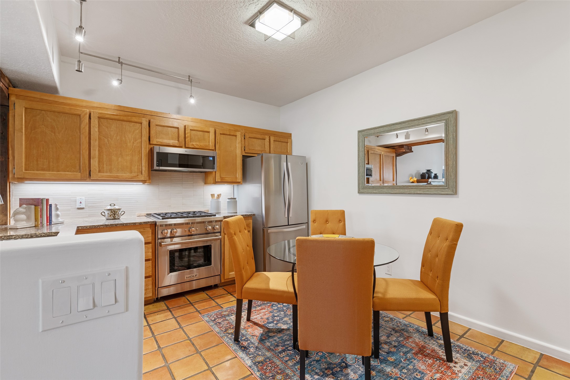 Tucked into the Westside/Guadalupe Historic District neighborhood, is a quiet, private condo compound just five minutes to the Railyard, Farmer's Market, Sky Cinemas, dining, and galleries--making every day feel like a Santa Fe adventure. This 2-bed, 3-bath home blends charm with thoughtful updates. The living area is highlighted by vigas and beams that evoke timeless Southwest charm. The kitchen features a Wolf gas stove, stainless steel appliances, stylish under-cabinet lighting, silestone countertops and ample storage with a backsplash and microwave installed in 2023. A cozy fireplace, central air, and newer Skuttle humidifier bring year-round comfort. Enjoy the flagstone patio off the living area enclosed by stucco, newer coyote fencing and a newer gate, plus a deck off the primary suite for relaxing sunsets. Additional perks include tub/tile/faucets installed 2023 in the guest bath, a one-car garage with high ceilings and storage shelves, a laundry area, and a prime location in the heart of the Railyard. Bring Santa Fe's best right to your doorstep.