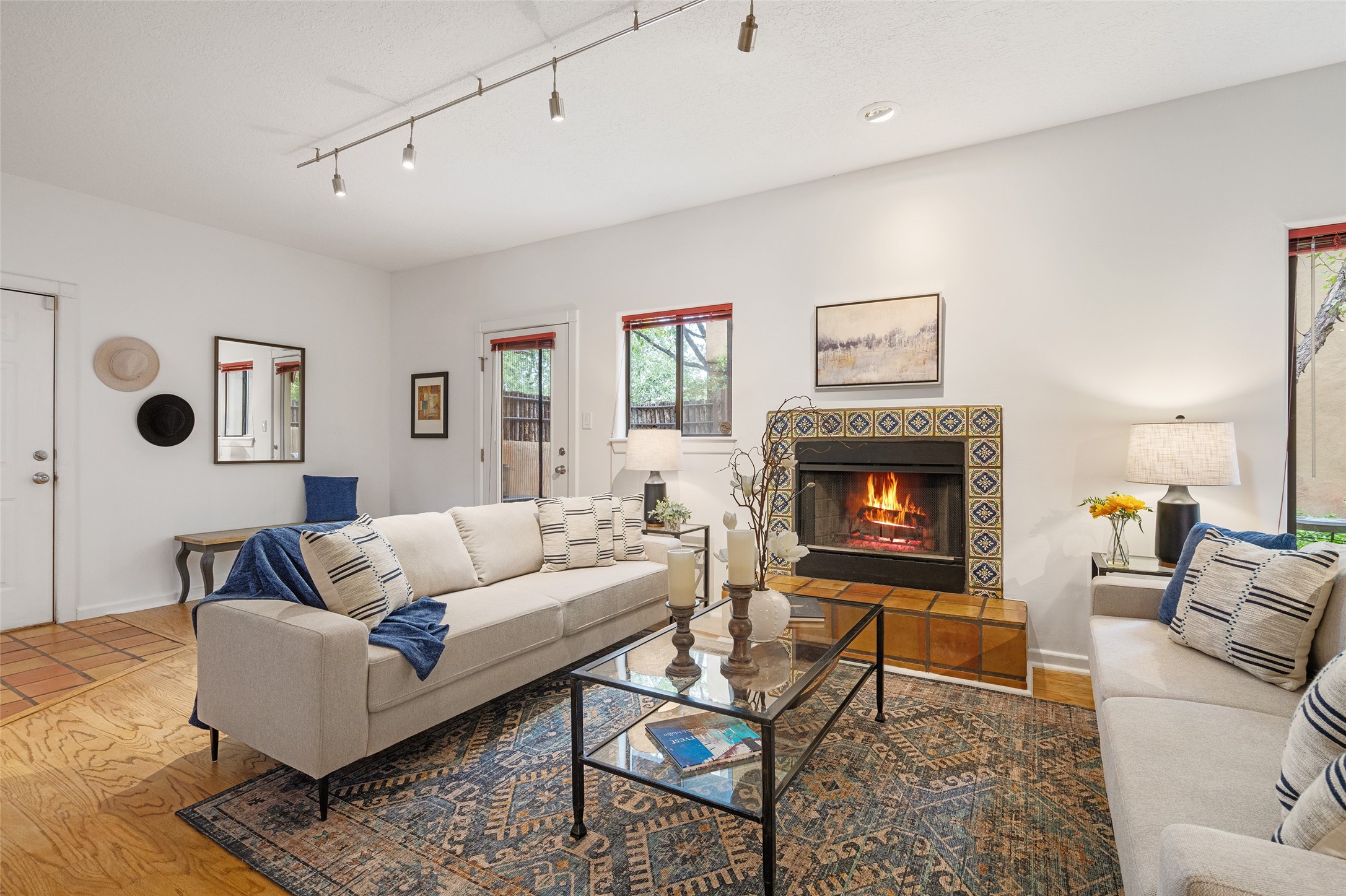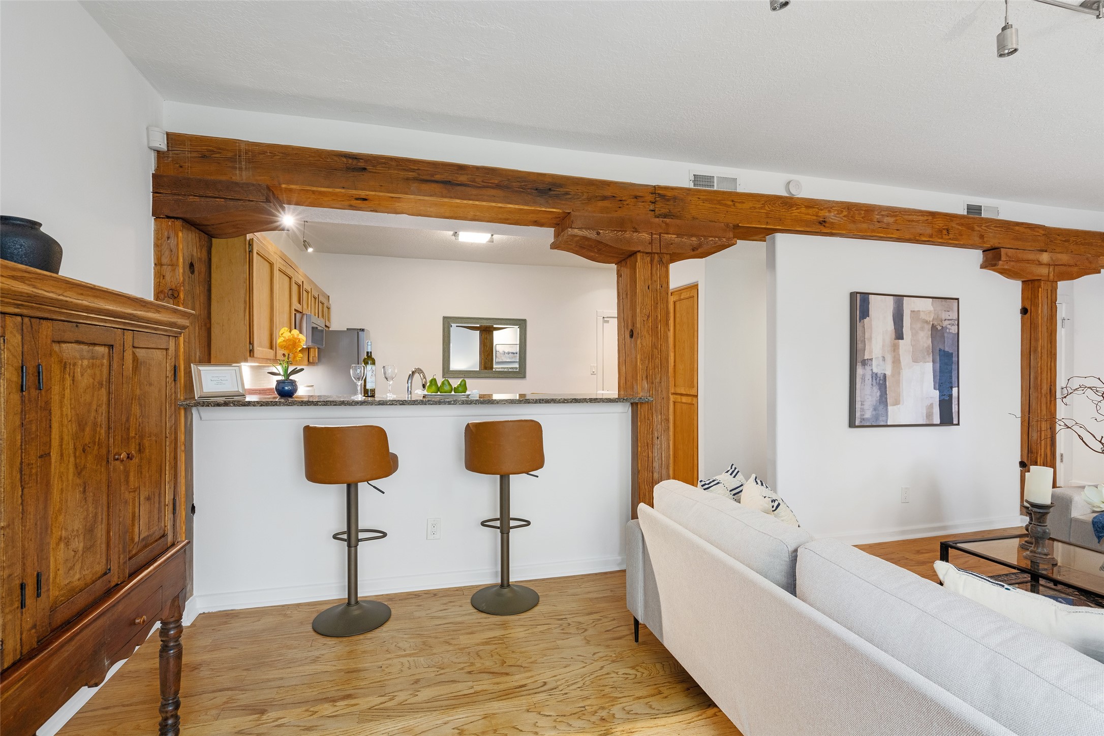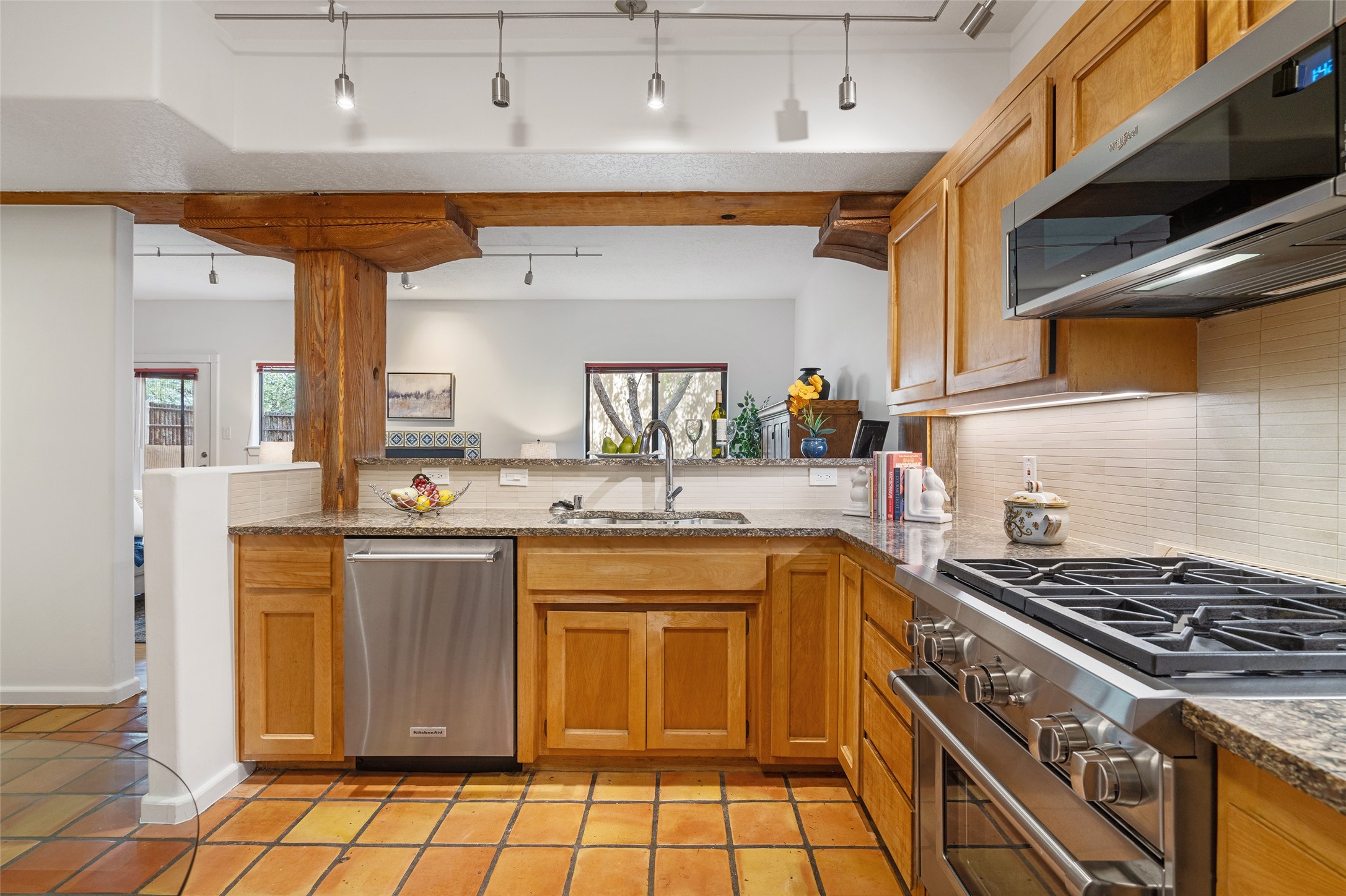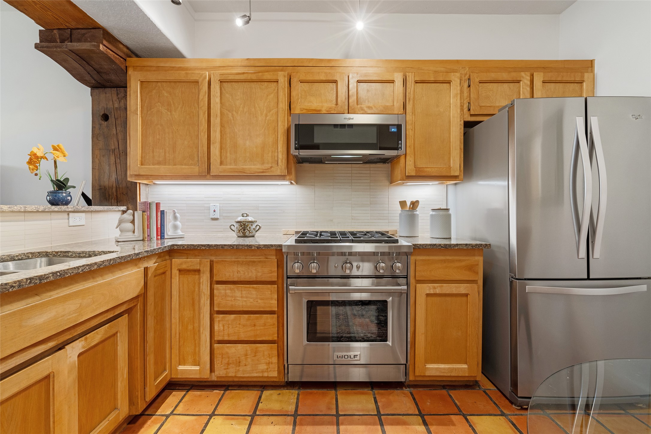 Tucked into the Westside/Guadalupe Historic District neighborhood, is a quiet, private condo compound just five minutes to the Railyard, Farmer's Market, Sky Cinemas, dining, and galleries--making every day feel like a Santa Fe adventure. This 2-bed, 3-bath home blends charm with thoughtful updates. The living area is highlighted by vigas and beams that evoke timeless Southwest charm. The kitchen features a Wolf gas stove, stainless steel appliances, stylish under-cabinet lighting, silestone countertops and ample storage with a backsplash and microwave installed in 2023. A cozy fireplace, central air, and newer Skuttle humidifier bring year-round comfort. Enjoy the flagstone patio off the living area enclosed by stucco, newer coyote fencing and a newer gate, plus a deck off the primary suite for relaxing sunsets. Additional perks include tub/tile/faucets installed 2023 in the guest bath, a one-car garage with high ceilings and storage shelves, a laundry area, and a prime location in the heart of the Railyard. Bring Santa Fe's best right to your doorstep.