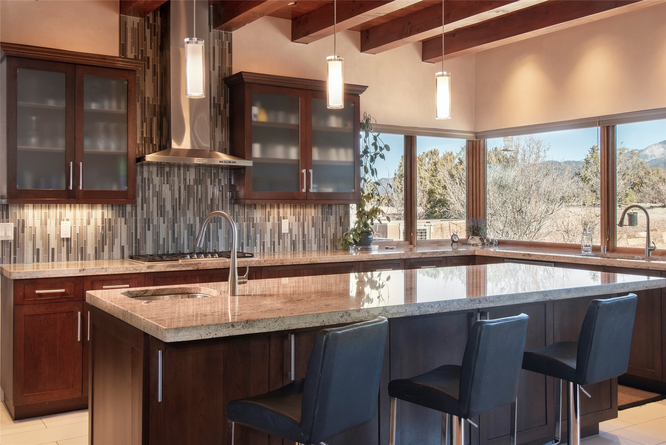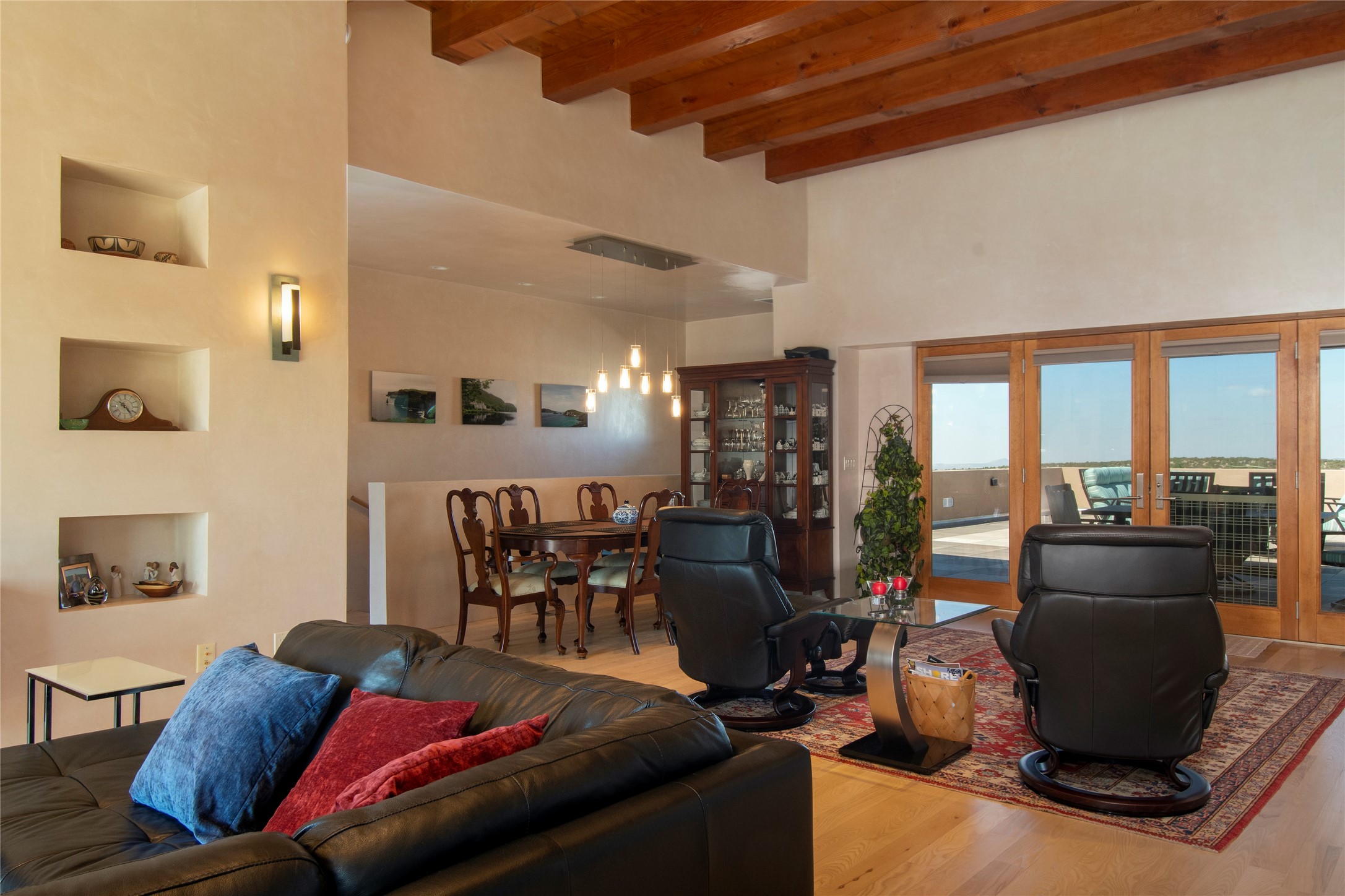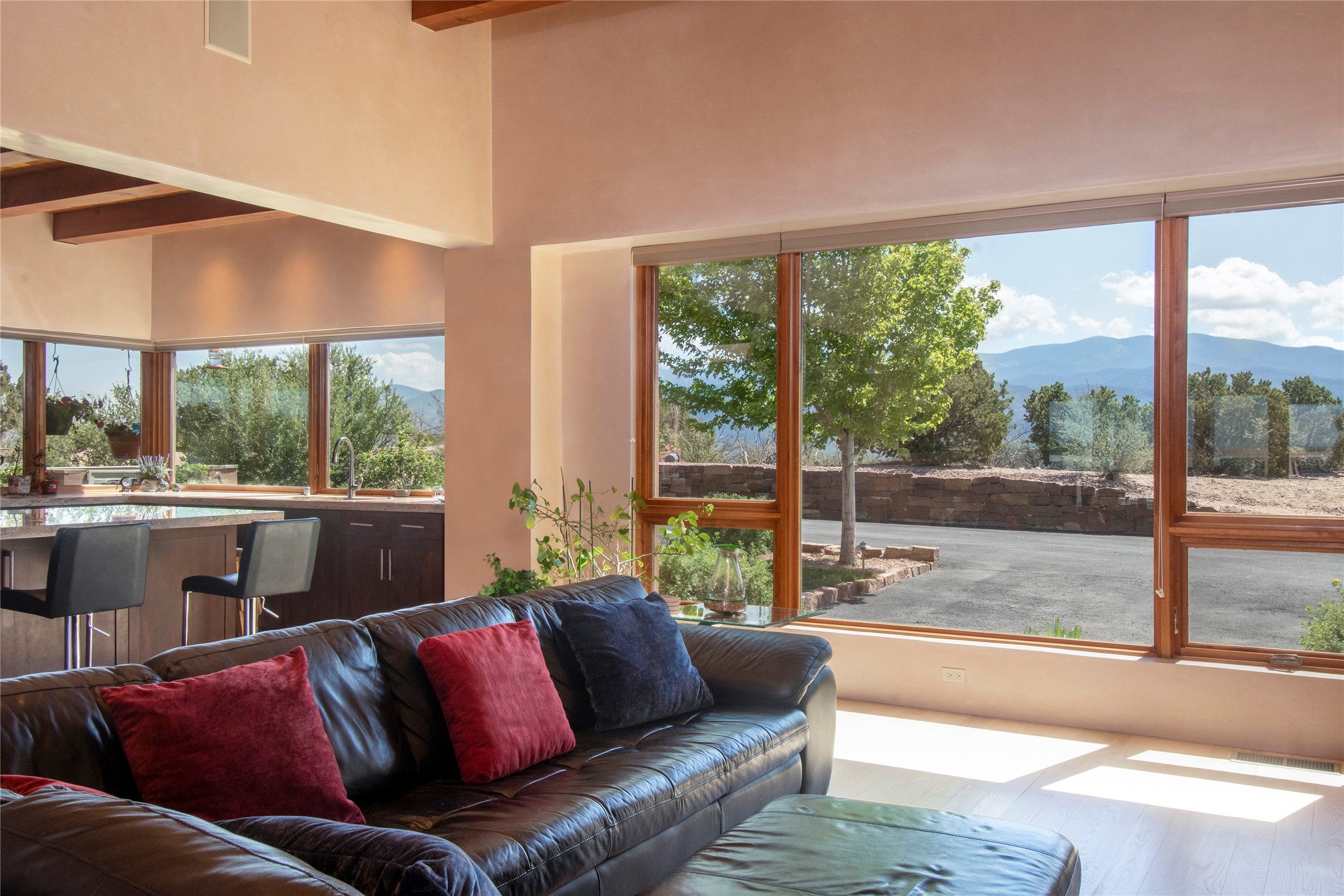 This Michael Bauer custom designed, contemporary, two-story home was built by long time Santa Fe builder, Gary Lincoln, for himself. Known for quality construction and excellent designs, the best finishes and appliances were used in building this stunning home. The 3520 sq ft, open floor plan home is designed for comfortable, easy living and sited perfectly on 2+ acres to take in the breathtaking panoramic mountain views. Striking entry doors lead into the great room where a grand fireplace is a focal point, along with oversized windows that look onto a rooftop deck with fireplace and spectacular mountain views. The kitchen has wall-to-wall windows over the granite countertops on two sides so the chef will never be without a lovely view. A good-sized island with sink, and a walk-in pantry are conveniently located and offer plenty of storage. The appliances are top notch and include a double oven. The portal off the kitchen is the perfect for outdoor entertaining. Adjacent to the kitchen is an office and the master suite with its walk-in closet, beautiful bathroom and private portal with a fireplace. On the other side of the great room are two guest bedrooms each with outside entrances, and a laundry room. The lower level has a spacious den, bathroom, gym, huge storage room, and access to the 3-car garage. Just minutes to the Plaza in Santa Fe, and located in a small, highly desirable gated community, this home has easy access to walking and biking trails.