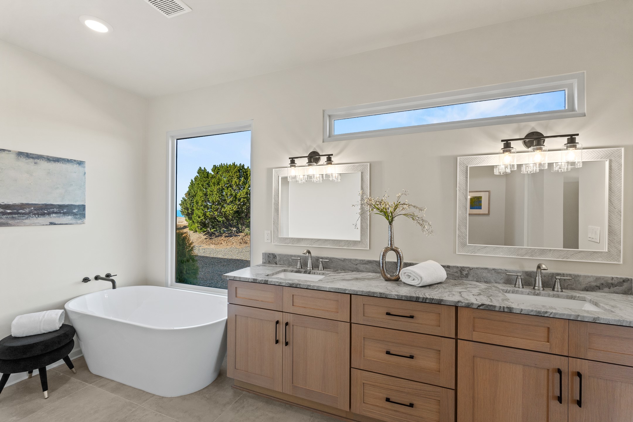 Just completed and ready for occupancy! Mountain views from every window in this new custom built contemporary pueblo style home with open floor plan situated on a huge 10.0 +/- ac. private lot in Lamy. Convenient access to US-285, the Agora shopping center, bank and restaurants. Perfect for indoor and outdoor entertaining. Open kitchen/family/dining room has floor to ceiling windows and double sliding glass doors to take in the fabulous views and access to the portal. The contemporary kitchen has a huge island bar and large walk in pantry. Every room has large picture windows with fabulous mountain views. Owner's bath has double sinks, soaking tub and large walk in shower room with double shower heads and rain showers and a large walk in closet. Home features contemporary style vigas in living areas. Three bedrooms with good separation and 2 baths. A guest house and equestrian structures are allowed, as well as 10 horses or cattle. (1 large animal per acre.) No HOA, recreational vehicles are allowed if parked inconspicuously. Connected to the Eldorado community water system. Located only 20 minutes from Downtown Santa Fe this home offers gorgeous views, rural living and easy access to everything Santa Fe has to offer. This home has it all; new home, fabulous views, great outdoor spaces, contemporary open floor plan, large private lot. Buyer to verify all information and Covenants. Seller gives $4000 credit to the buyer at closing for Range, dishwasher and microwave. Open House Sunday, Nov 23. 1:00 - 4:00 PM.