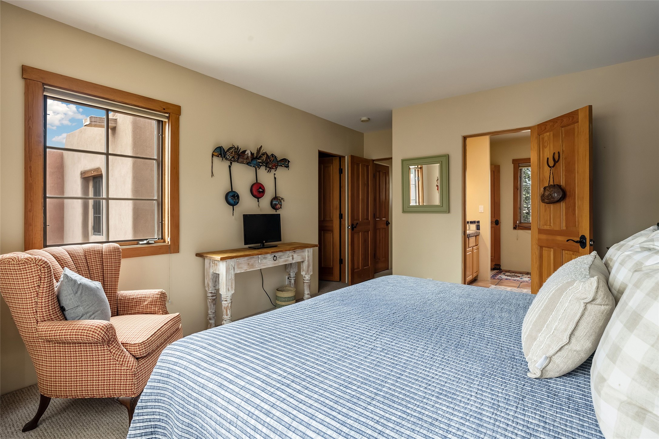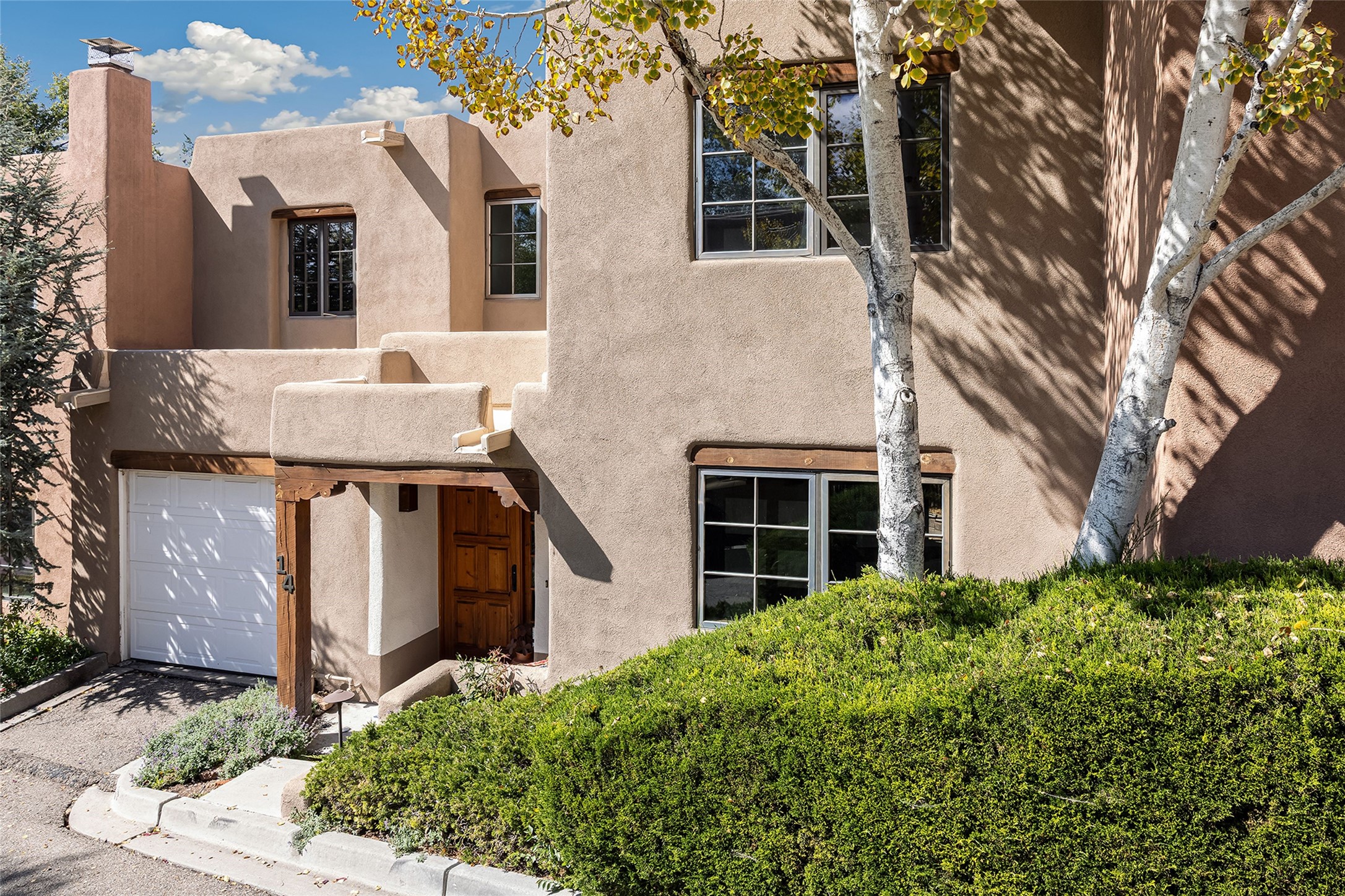 Imagine being two blocks from the Santa Fe Plaza and Fort Marcy Park in your own home away from home--or a full-time residence that embraces the best of in-town living. This two story delightful two-bedroom, one-and-a-half-bath condominium in the sought-after Muralla Compound offers both convenience and quintessential Santa Fe style, complete with a one-car garage.Inside, Saltillo tile floors, high wood beamed ceilings with vigas, and a classic wood-burning kiva fireplace set the tone for warmth and character. French doors open to a private rear patio enclosed by a coyote fence and shaded by a canopy of trees--an ideal space for al fresco dining, raised garden beds, and outdoor grilling.The kitchen exudes charm with playful terracotta and cream Talavera tile countertops and backsplash, complemented by light wood cabinetry. A stainless steel counter-depth refrigerator (delivery 10/17) joins the gas cooktop, built-in microwave, and dishwasher for modern functionality.Upstairs, two generously sized bedrooms share a full bath with double vanity in complementary blue and cream Talavera tile. The hallway includes a closet with a stackable washer and dryer for convenience. French doors from the guest bedroom open to a private balcony overlooking the garden--perfect for morning coffee or evening star-gazing.In the past few years, the condo association replaced the TPO roof and performed stucco maintenance. The condo association covers exterior maintenance and common areas. Zoned Commercial, the property allows 7-day-plus short-term rentals (with proper permitting), offering excellent flexibility for investors or second-home owners. A furniture package can be negotiated separately.Experience downtown Santa Fe living at its most charming--quiet, walkable, and unmistakably authentic.